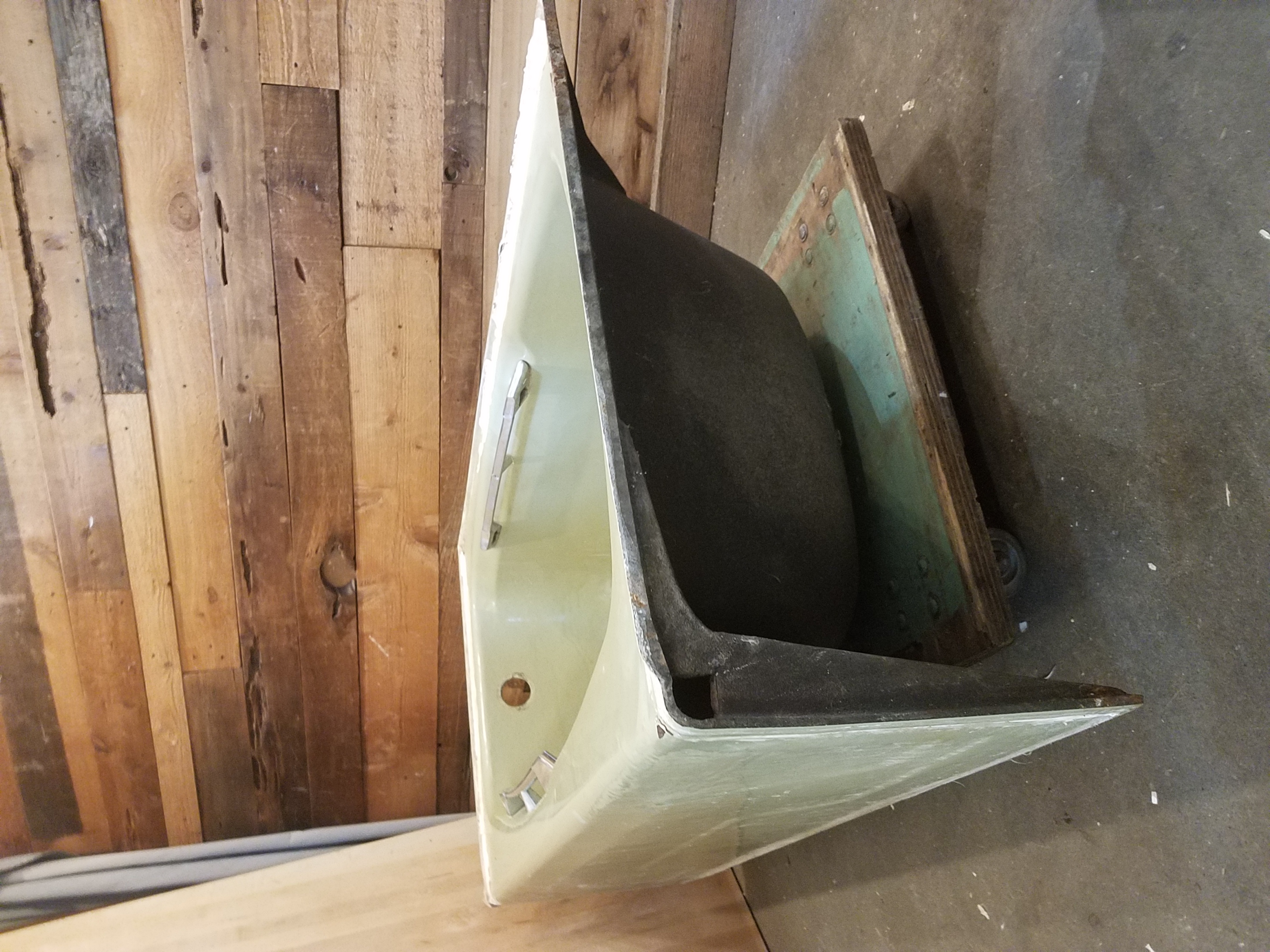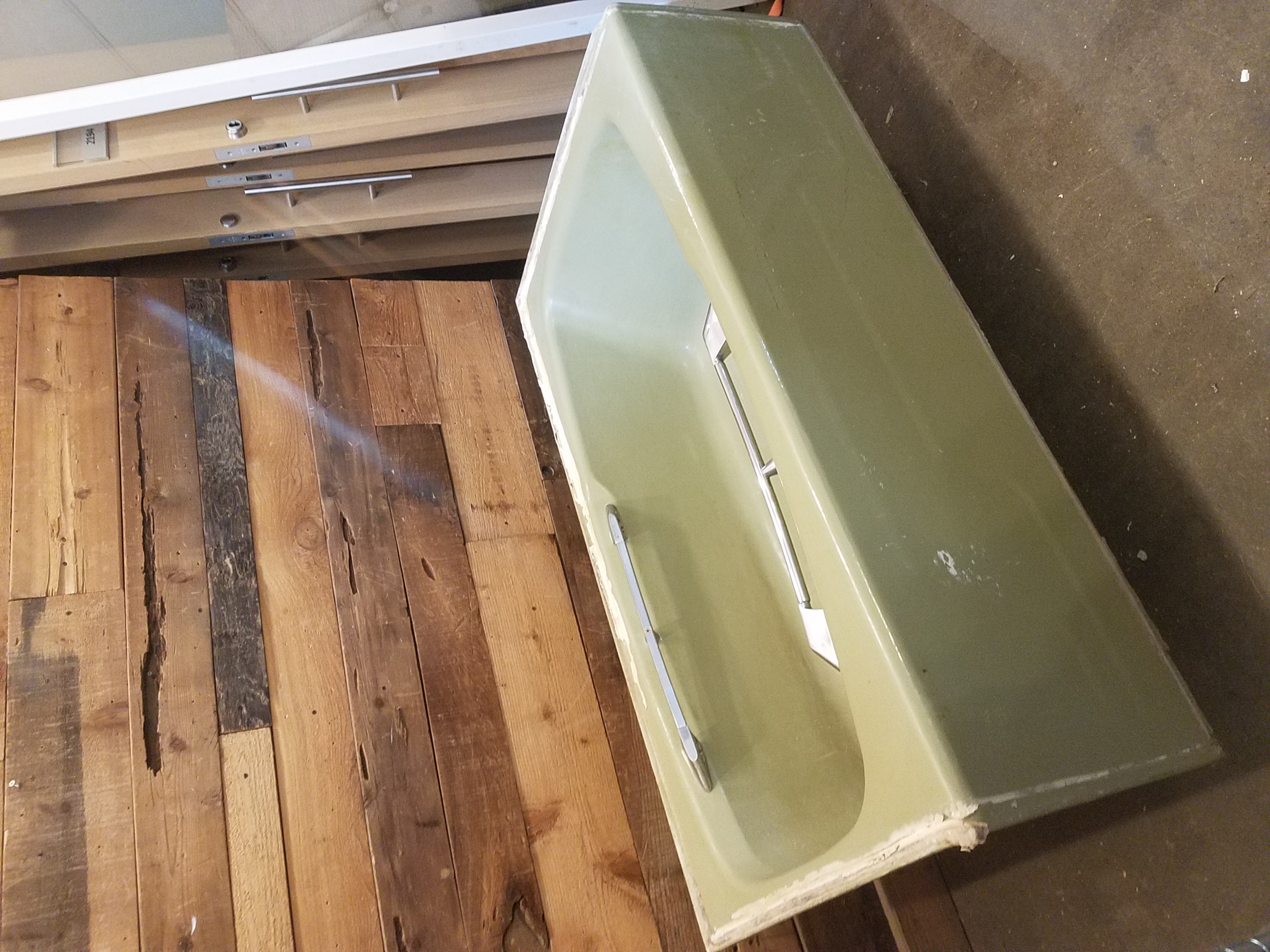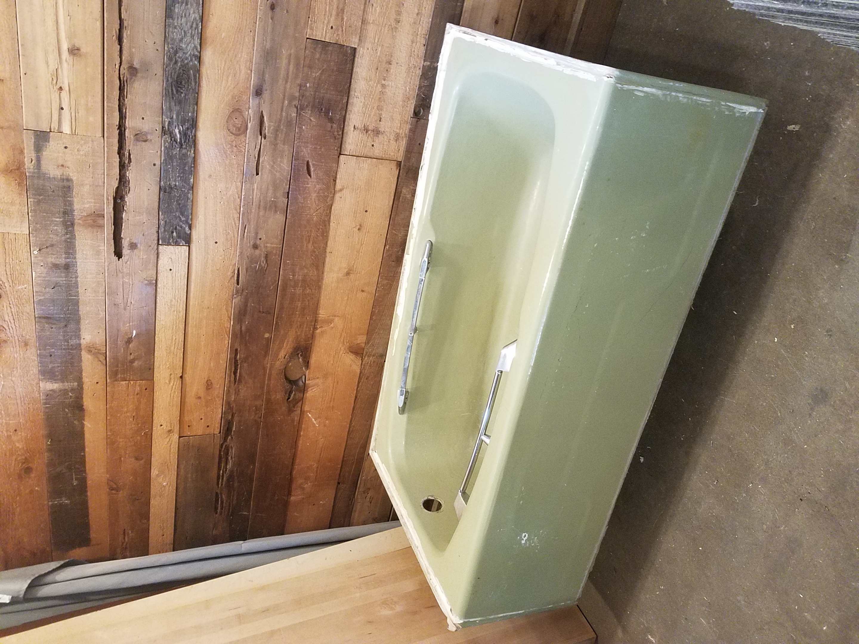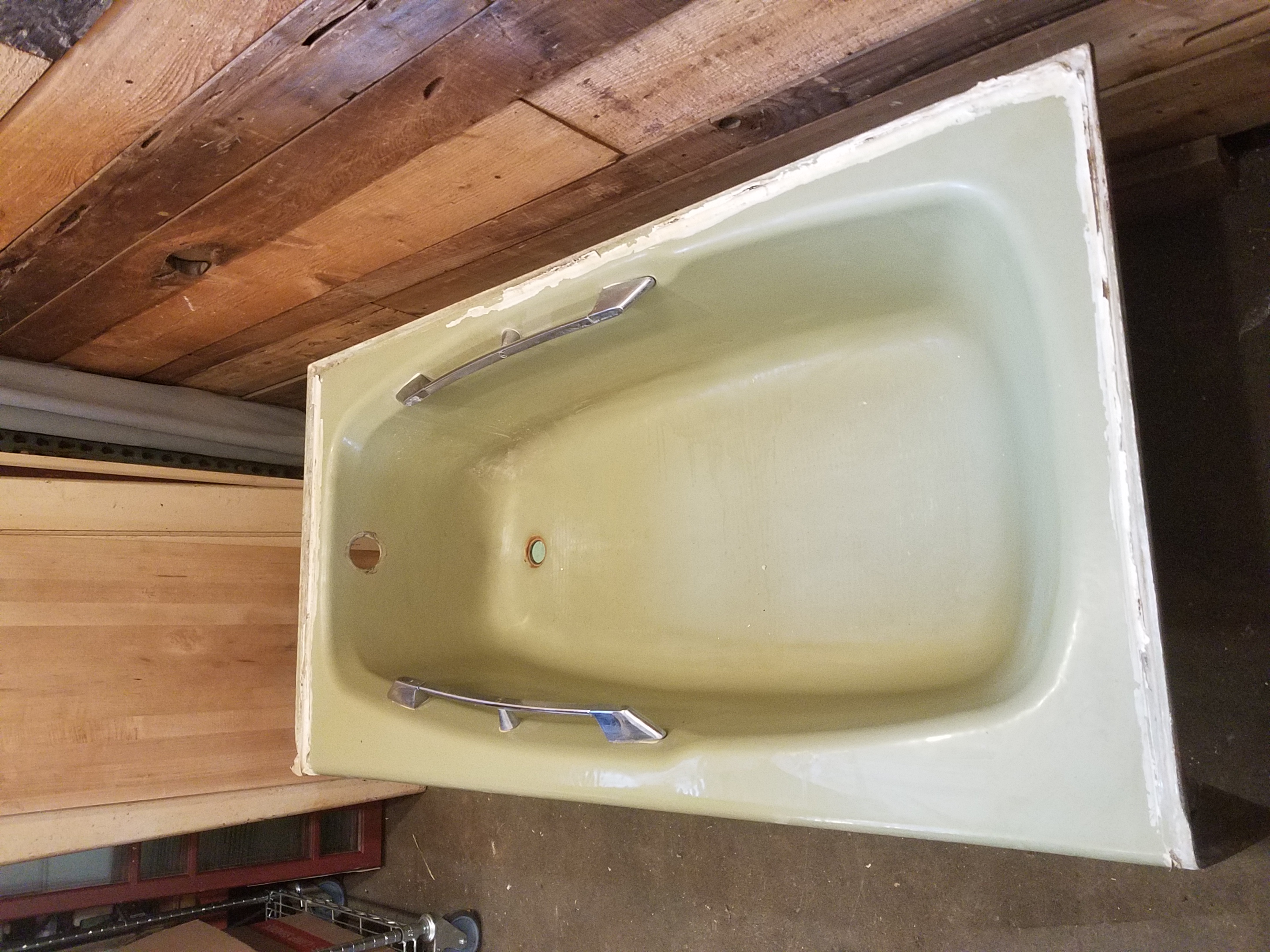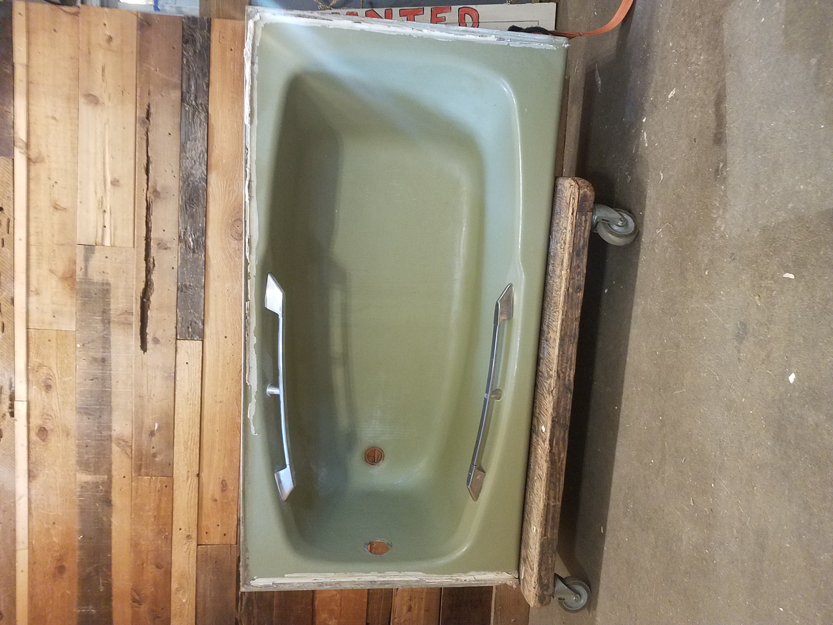 Vintage cast iron apron/alcove bathtub with an enamel finish in the shade drab olive. This earthy green tub is fitted with chrome handlebars.