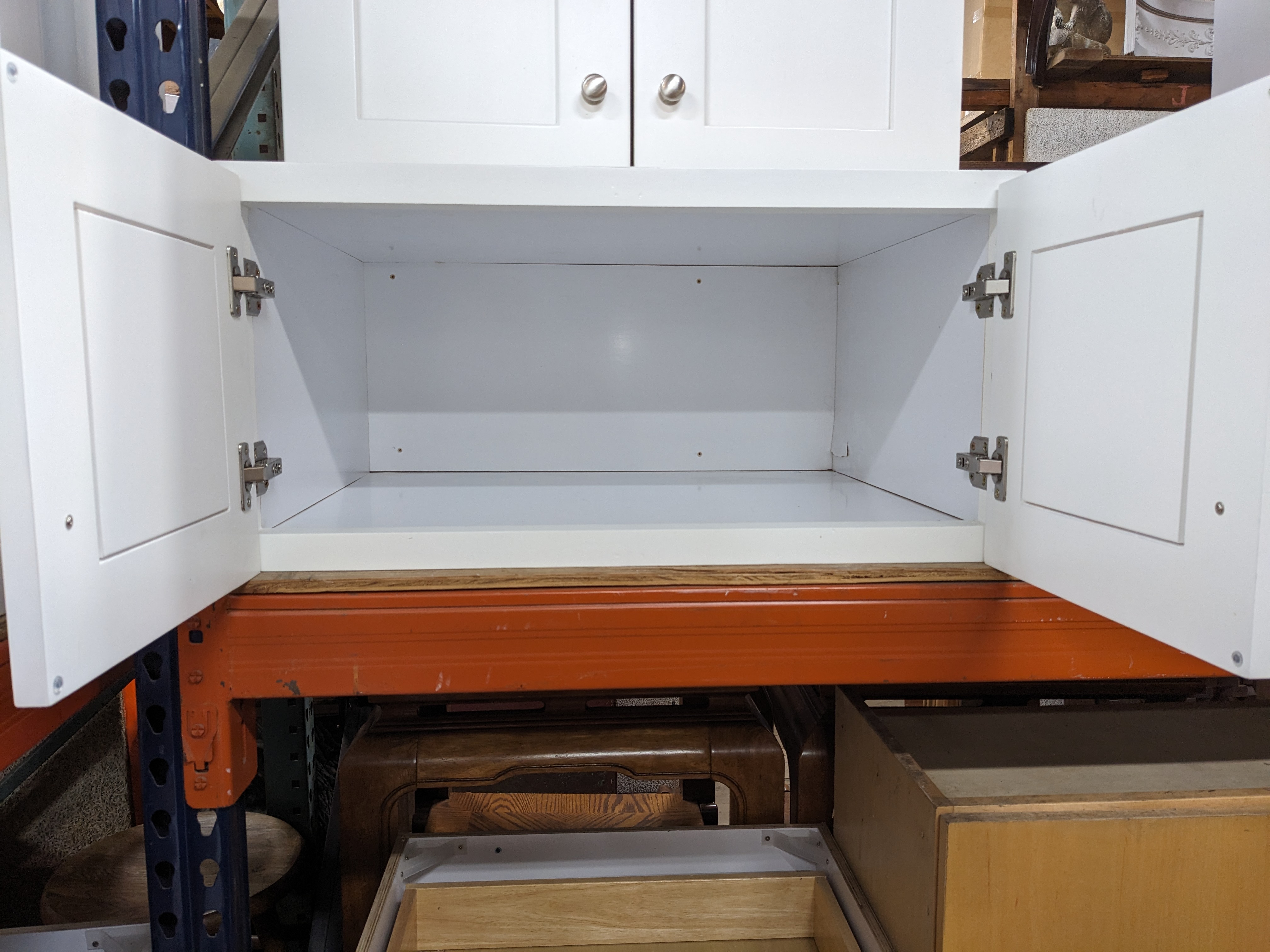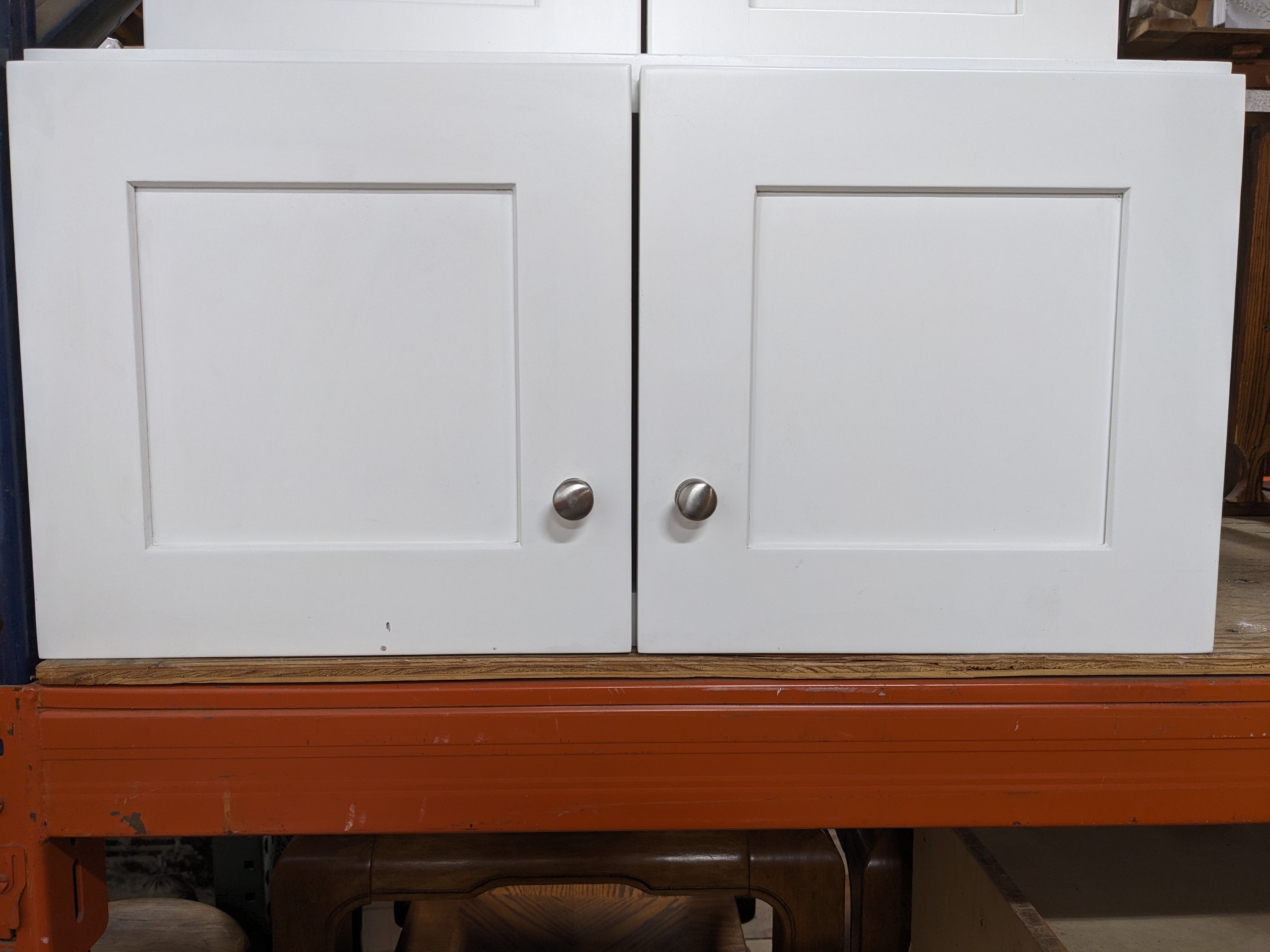 Contemporary plywood upper cabinet in fair condition. It has a small area of damage inside in the back. Comes with brushed nickel hardware. Shaker style that will fit most styles and eras. It measures 30 x 15 x 24 inches.