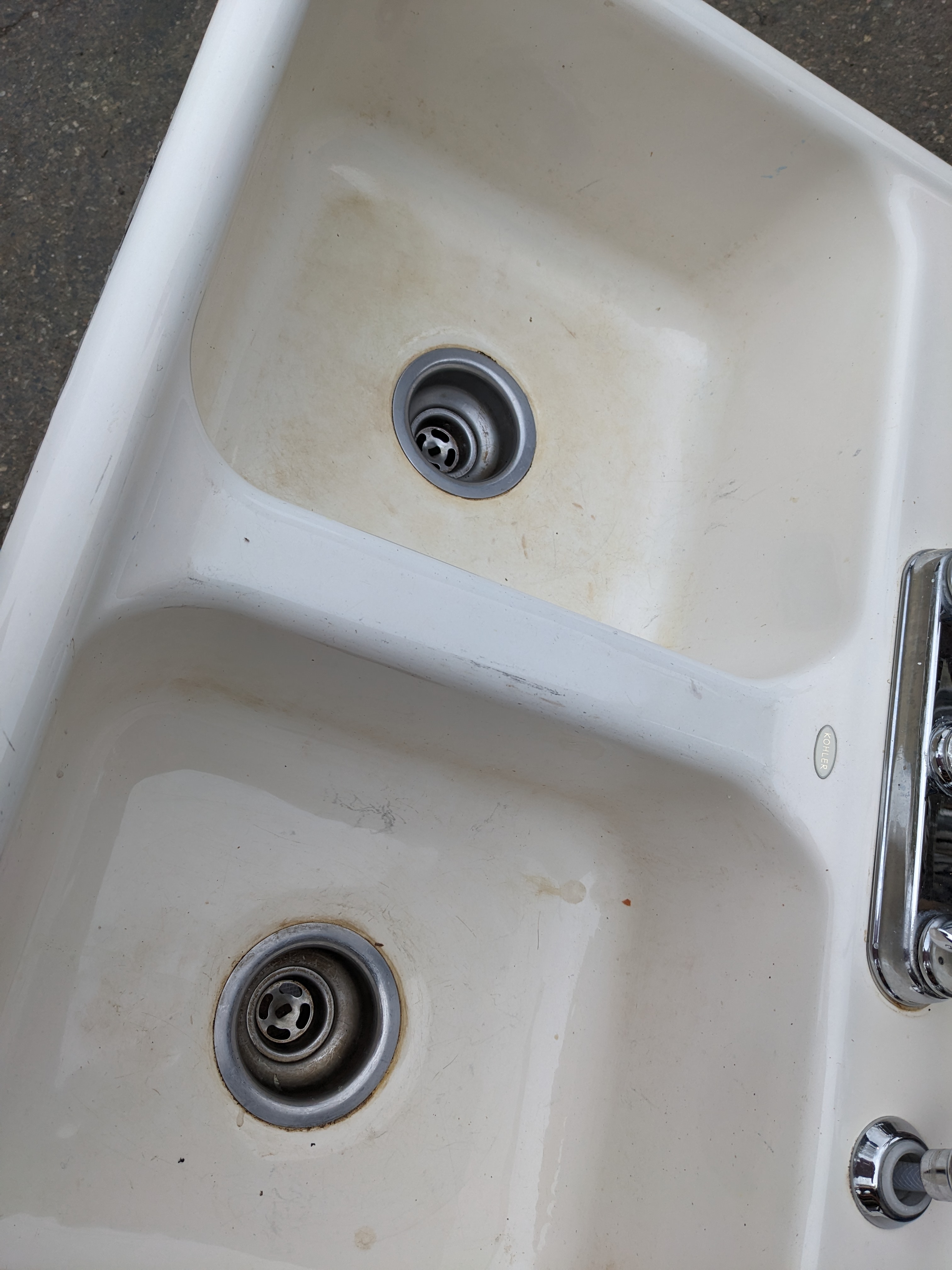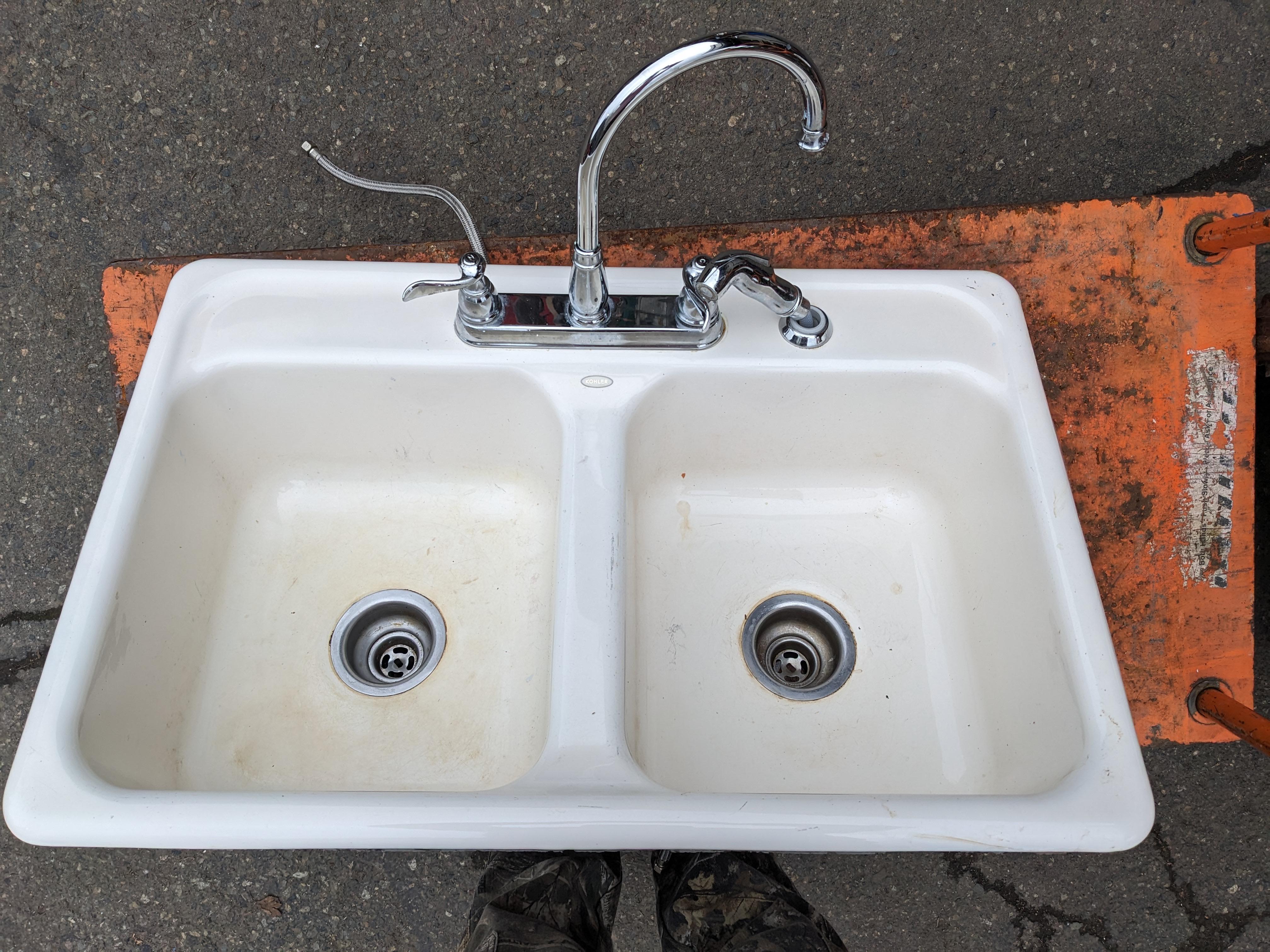 This sink measures 33 x 8.5 x 22. Some staining in the left basin but no cracks, chips, or damage.