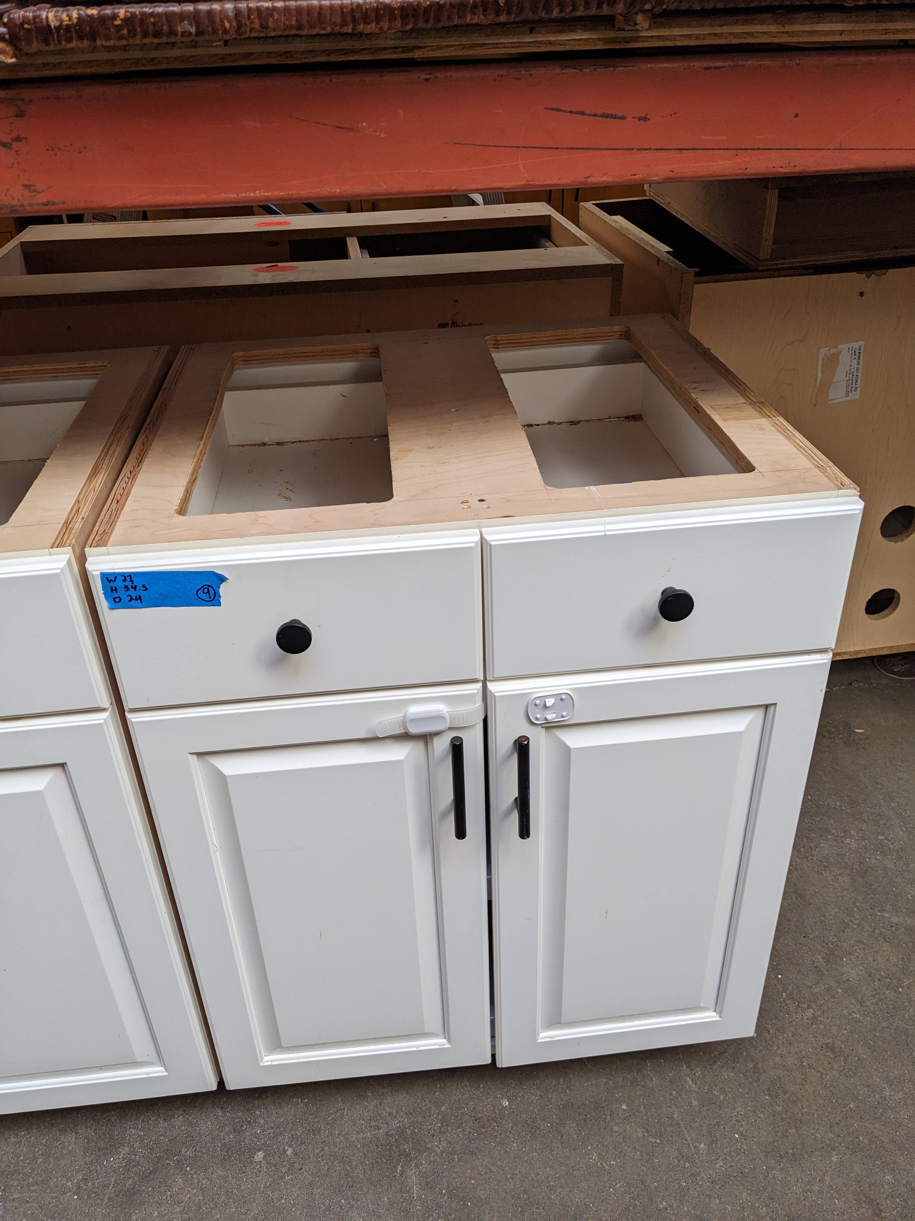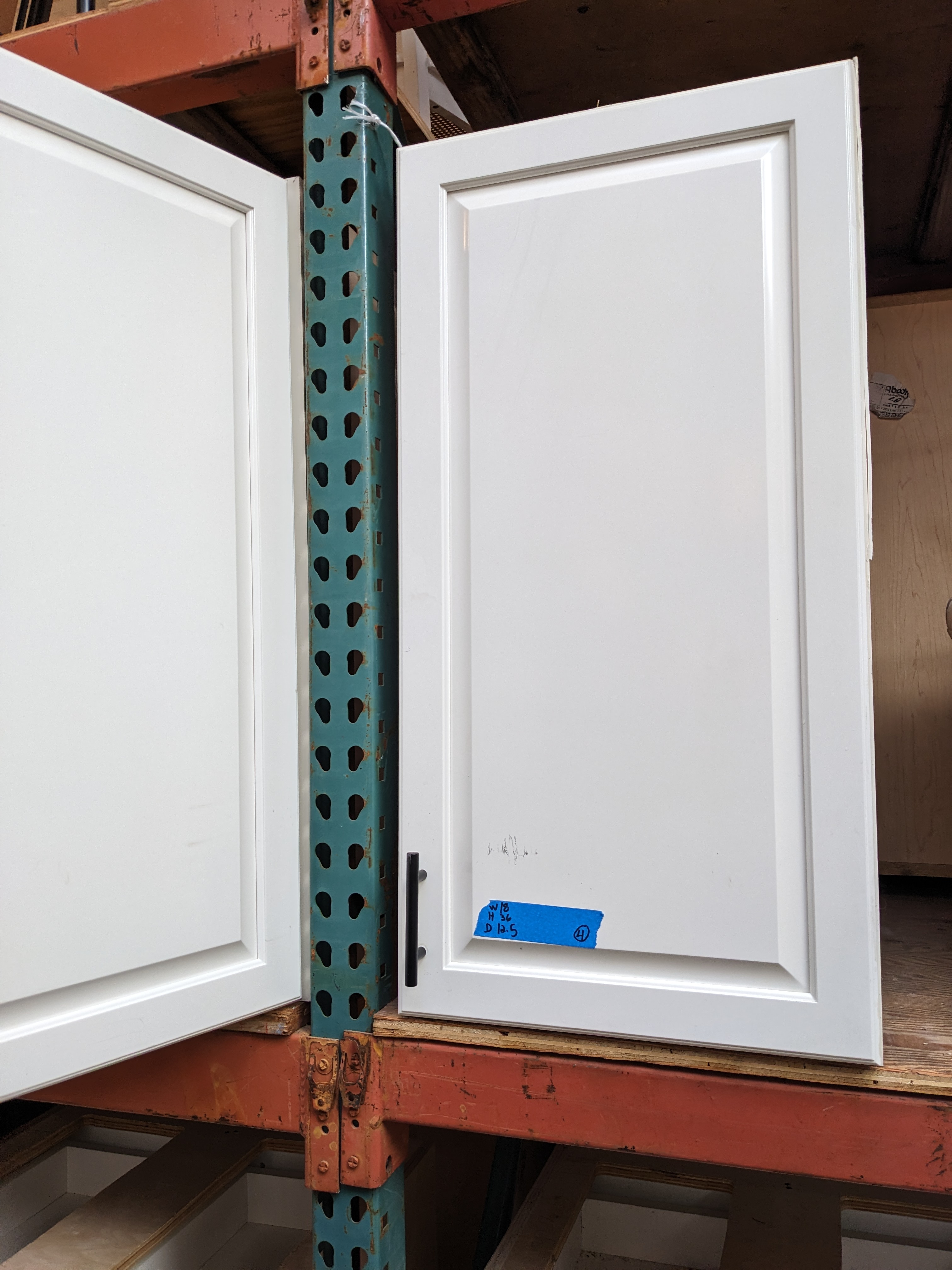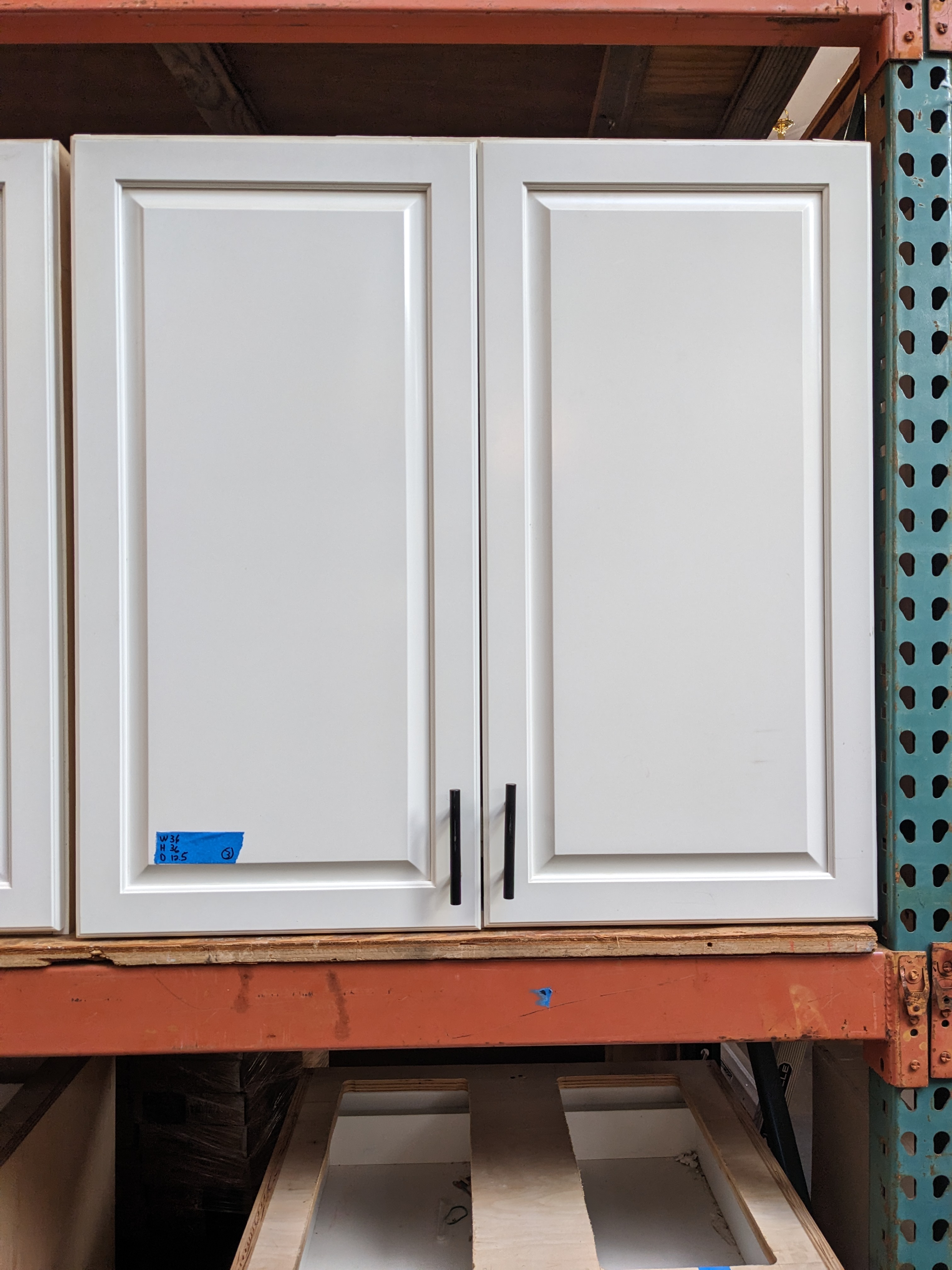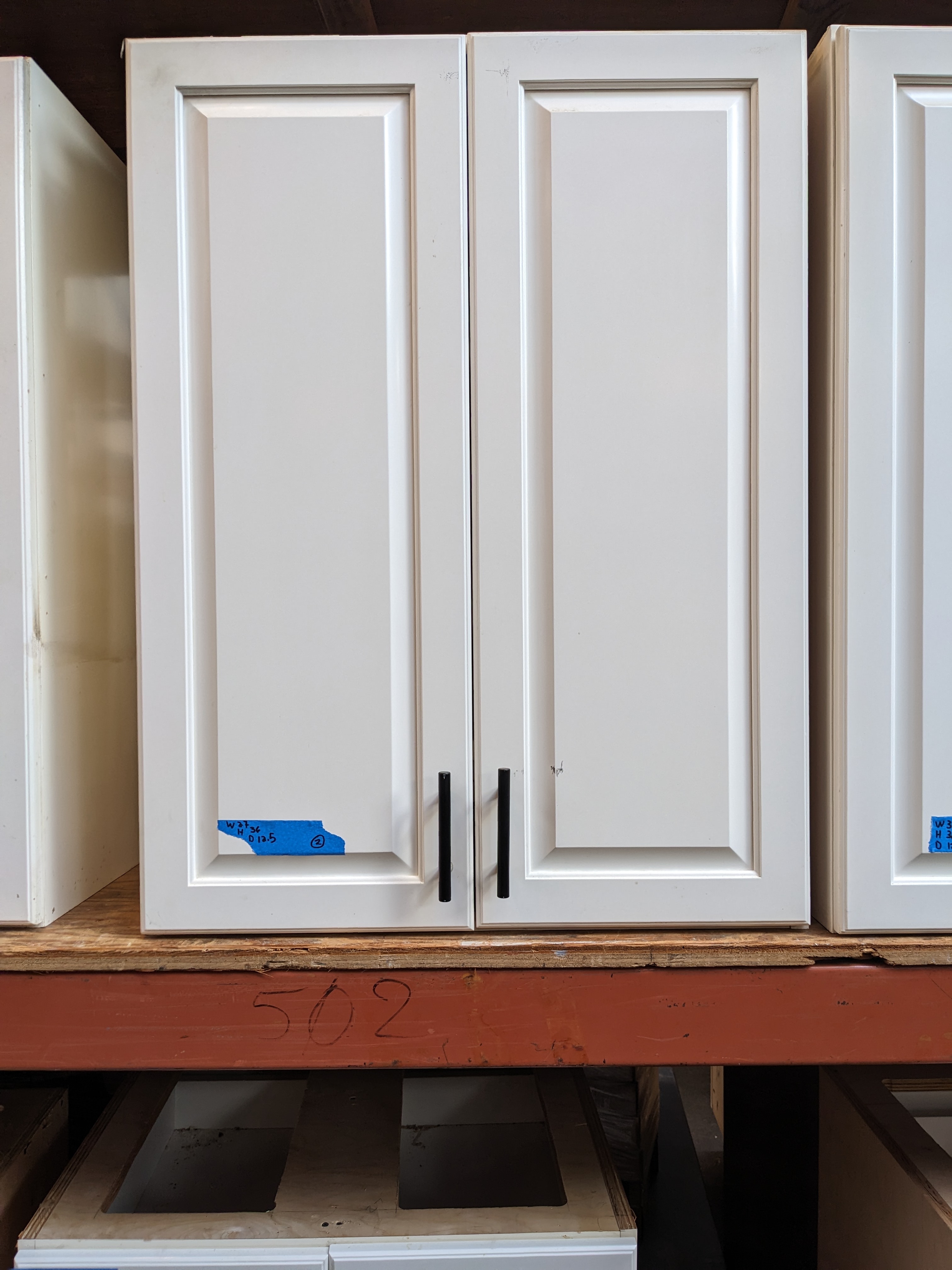 We have a lovely plywood cabinet set with white doors and black pulls. This set includes 4 uppers with shelves that are 36" tall and 12.5 deep. Even without a sink box, this set will add a touch of luxury to your home. Each of the lowers features either gliding shelves and drawers, just drawers, or a lazy Susan