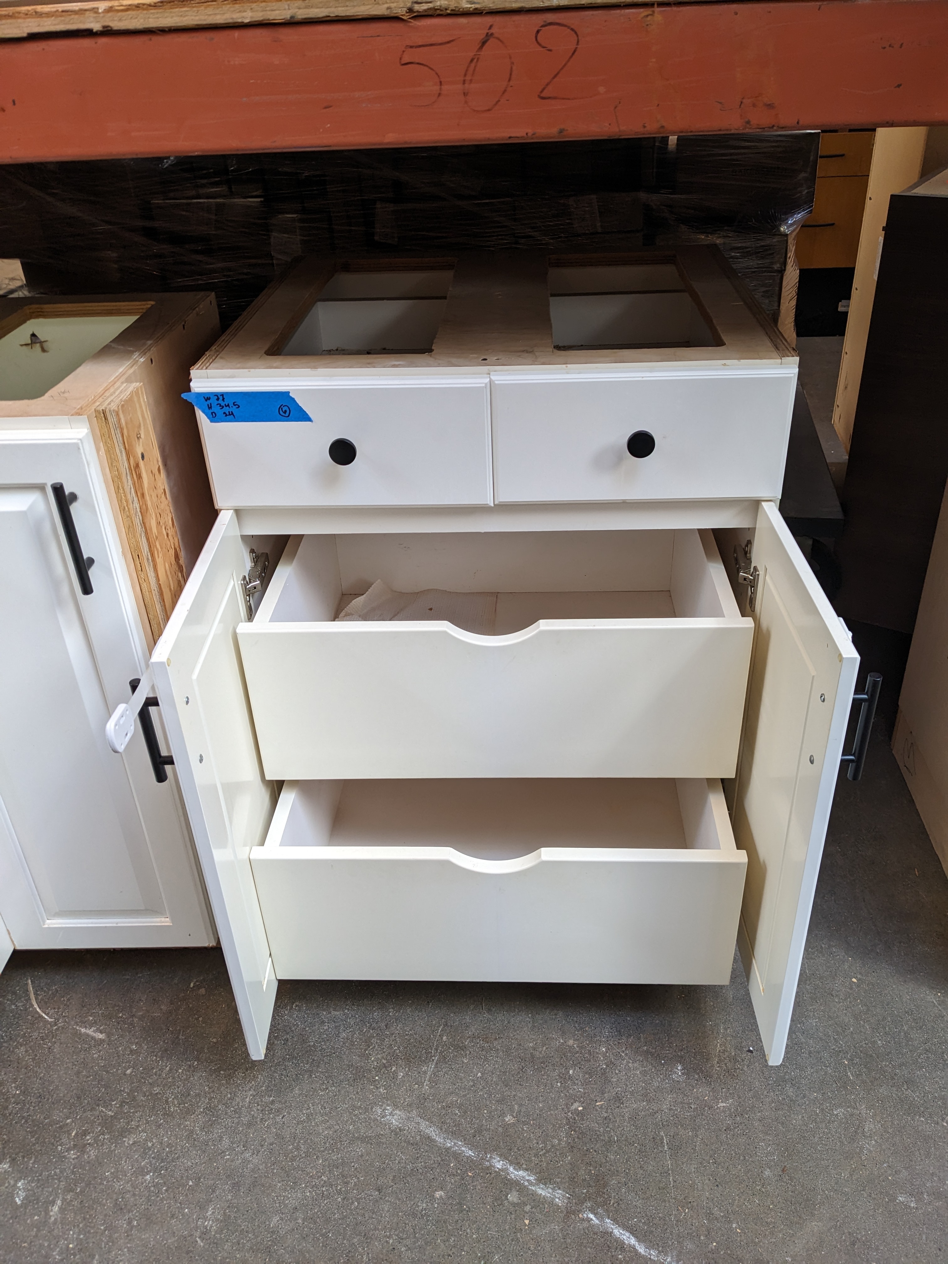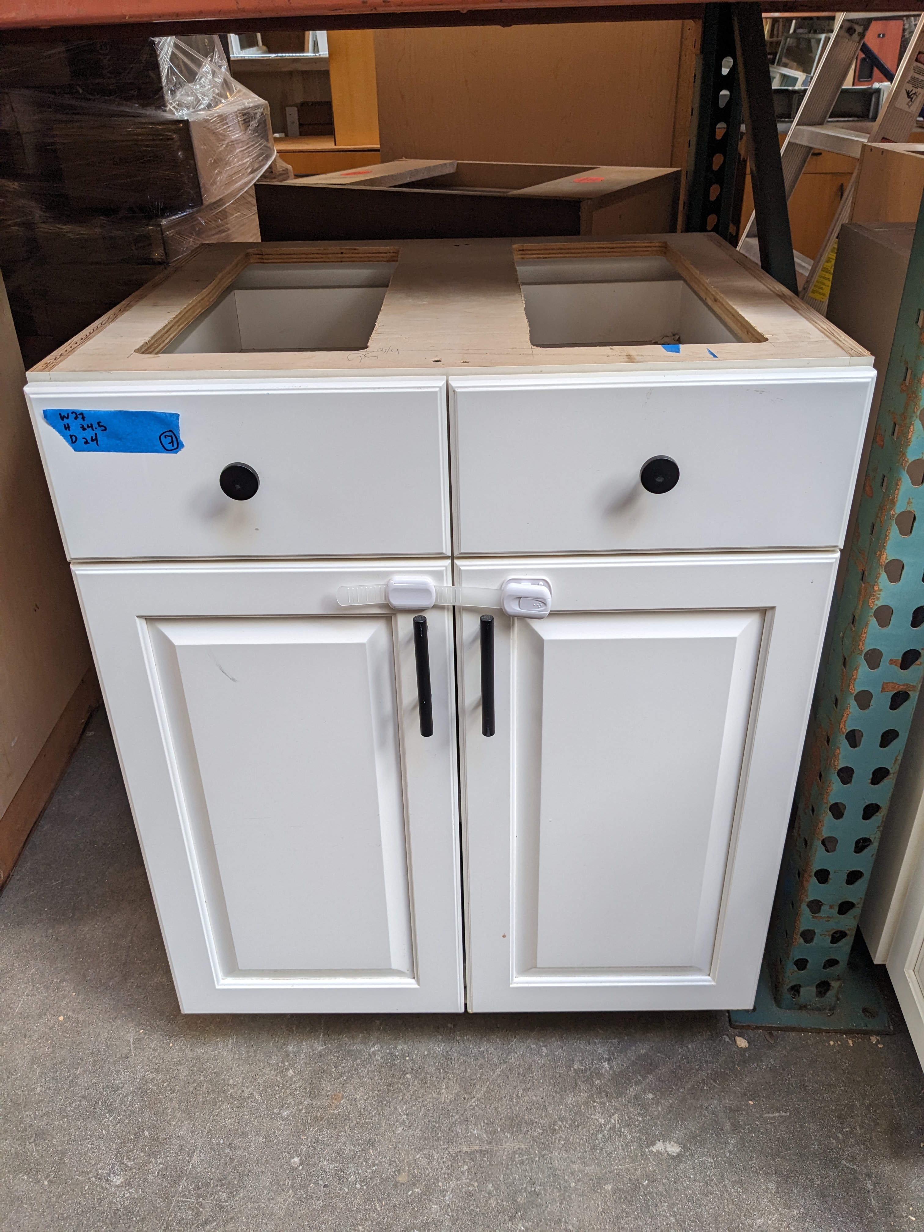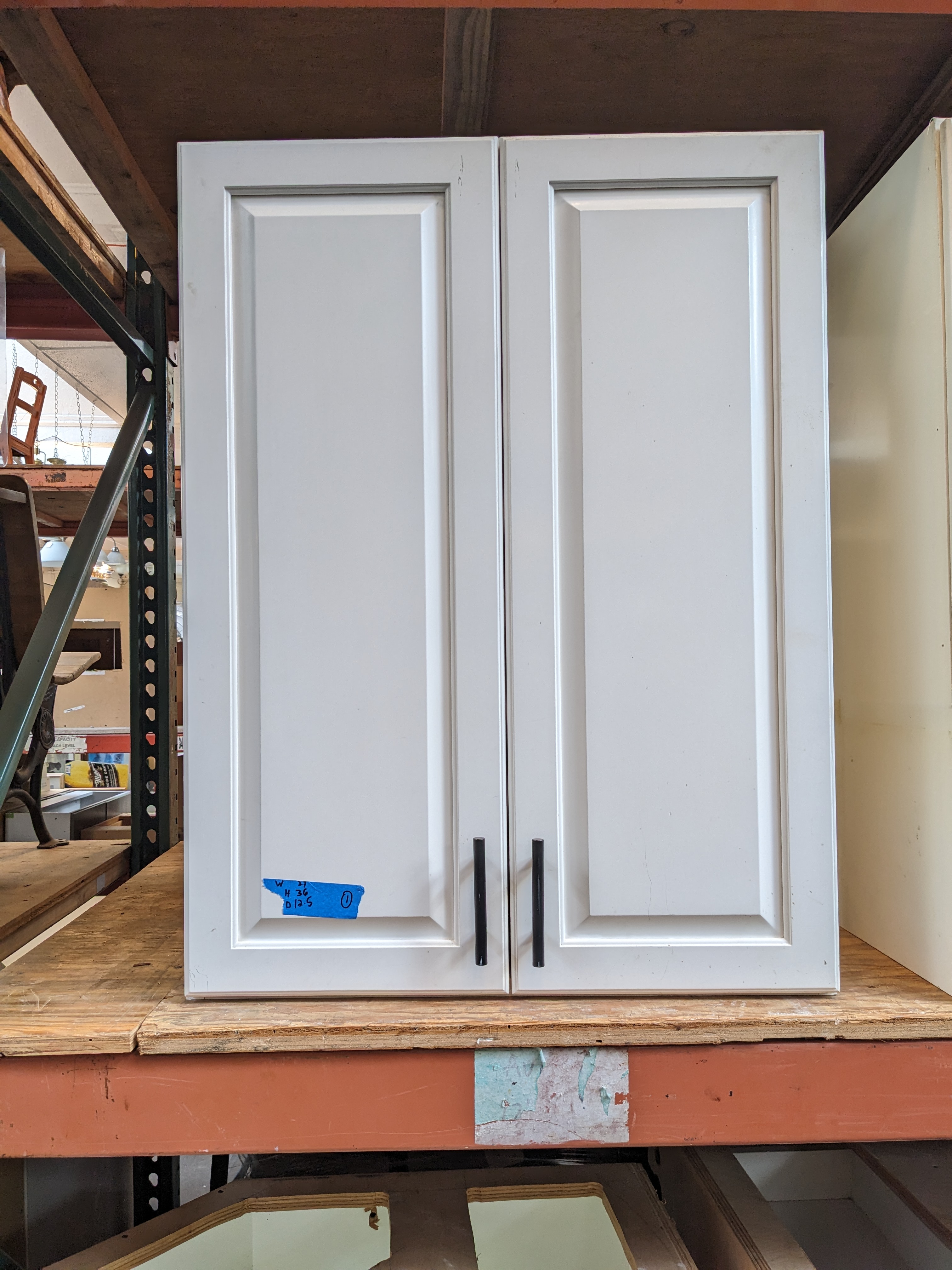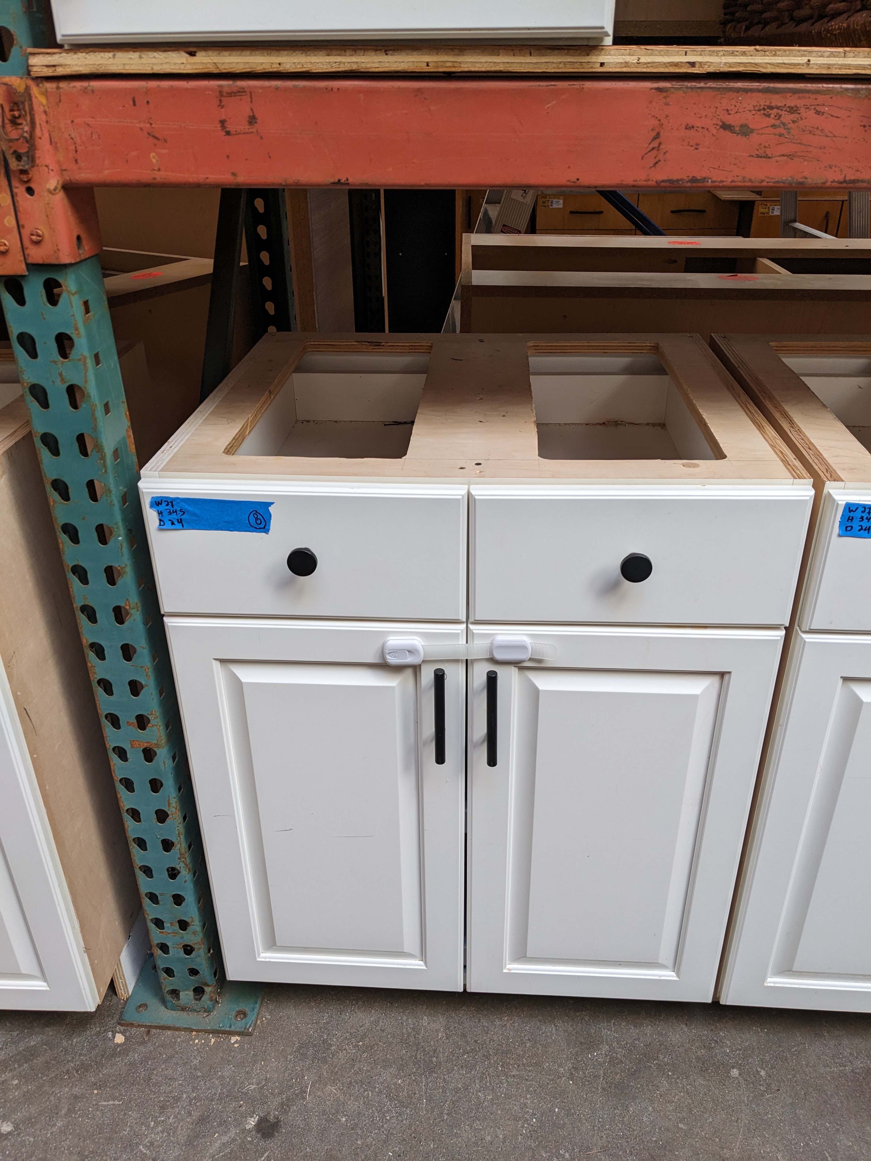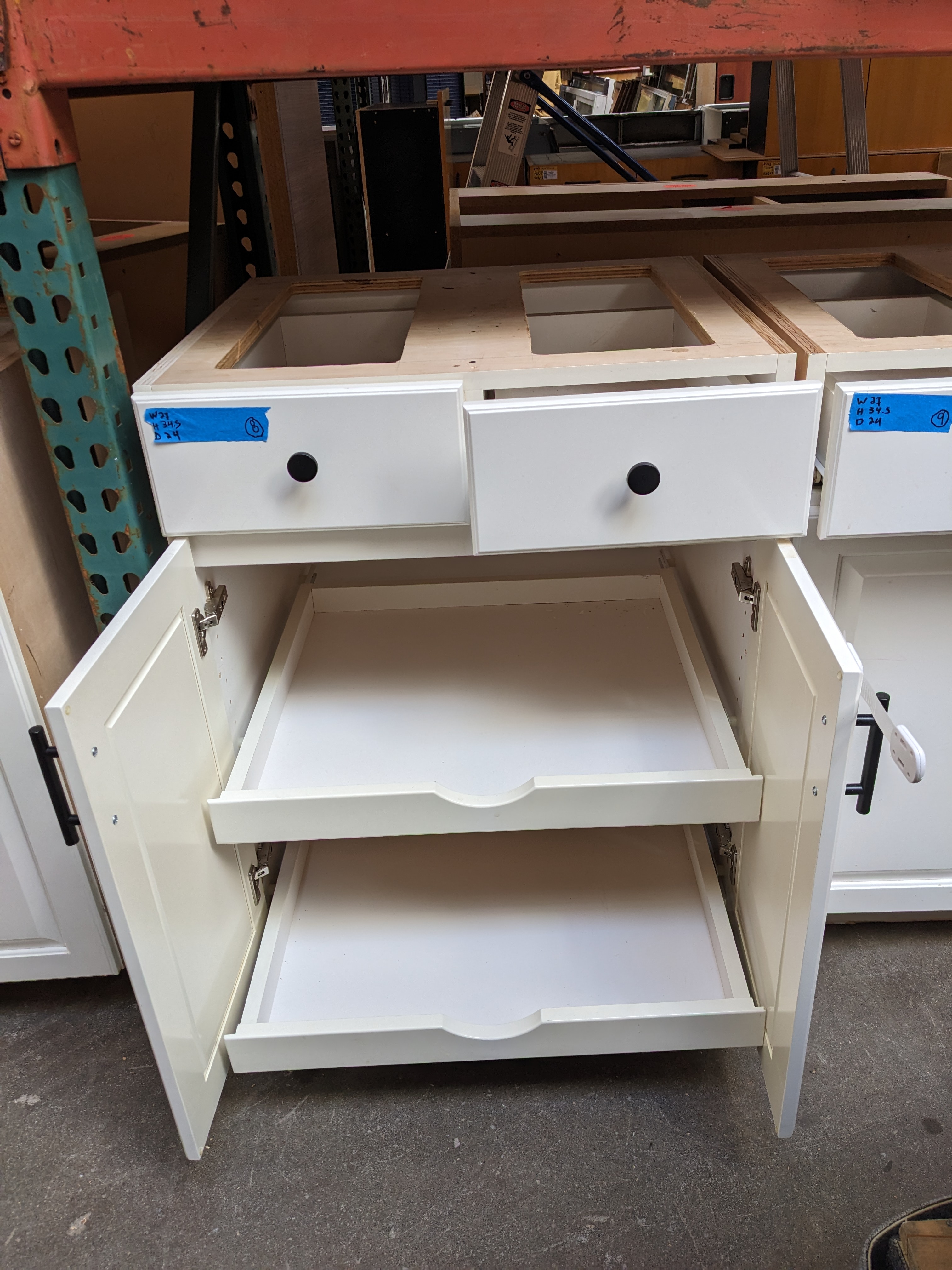 We have a lovely plywood cabinet set with white doors and black pulls. This set includes 4 uppers with shelves that are 36" tall and 12.5 deep. Even without a sink box, this set will add a touch of luxury to your home. Each of the lowers features either gliding shelves and drawers, just drawers, or a lazy Susan