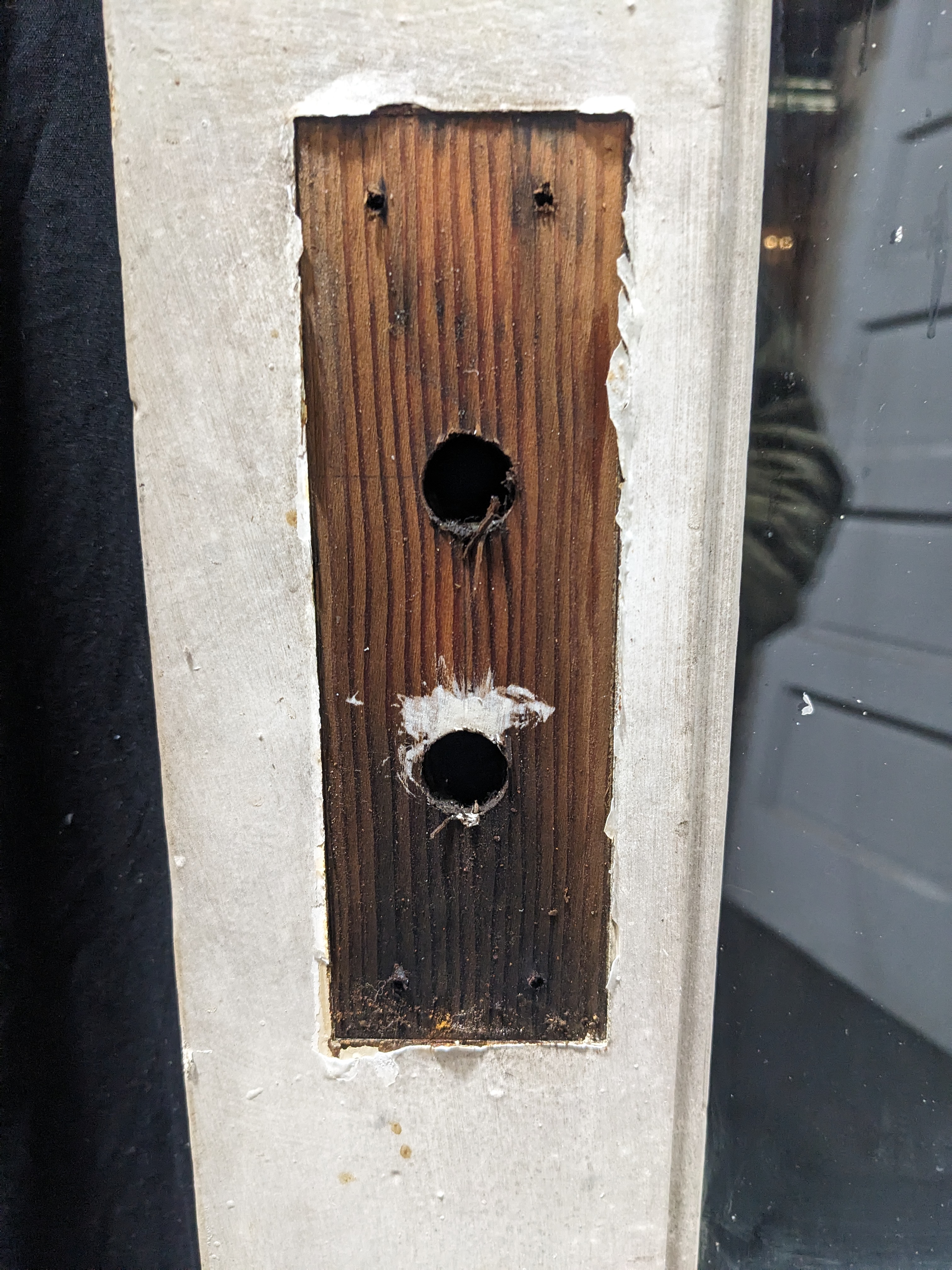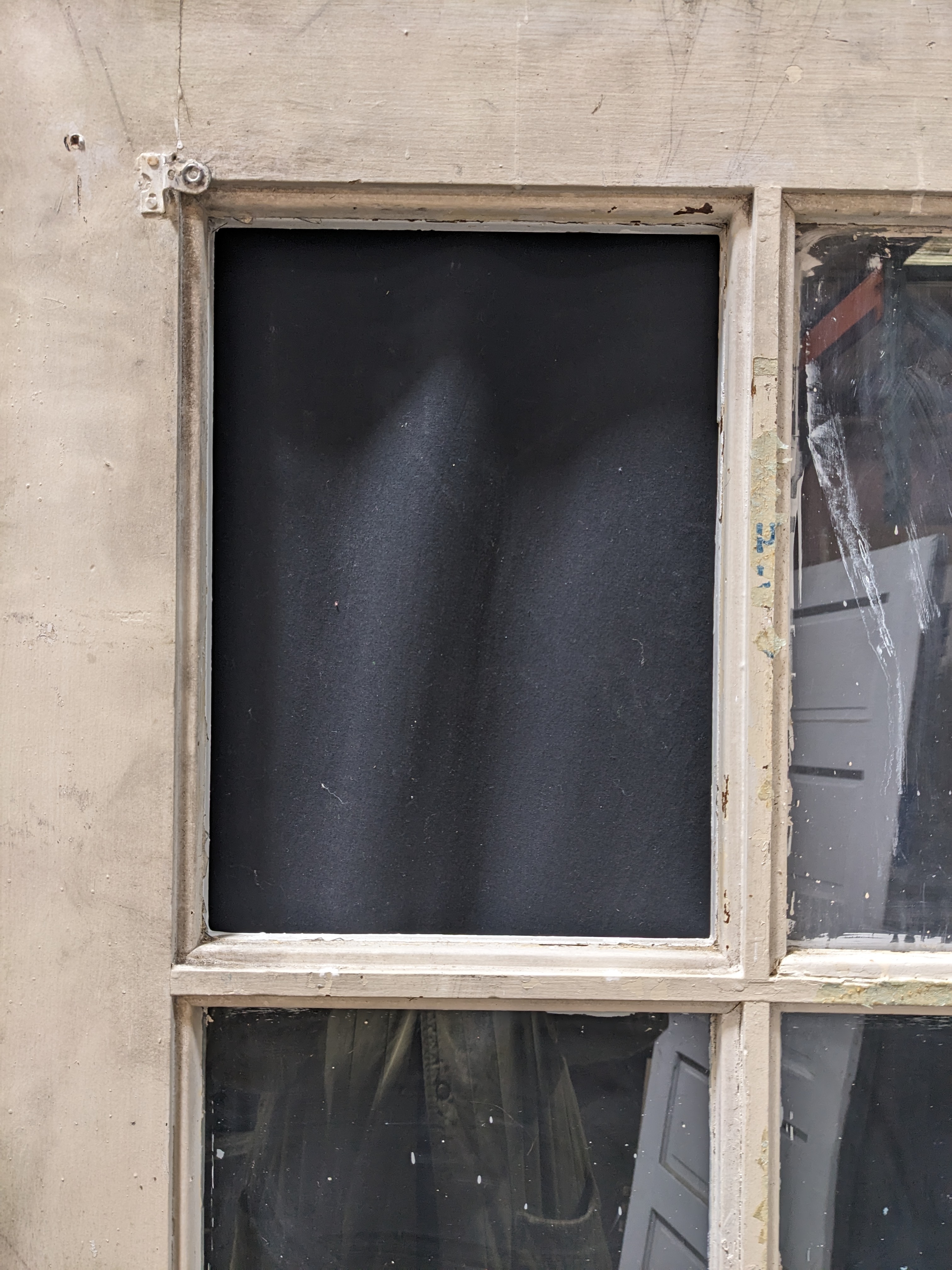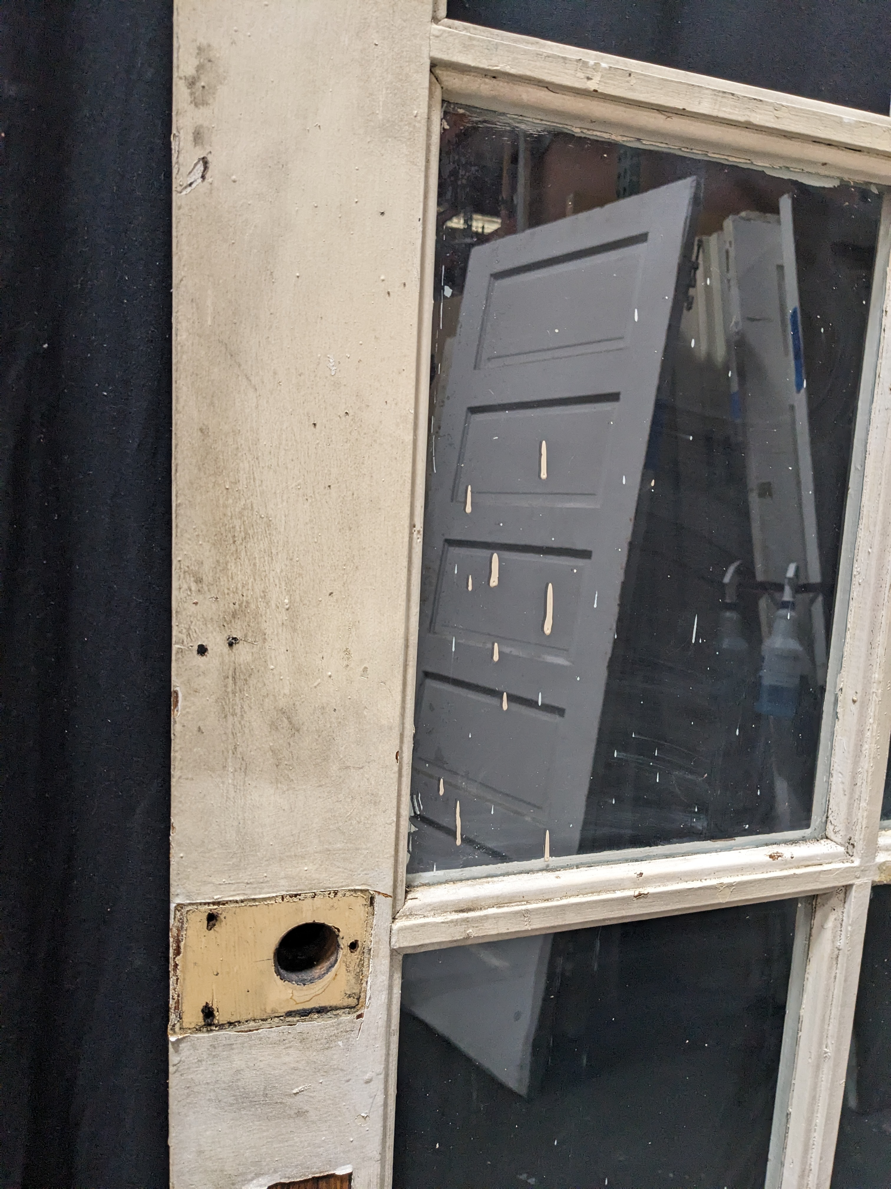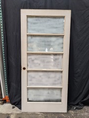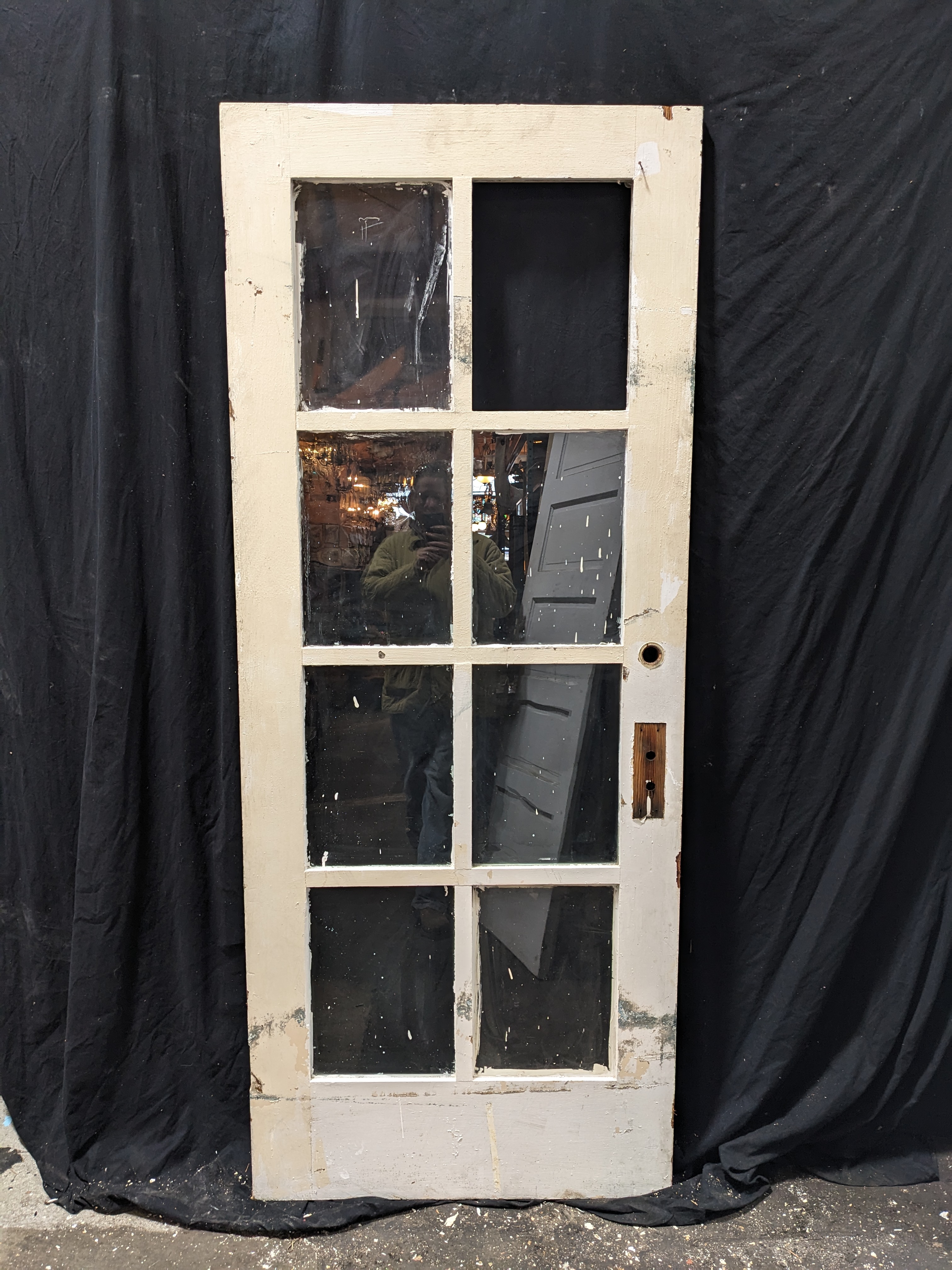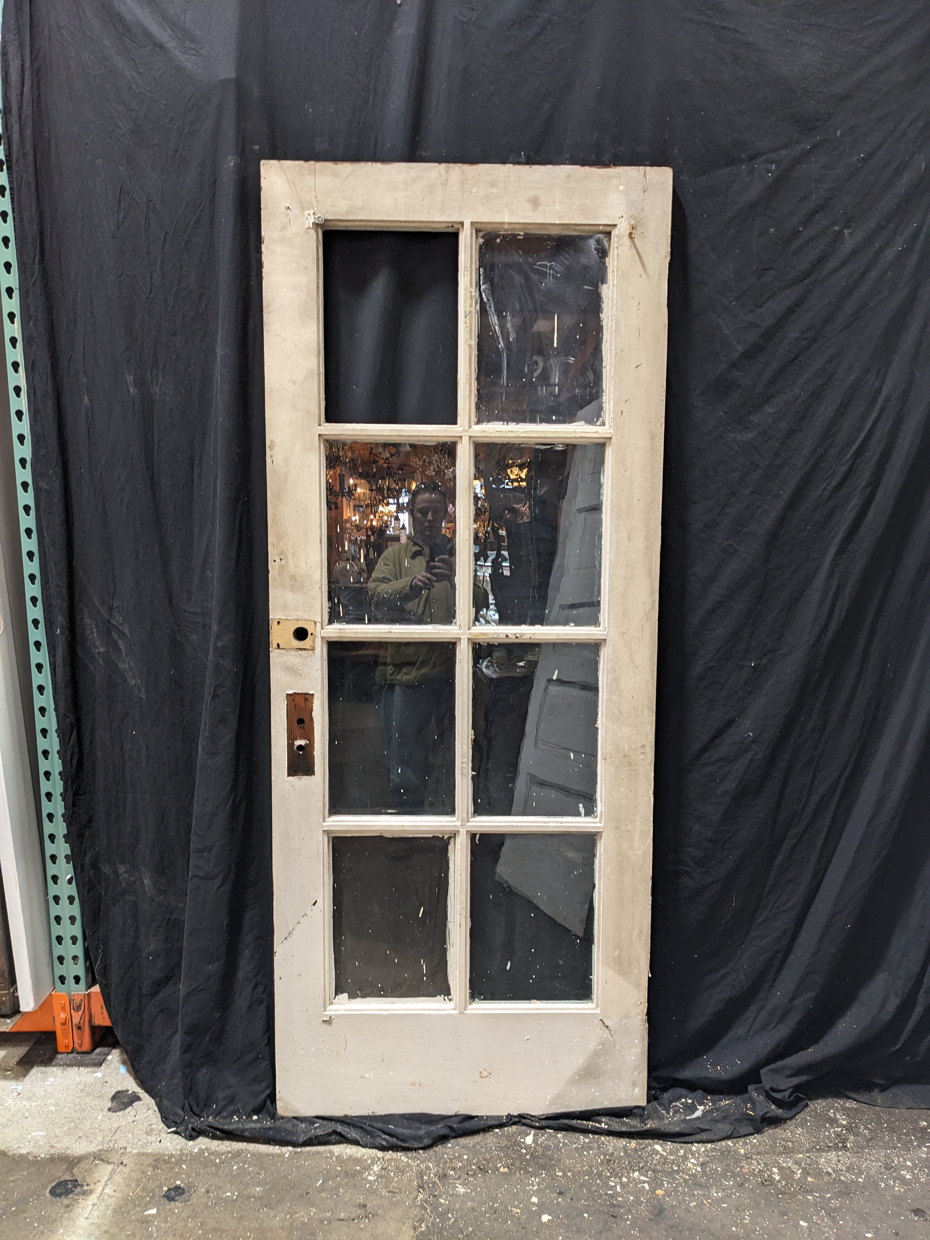 Divided light eight panel glass door. Painted white with several layers of other colors buried below. A little scrappy with the last paint job, we see some chips and strokes and splatters dipping onto the glass panes, the one top corner panel missing. Its got good bones, but definitely a fix up project. We can see the original wood grain peeking through from under the faceplate, and would do beautifully as a patio door with a paint strip and reseal. Left open with a hinge notch open to both sides. Dimensions: 32 x 78.5 x 1.375