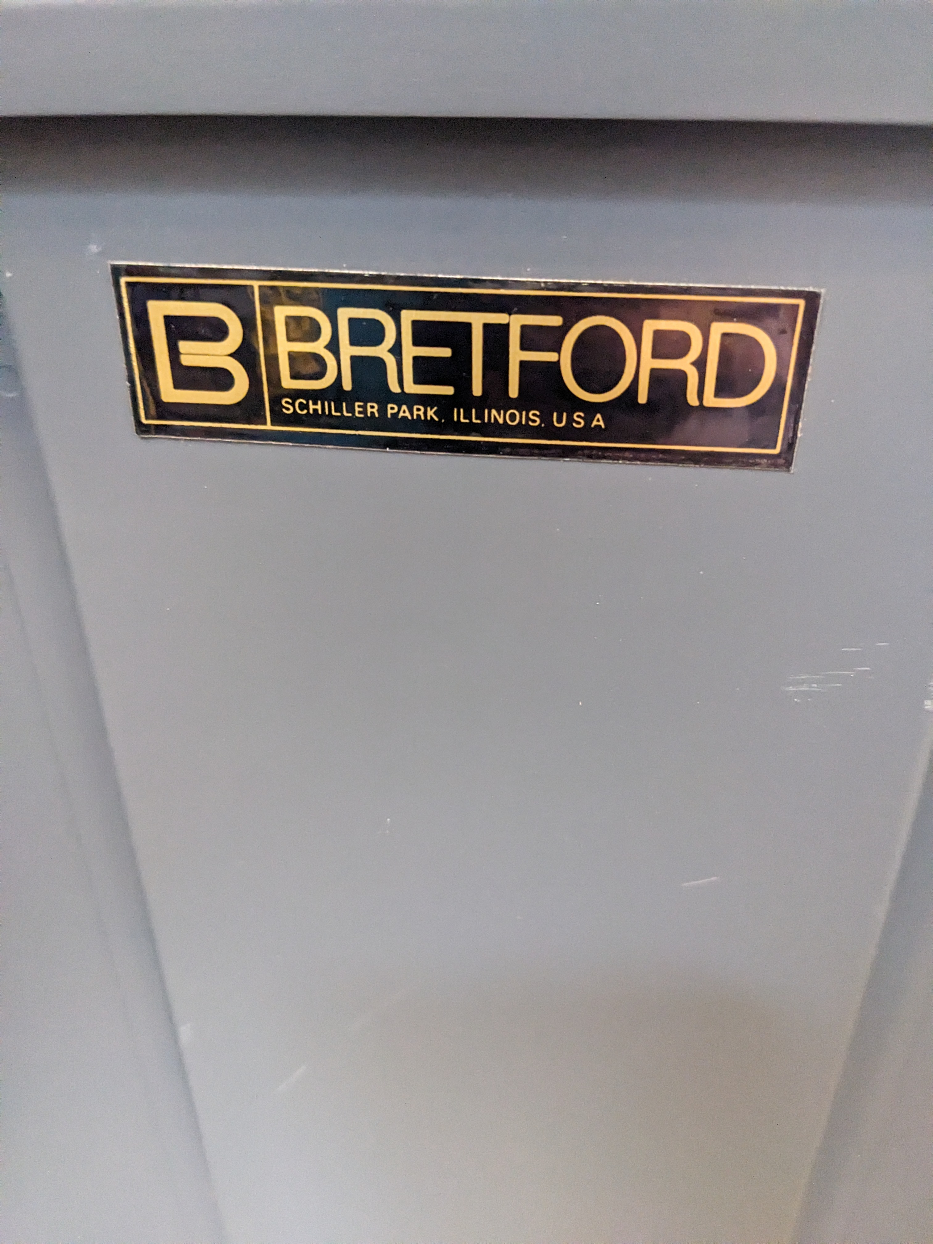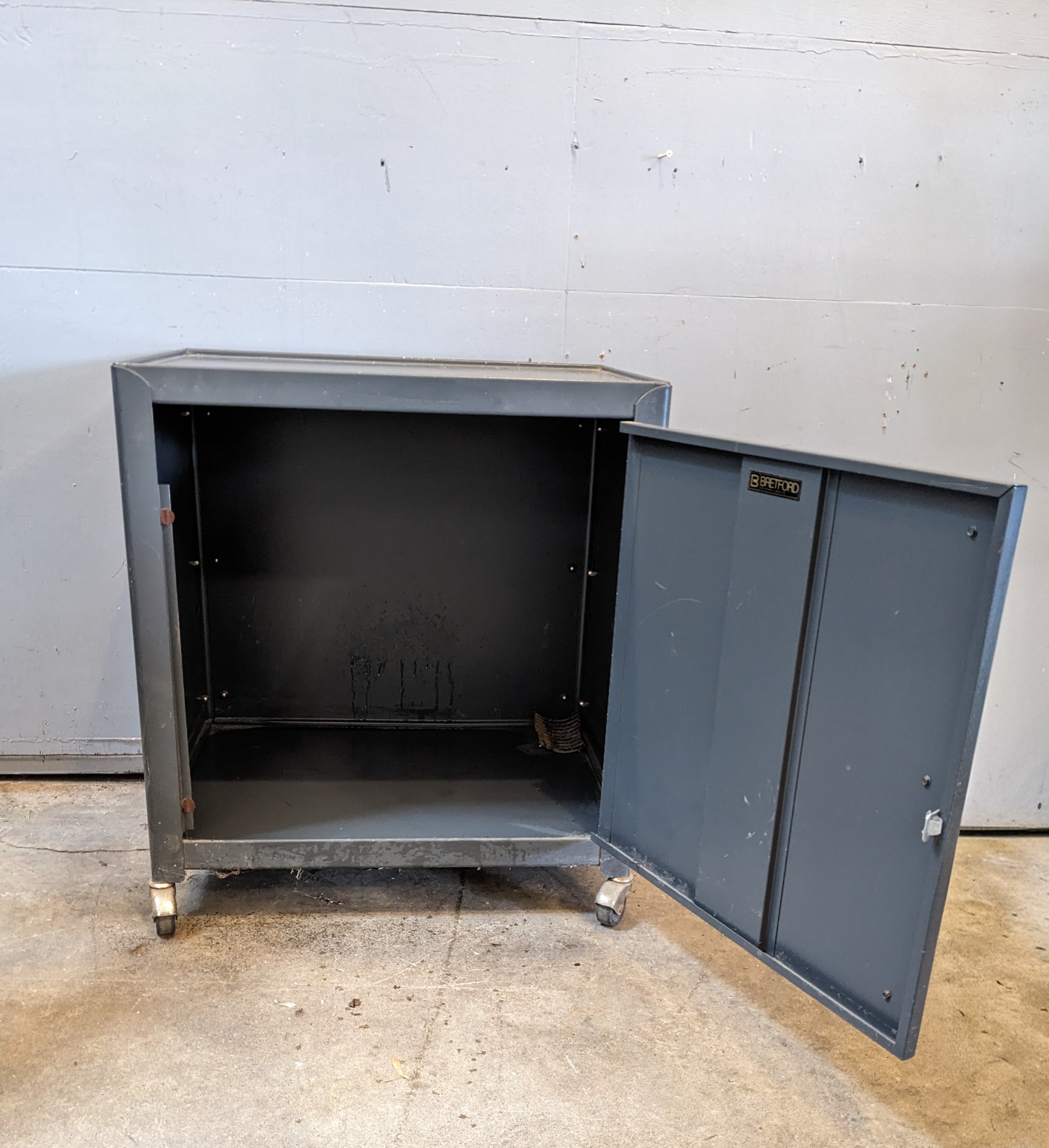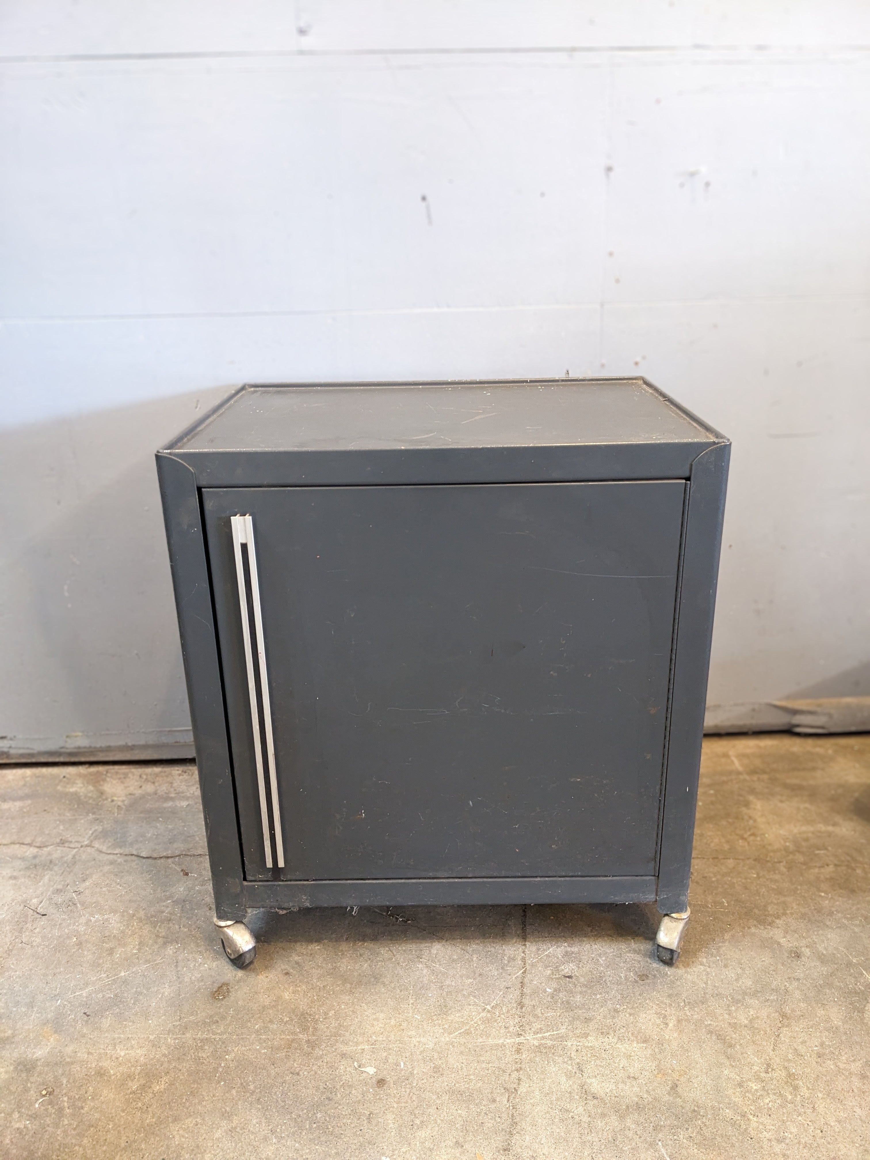 We have a sturdy steel cube shaped cabinet on casters. This is a high quality and heavy duty cart manufactured by Bretford and would make a perfect addition to your shop or office.