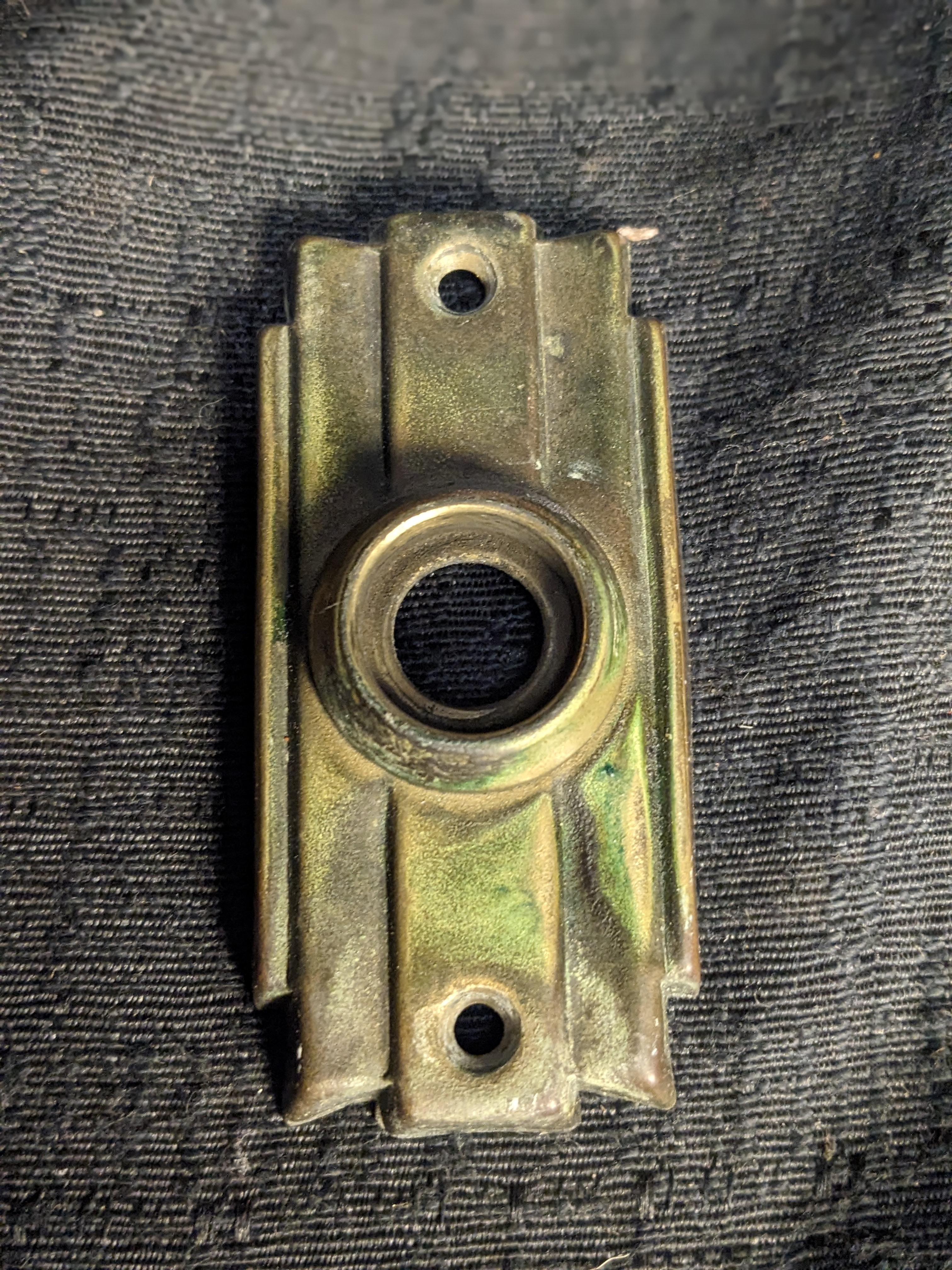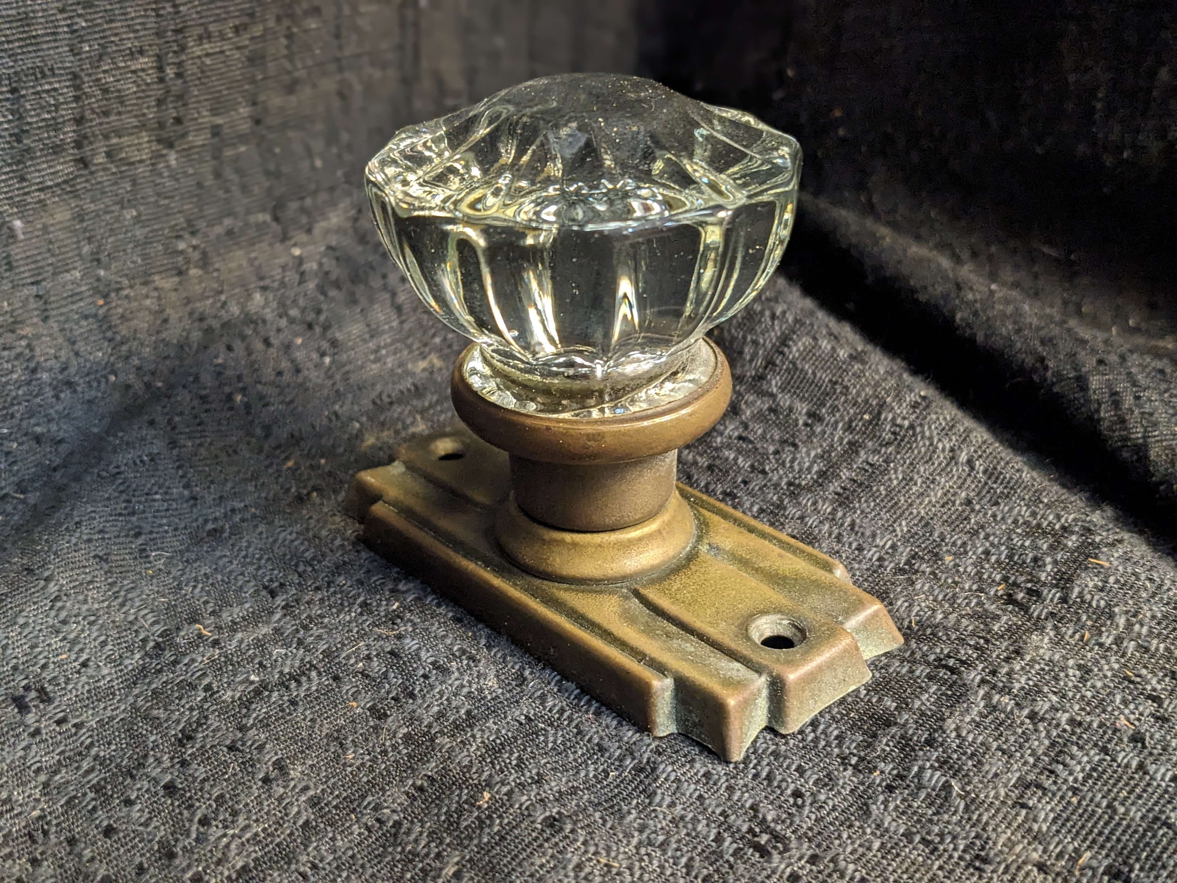 Brass back plates and glass knobs in fairly good condition for the age. These were salvaged from a late 20s Seattle home.