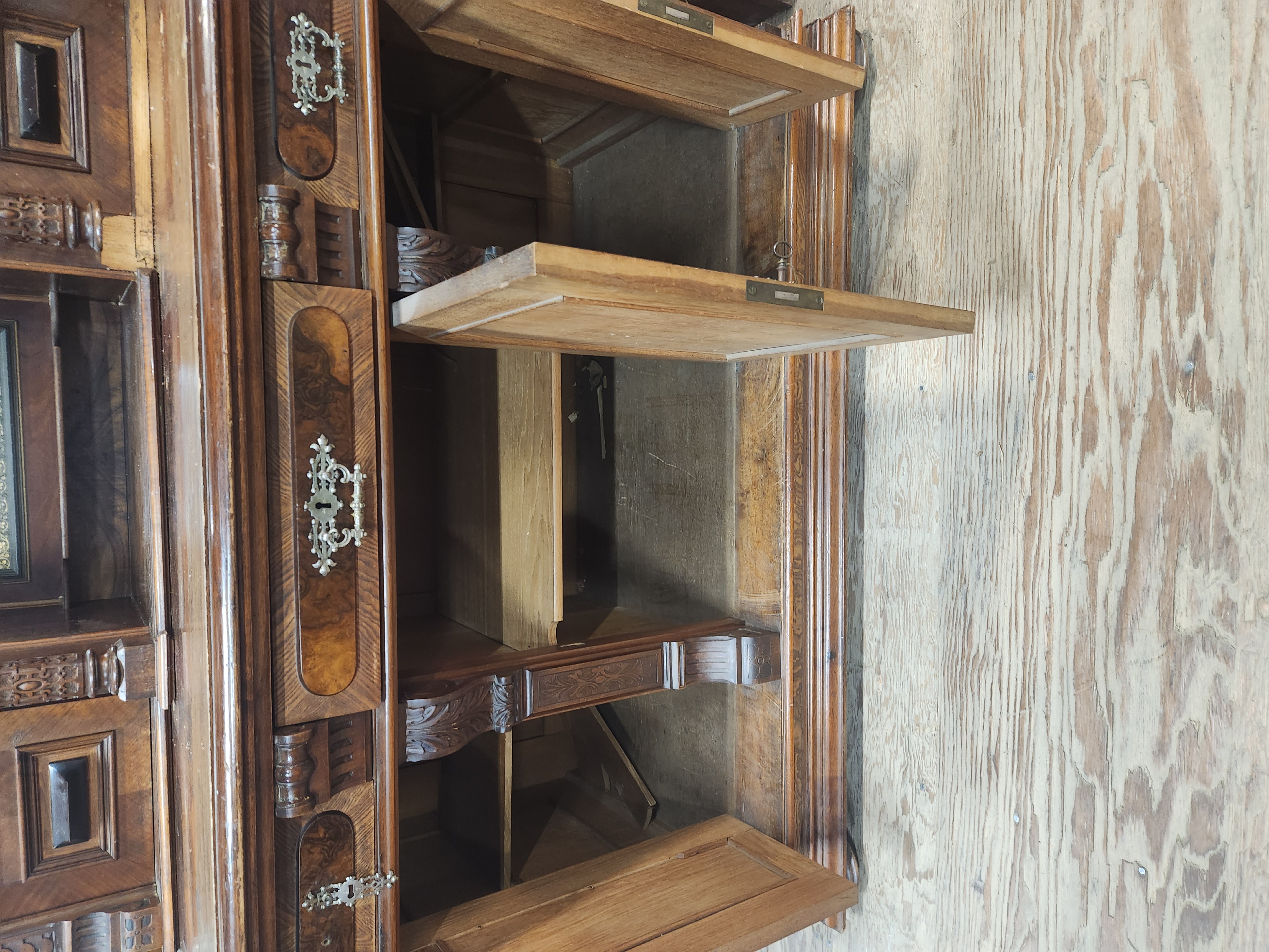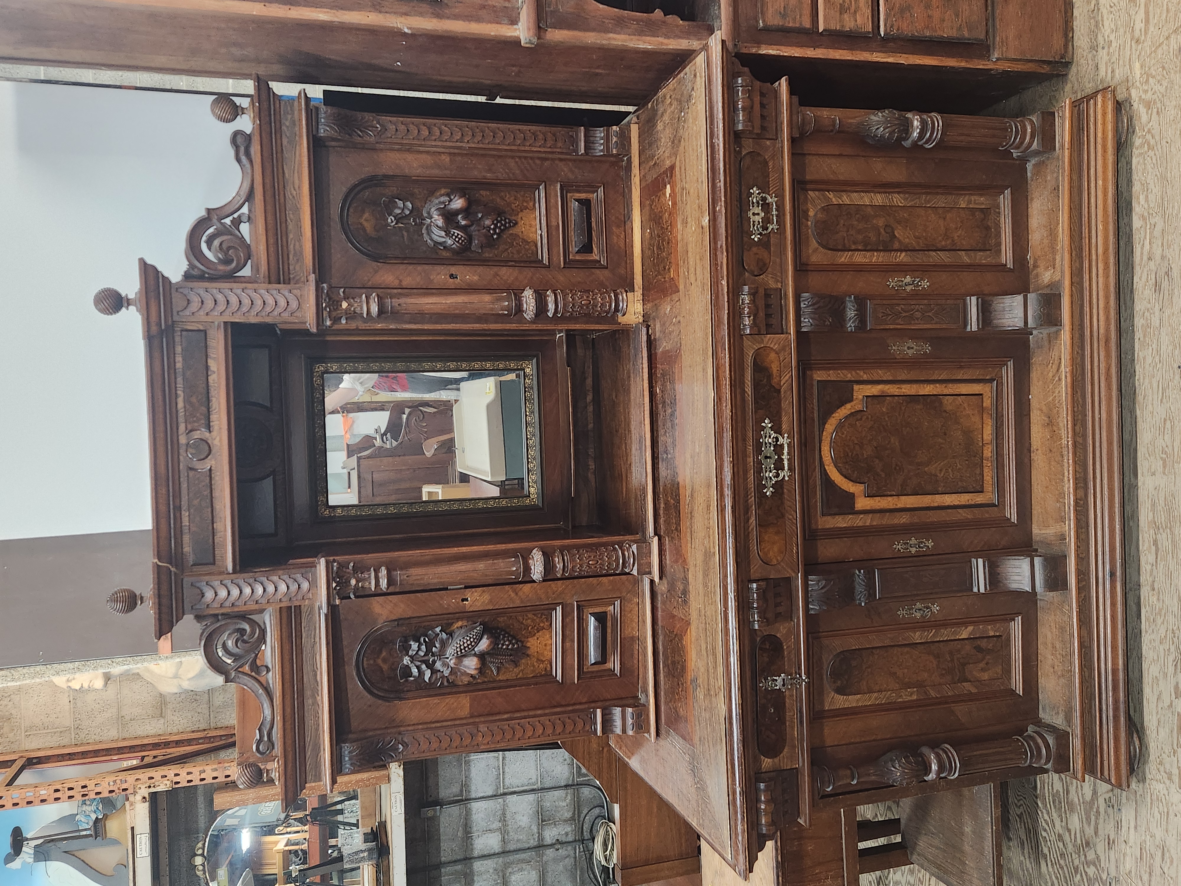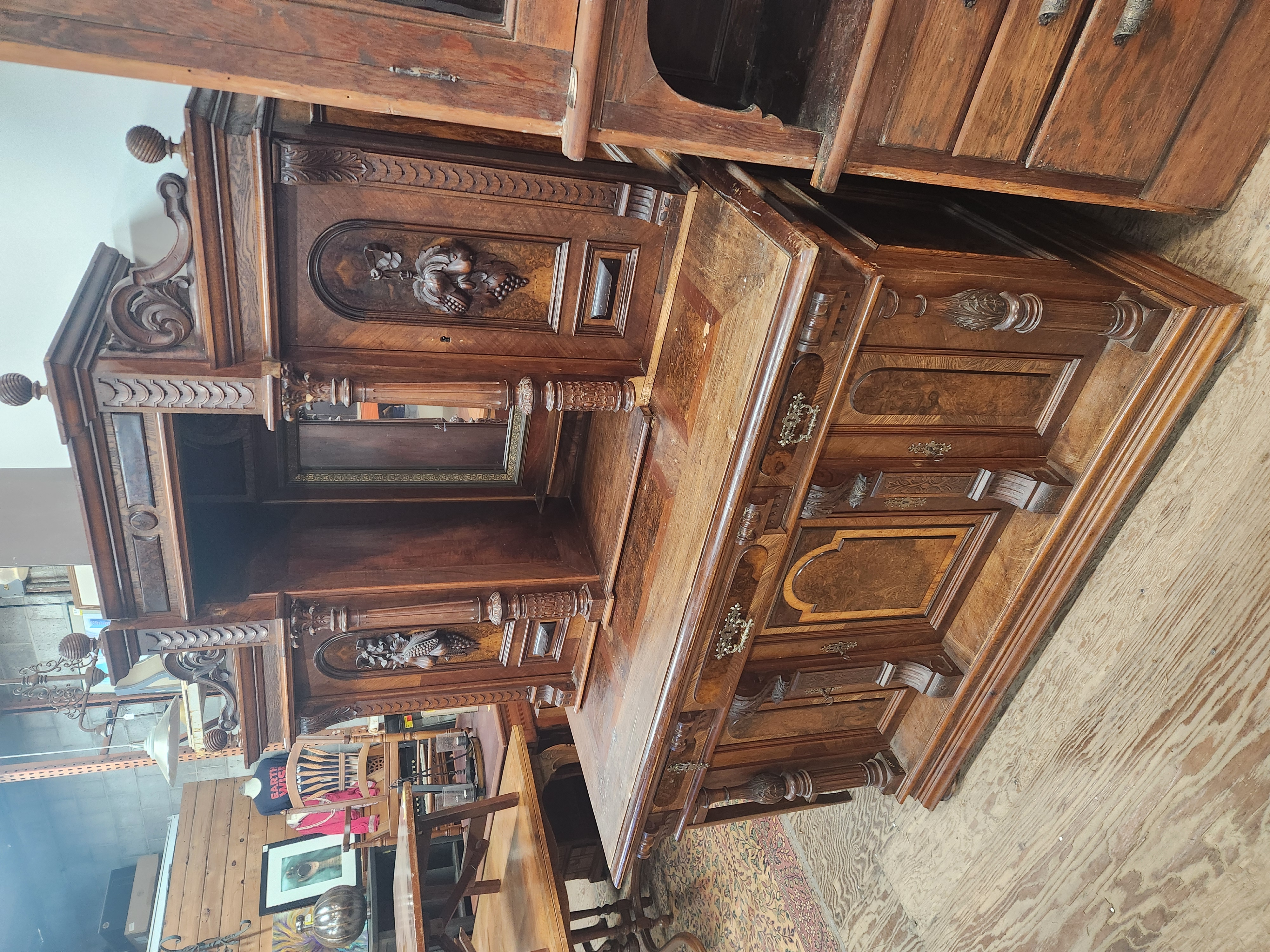 A large hutch with a lot to offer, but will need a patient hand to bring it back to its former glory. It is missing several decorative elements and has a damaged veneer. The bottom doors all have keys attached to keep them closed, and the middle one will not stay closed without being locked. Despite the damage and missing elements, this piece still manages to look quite impressive! It measures 57.5 x 75.75 x 28.5.