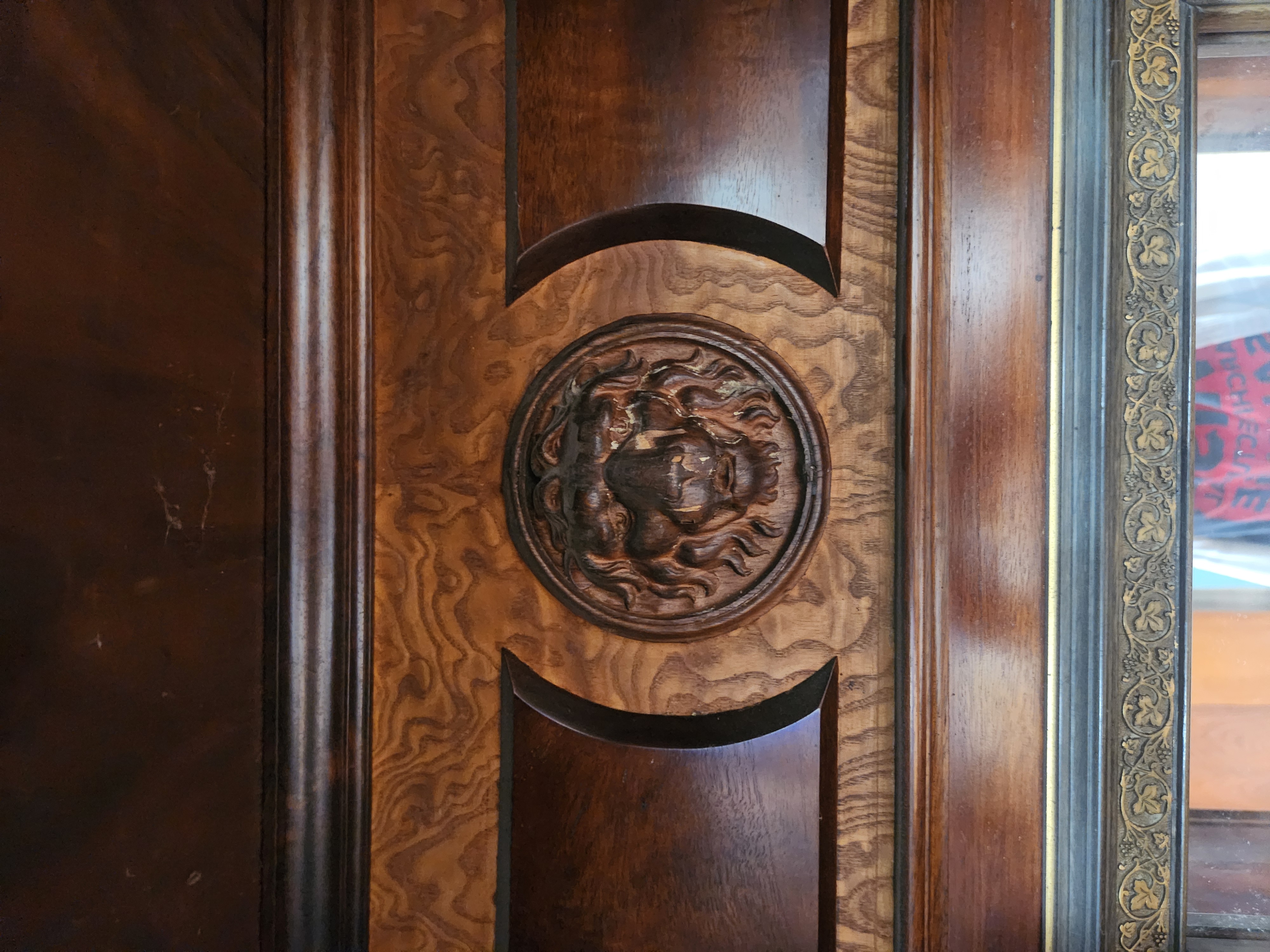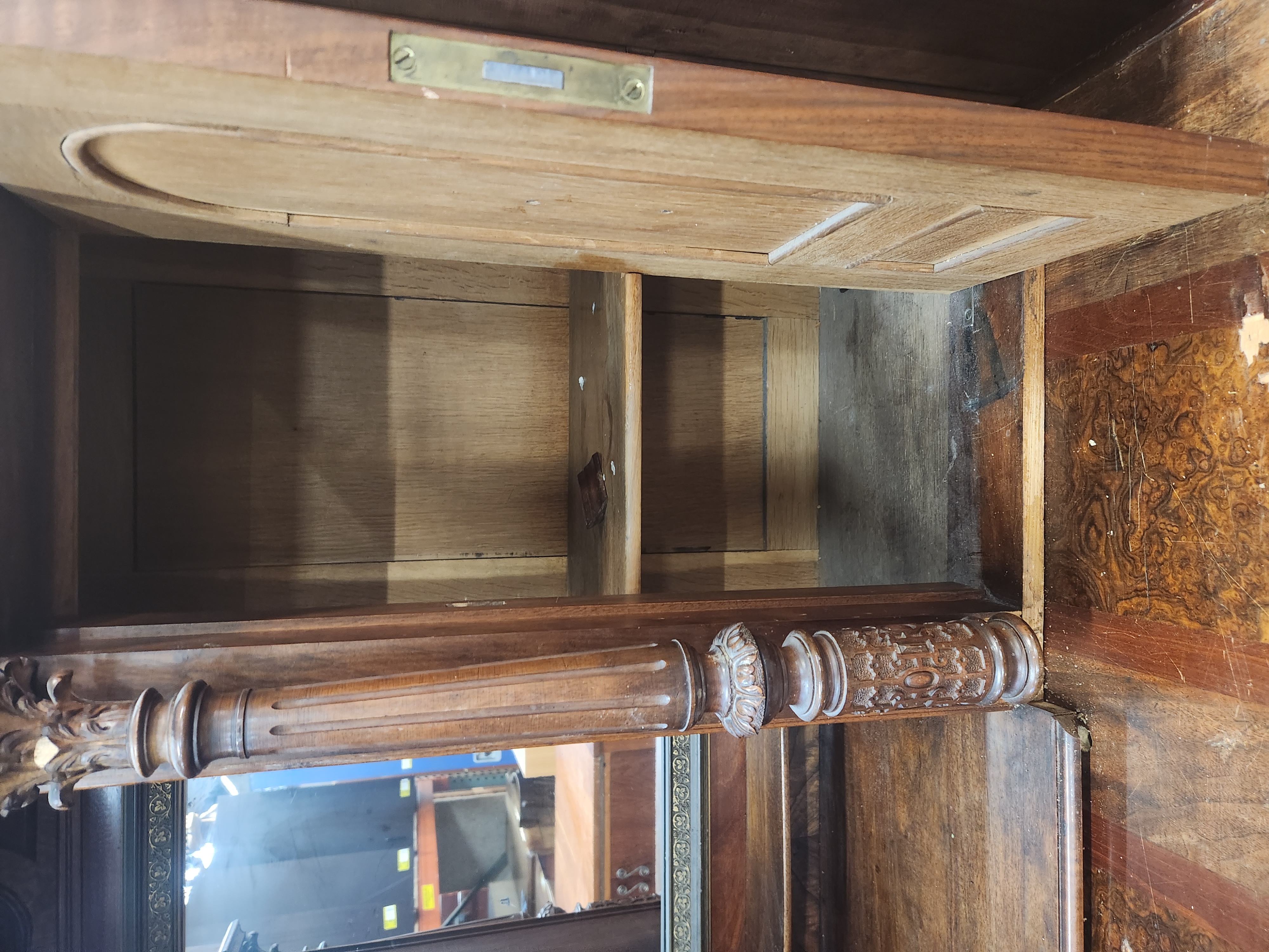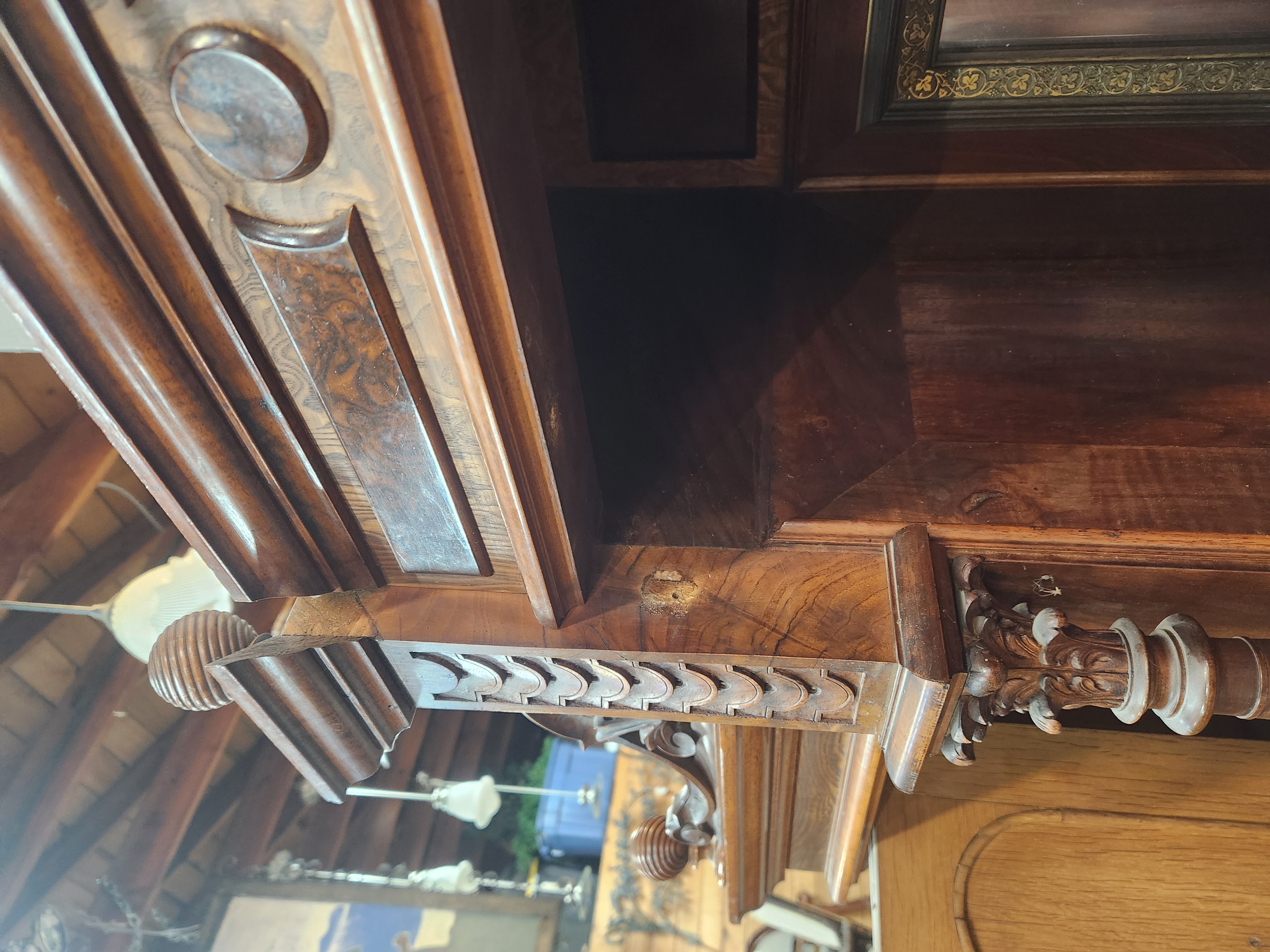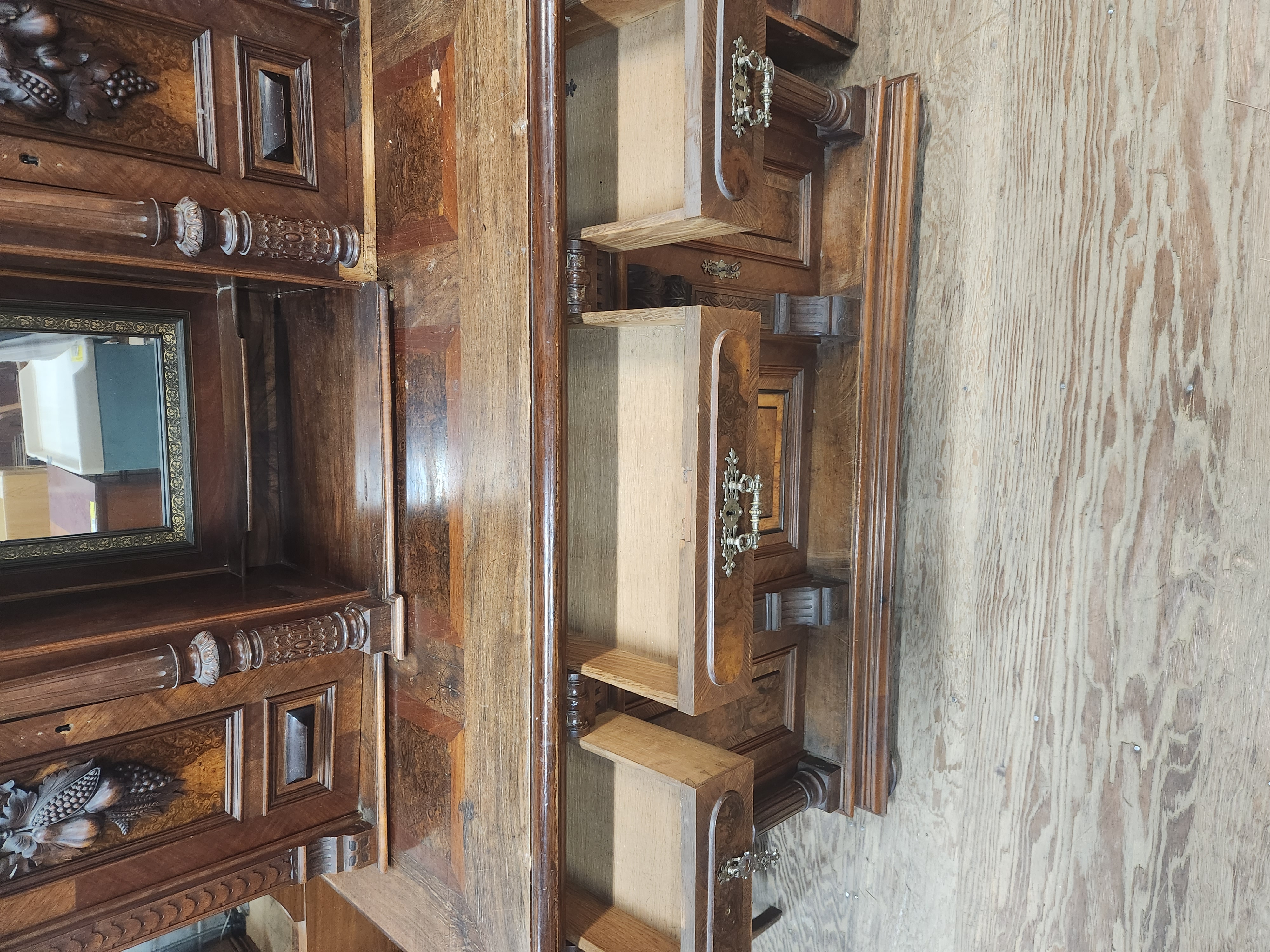 A large hutch with a lot to offer, but will need a patient hand to bring it back to its former glory. It is missing several decorative elements and has a damaged veneer. The bottom doors all have keys attached to keep them closed, and the middle one will not stay closed without being locked. Despite the damage and missing elements, this piece still manages to look quite impressive! It measures 57.5 x 75.75 x 28.5.