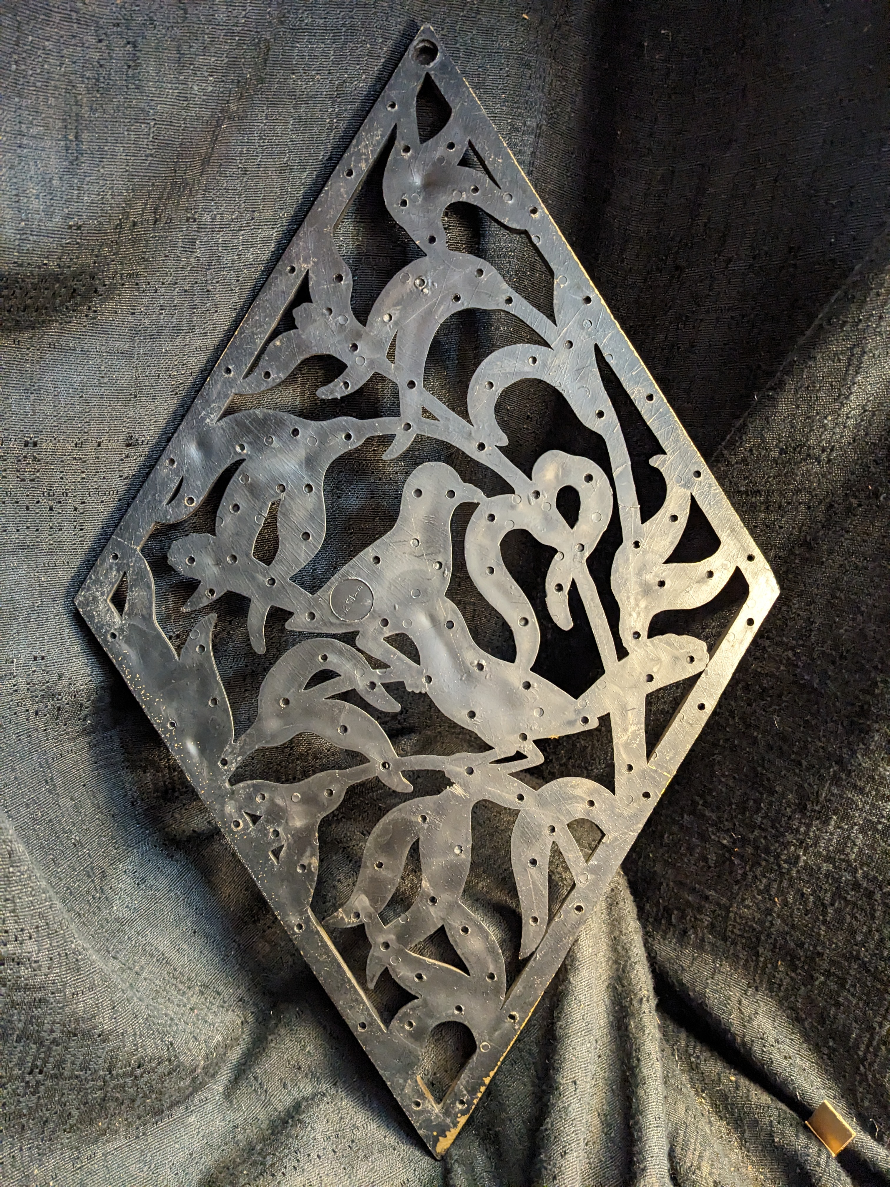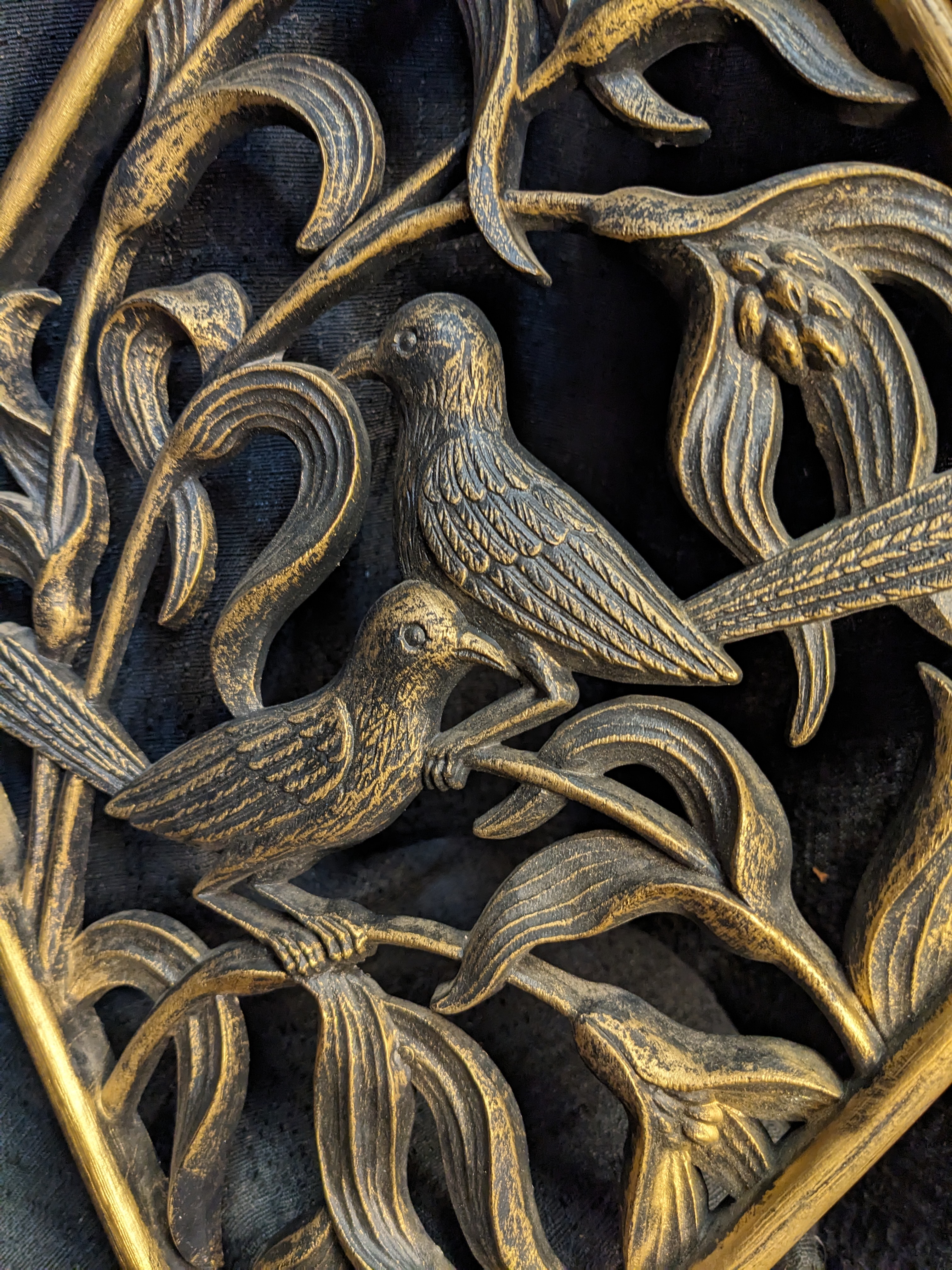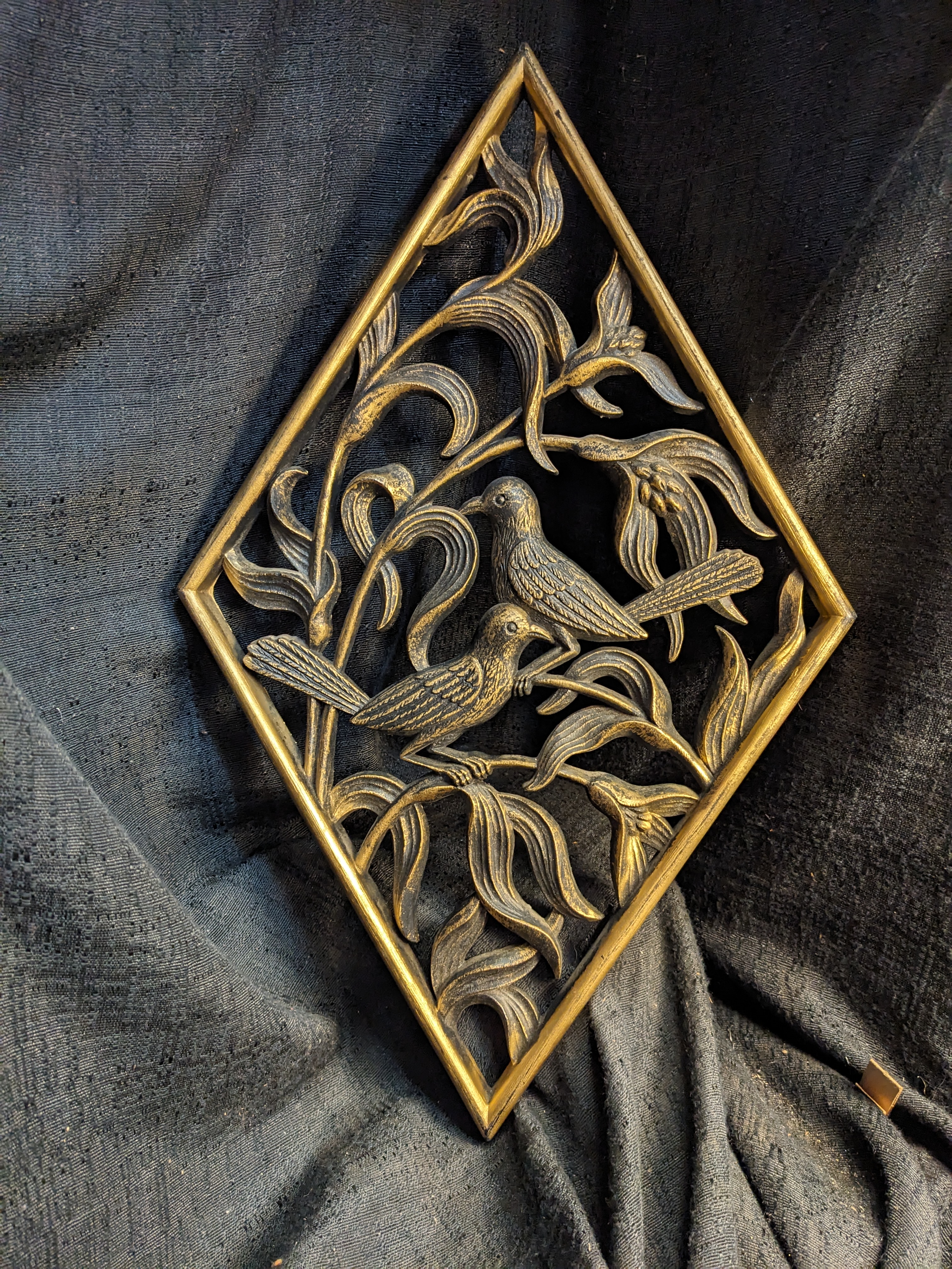 This golden colored diamond shaped bird wall art is in great condition. It features a bird feeding a dragonfly to its young. Measured 10 x 16.5 and made of plastic, manufactured in the 1970s. Pictures may be representative.