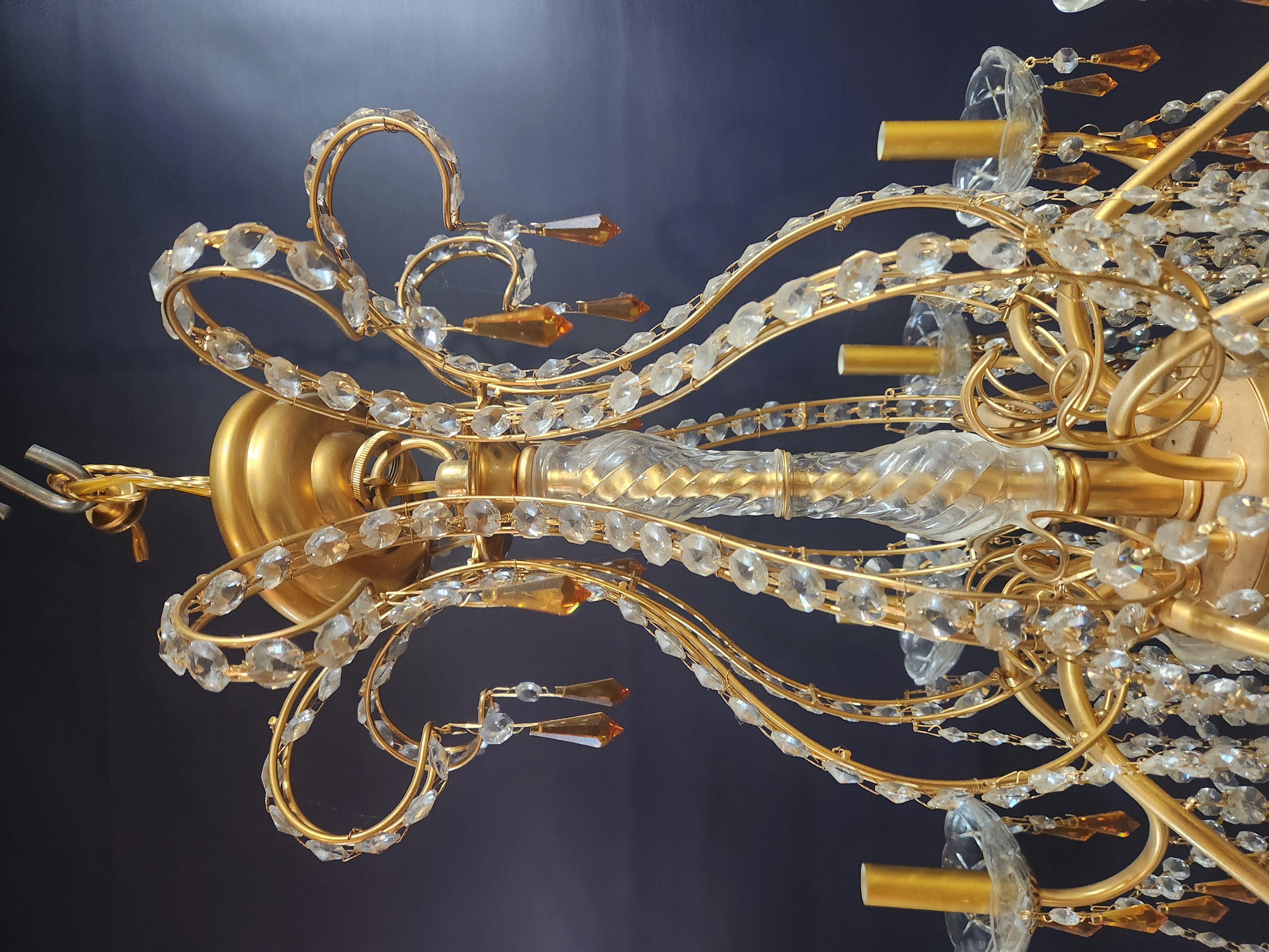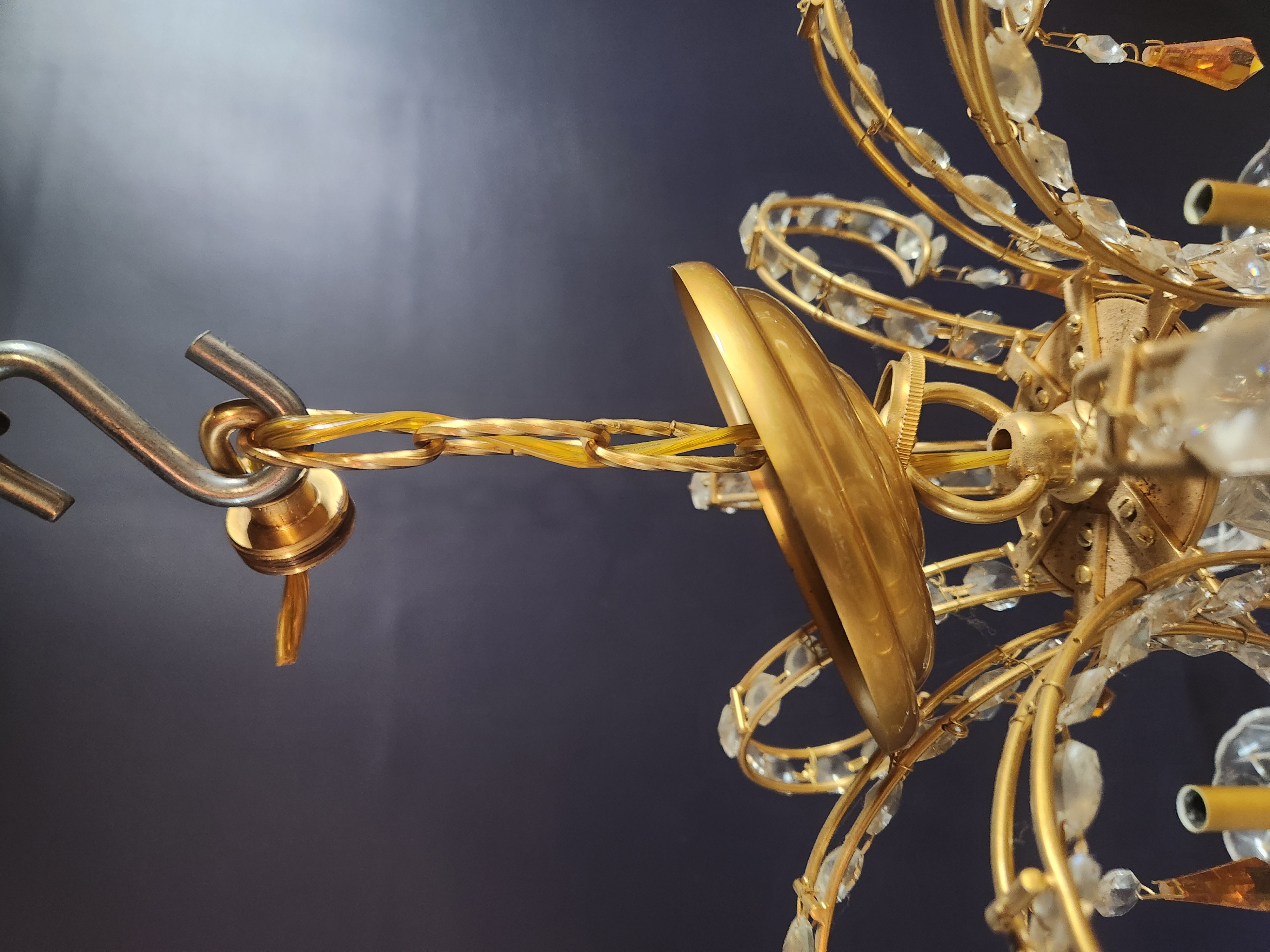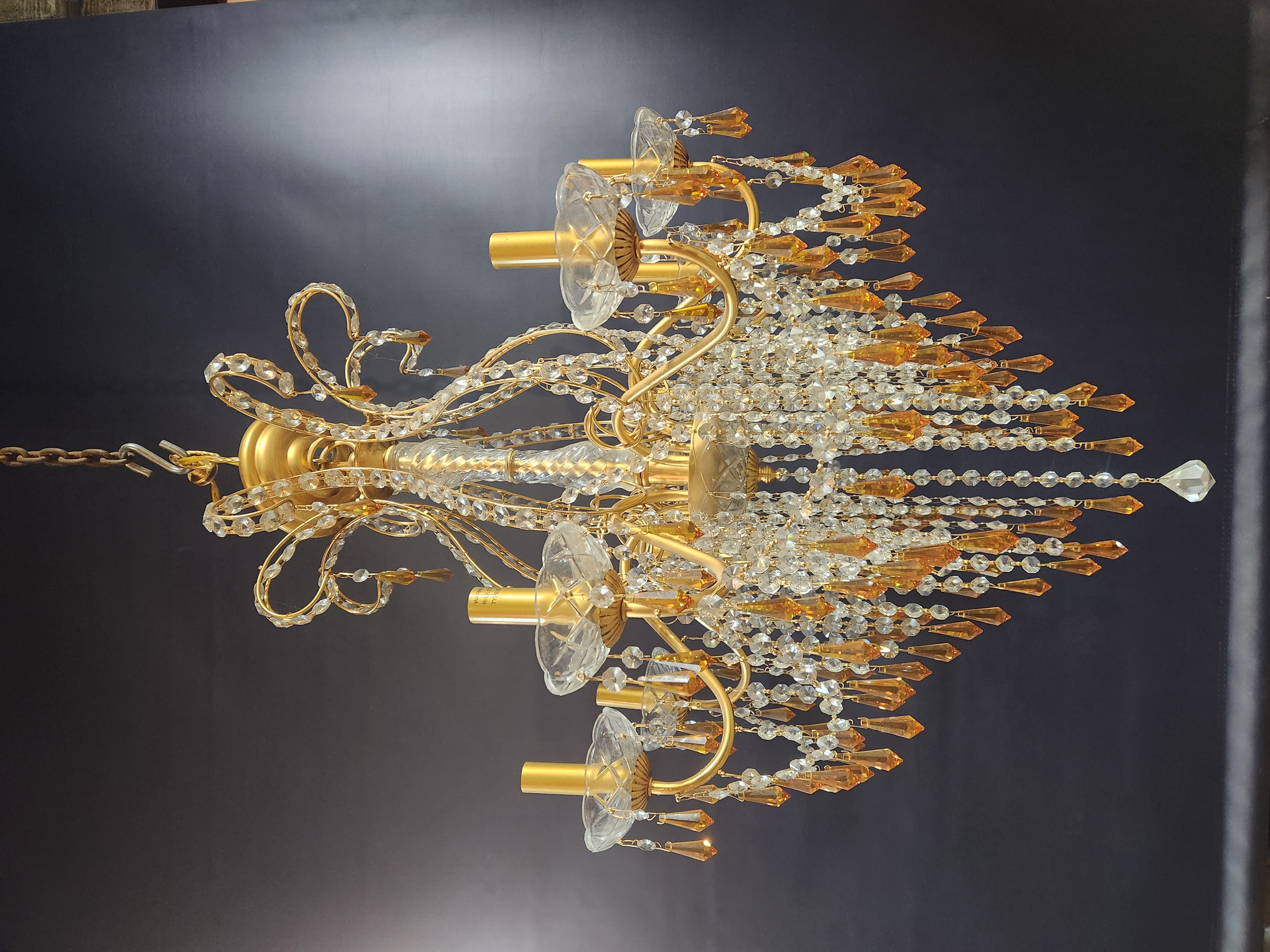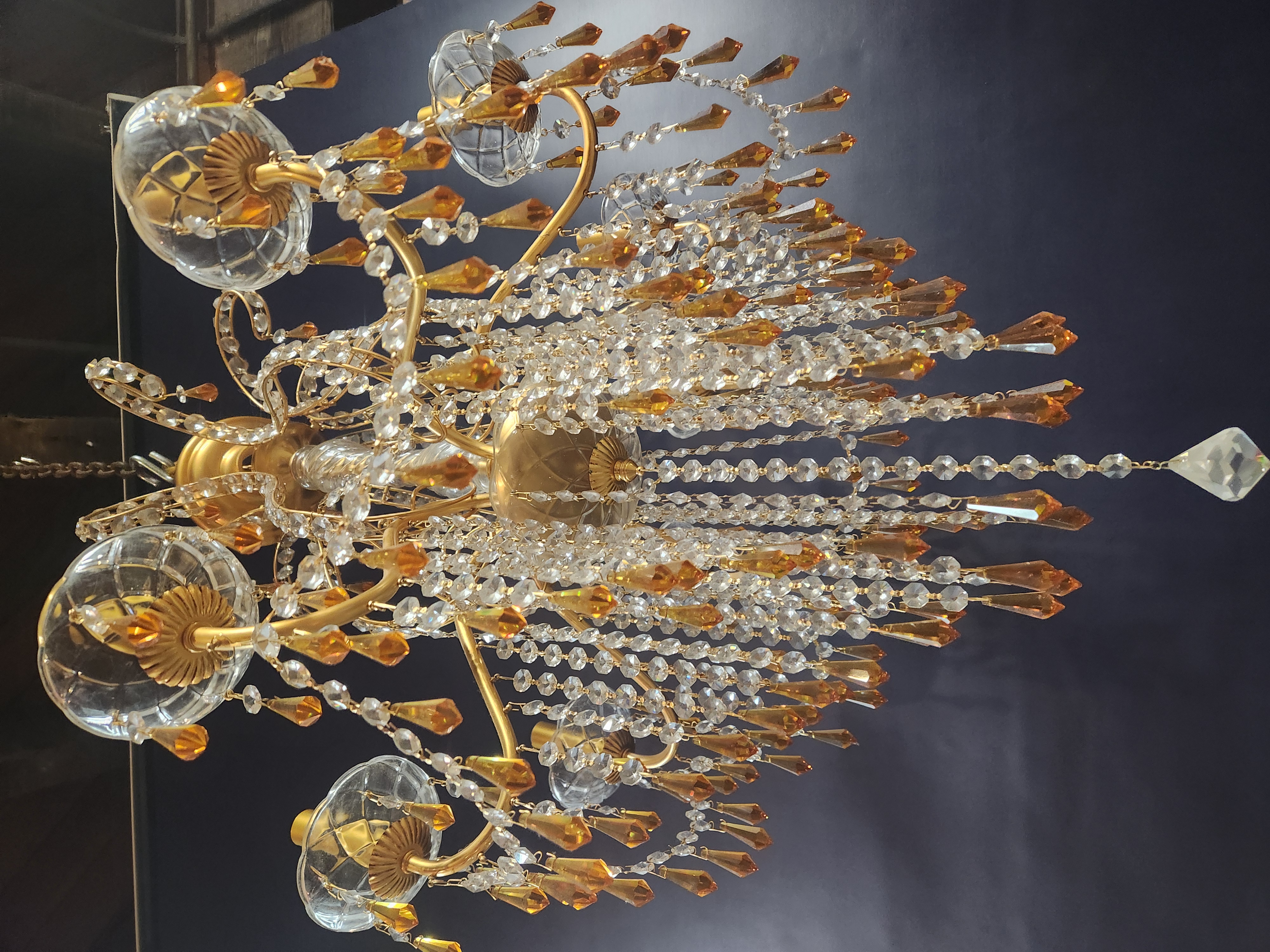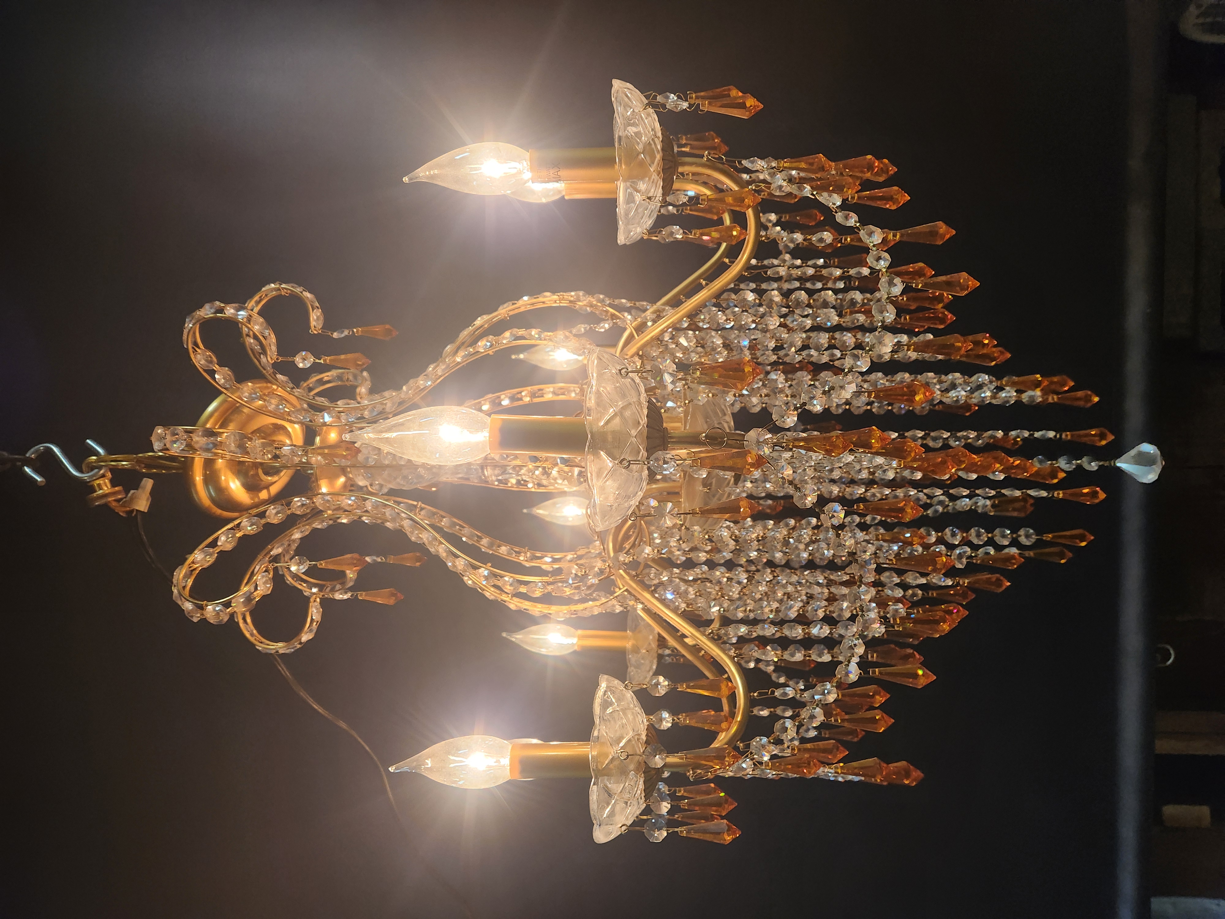 An absolutely dazzling light with orange crystals and gold colored frame. It is in good condition, but is missing a couple crystal strands on the arms. The missing strands are barely noticeable, since there are still so many crystals. If you need a light that screams luxury or glamor then this is the light for you! It measures roughly 24 x 36 from the top to the last dangling crystal.