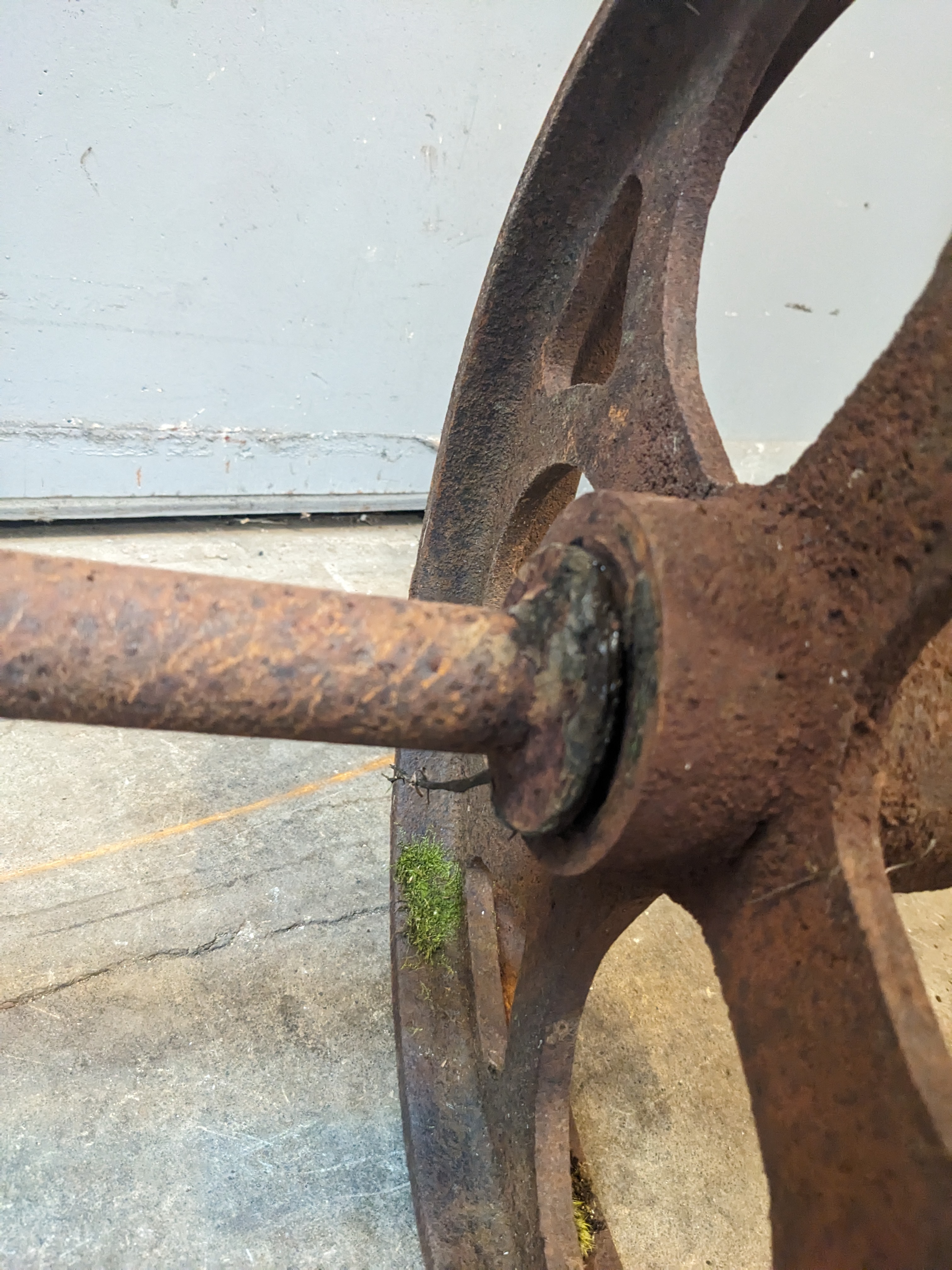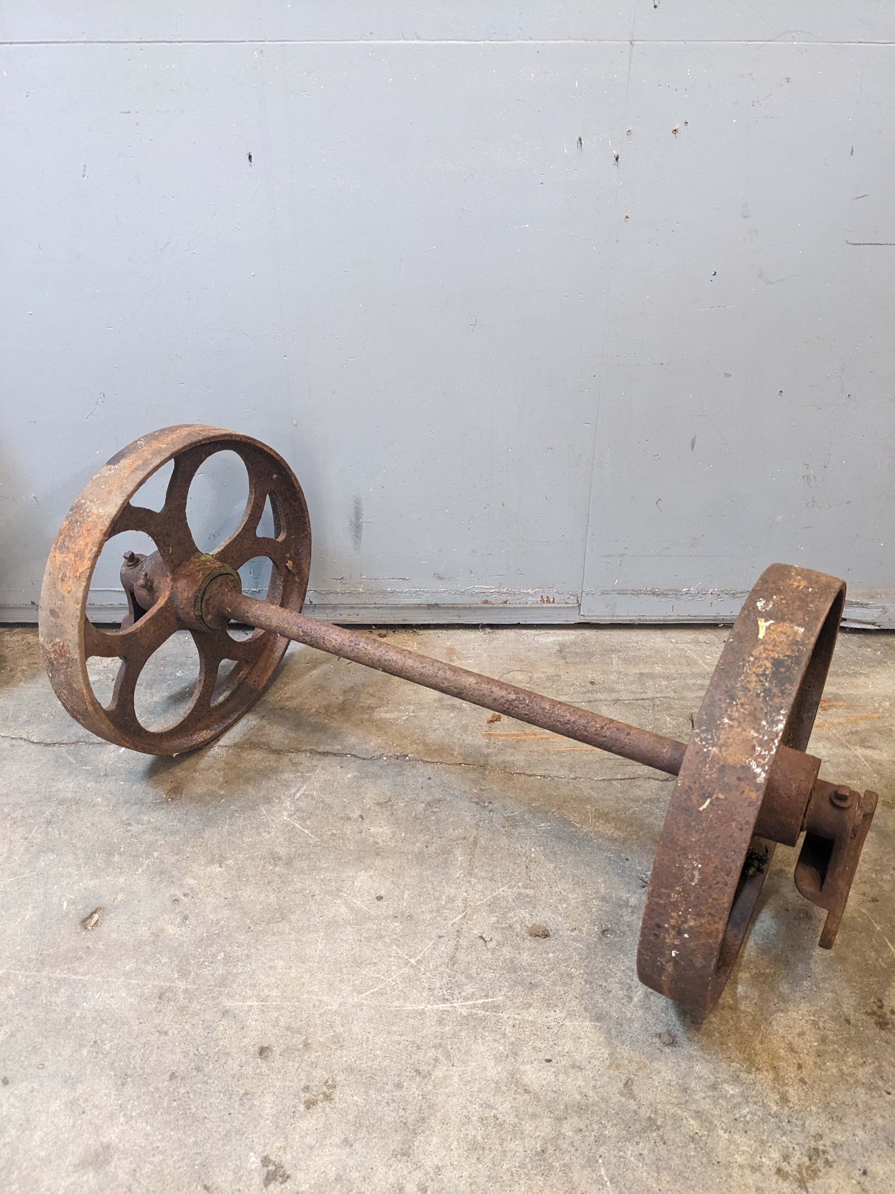 Cool old fashioned set of solid cast iron wheels.