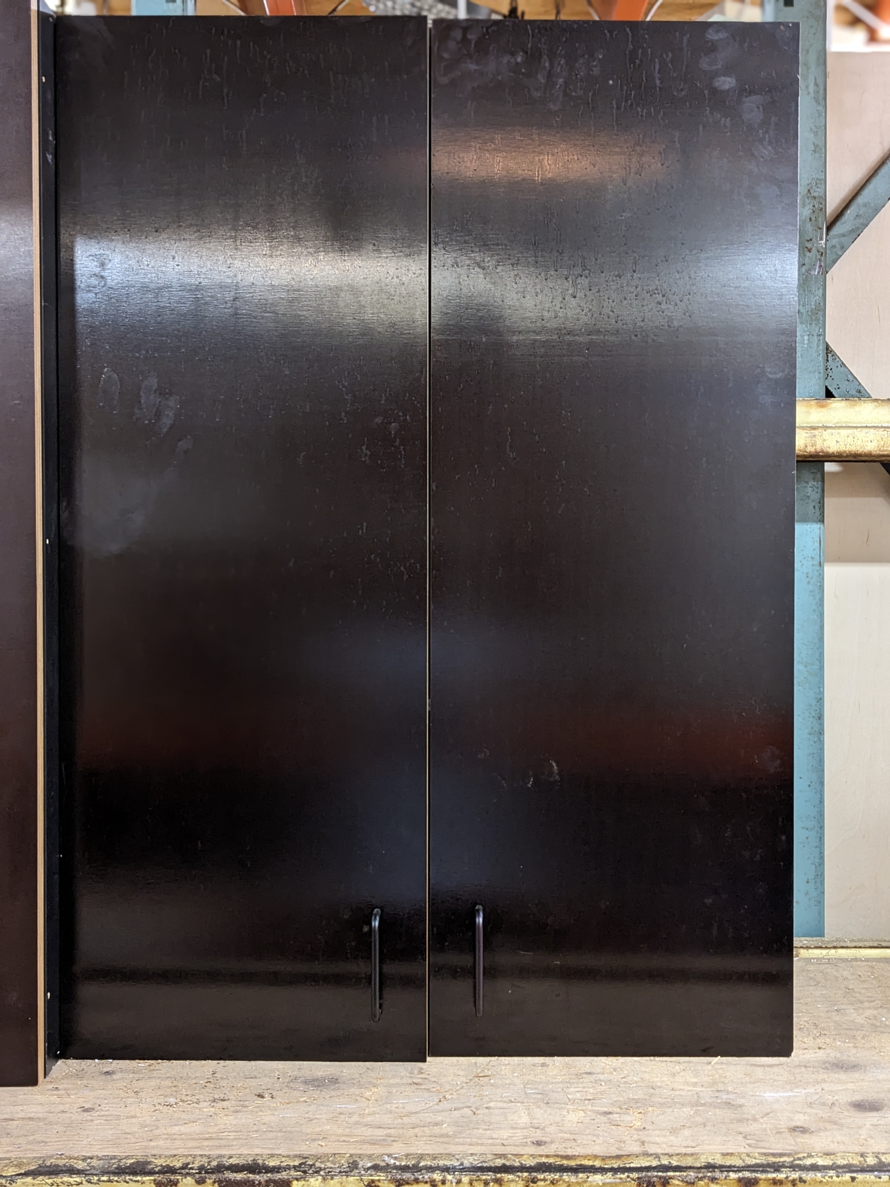 Dark wood grain garage cabinet with some wear and tear. Mat black handles with shelves.
