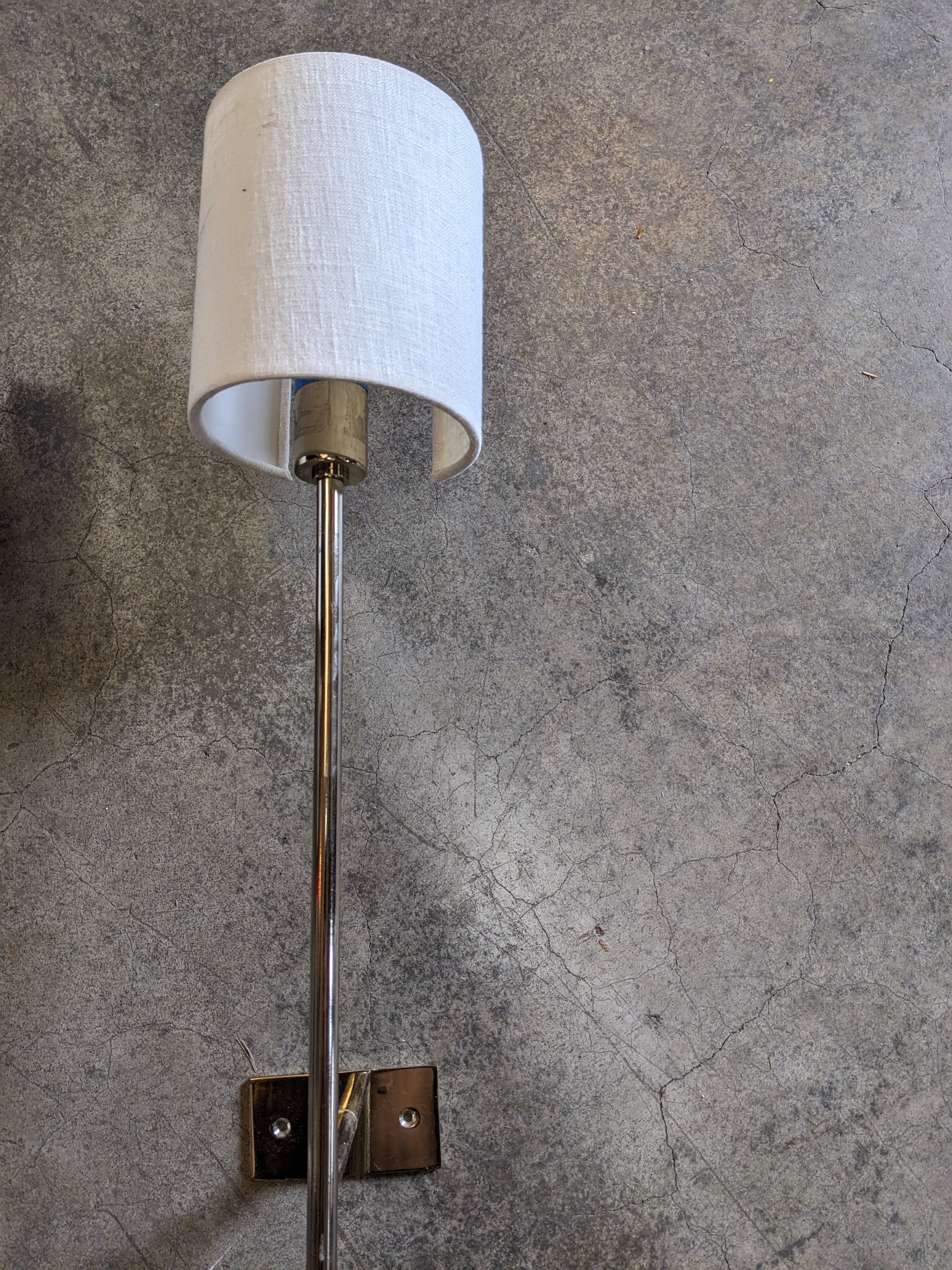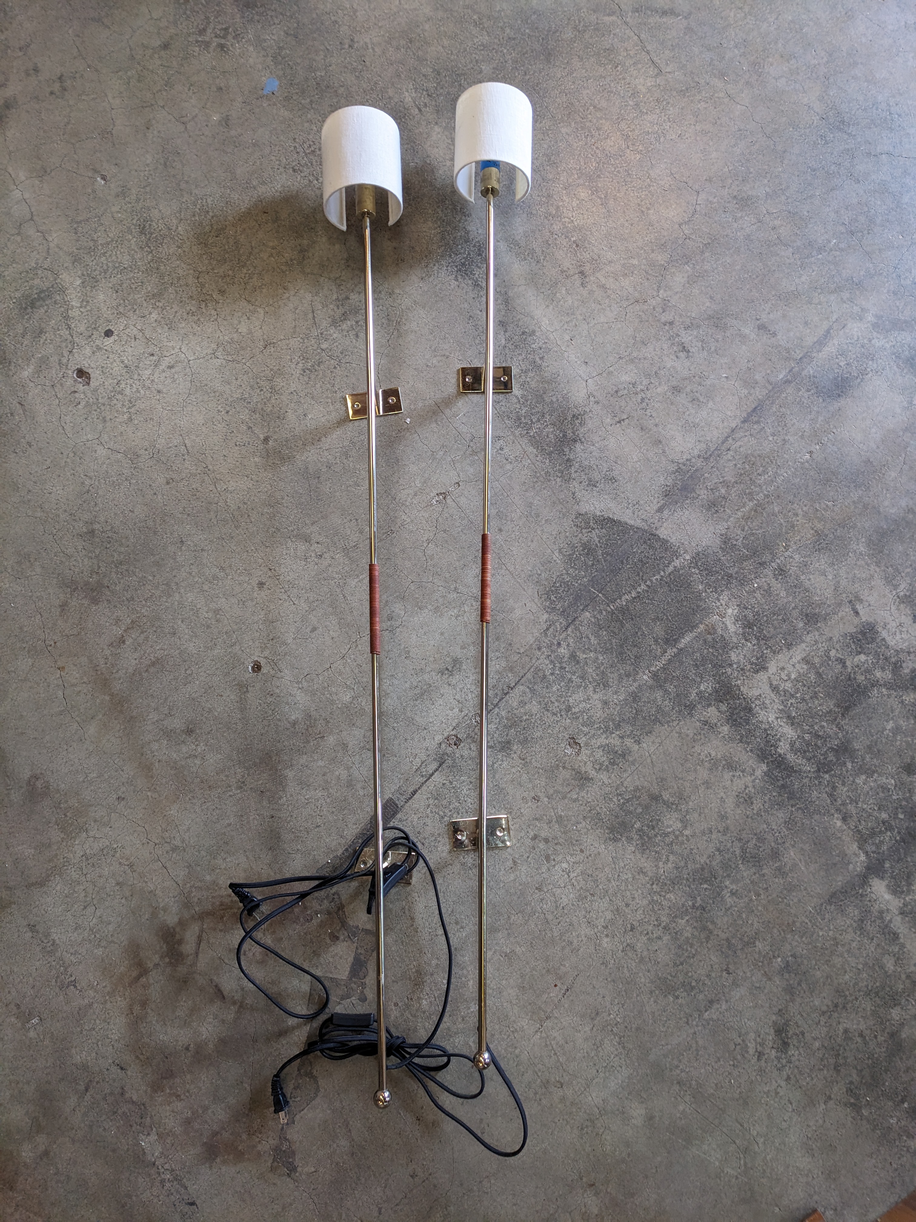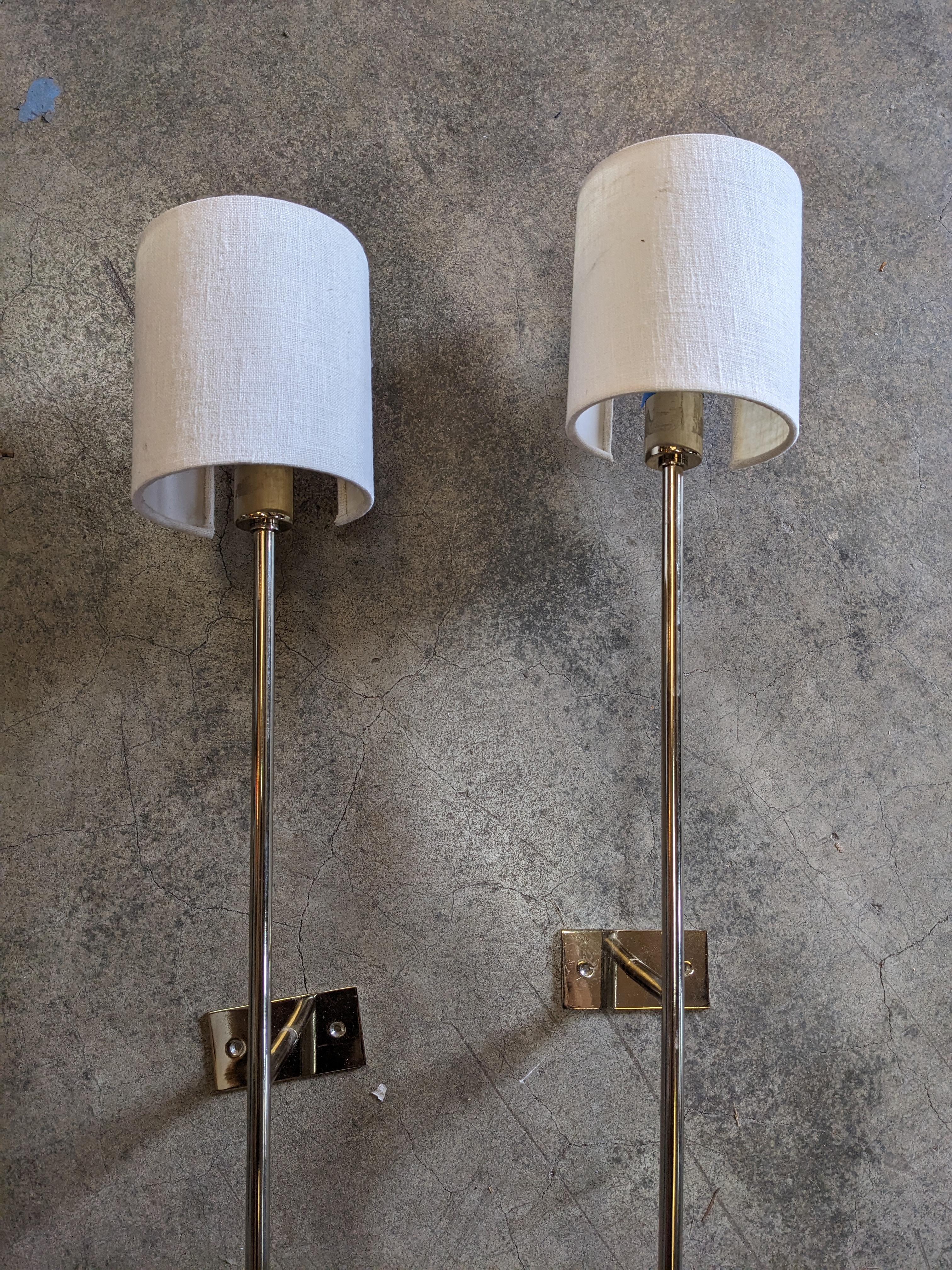 A beautiful modern sconce set , with a lovely champagne color and low profile shades it makes for a great fit in a modern home or by a bedside. In good condition.