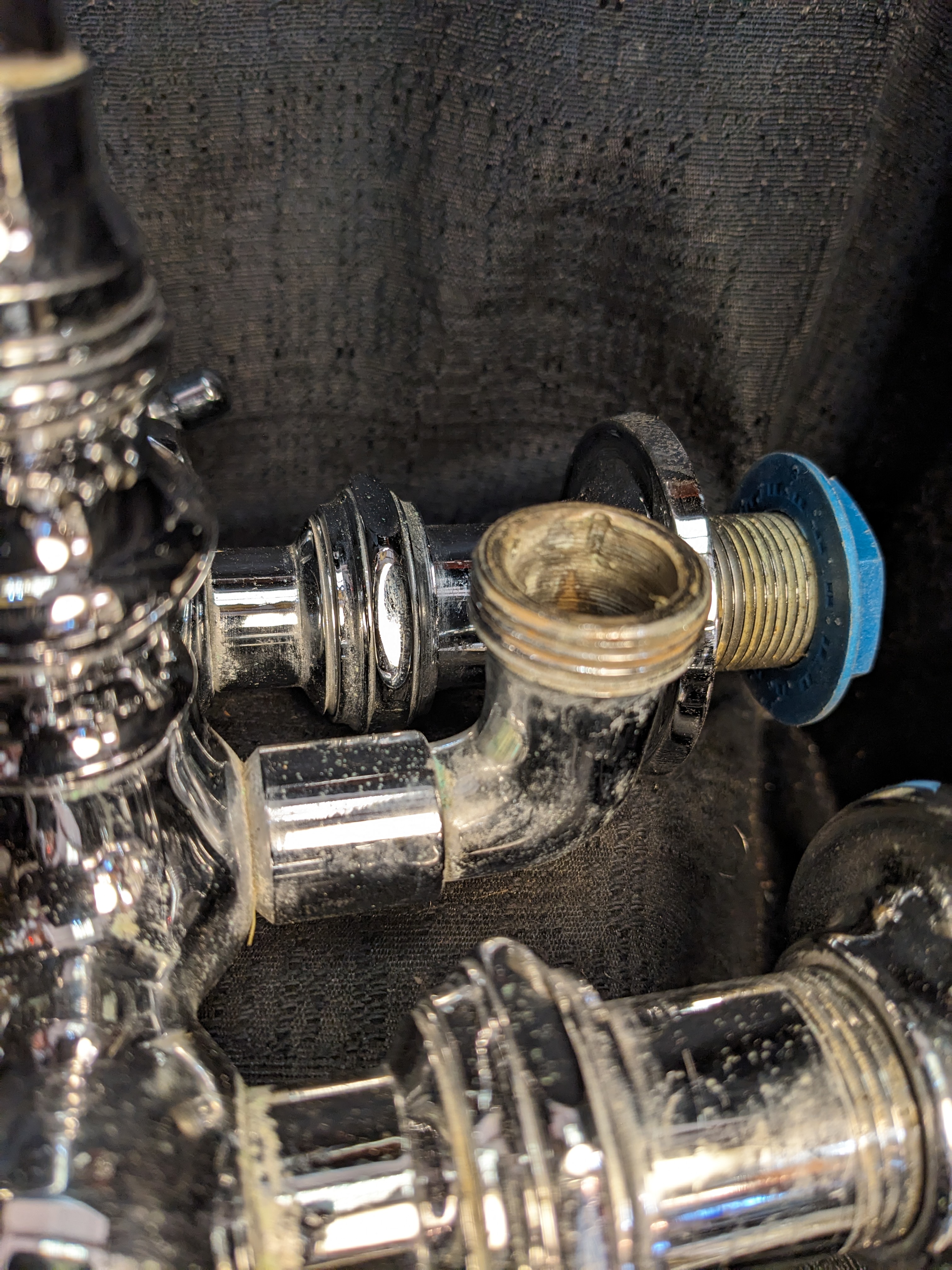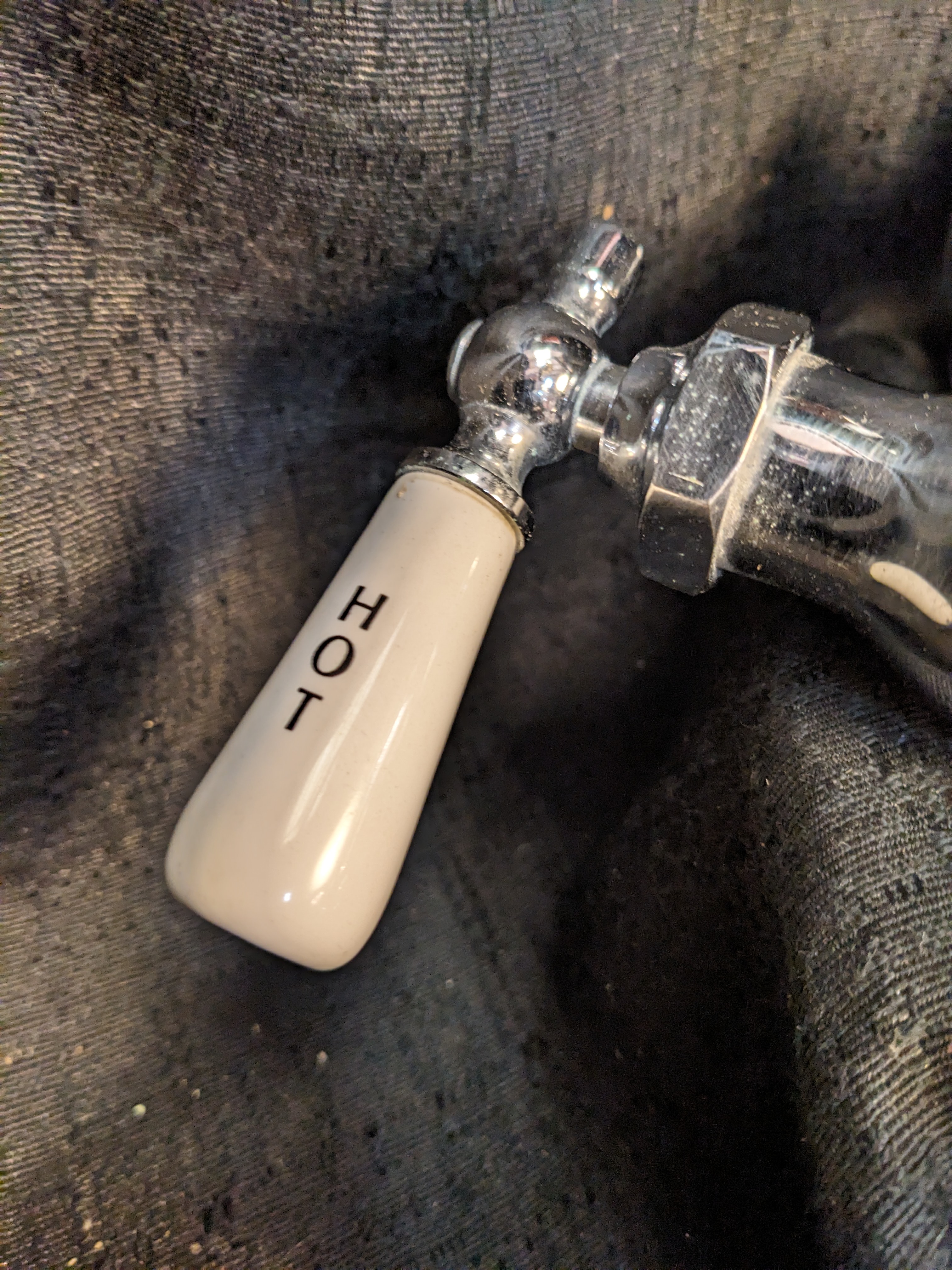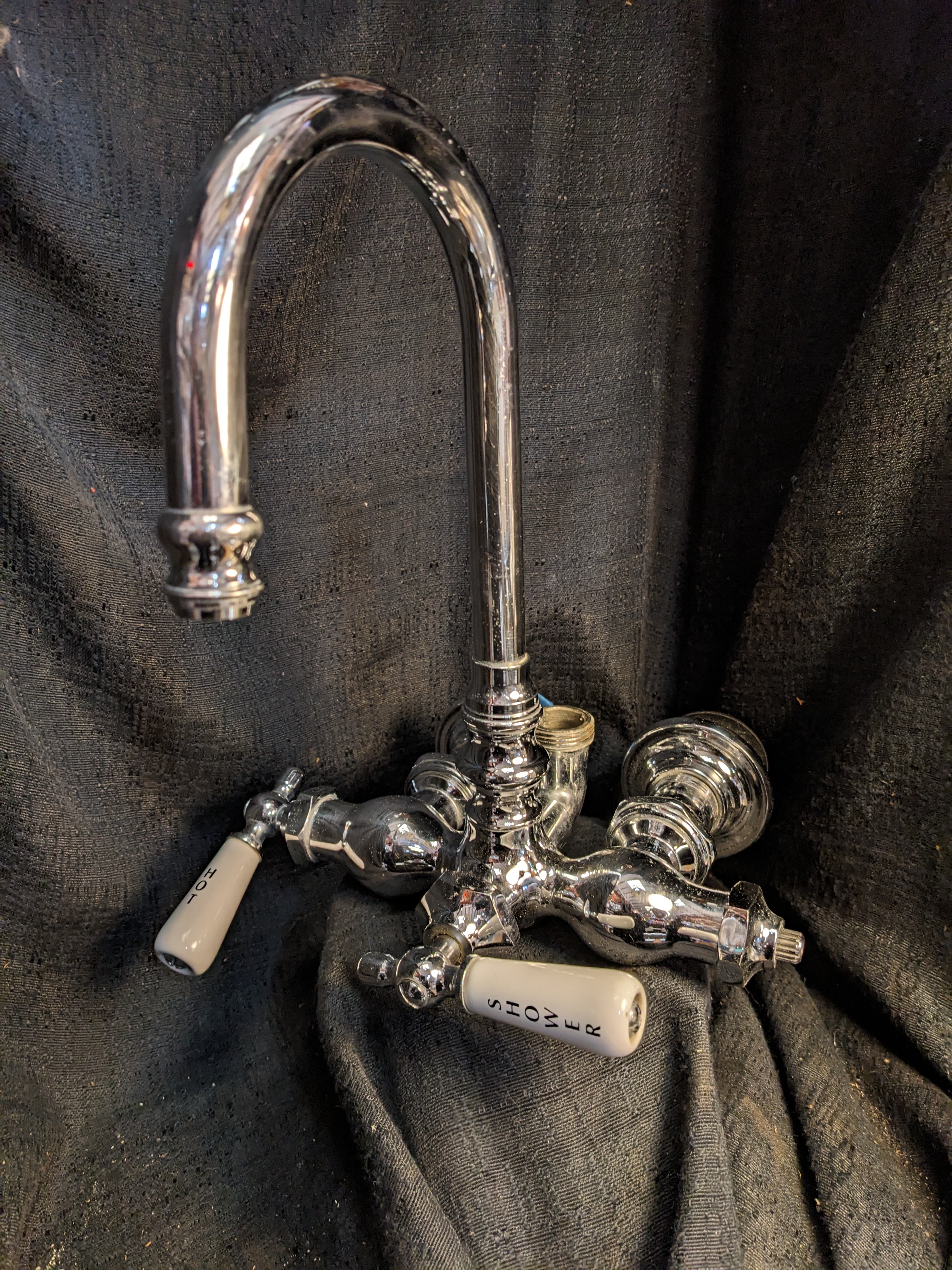 Chrome tub faucet has a gooseneck tubfill spout and a connection for the shower riser or hand held shower. Missing the porcelain ”cold" lever. Visually, looks good but is untested by us. Manufacturer/brand is unknown. L