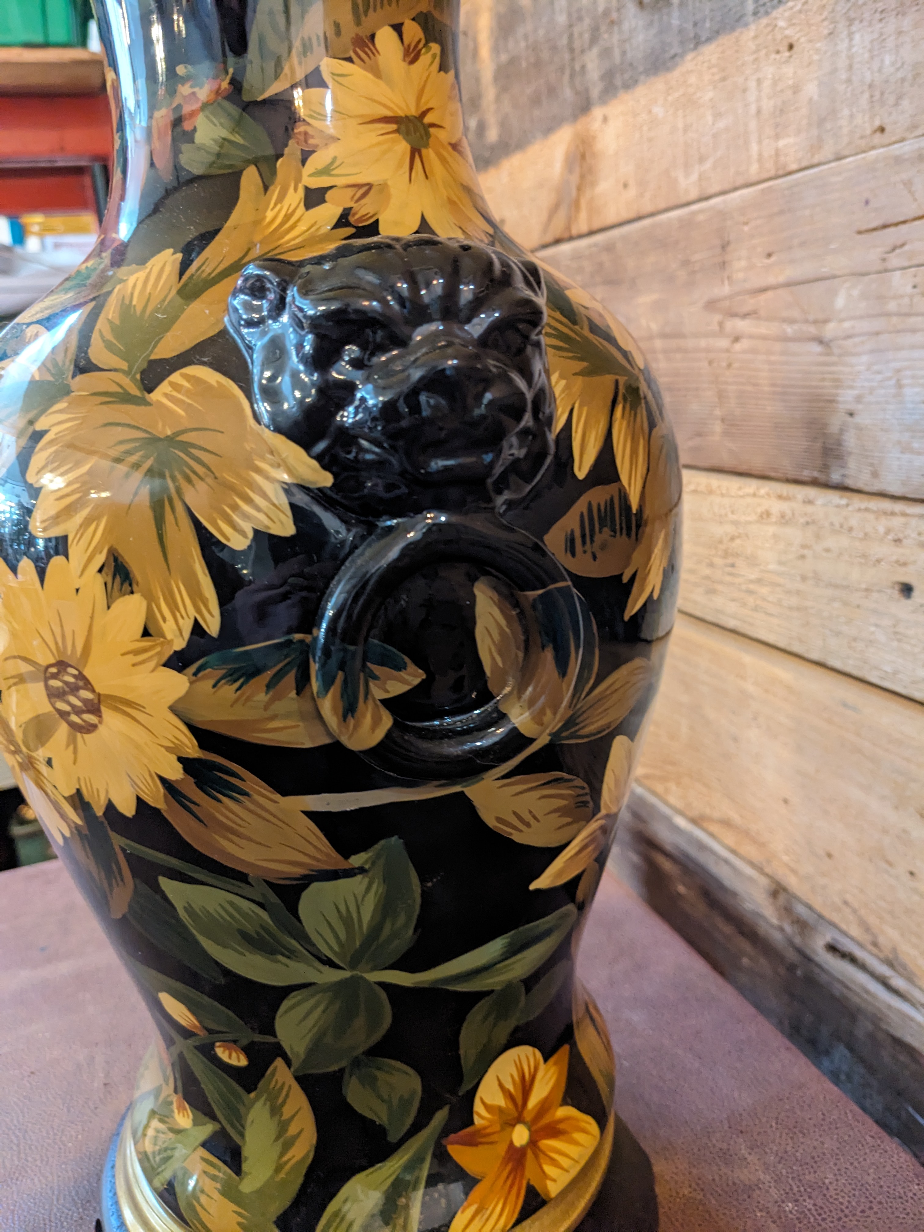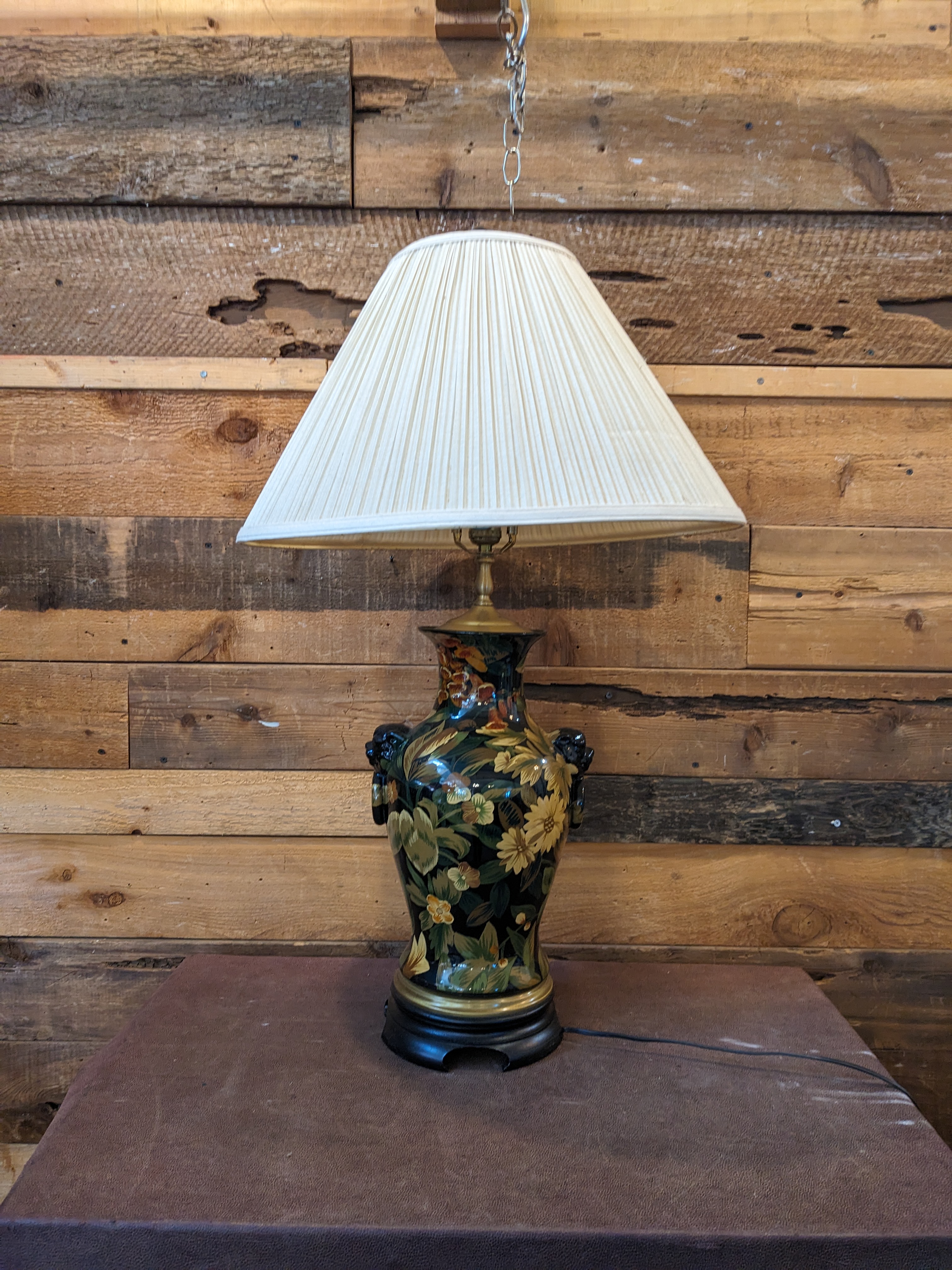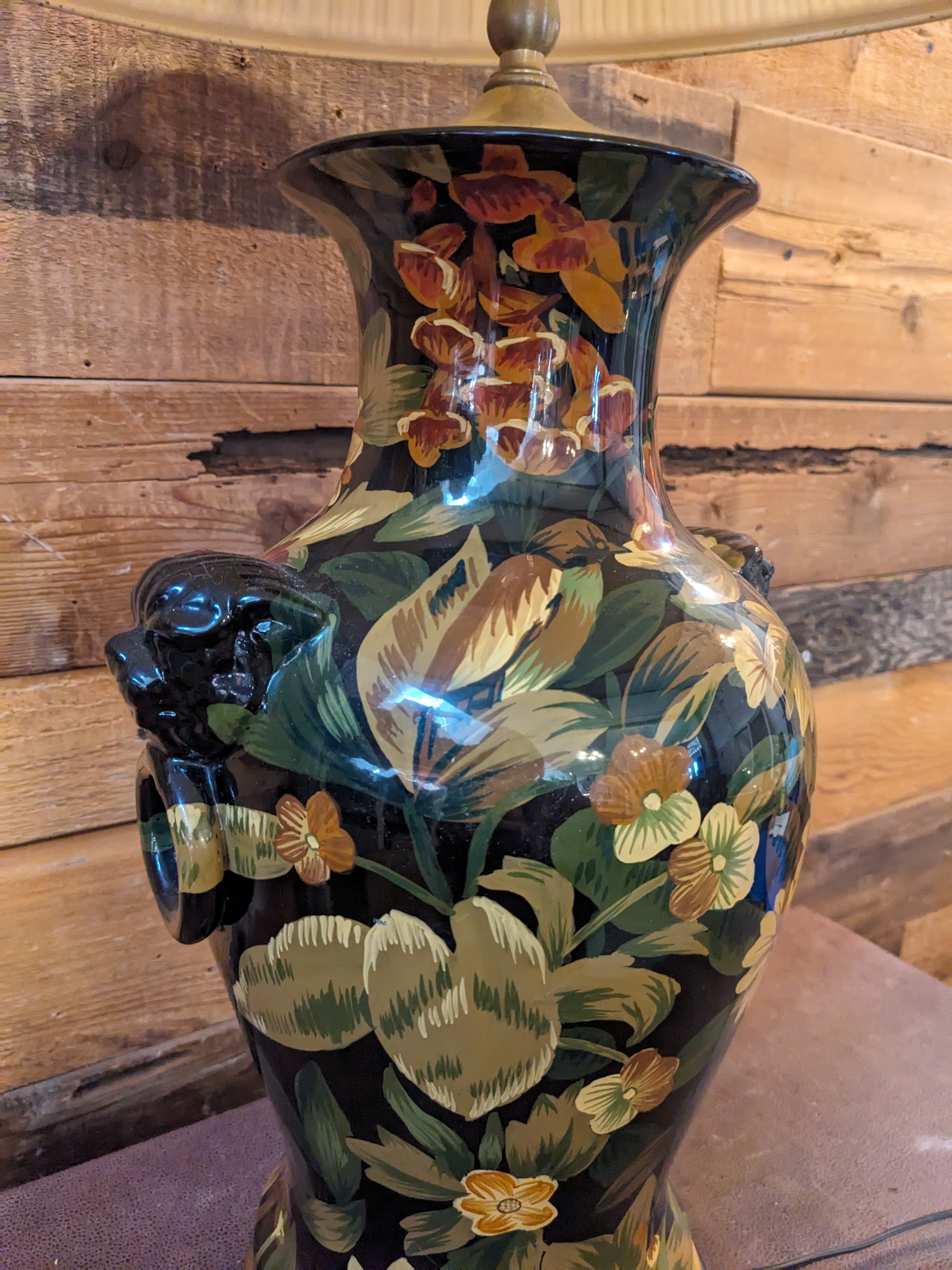 This Lamp is in good condition. It has beautiful florals decorating the urn shape base. It is in working order and would be a great Livingroom or bedroom table lamp.