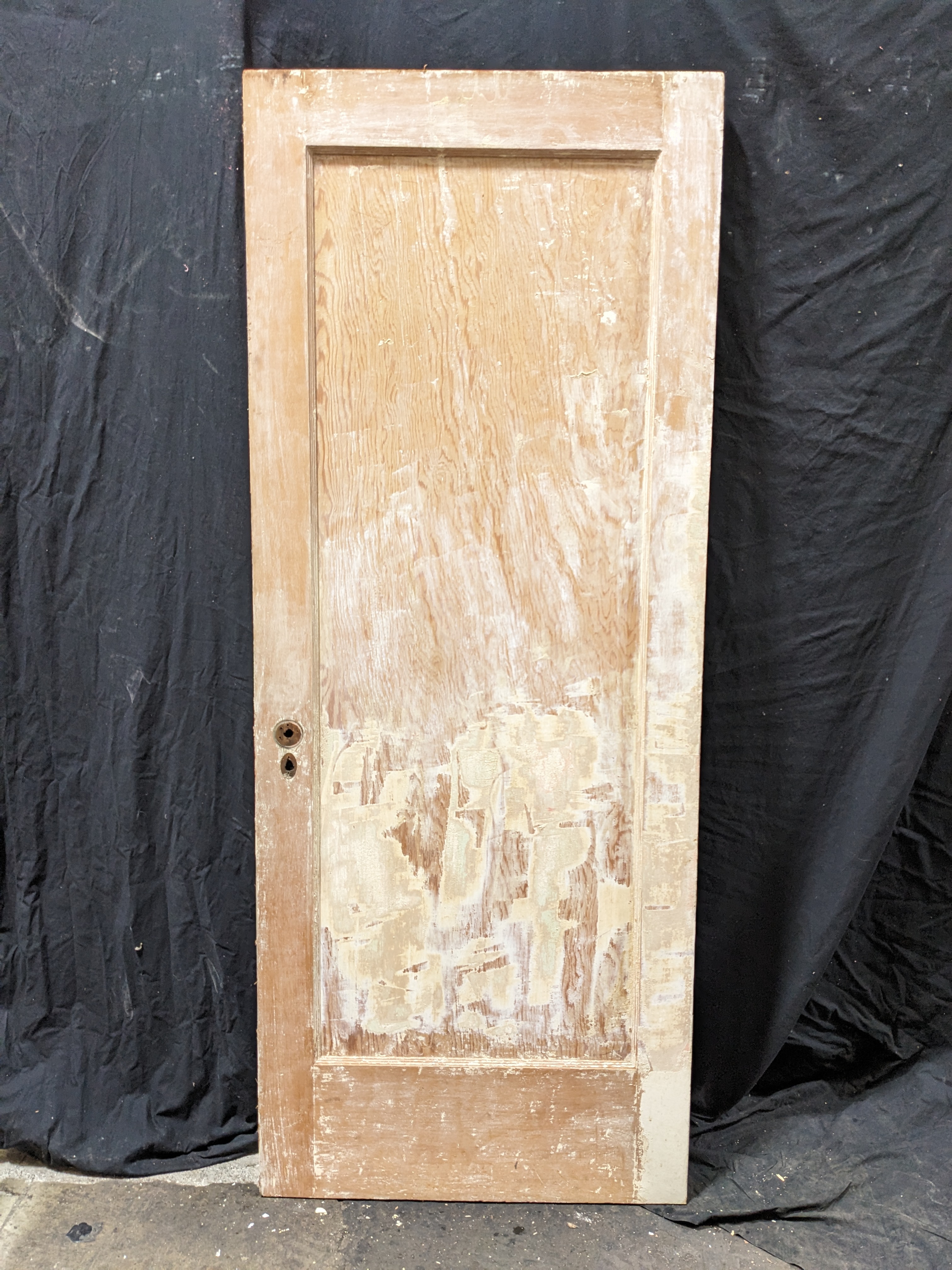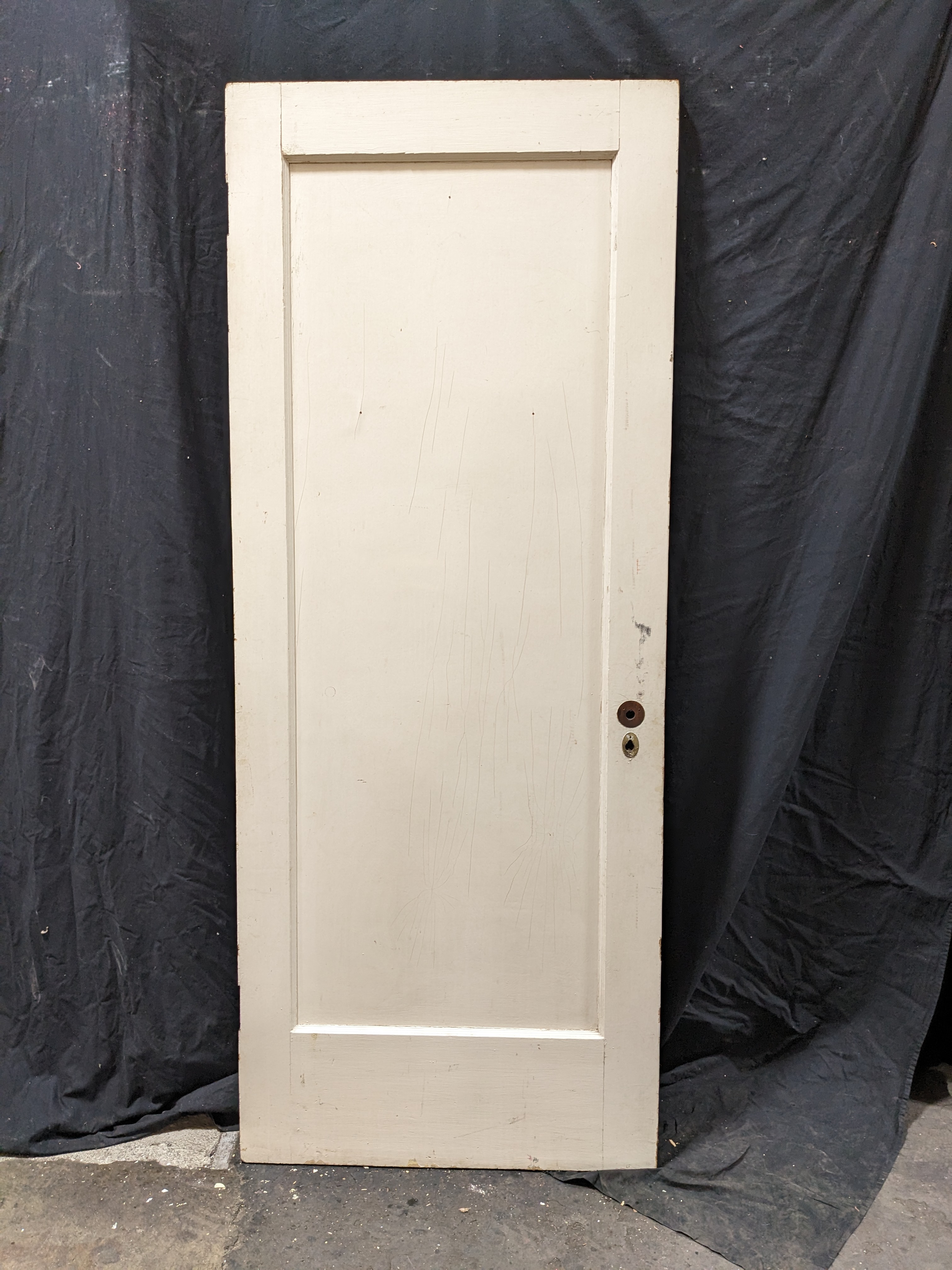 Single panel interior door 32 x 80 x 1.5. One side of the door is painted in a glossy white color that is starting to crackle and streak. The other is unfinished with some patchwork to fill in areas where the wood was previously crackling. All around this door has seen some age and weathering. A good clean would serve it well. Right swing.