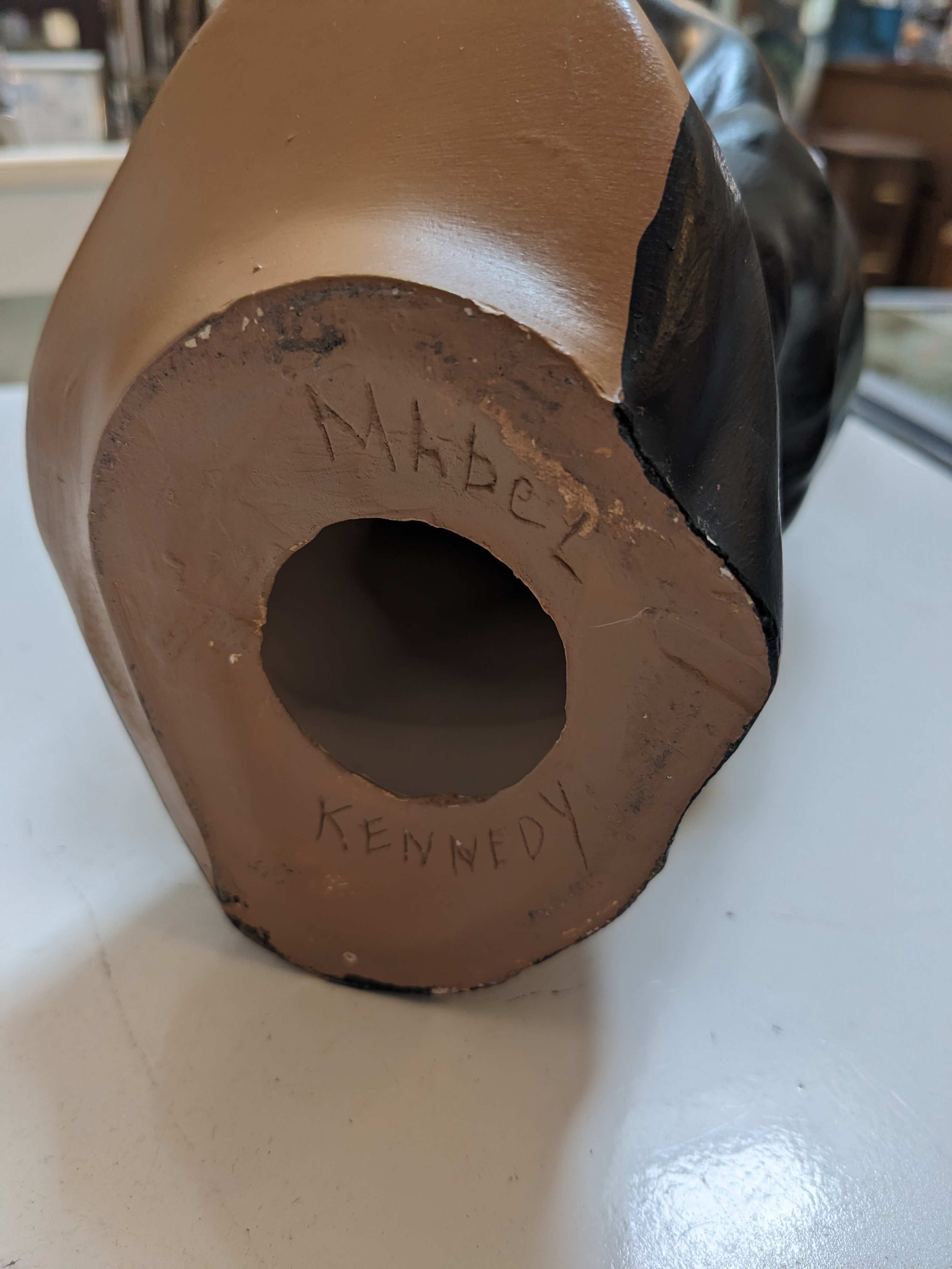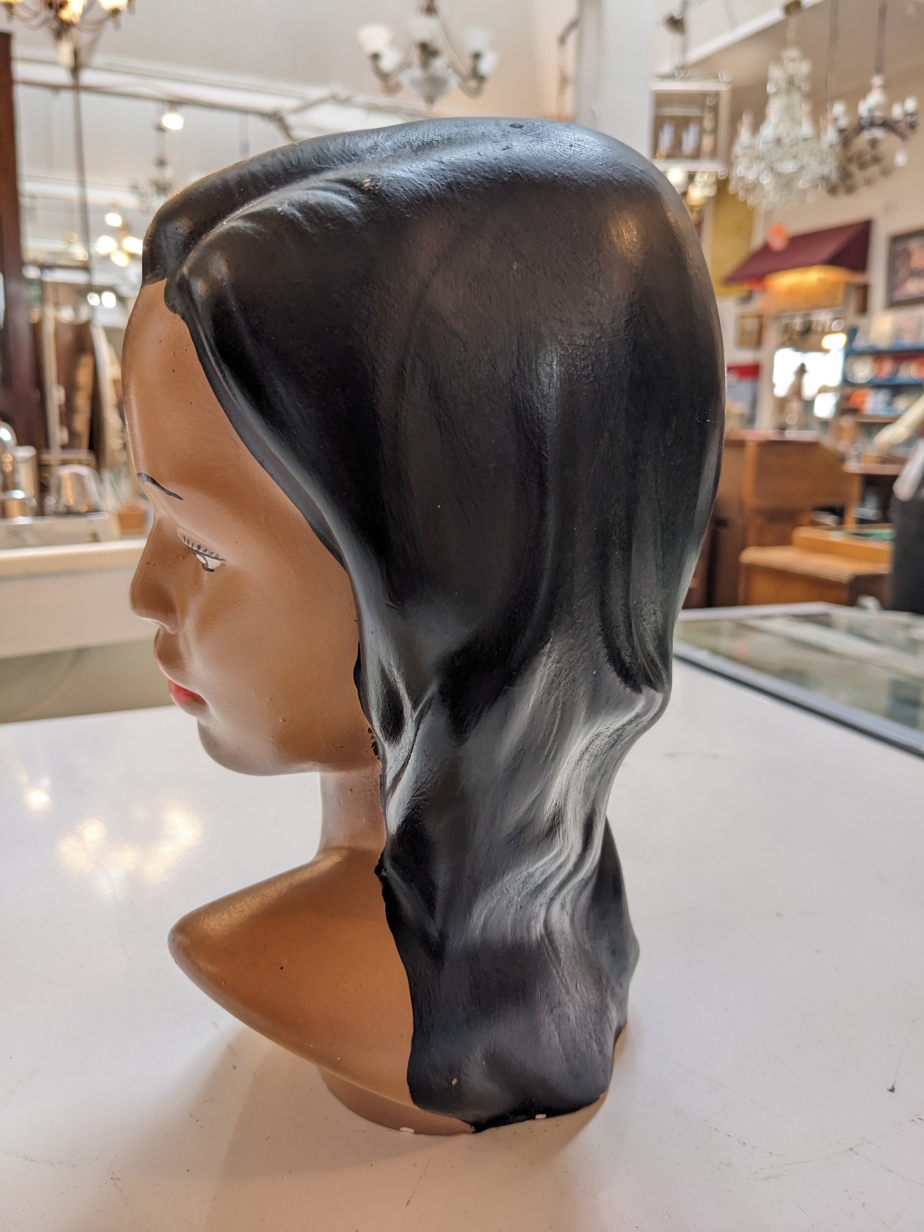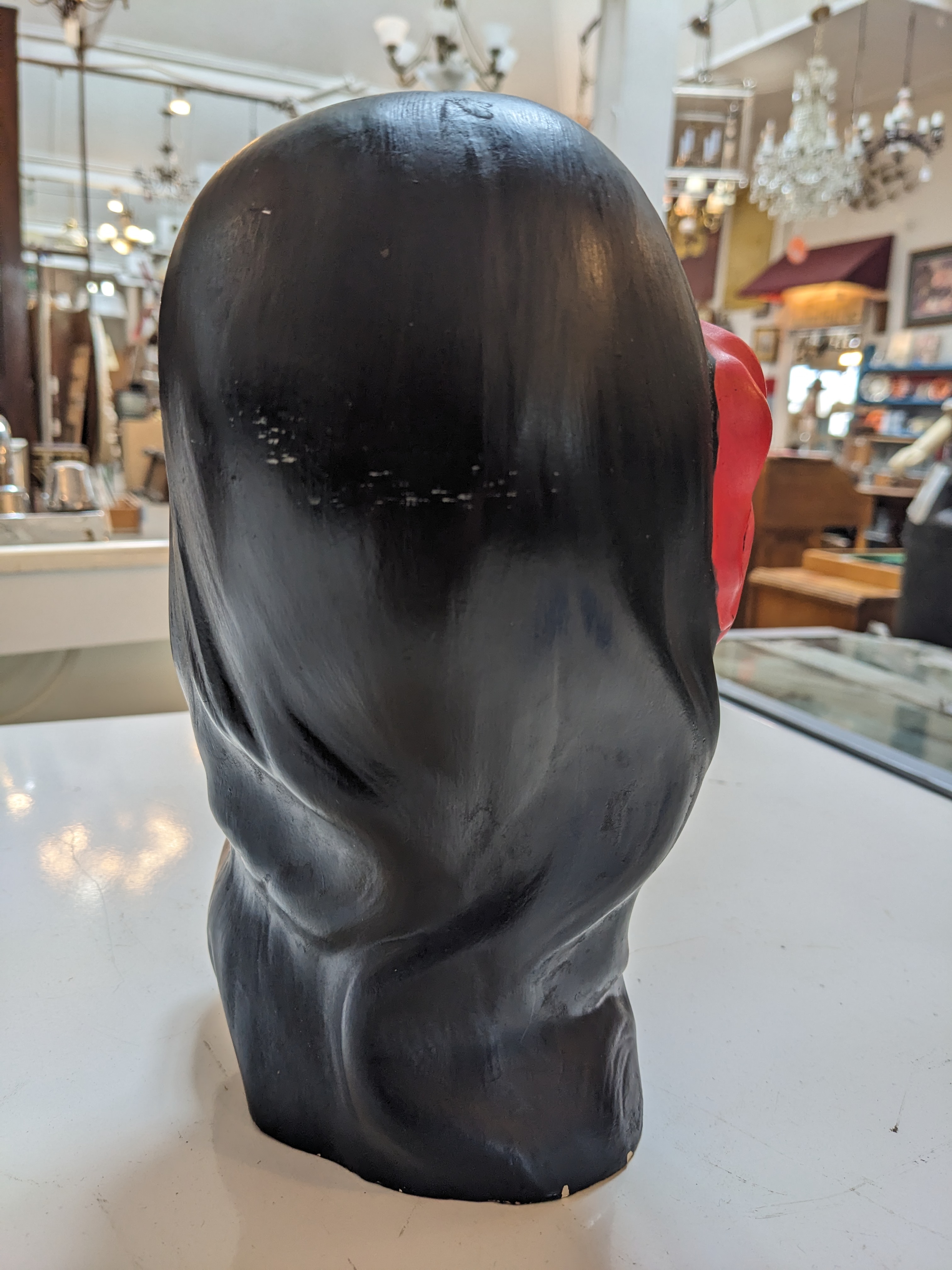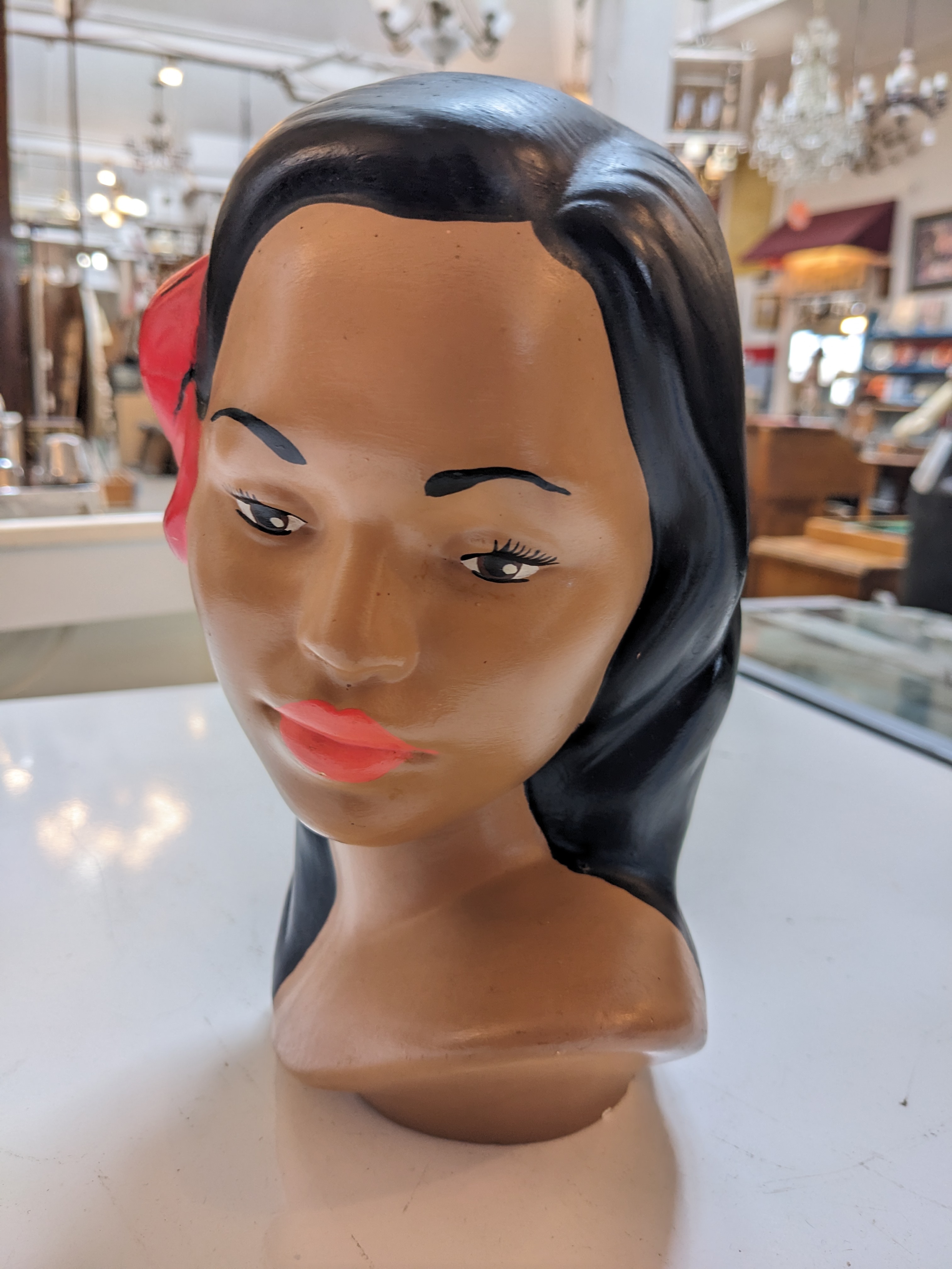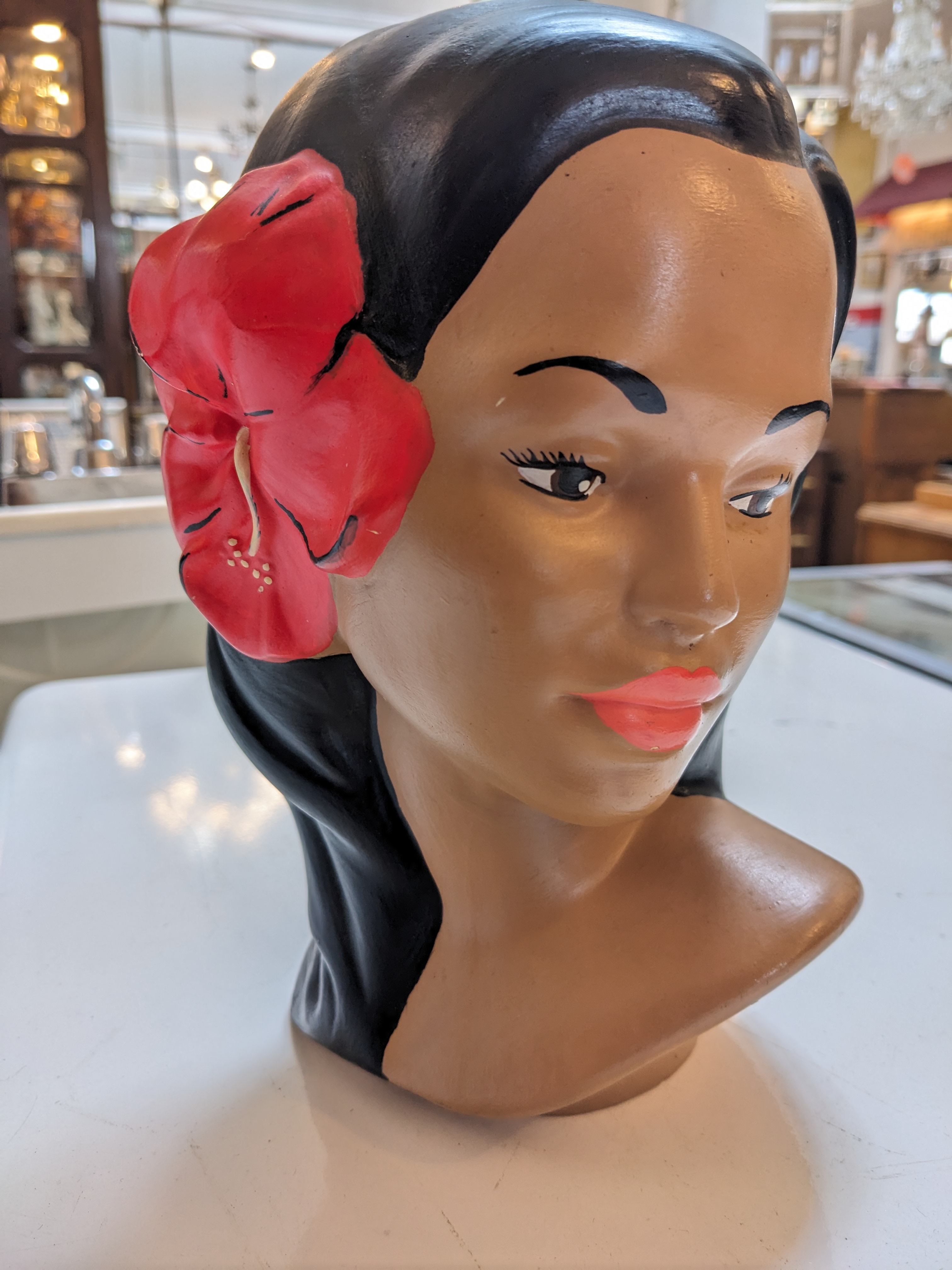 We have a Mid Century Hawaiian/Polynesian Girl bust. This piece is finely painted and resembles the Marwal Chalkware from the 1960’s. However, she is ceramic and signed, “Mabel Kennedy”! The figure depicts a young lady who’s hair is adorned with a bright red hibiscus flower, sure to add charm to your vintage collection.