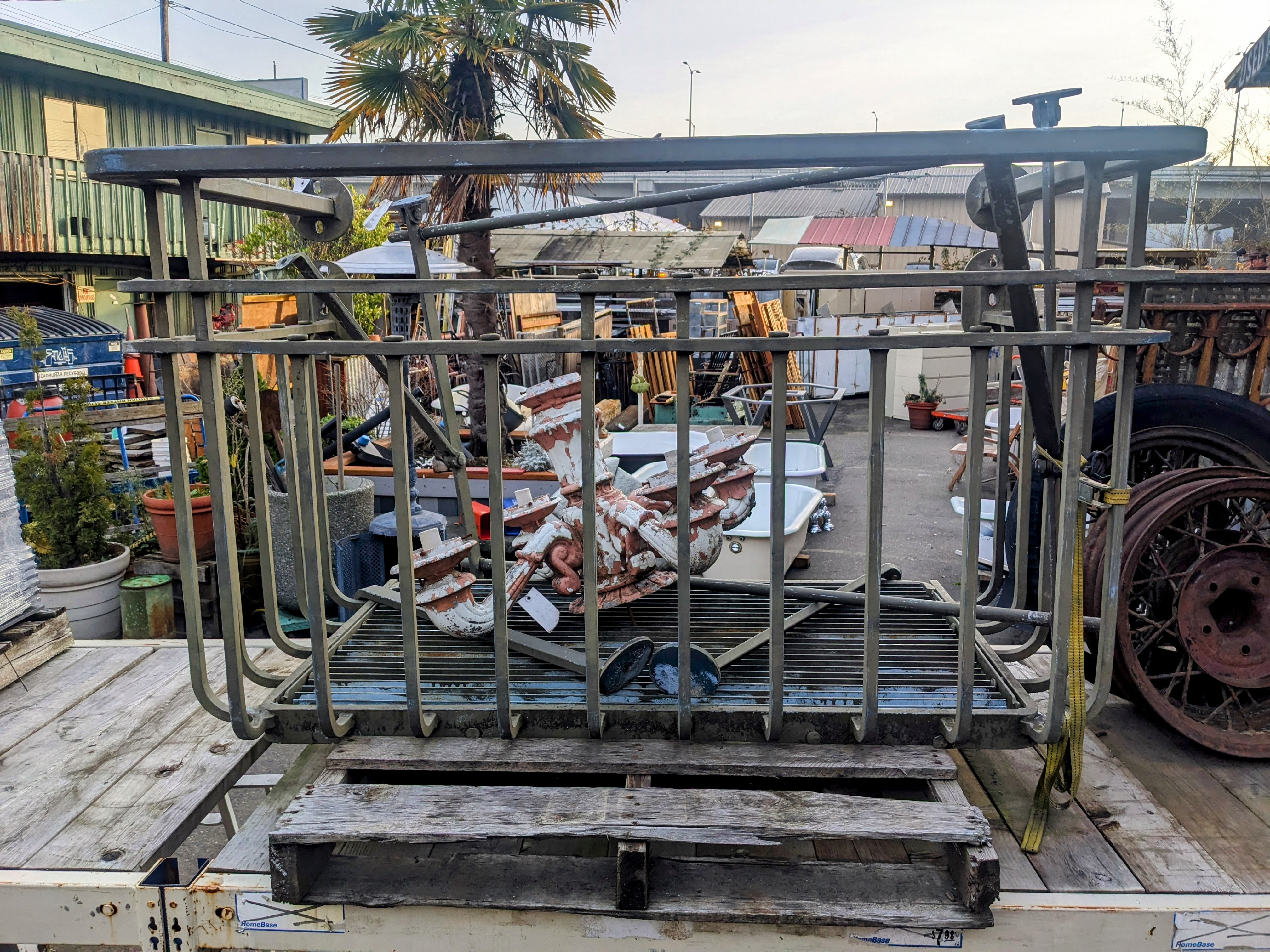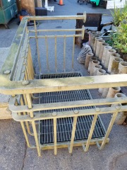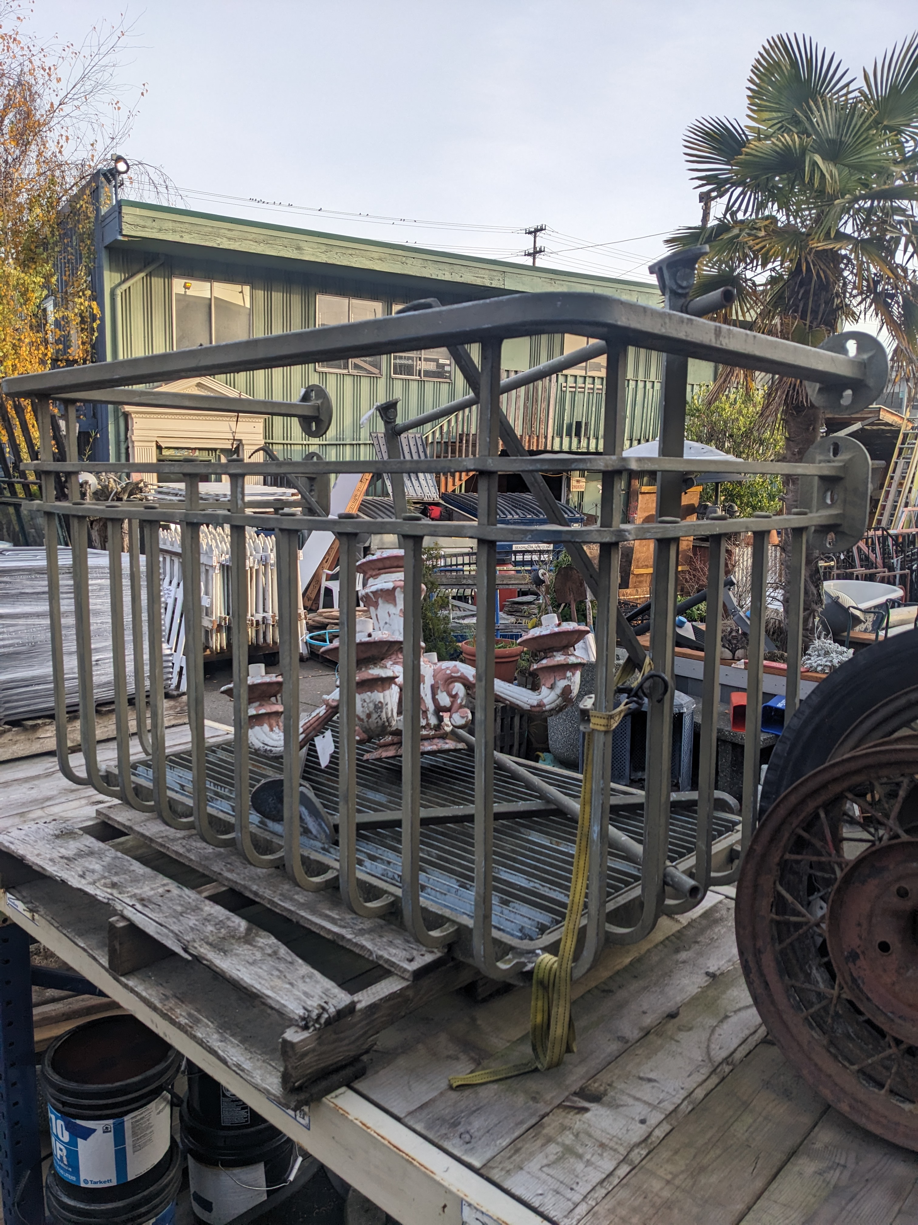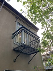 This heavy hand made balcony is constructed entirely from solid steel. All of the brackets and supports are included to reinstall.