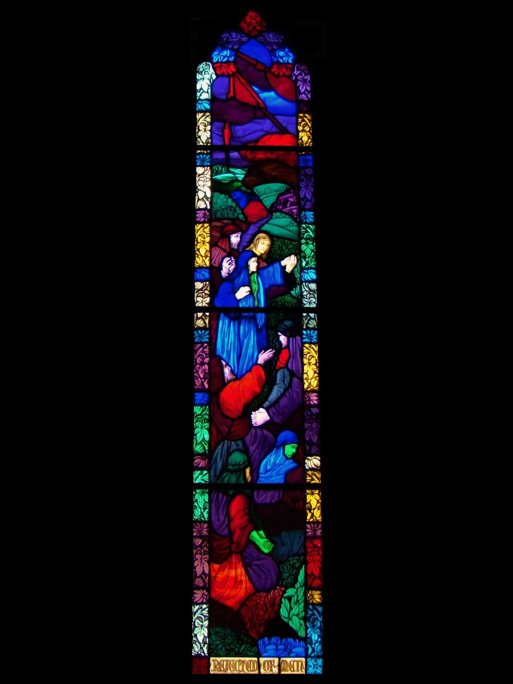 These beautiful pieces of hand painted stained glass, created by renowned stained glass artist, Anthony Rez, were removed from the University Methodist Temple in the University District (circa 1925). Many of the pieces have numerous breaks and/or missing pieces due to the difficult nature of removing stained glass framed only by the stone walls of the church. They may need repairs and/or framing for their next use depending on the application. Pictures of the glass installed in the building are representational and do not reflect the damage. Our pricing has taken any damage into account.