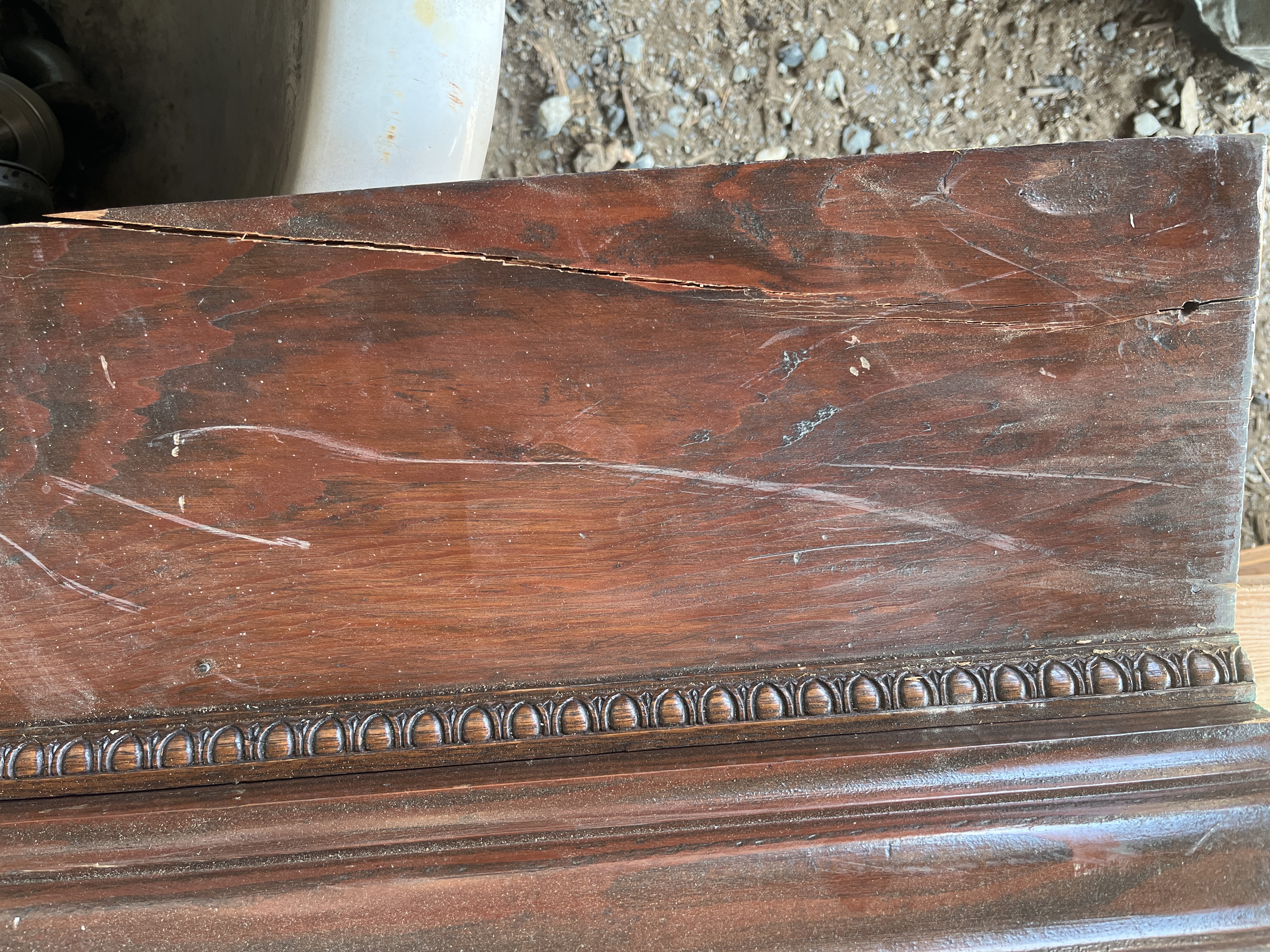Beautiful egg and dart fir cornice with a warm dark stain. Some blemishes and a crack on the left side, but otherwise in good condition.