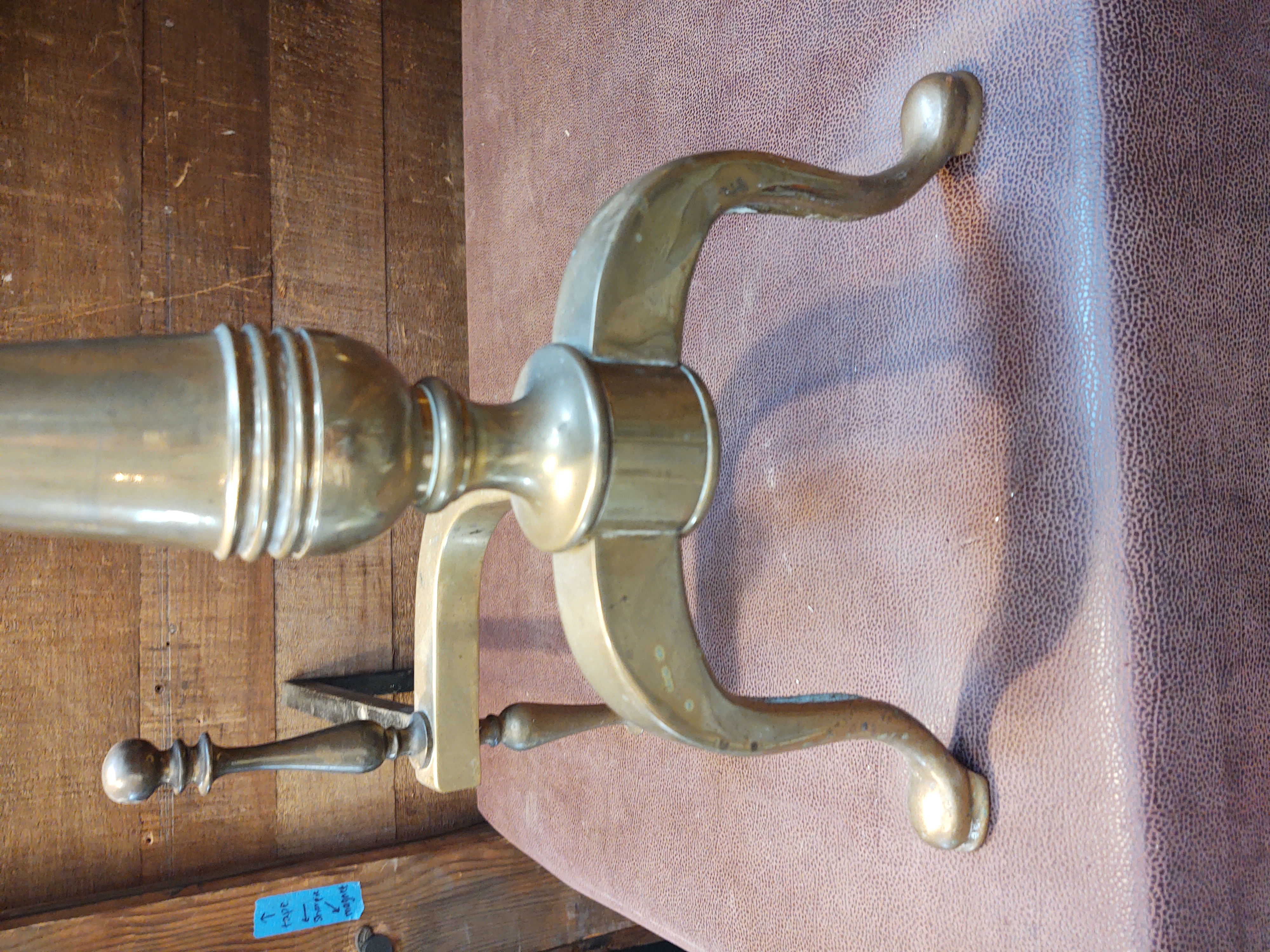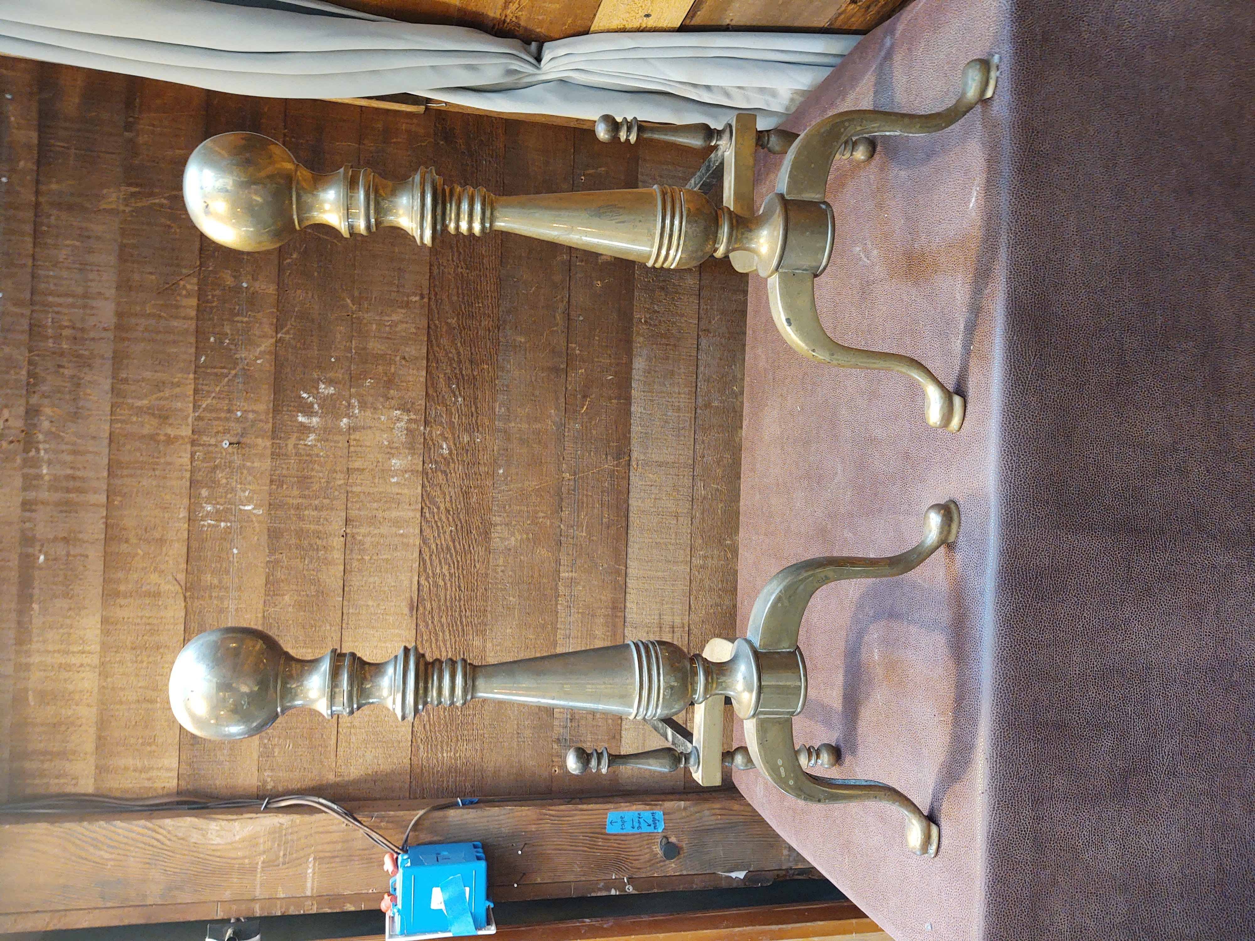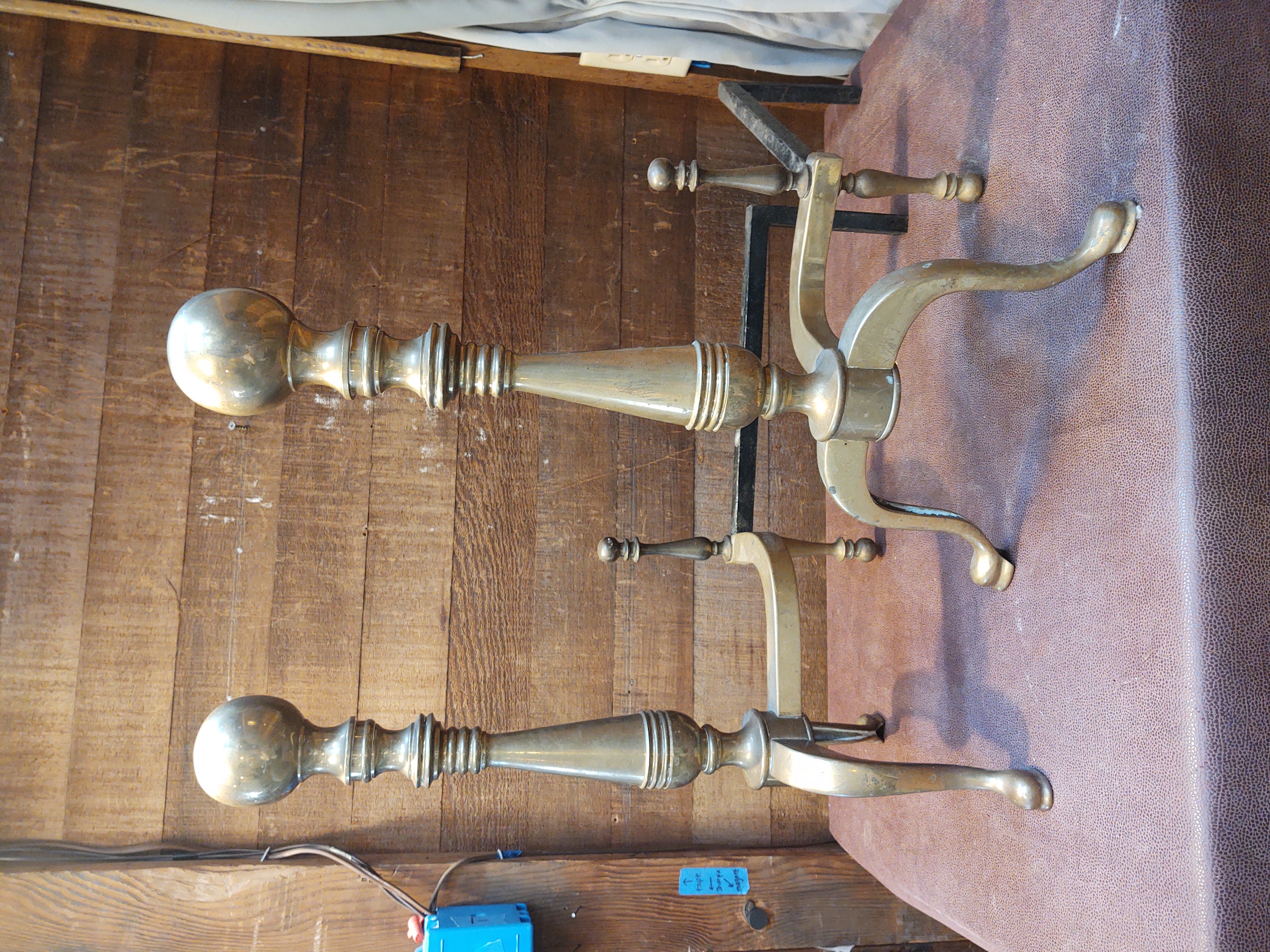 Pair of large brass fireplace andiron with decorative tops. Andirons do have some patina but are sturdy and in good shape.