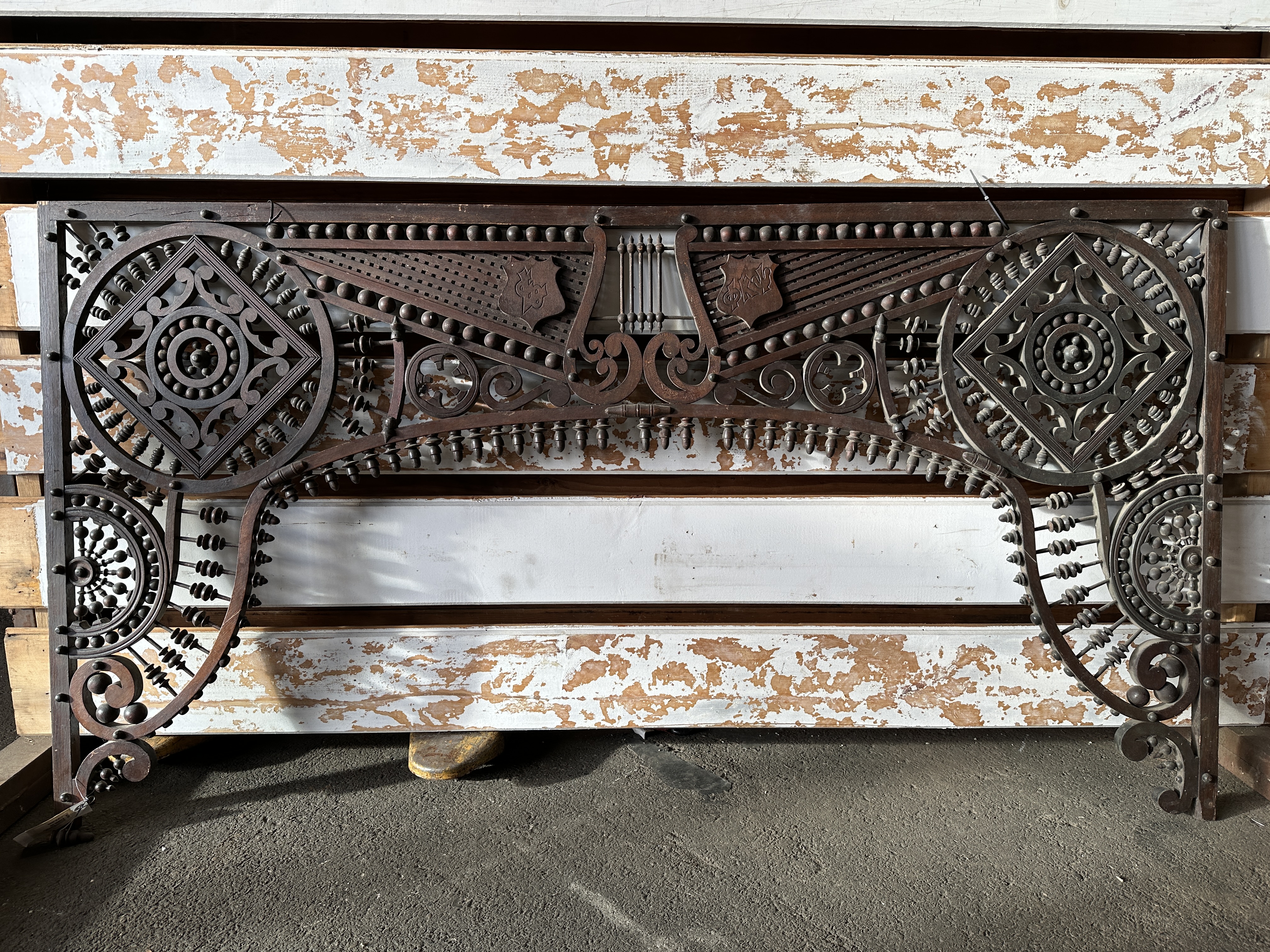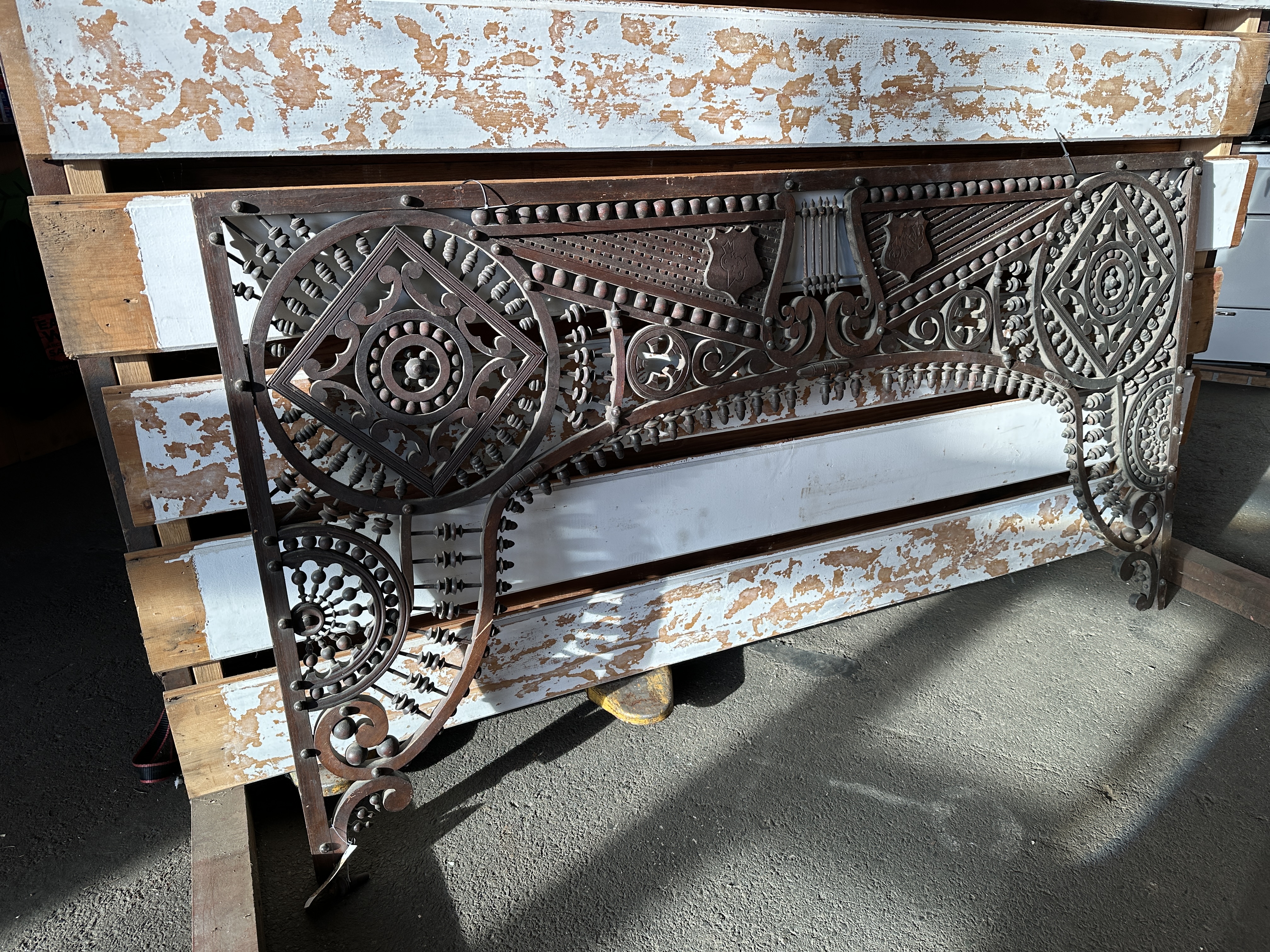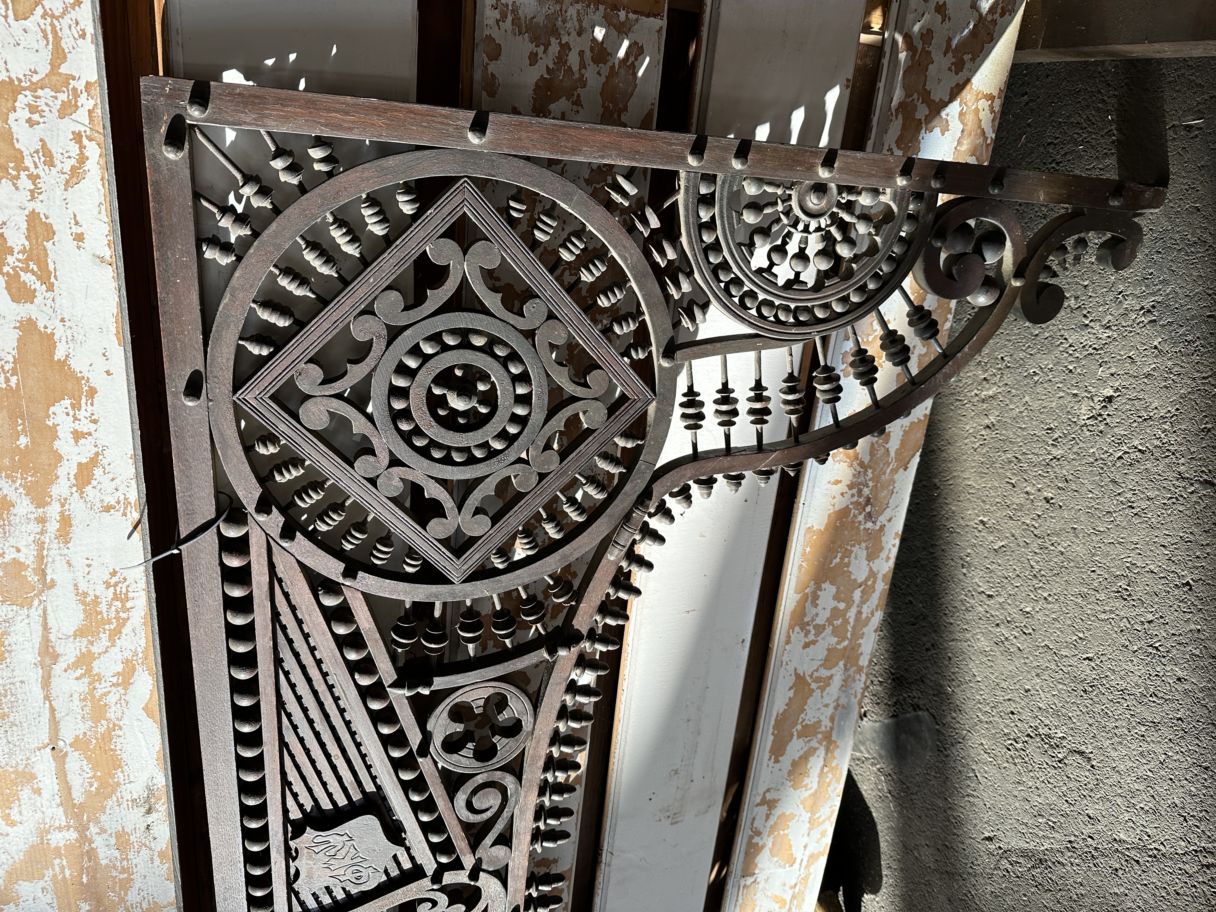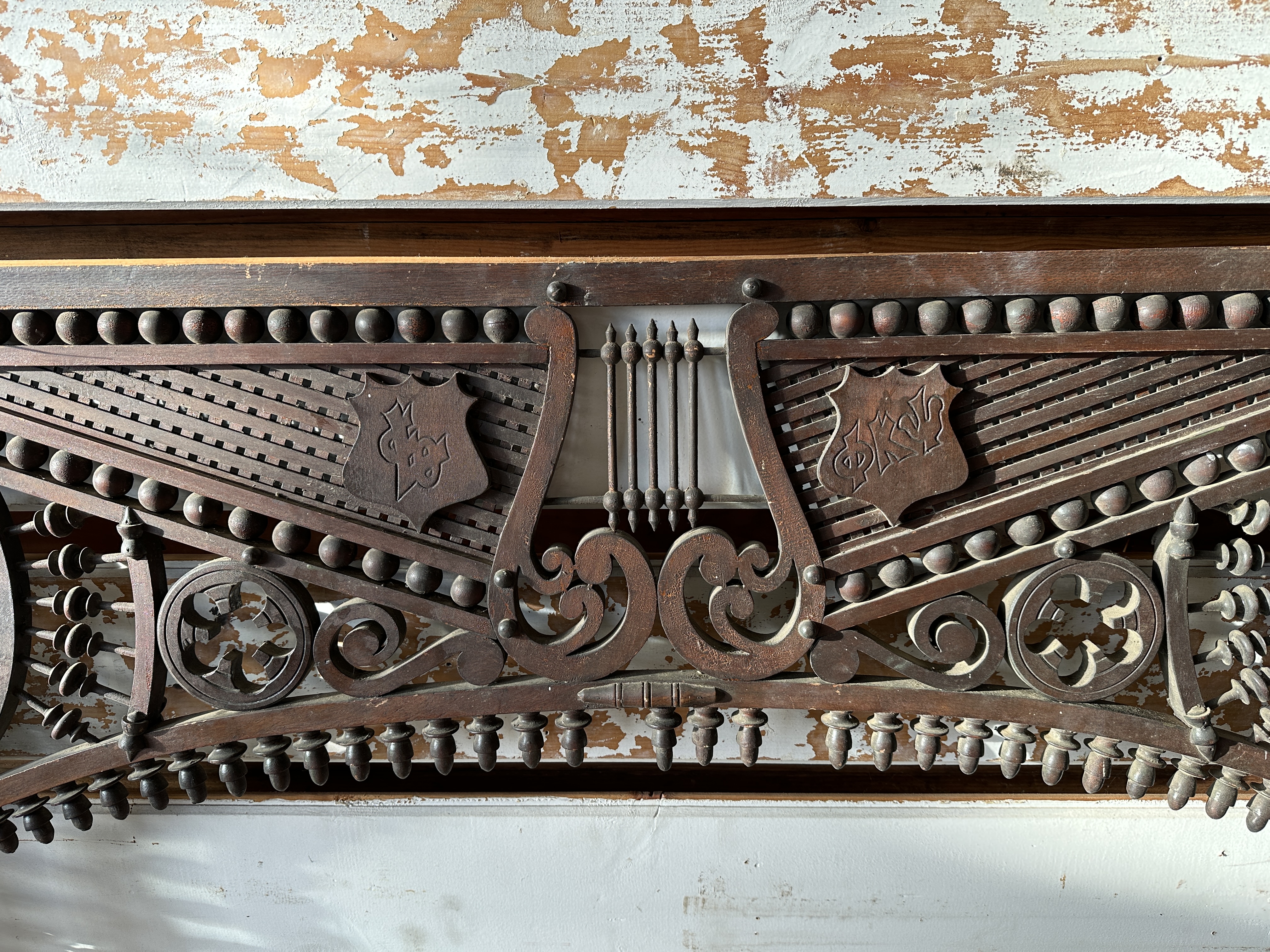 From the entryway to a Phi Kappa Psi fraternity house. This could stand to be outside provided it was protected from the elements. Because of the detail wood work, missing turned pieces, and some overall wear and tear, this unique piece is priced AS IS.