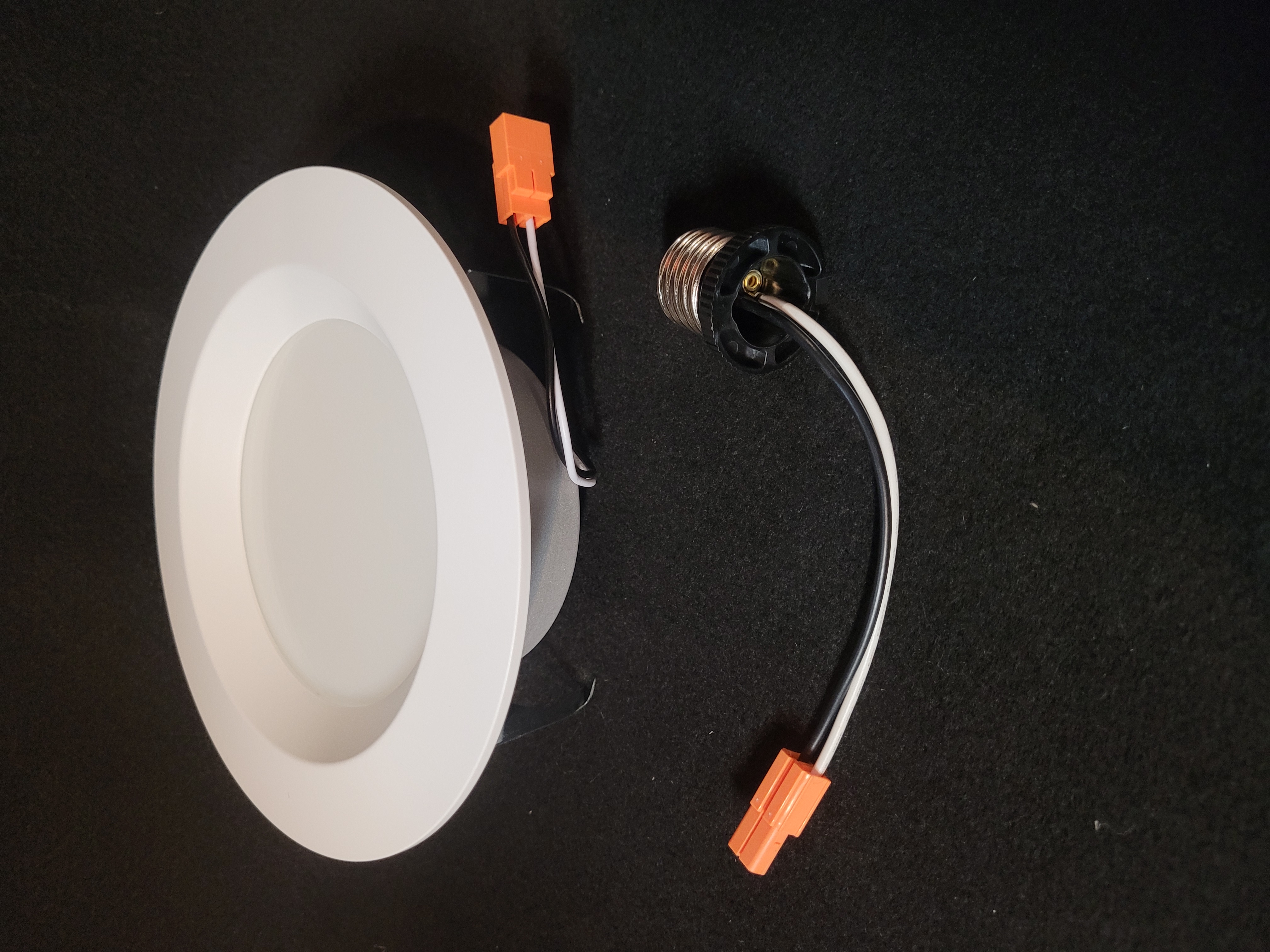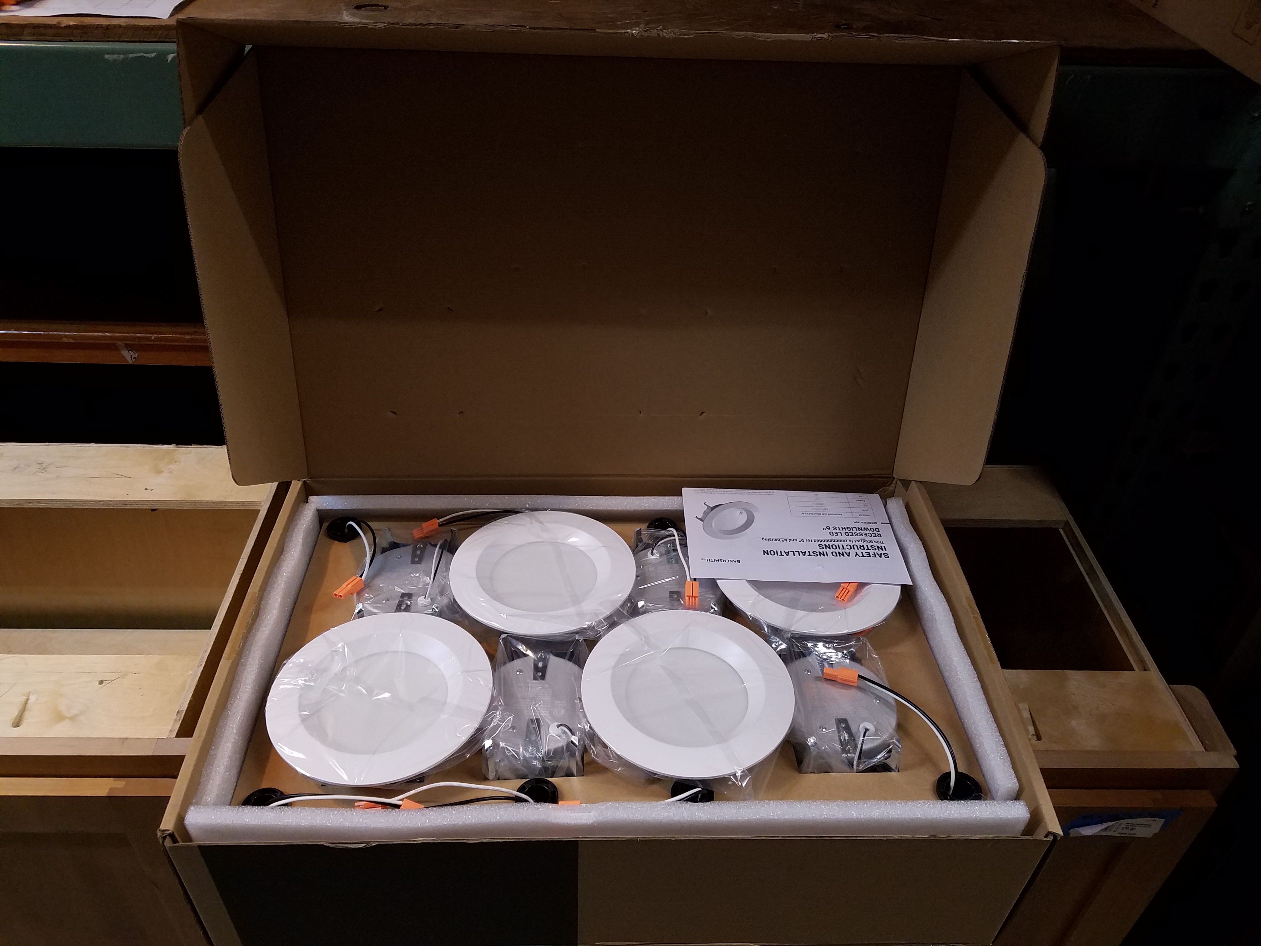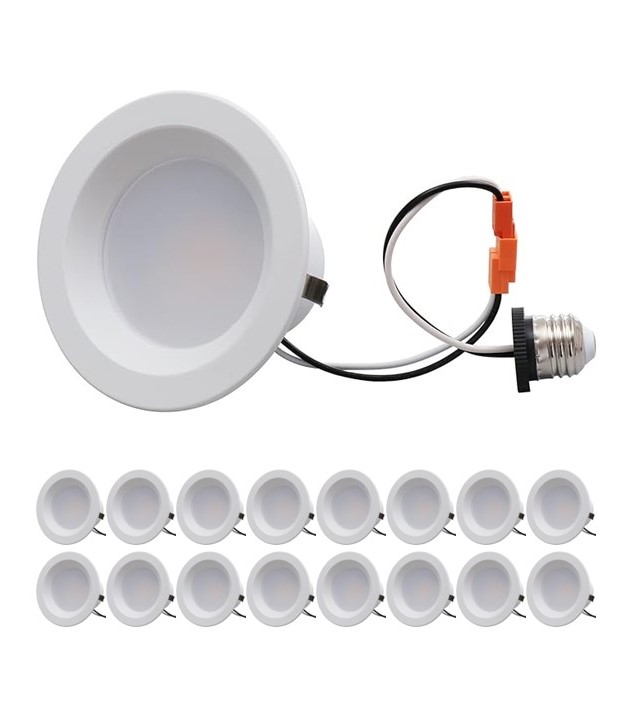 Never installed box of 16 recessed LED Bakersmith brand downlights. Simple plug and attach style. Instructions included in box.