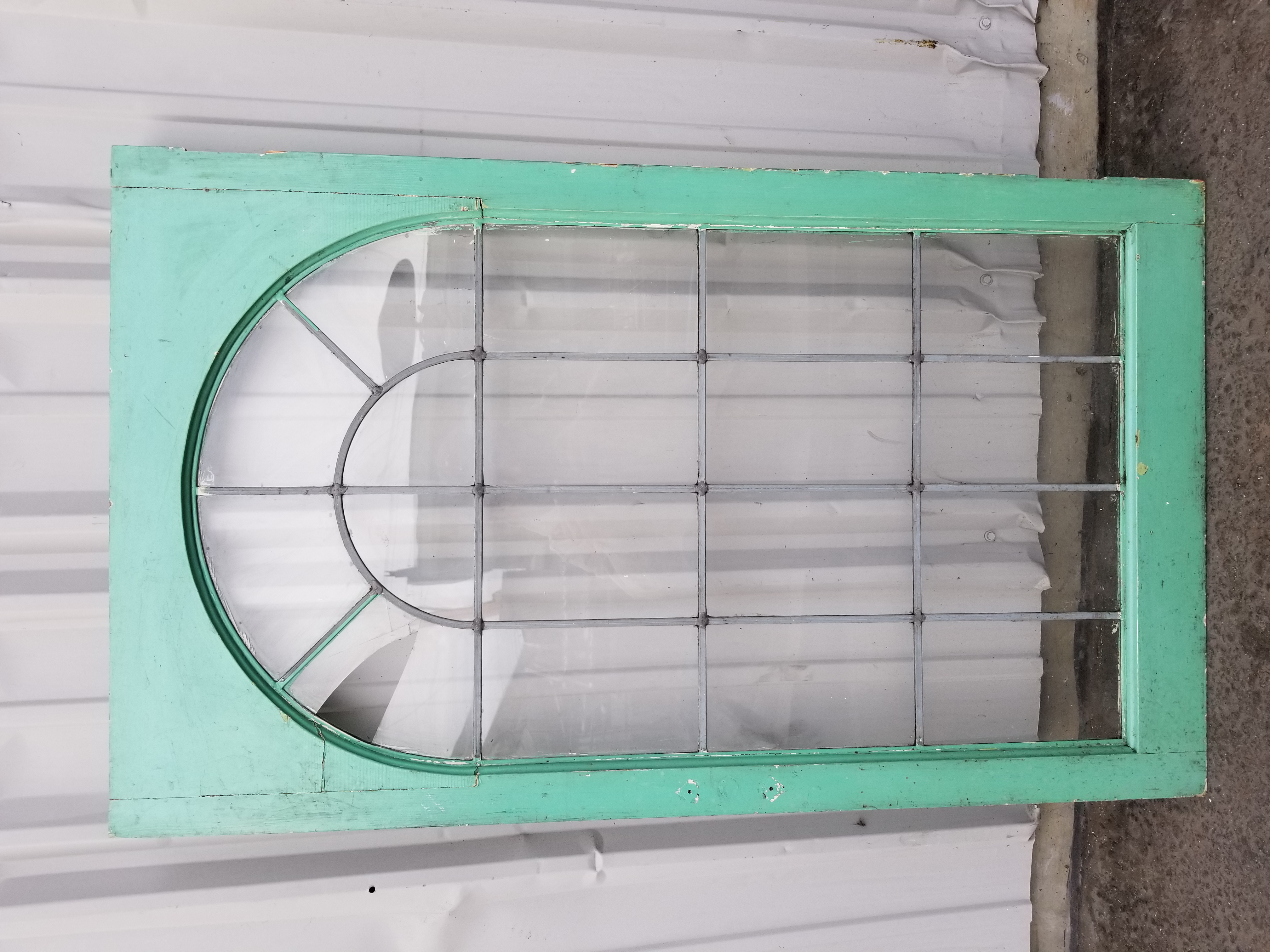 18 pane leaded glass window. Painted on both sides. Arched top. Quite unique piece. On of the arched panes is broken and two additional panes have cracks so this item is priced AS IS.