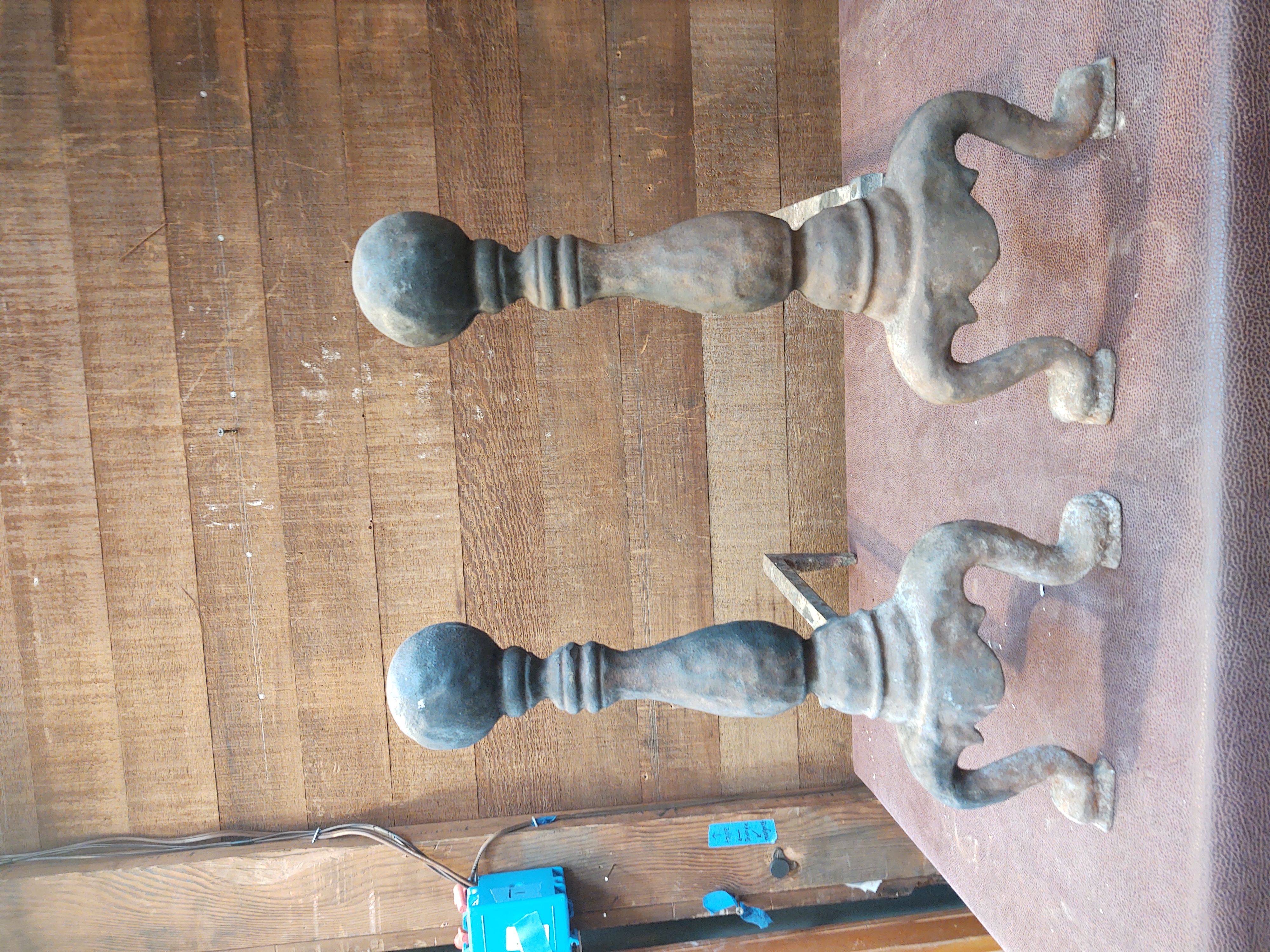 Looks to still be in good condition but is a little wobbly and has varying patina. Is missing one bolt on one of the andirons.