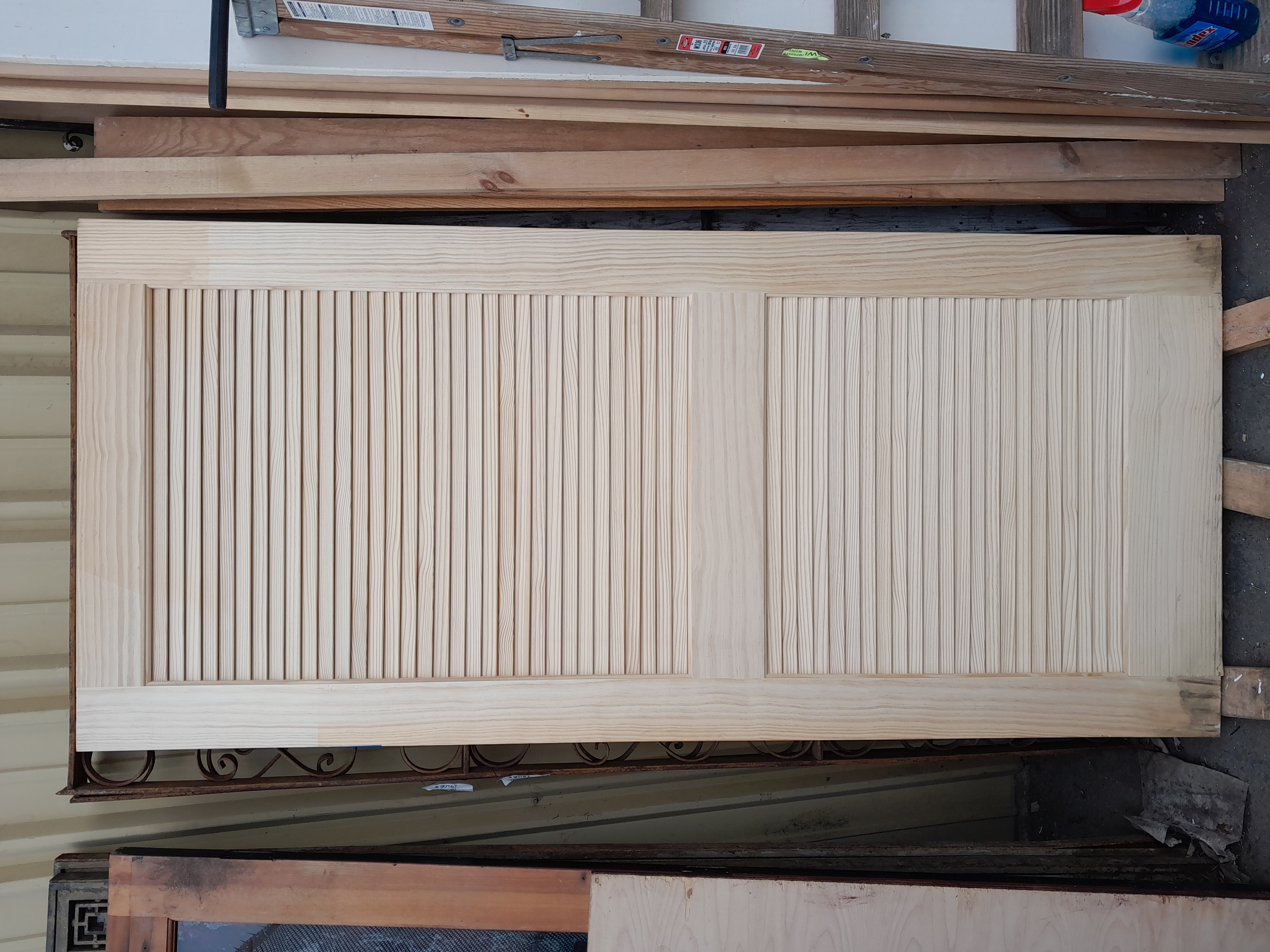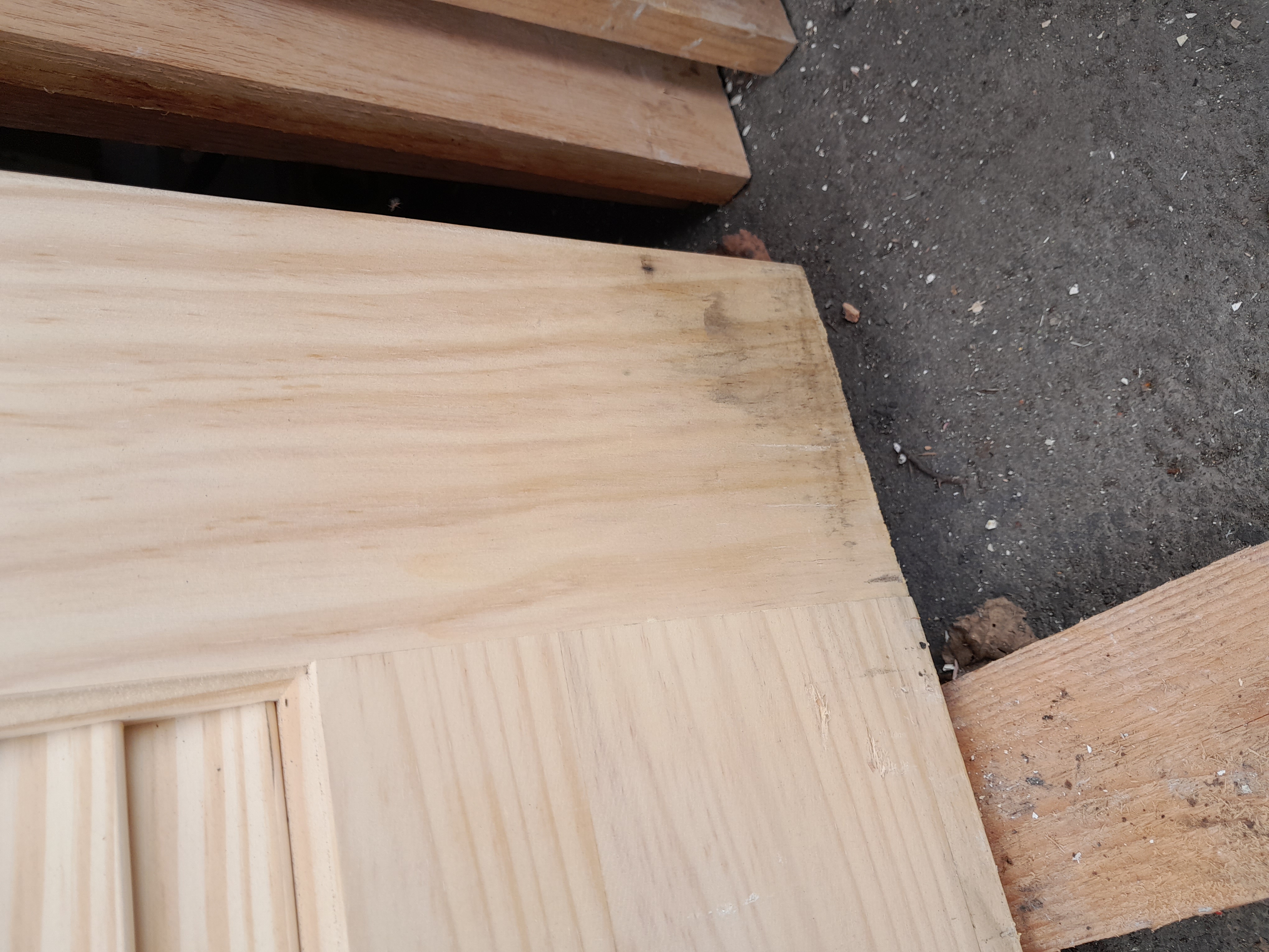 In good condition. This pine door is brand new not cuts with some weather stains at the bottom. Priced AS IS.