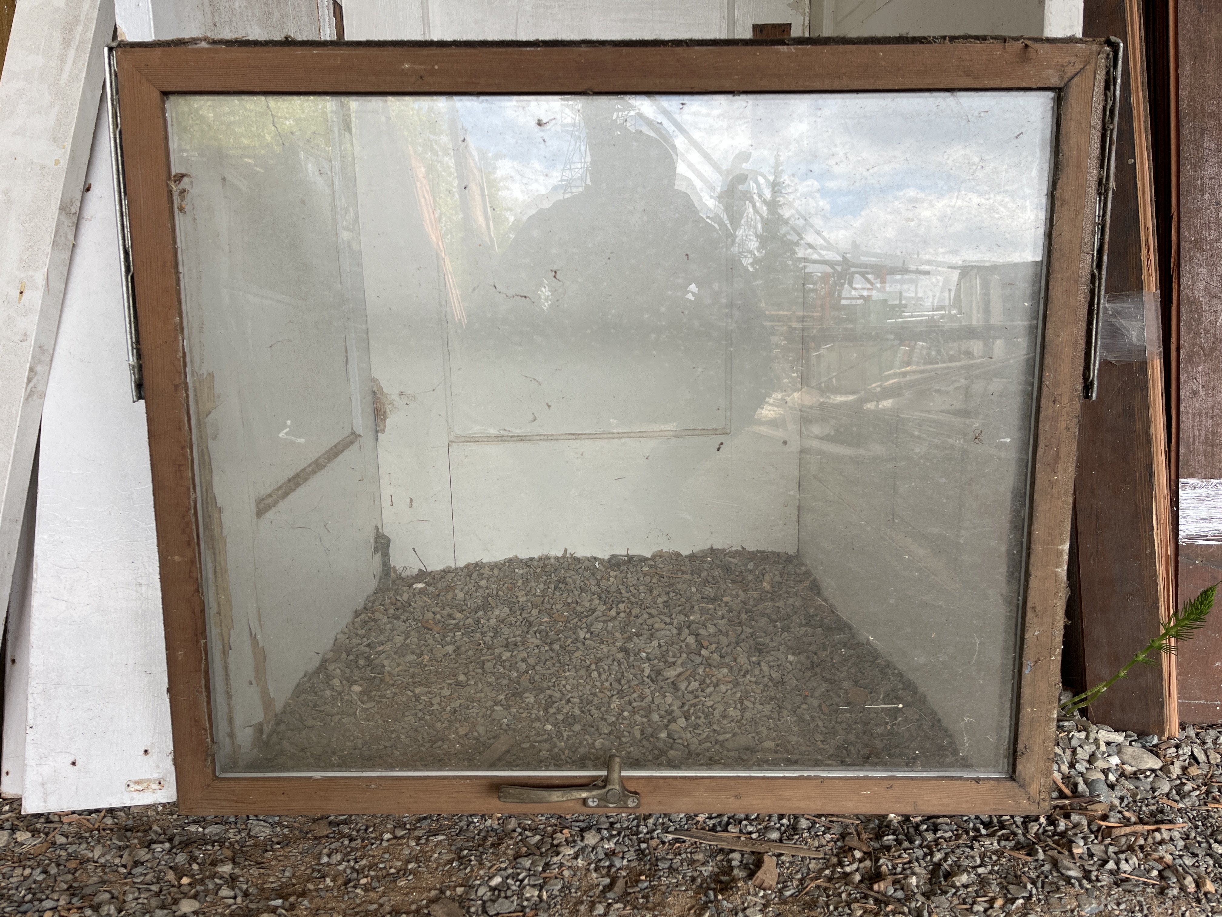 Thermal wood windows with double panes. The windows look to be fold out windows with the extending hardware still attached to the sides.