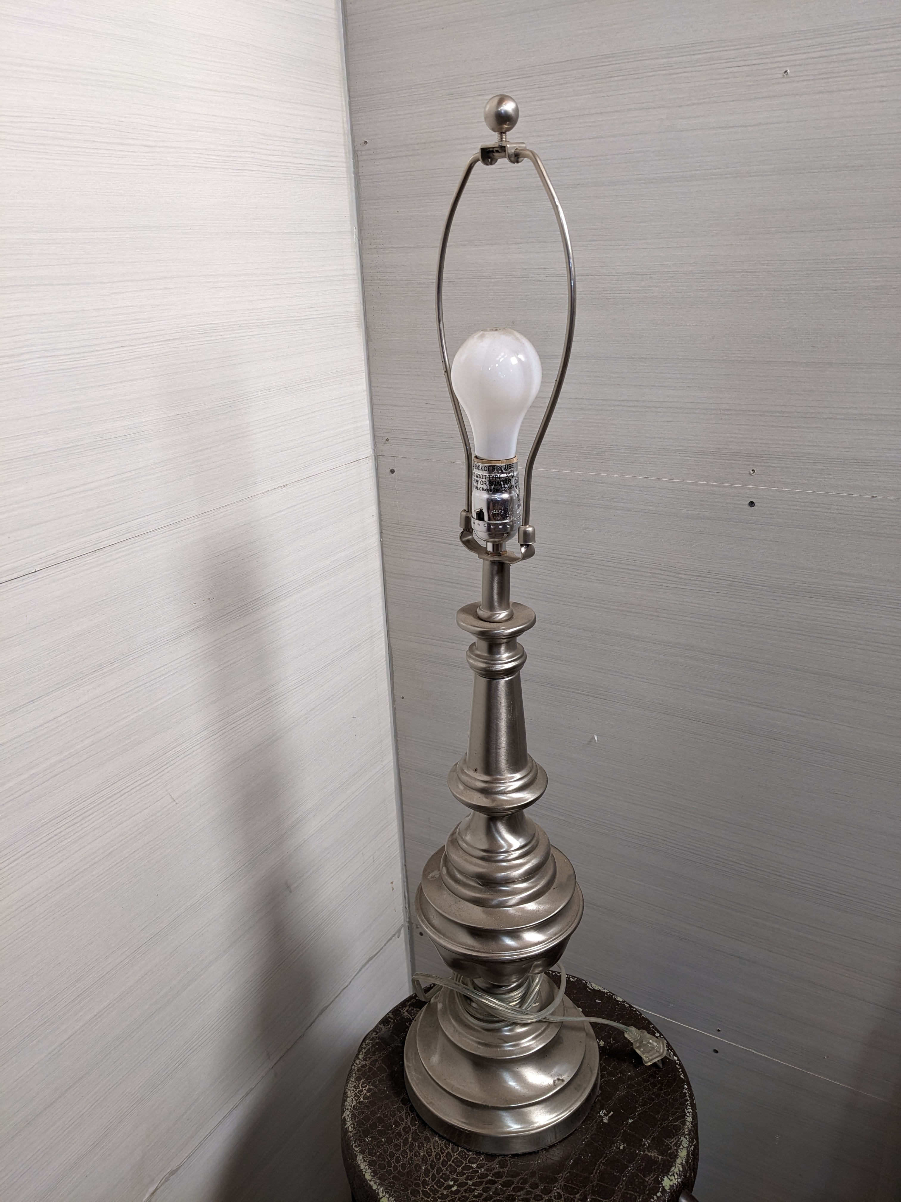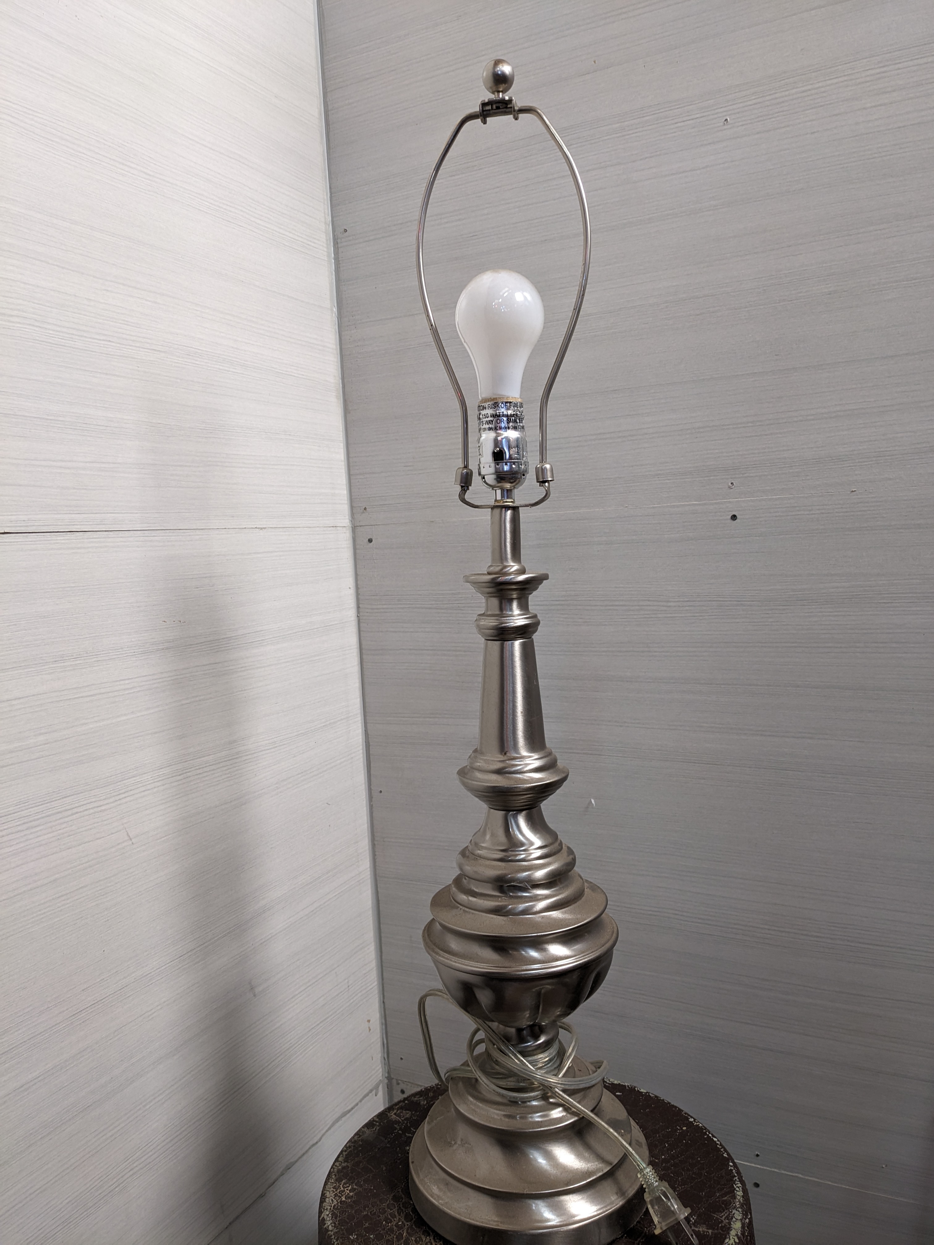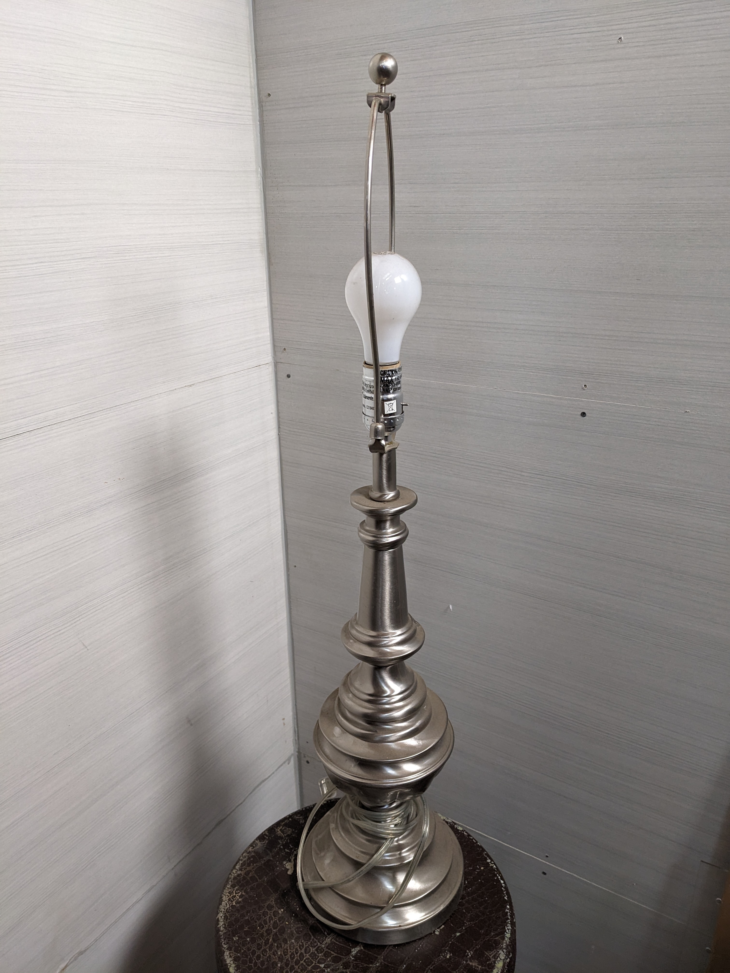 Brushed steel finish, shade not included. In good condition overall, with its original harp and finial!