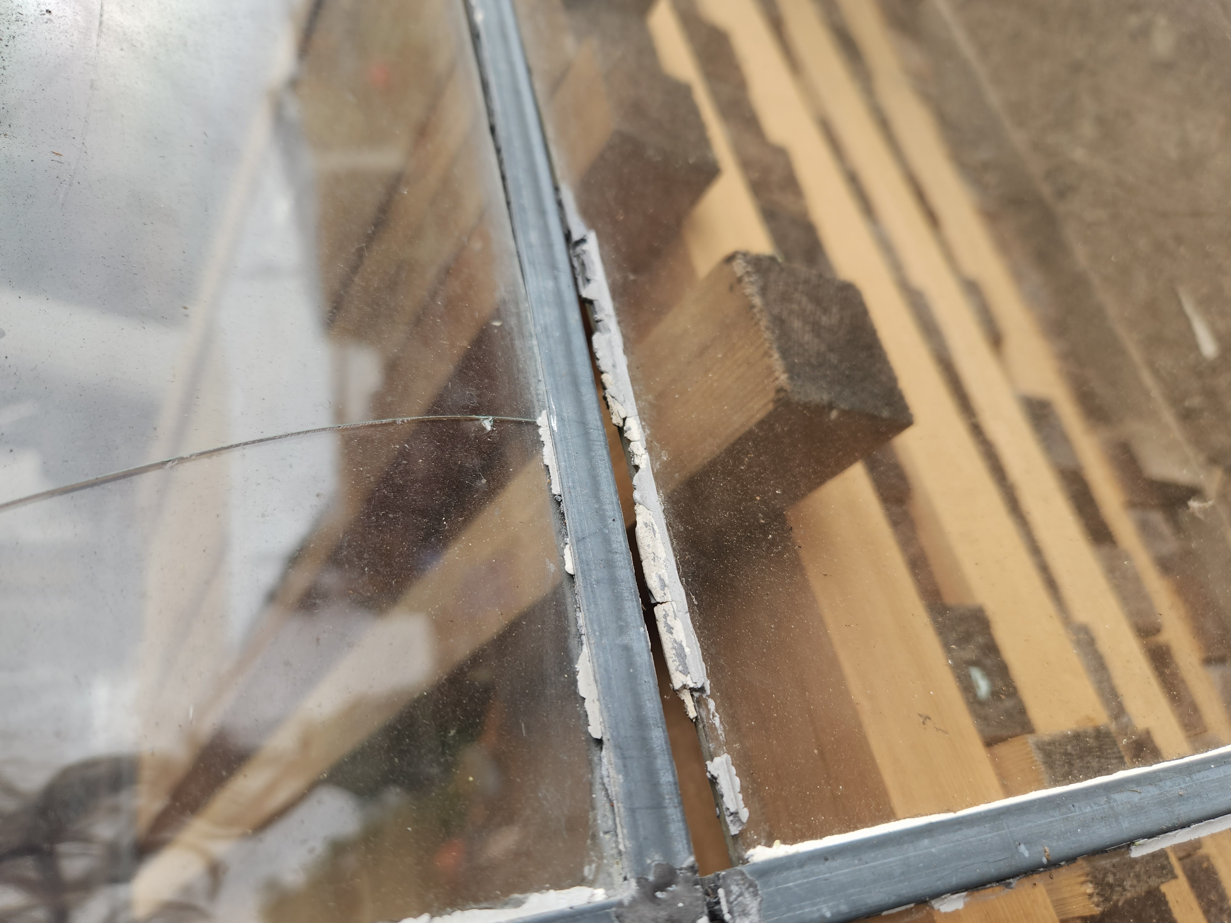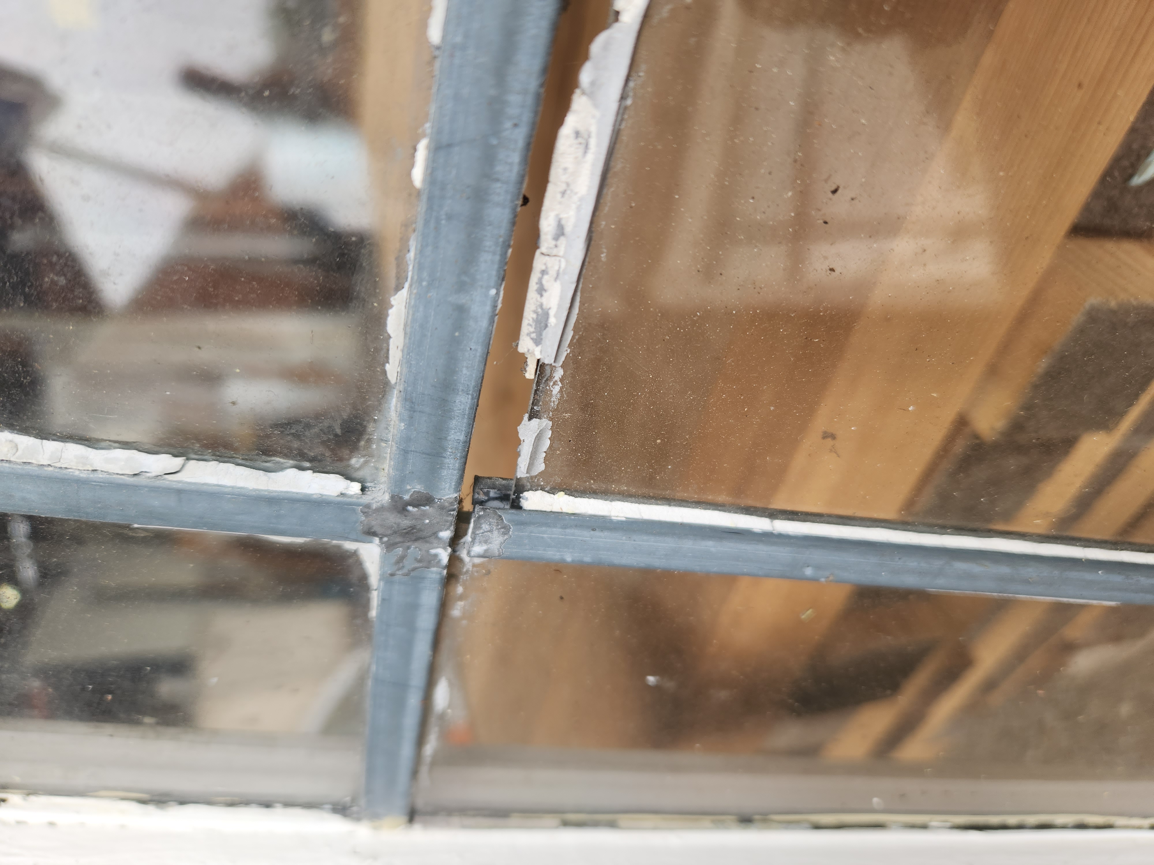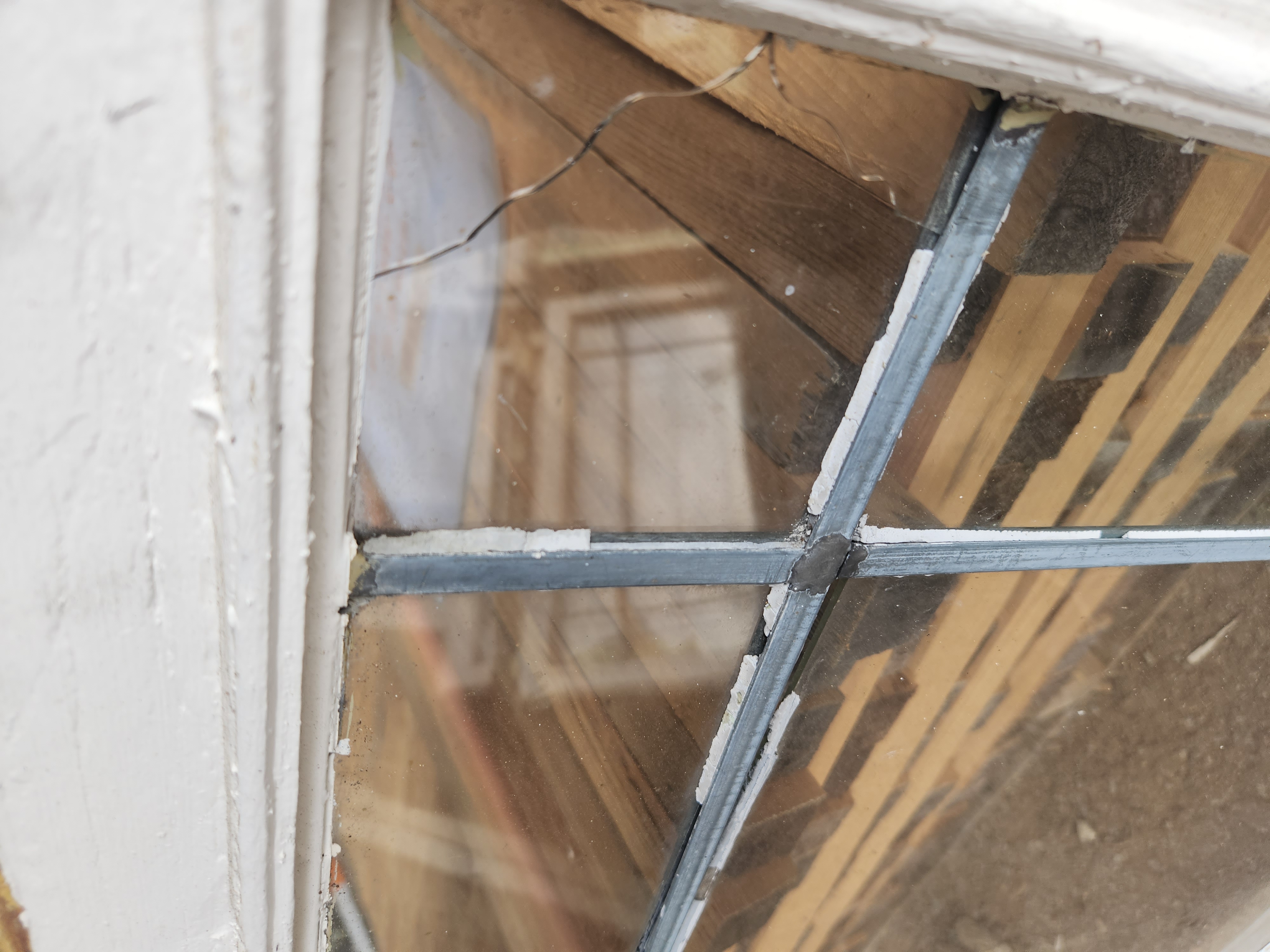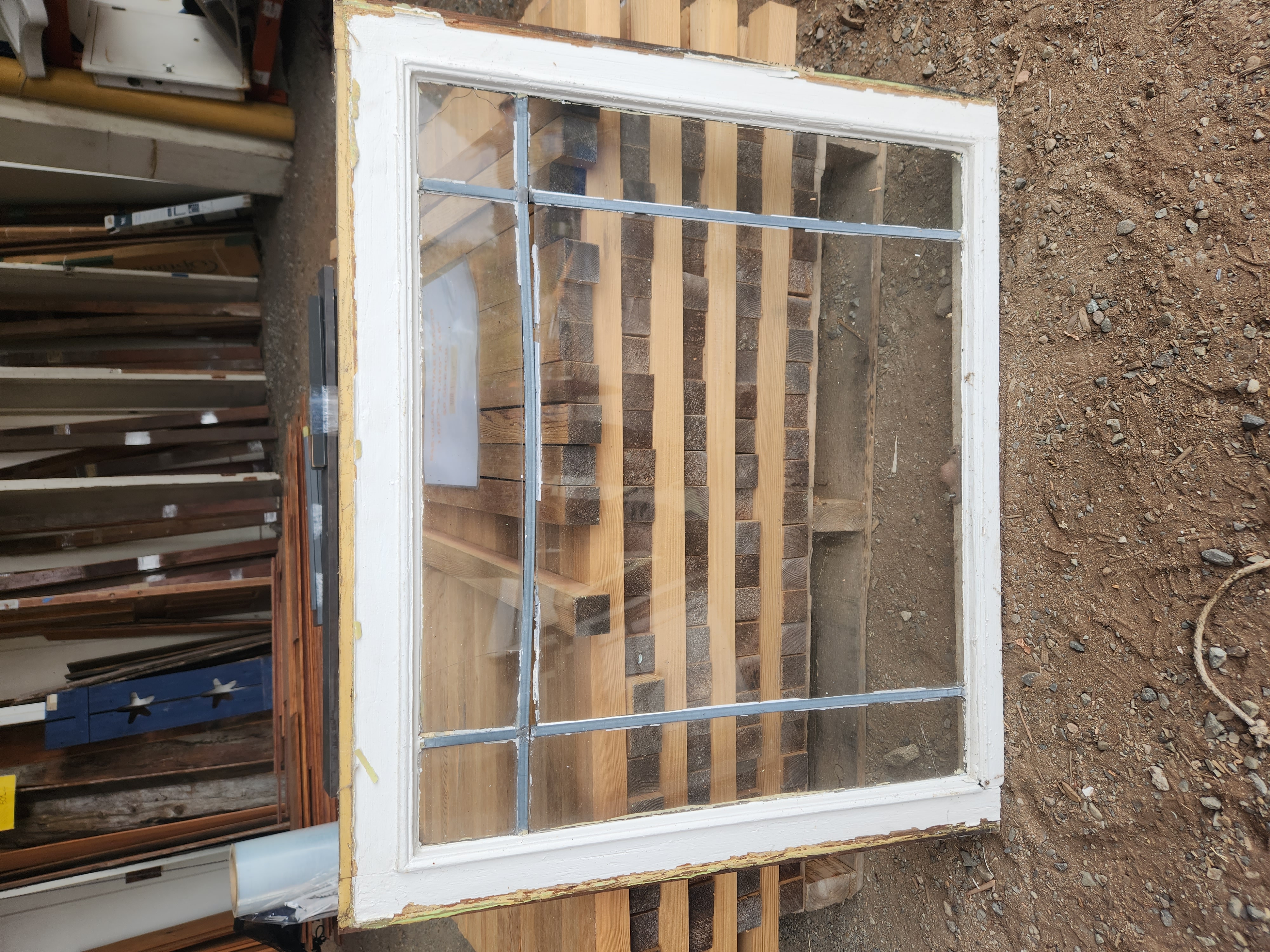 2 broken panes and the largest one is coming out. Painted white on both sides. The frame is in good condition. Our old windows are great for sheds or greenhouses.