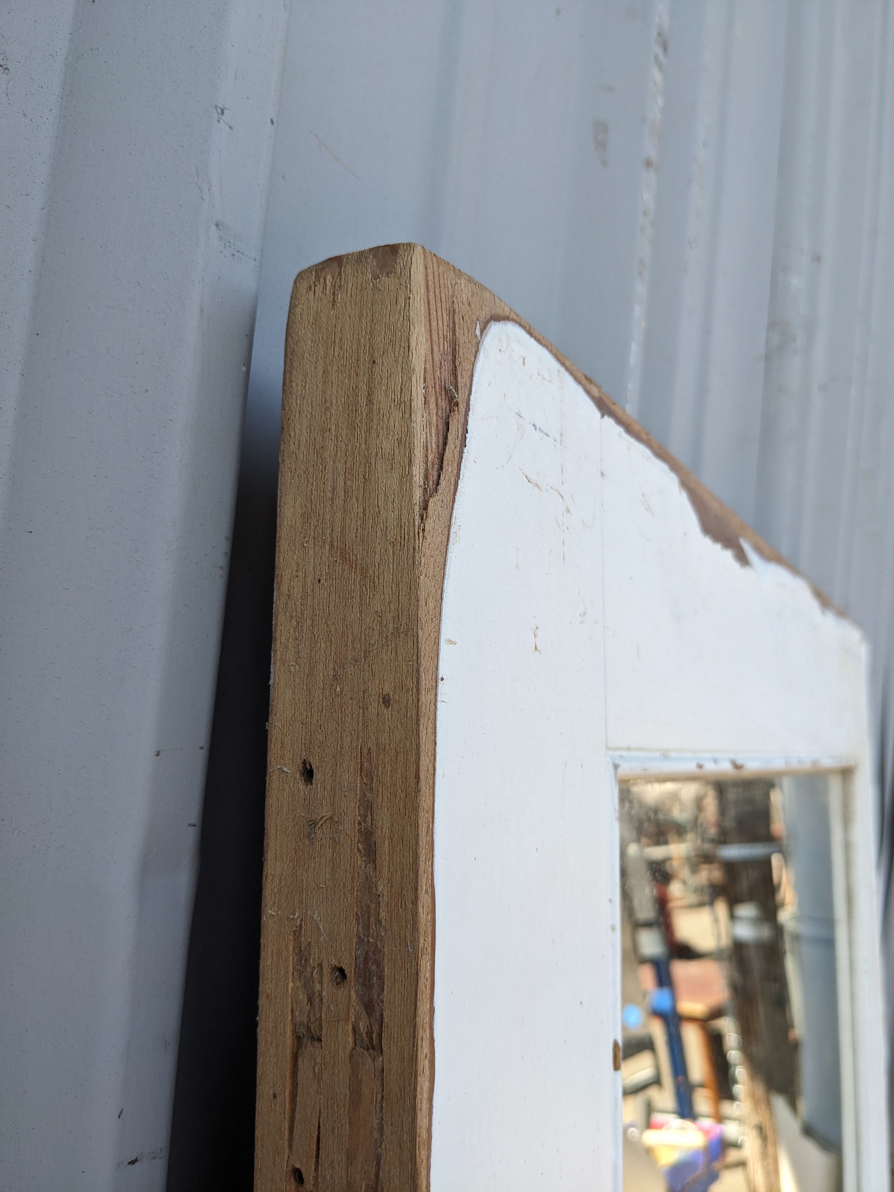 Has a vintage mirror on the painted side and a single wood panel on the unpainted side.
