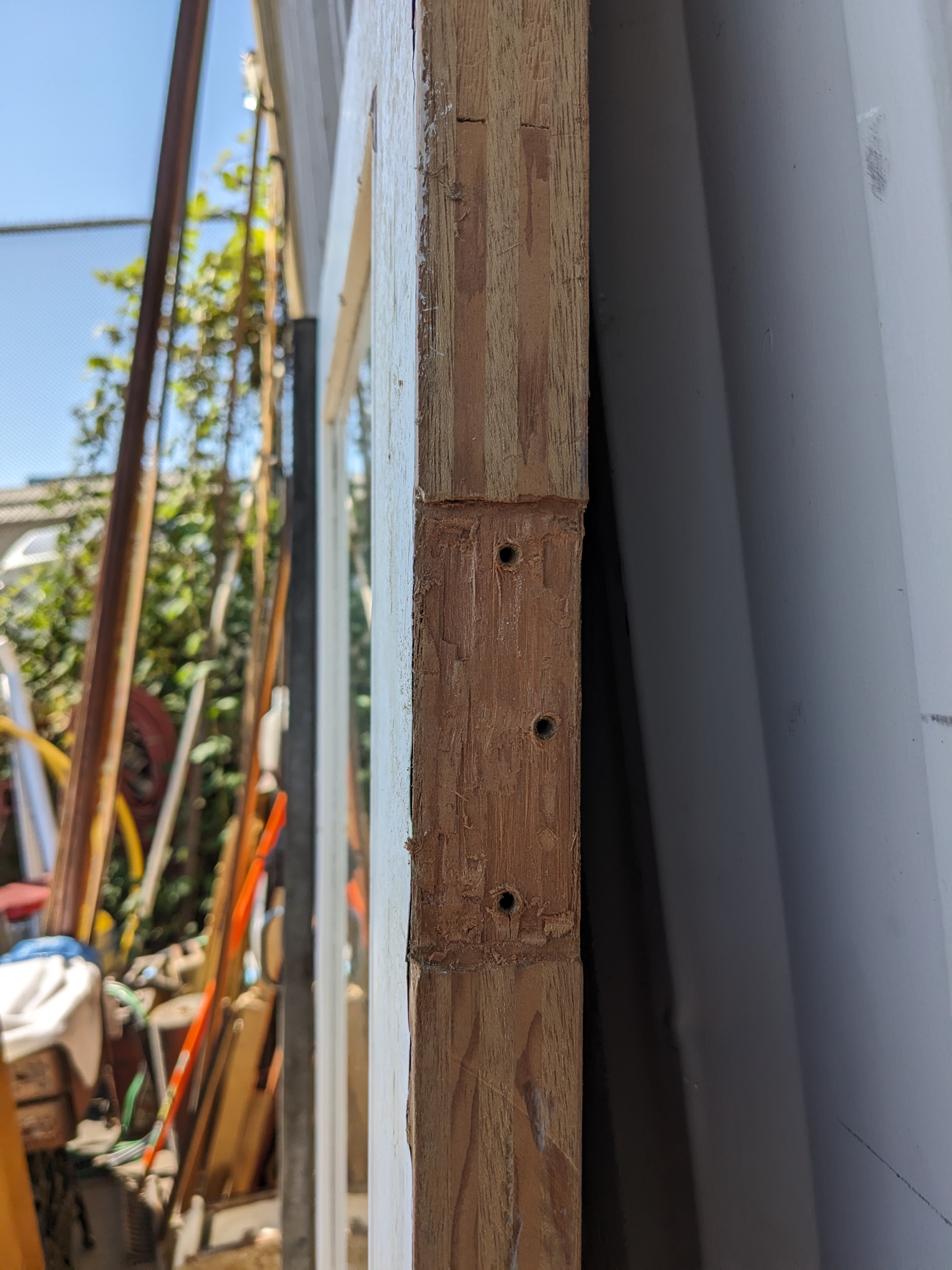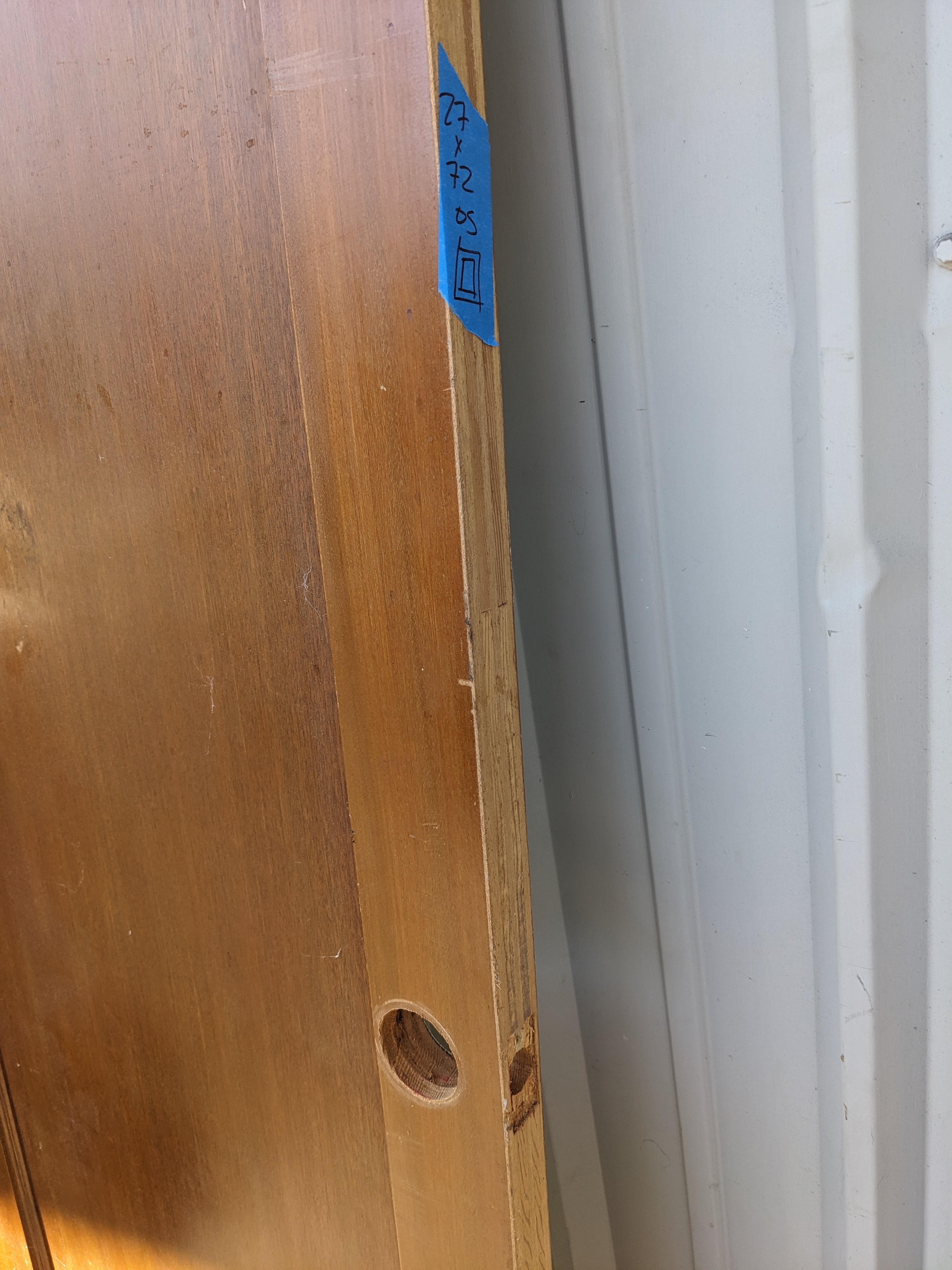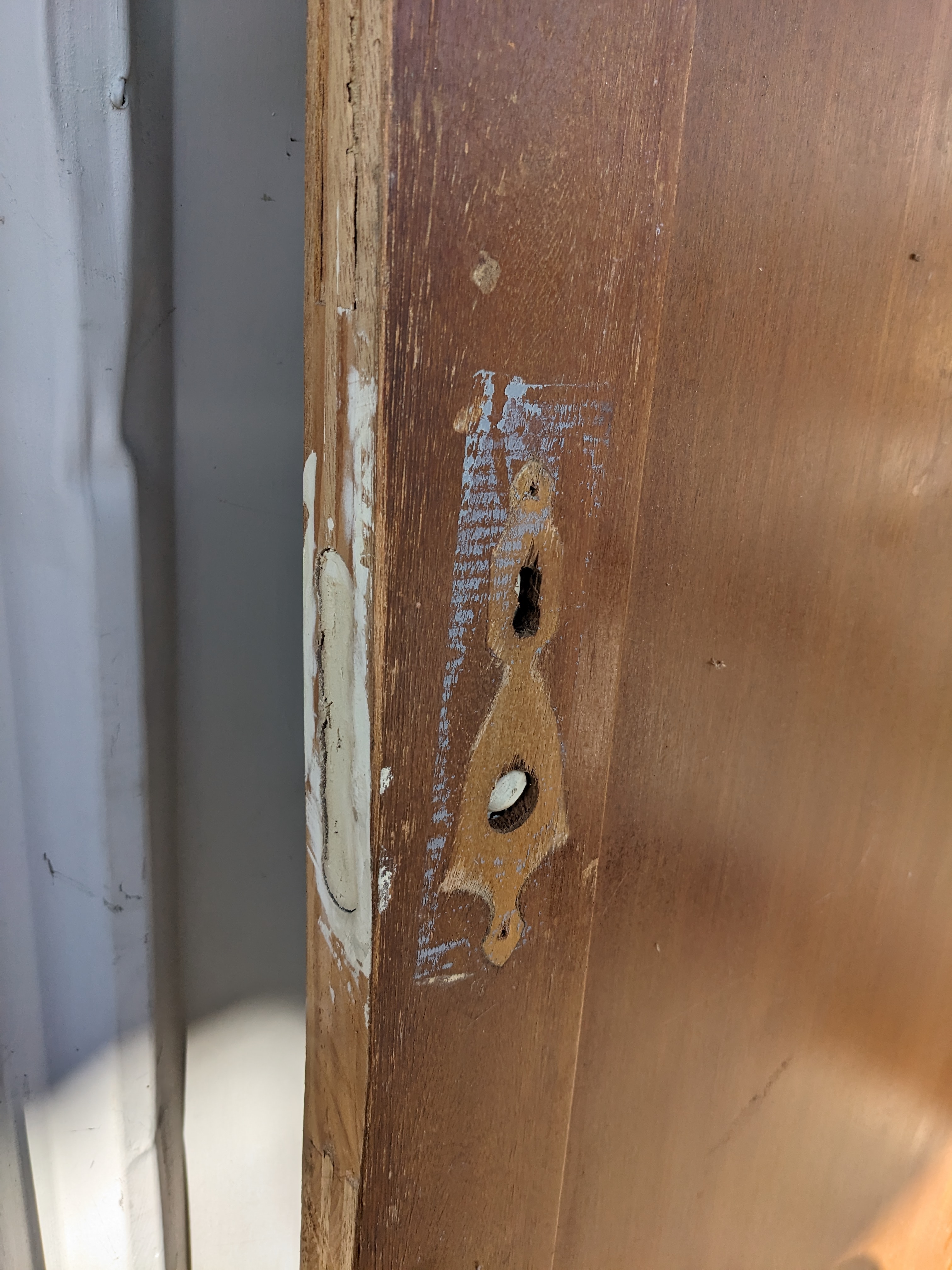 This door started its life as a single swing but was shaved down and switched to open swing, with the locking mechanism on one side filled in with plaster. The other side is full functionally though and ready for any modern door handle with latch!