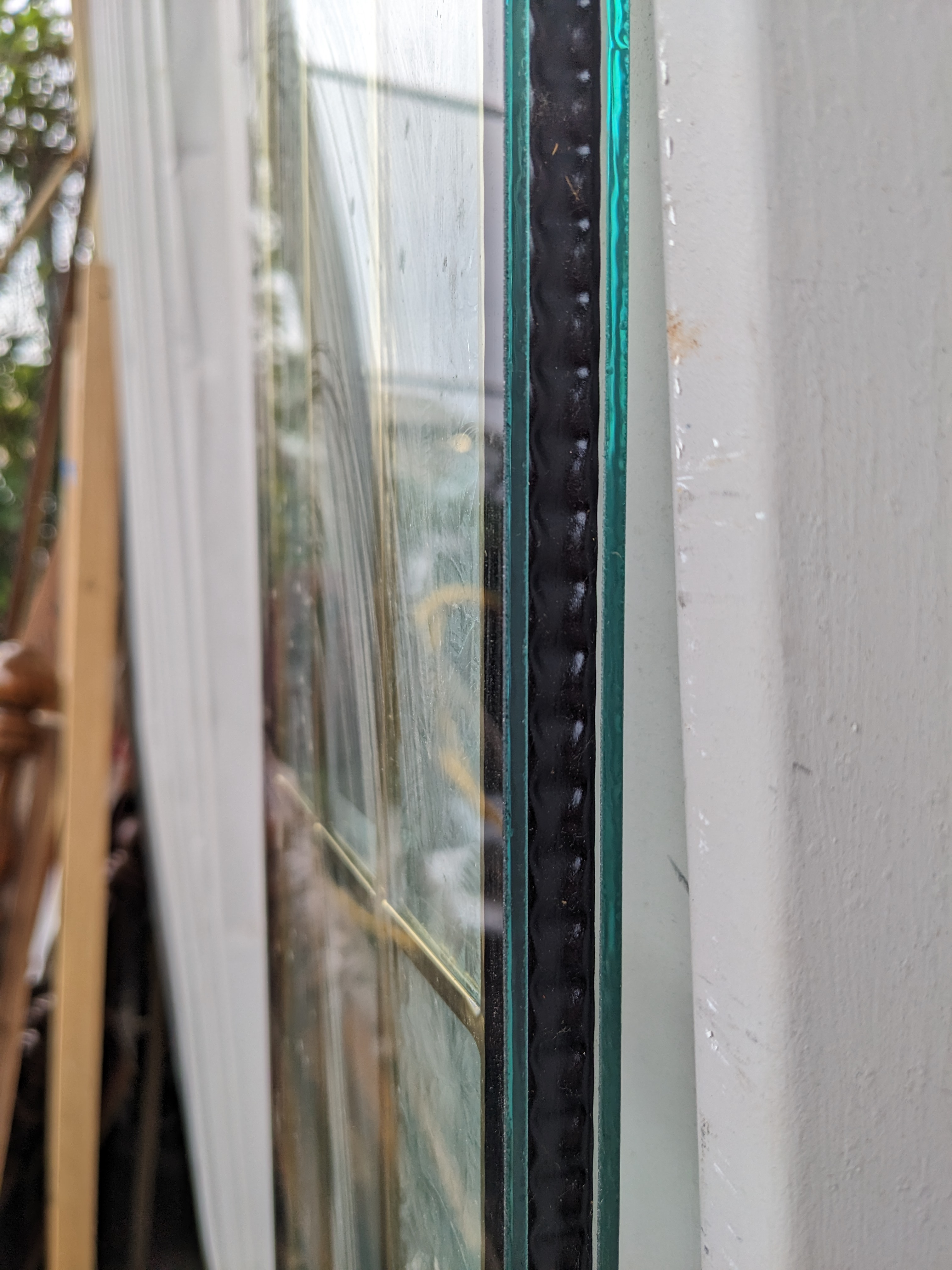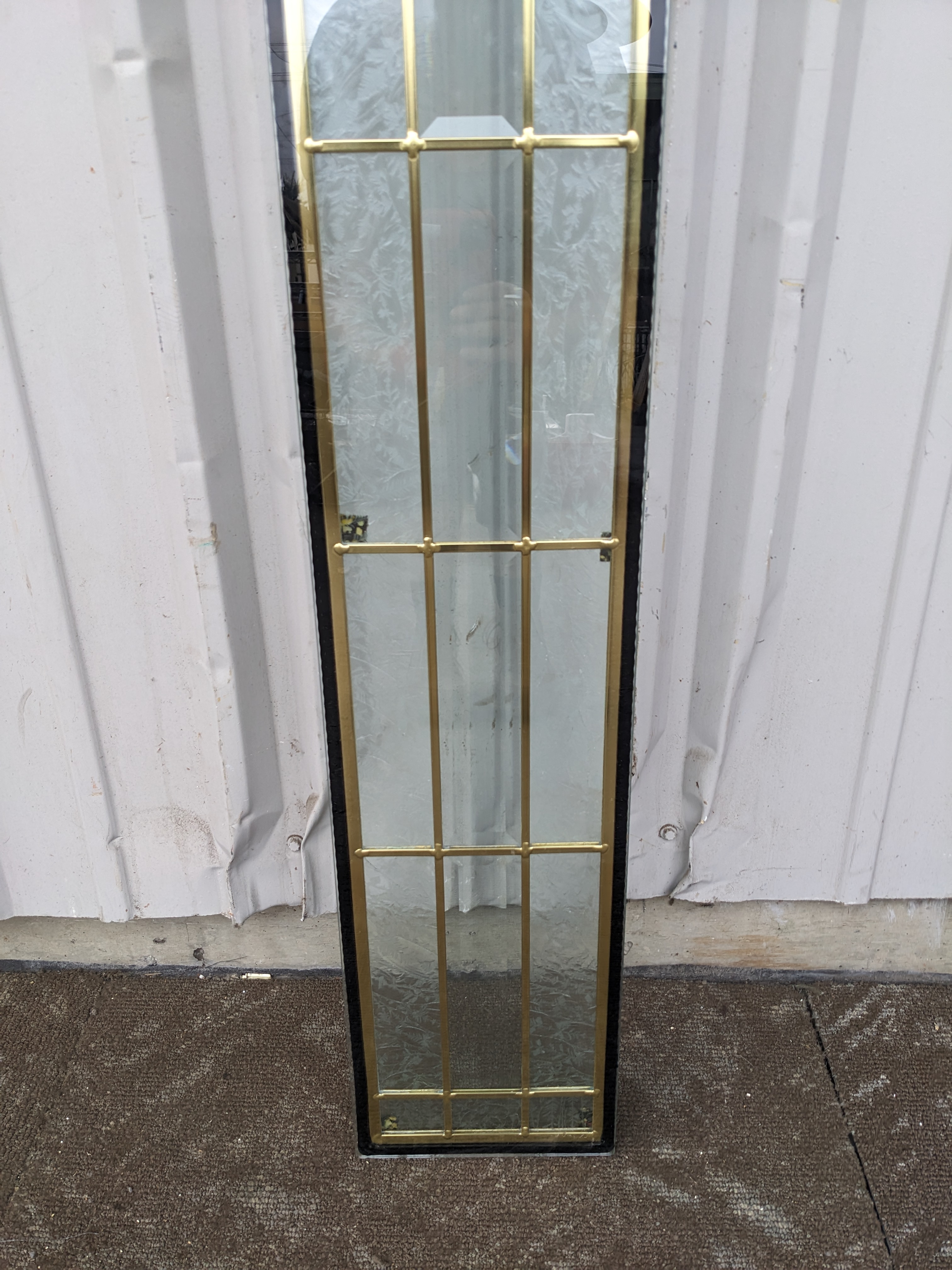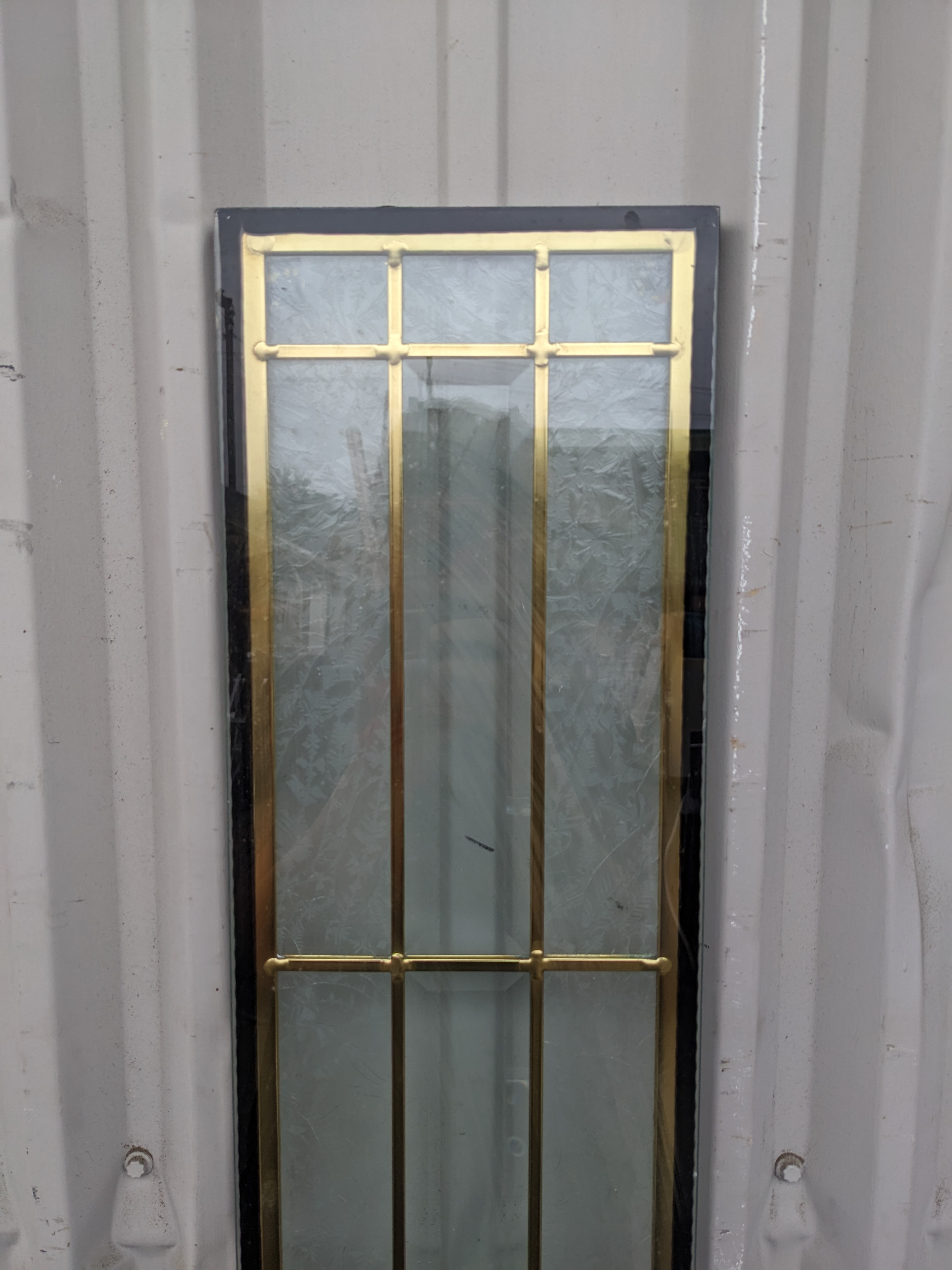 Excellent condition leaded glass door insert with beveled geometric clear glass pattern and gold patina lead.