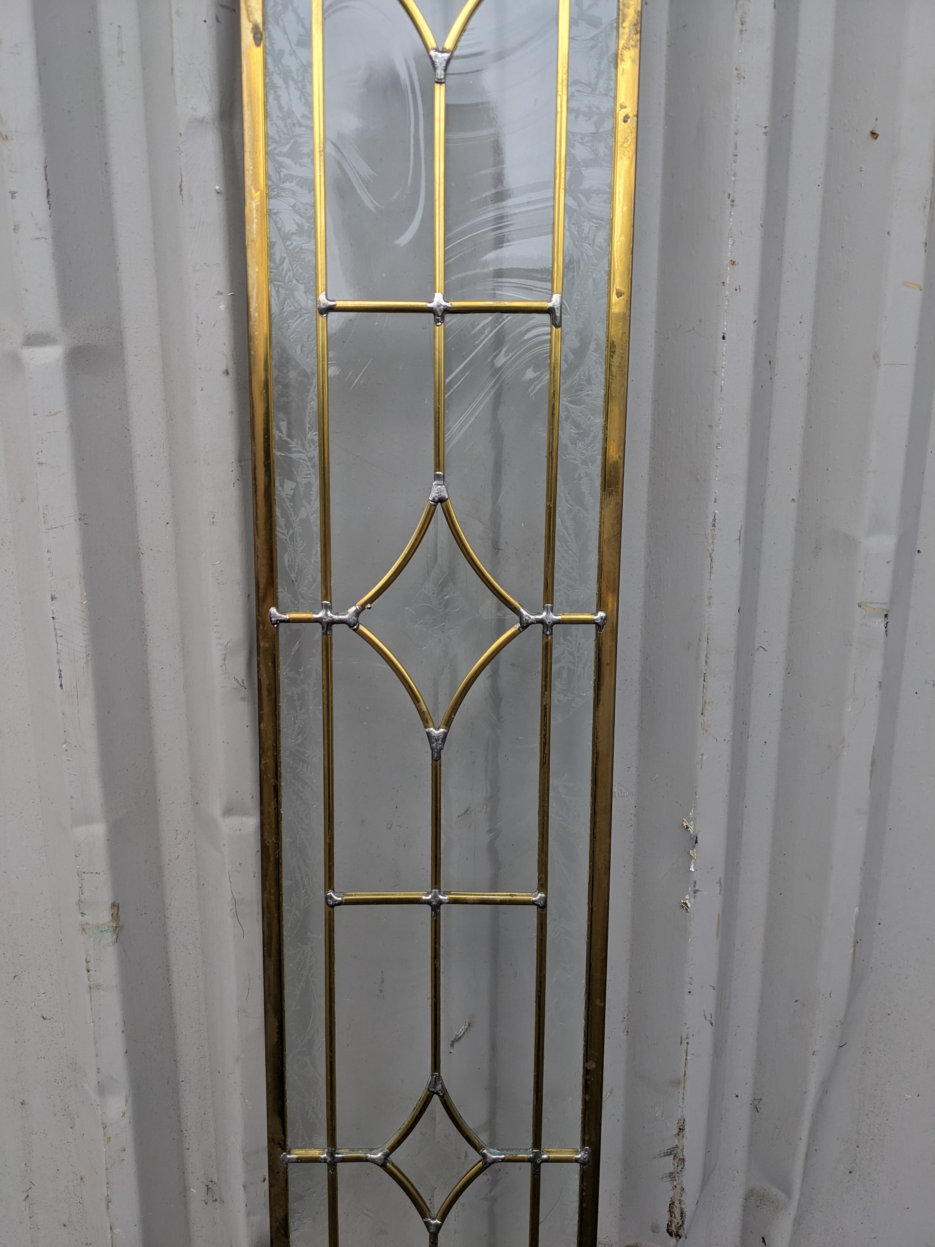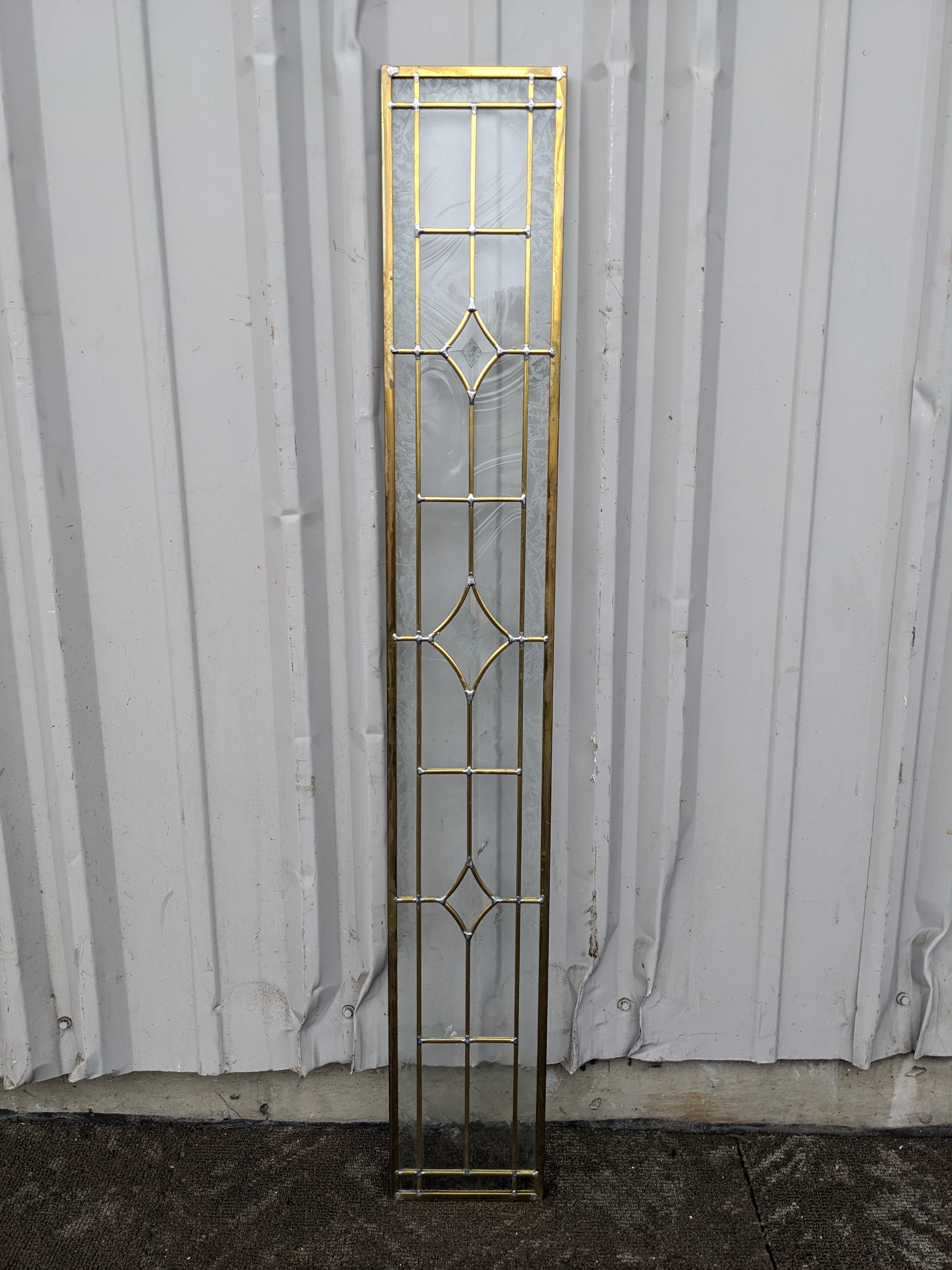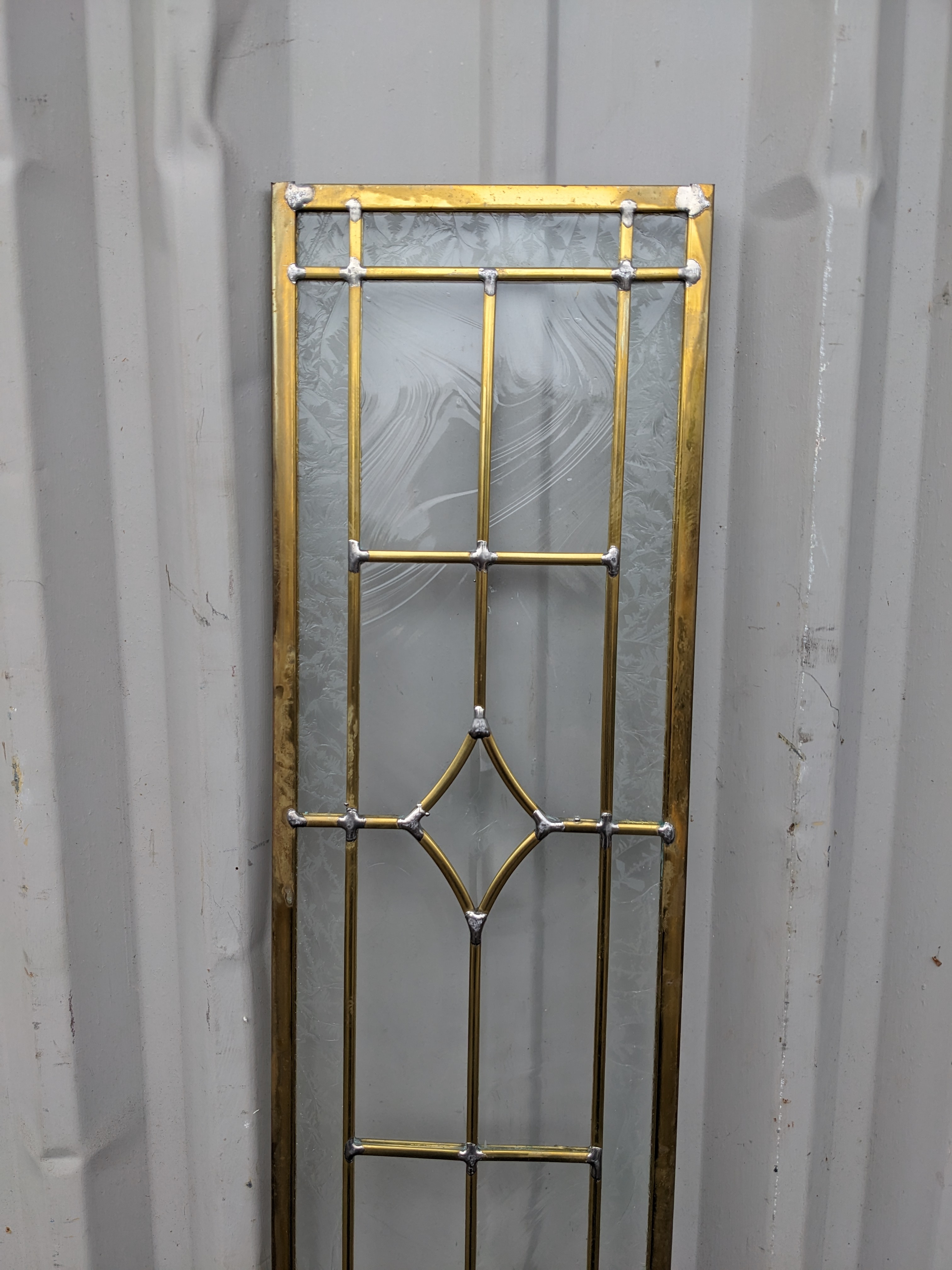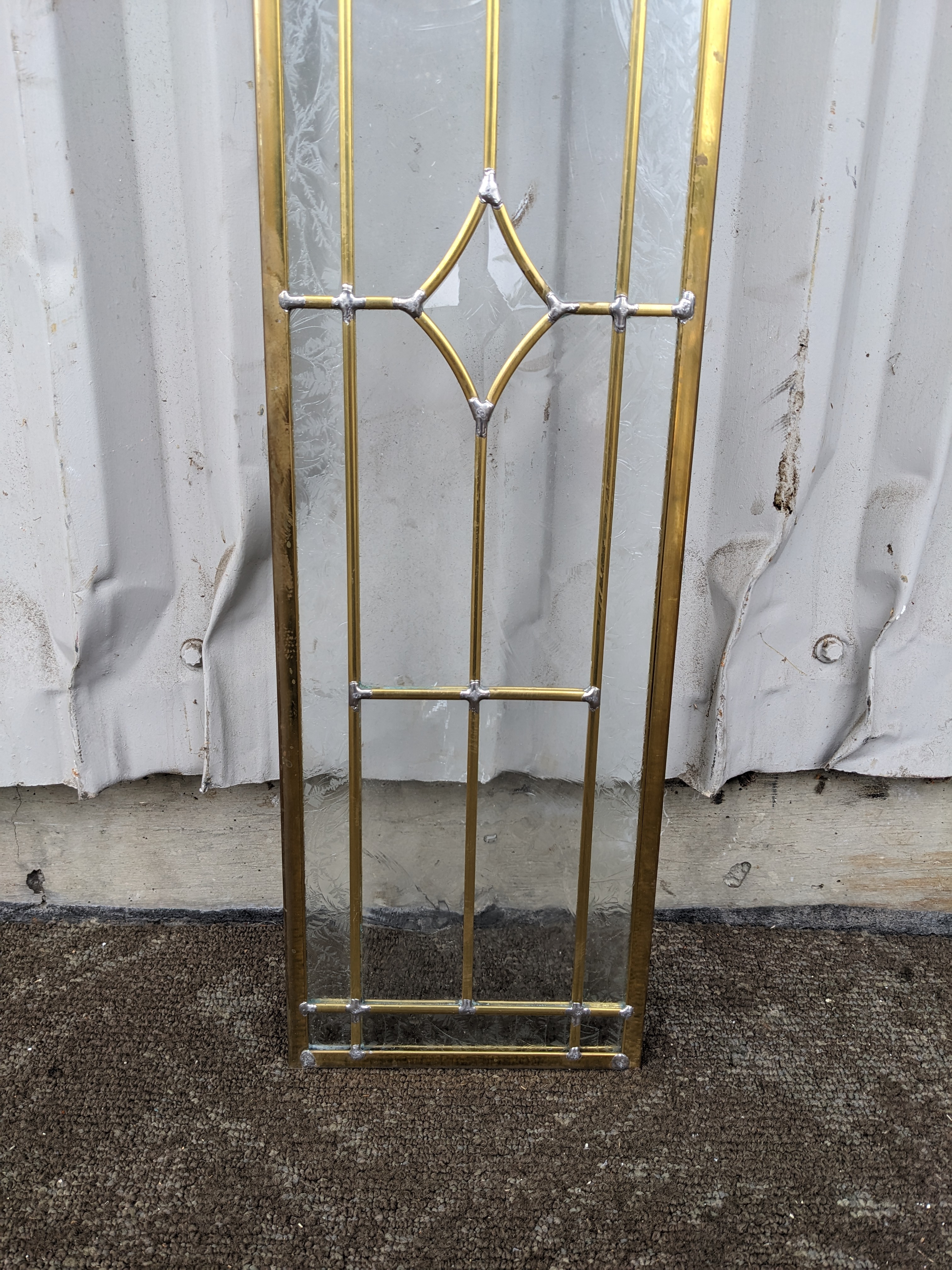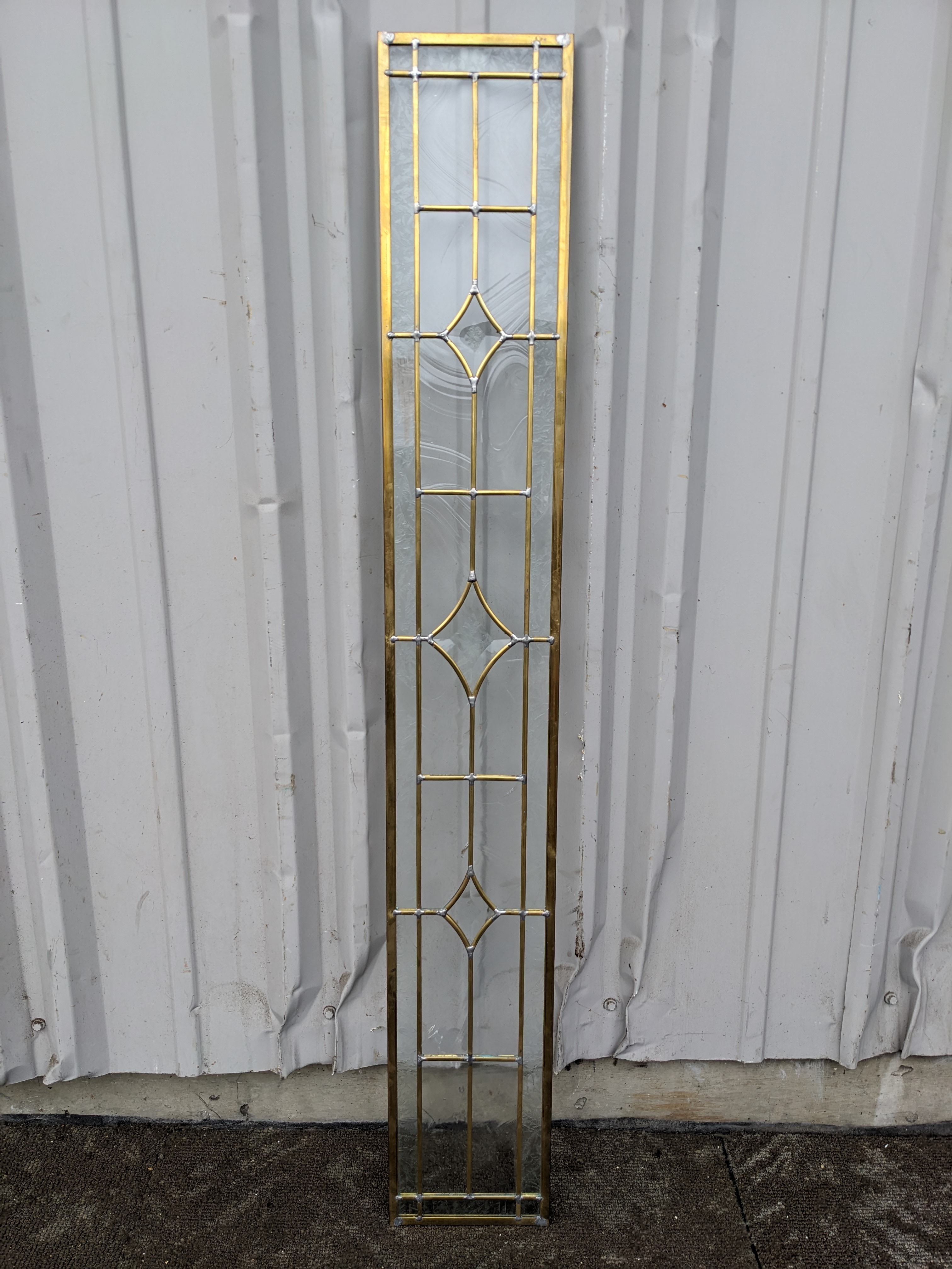 Lovely beveled leaded glass piece in great condition. Overall has a brass/gold patina but this has rubbed off somewhat on the frame, and silver toned lead solder is visible at joints. Photos are representative, individual units may vary.