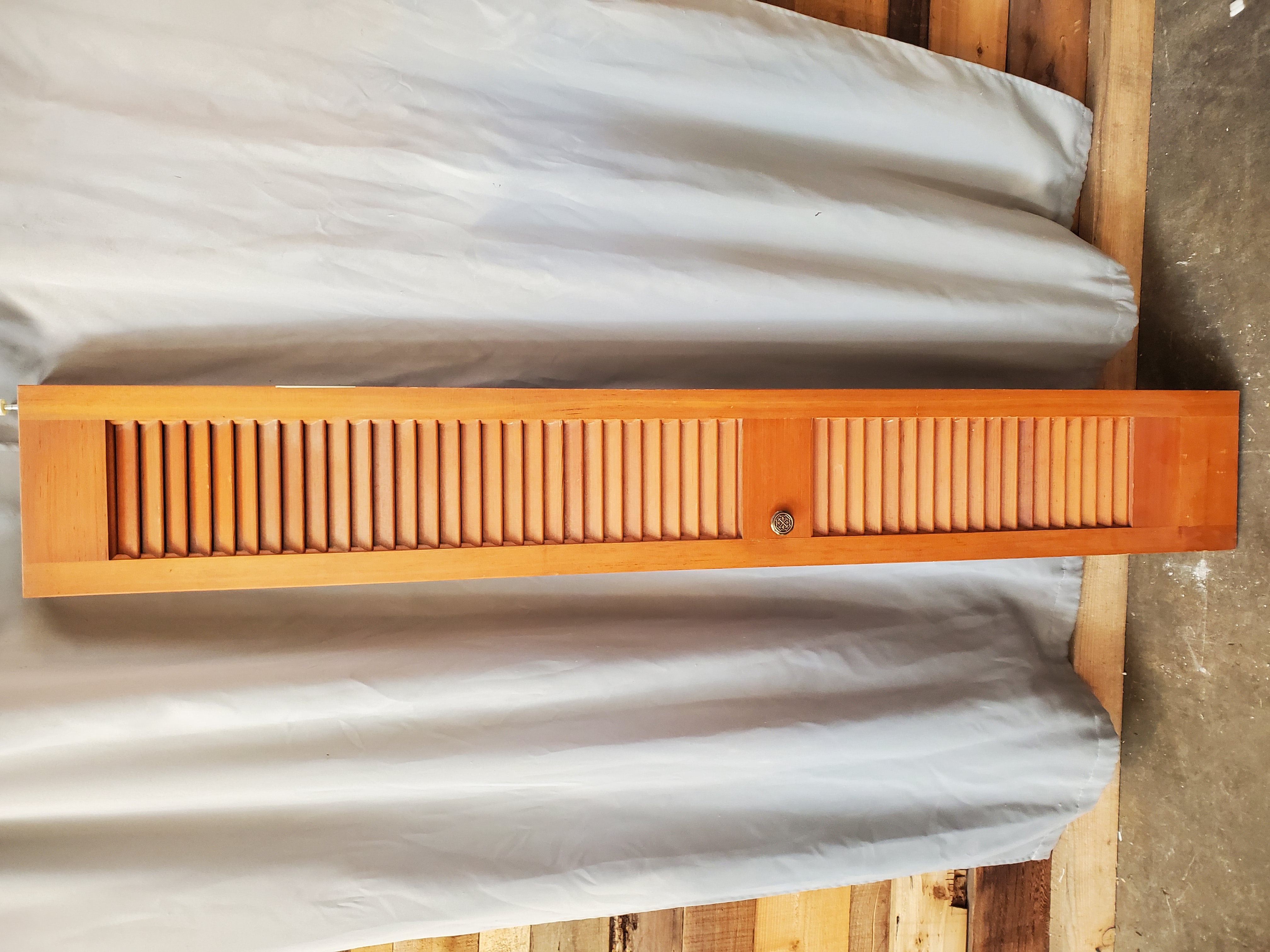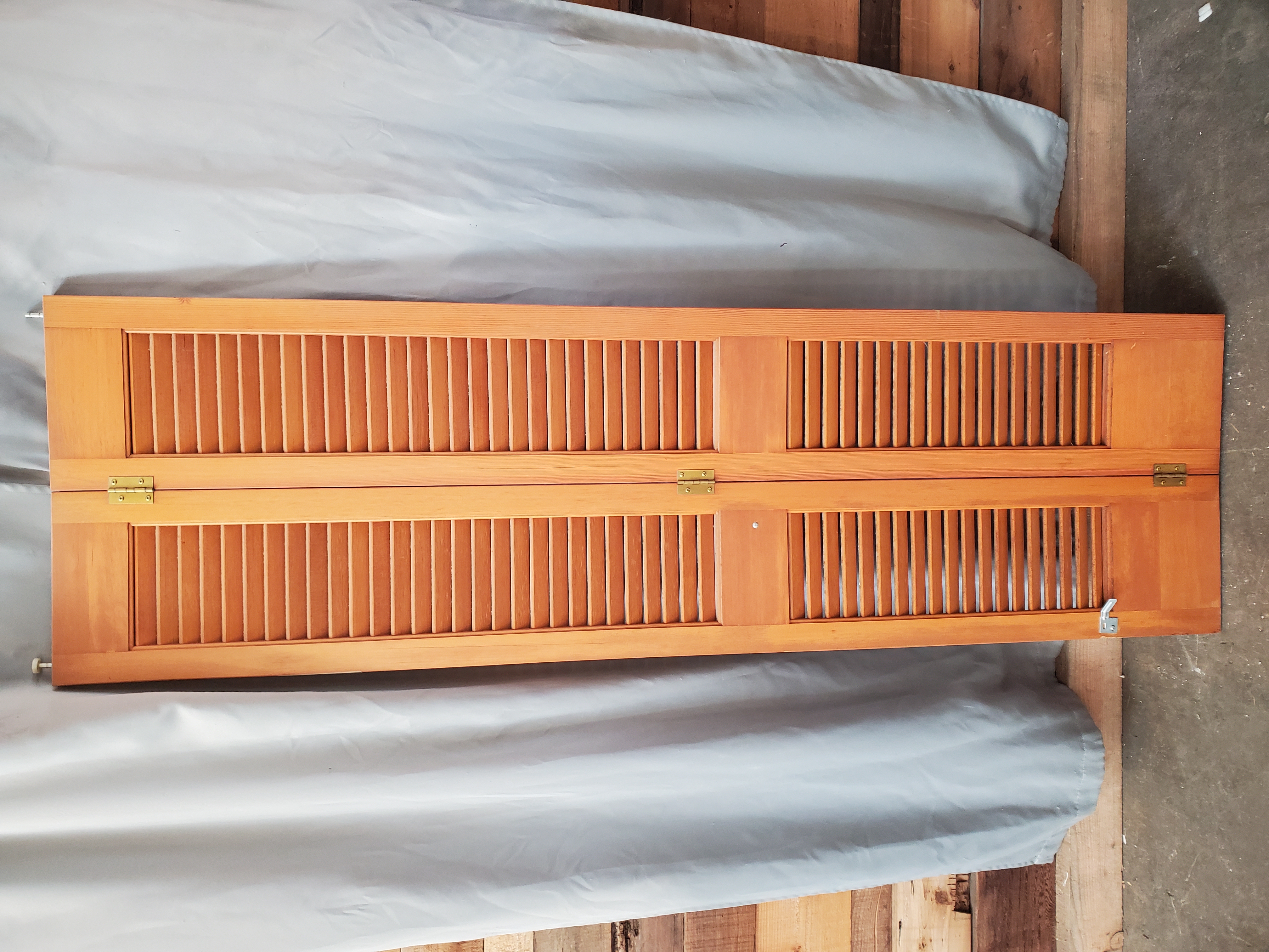 Unpainted wood louvered bi fold door.