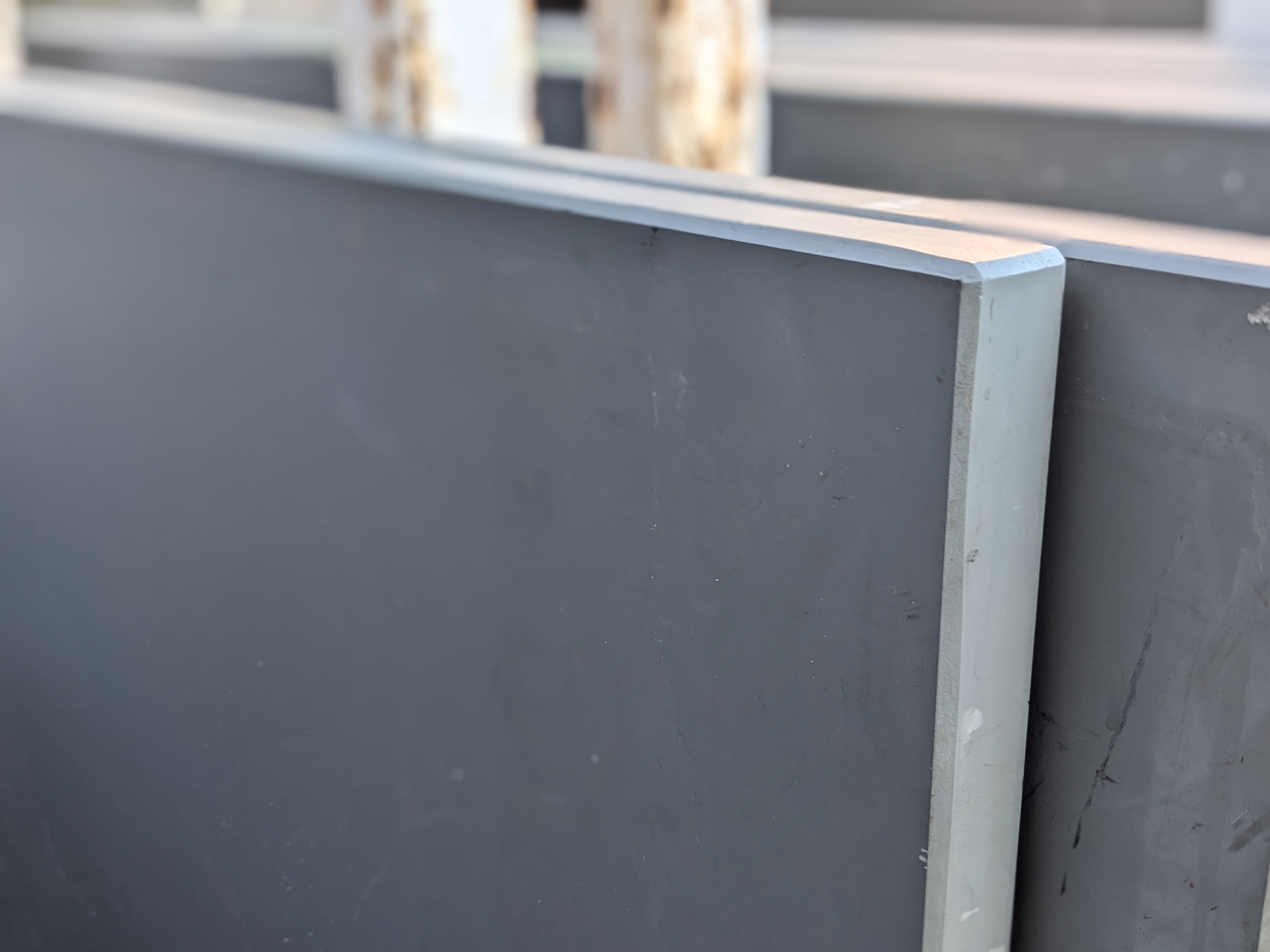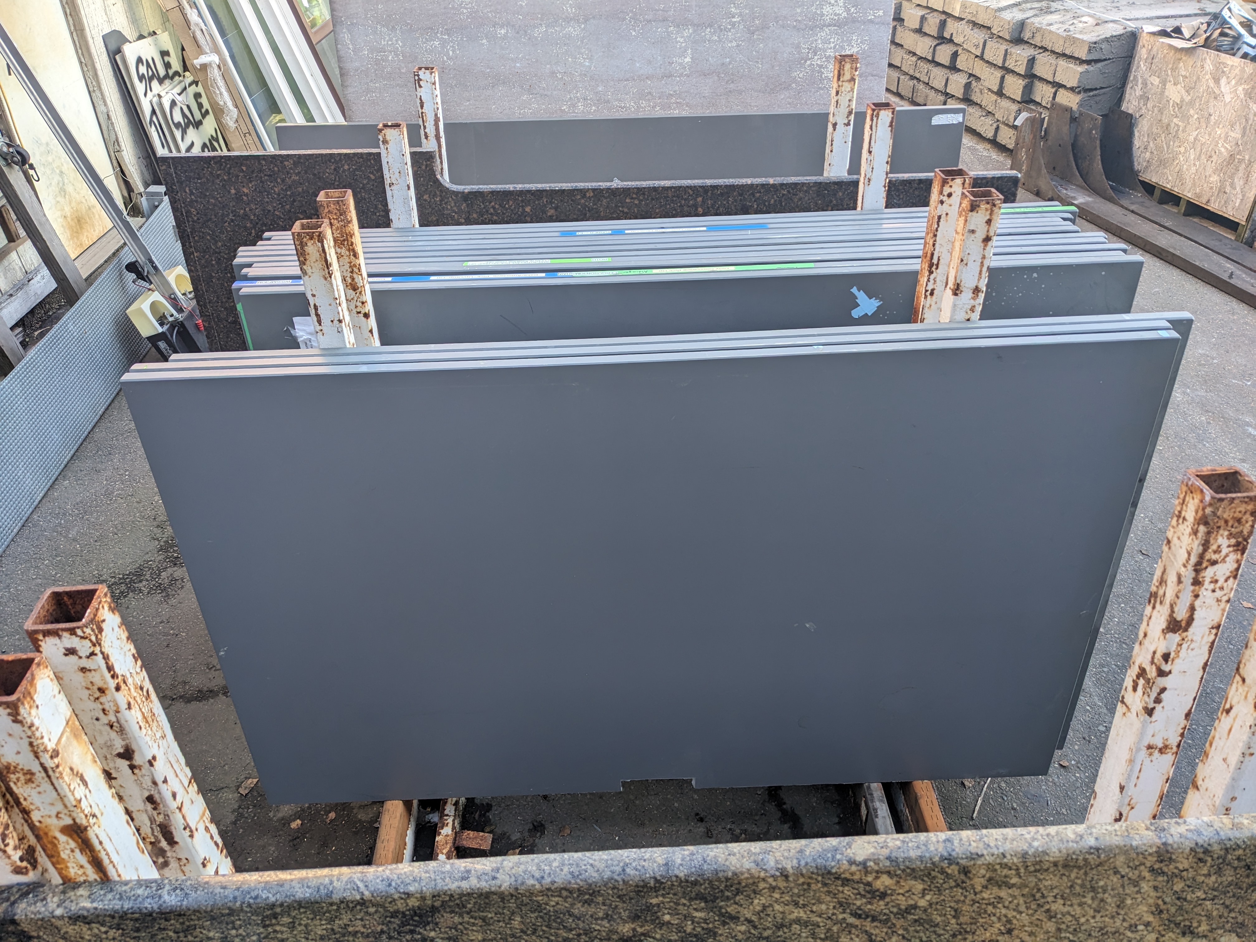 These lab countertops are heat, scratch, and chemical resistant. Perfect for a shop, or modern industrial kitchen with the medium grey color. They should cut using a standard circular saw with a carbide blade or a router.