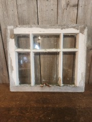 This vintage window is divided into eight panes, all in good condition. The frame is old wood and has been painted white on both sides. One side of the frame has some splintering around the edge.