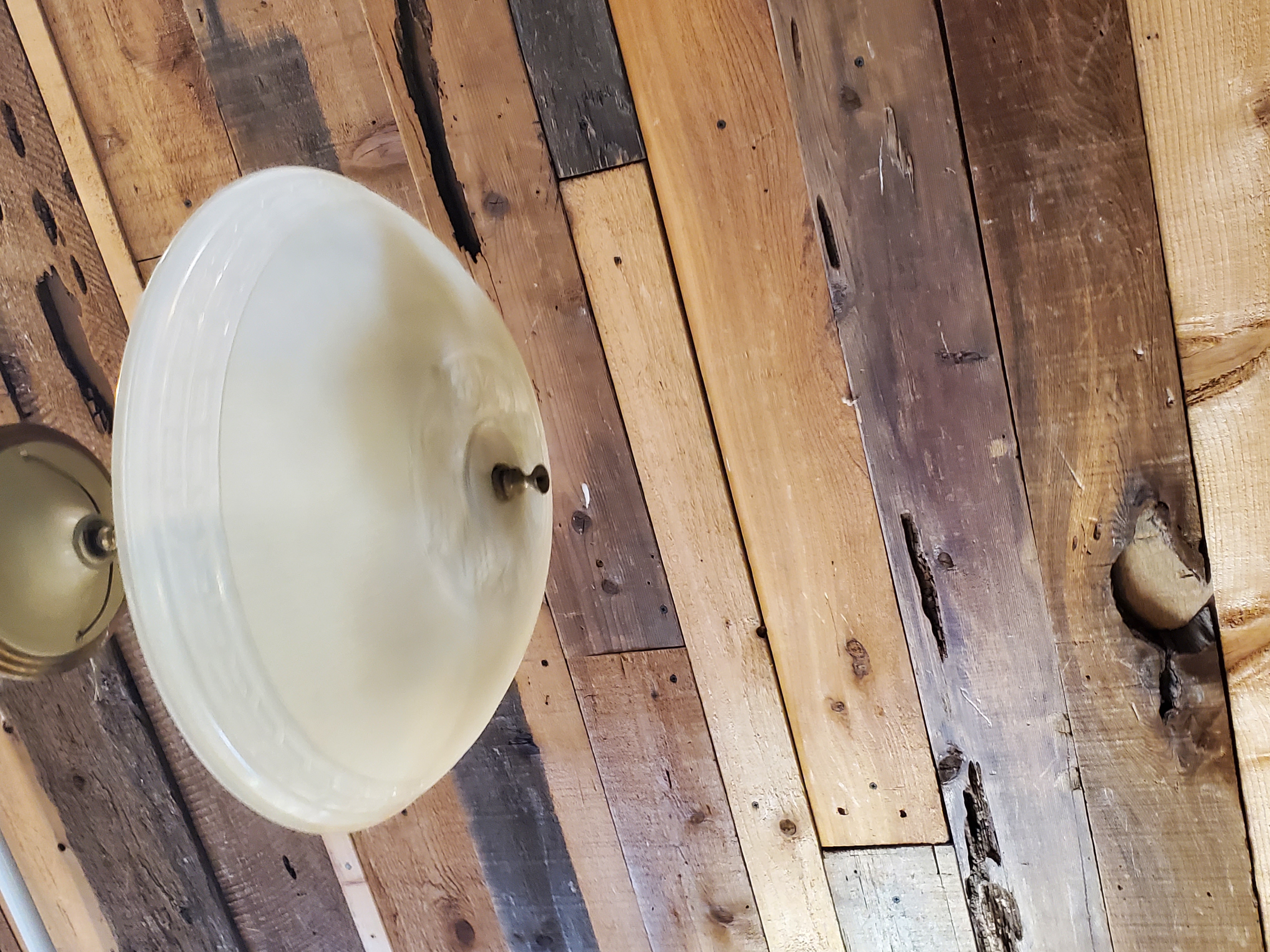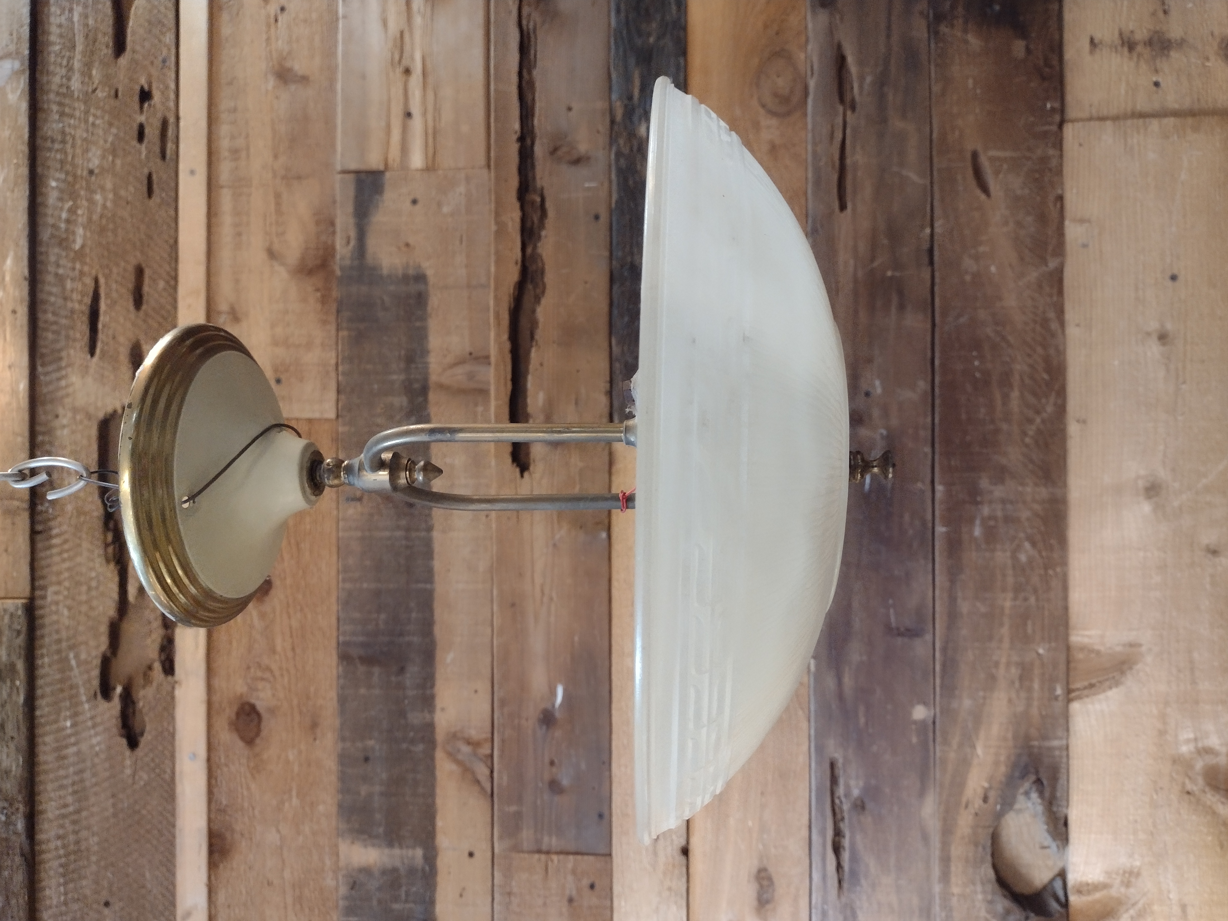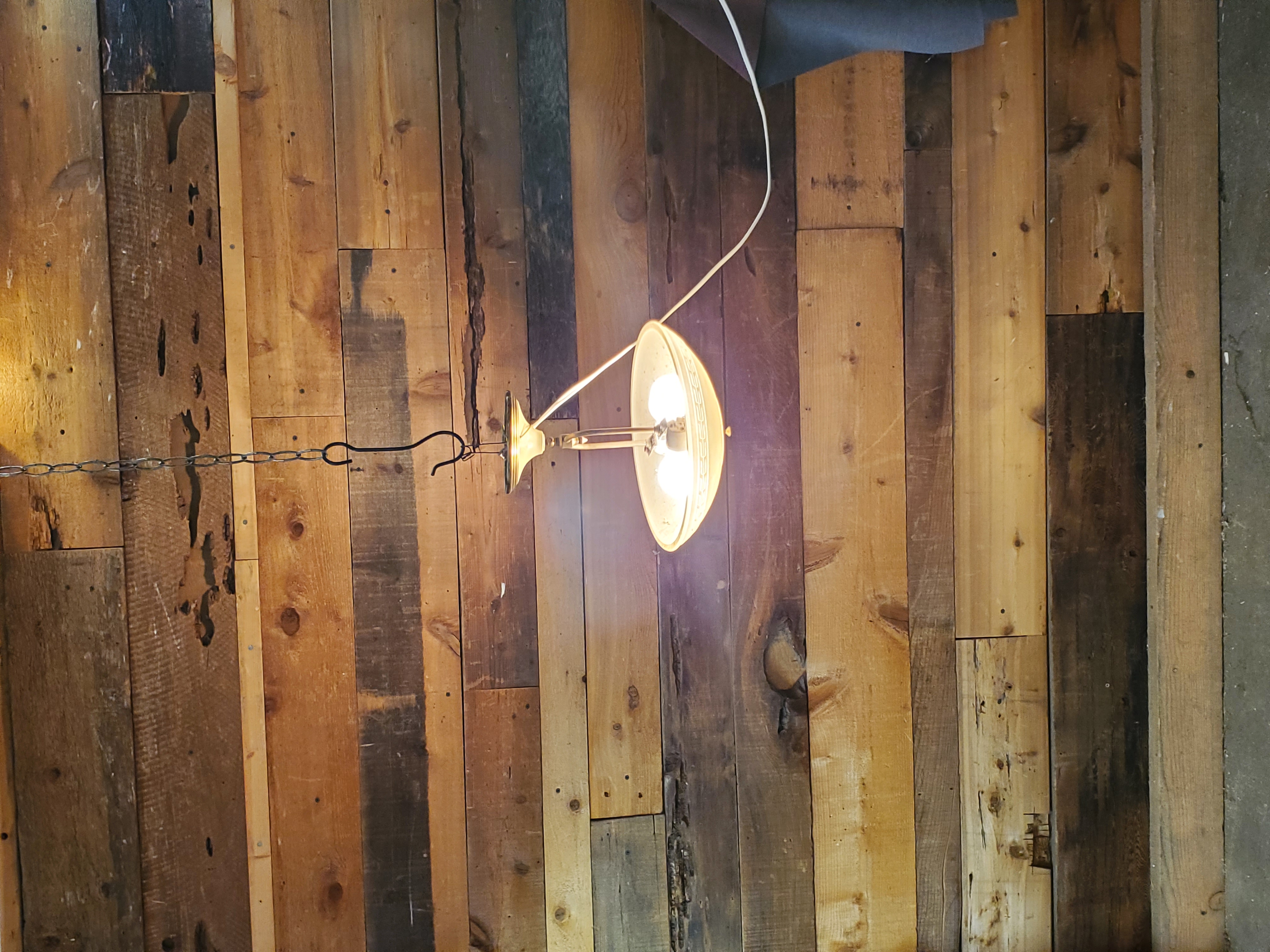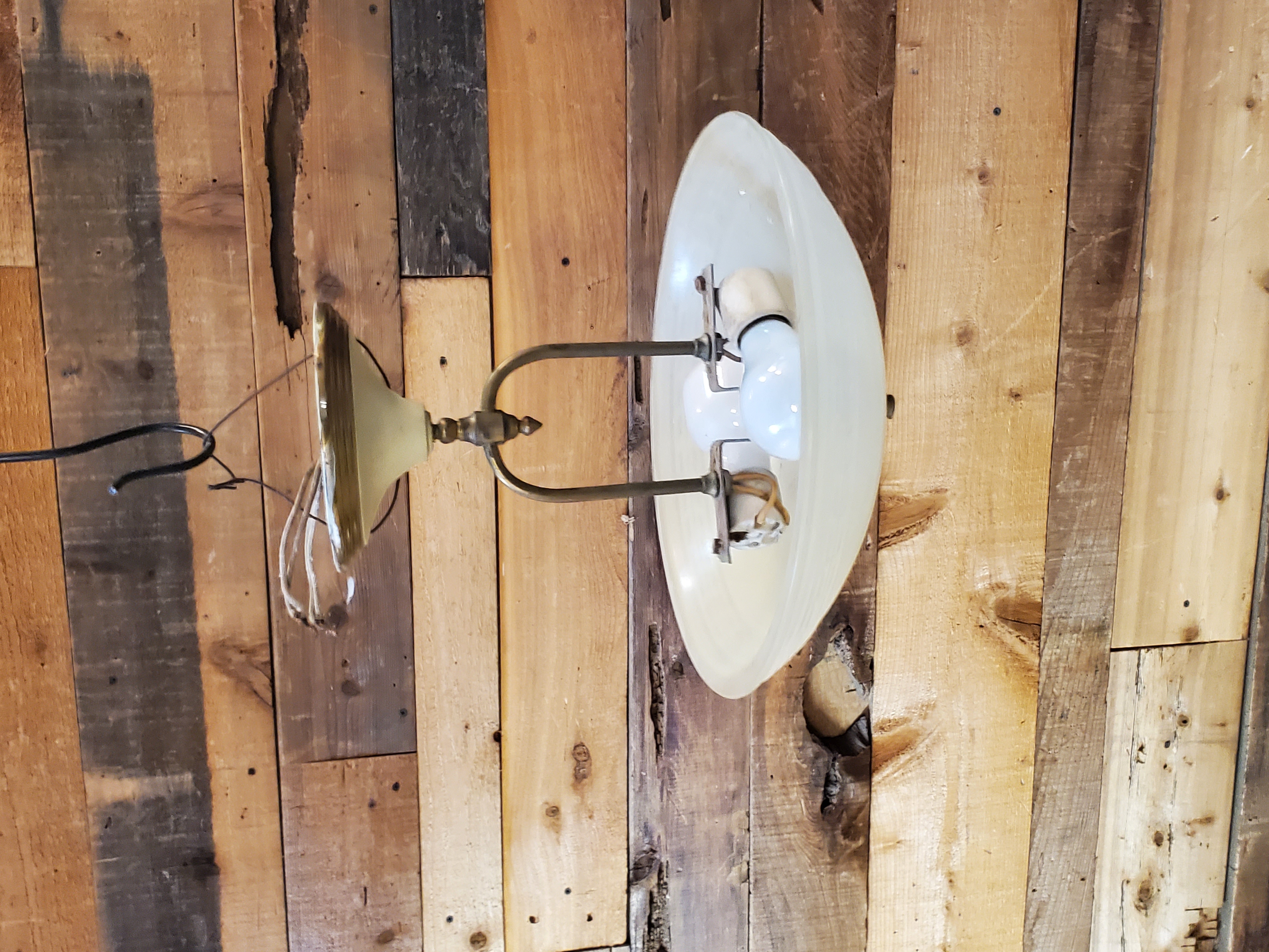There are no scratches or marks on this Light. All of the wiring is still good. It takes the standard lightbulb. Could use a good clean. It is also missing its finial piece on the bottom.