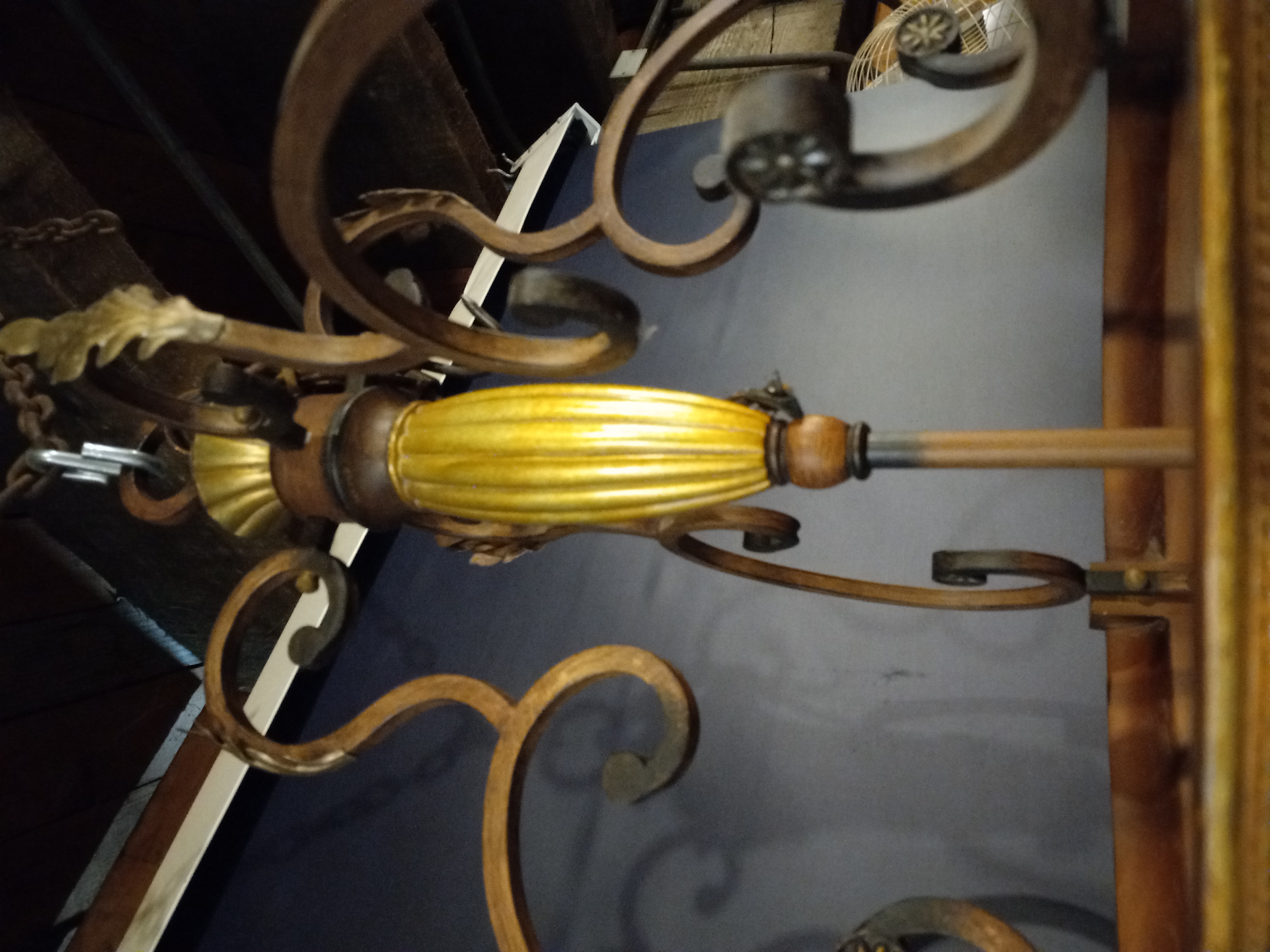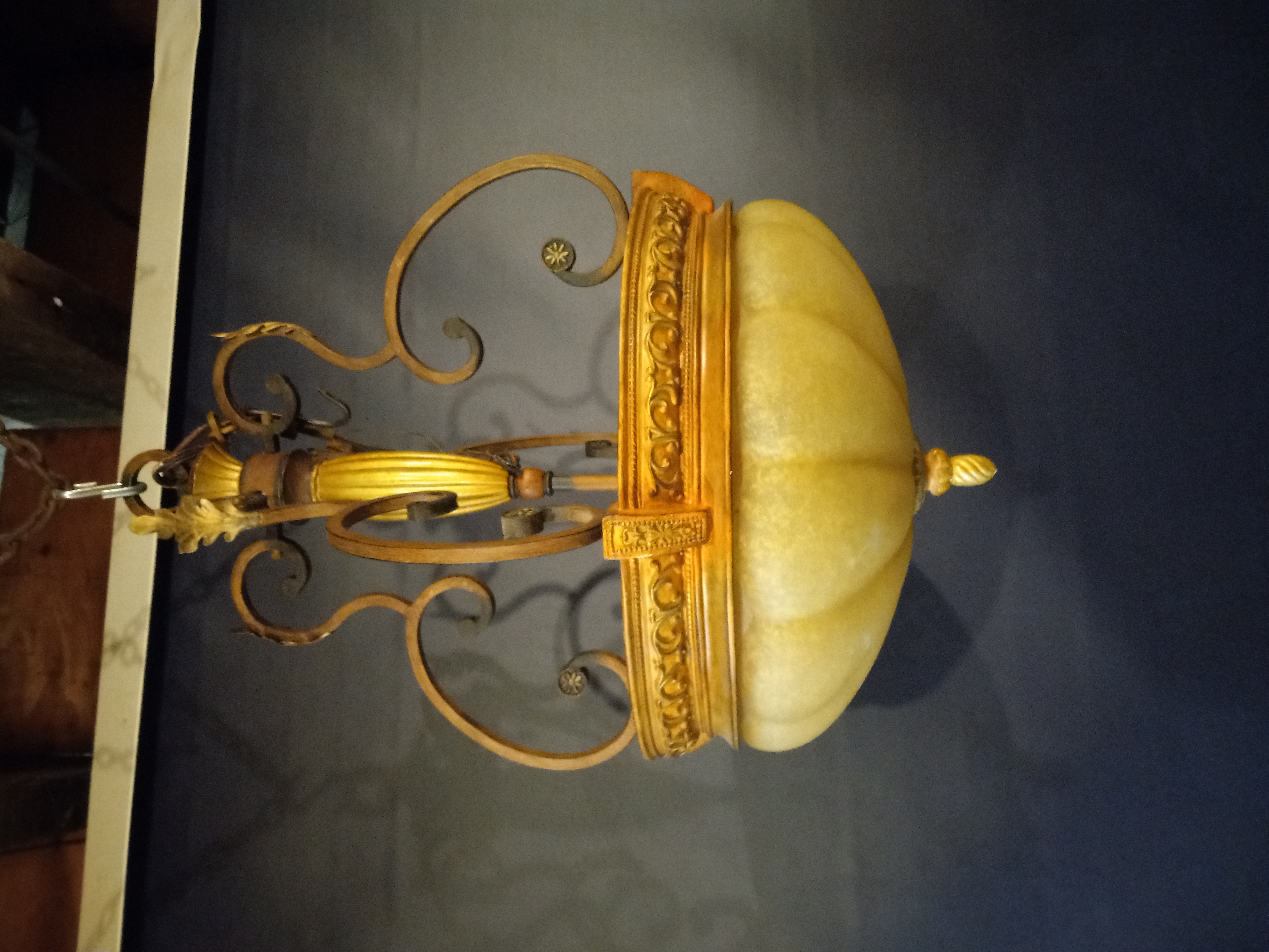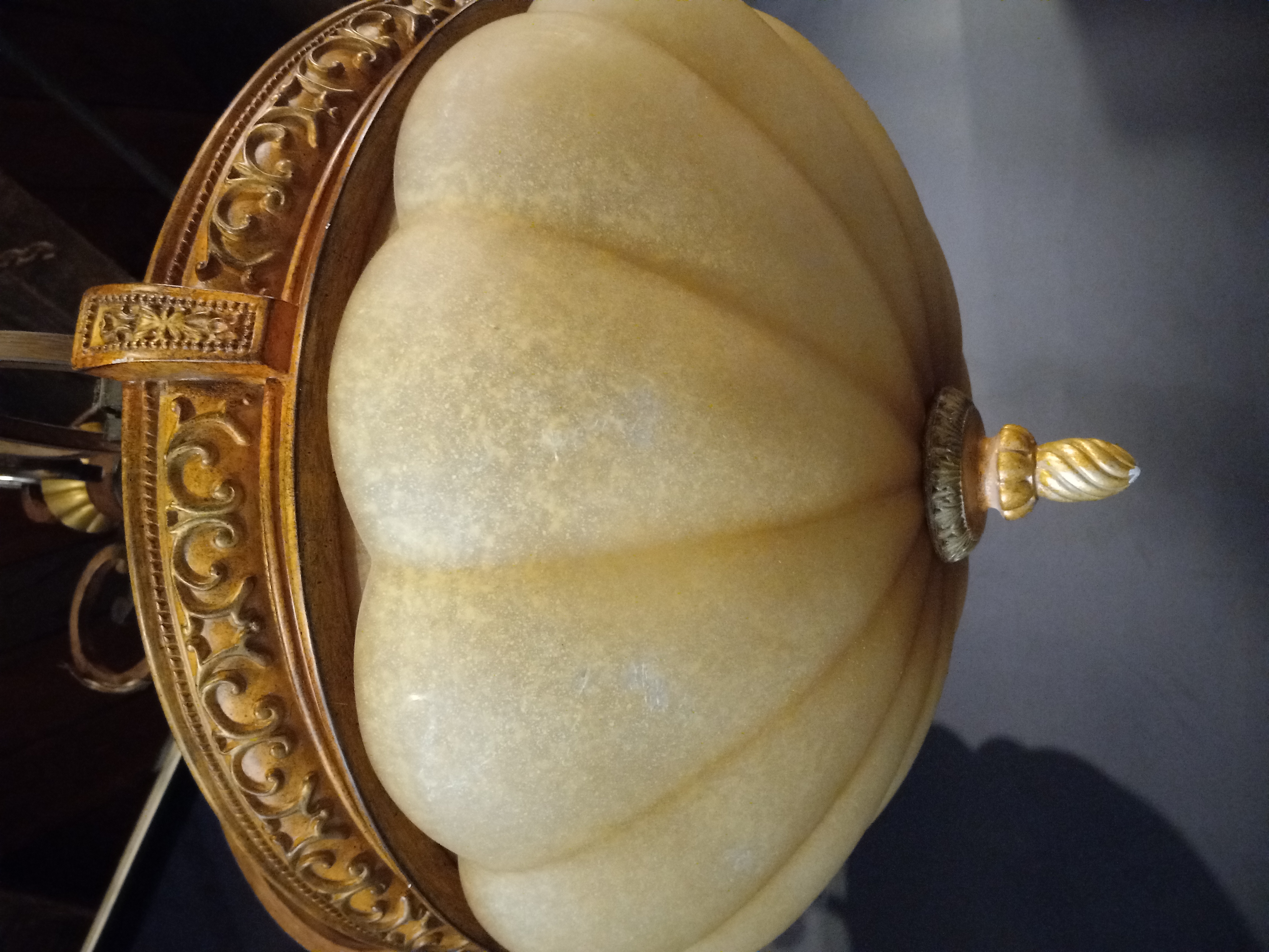 This 3 light steel pendant light fixture has a painted walnut finish and a scalloped glass shade. Measures 18.25 inches in diameter and hangs roughly 26 inches from the hook.