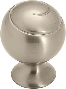 Amerock Hardware SwirlZ Collection ball cabinet knob with a spiral design. In a satin nickel finish. Made of zinc. This is all unopened old (discontinued) stock still in the packaging. Comes with mounting screw. Price is for one knob.