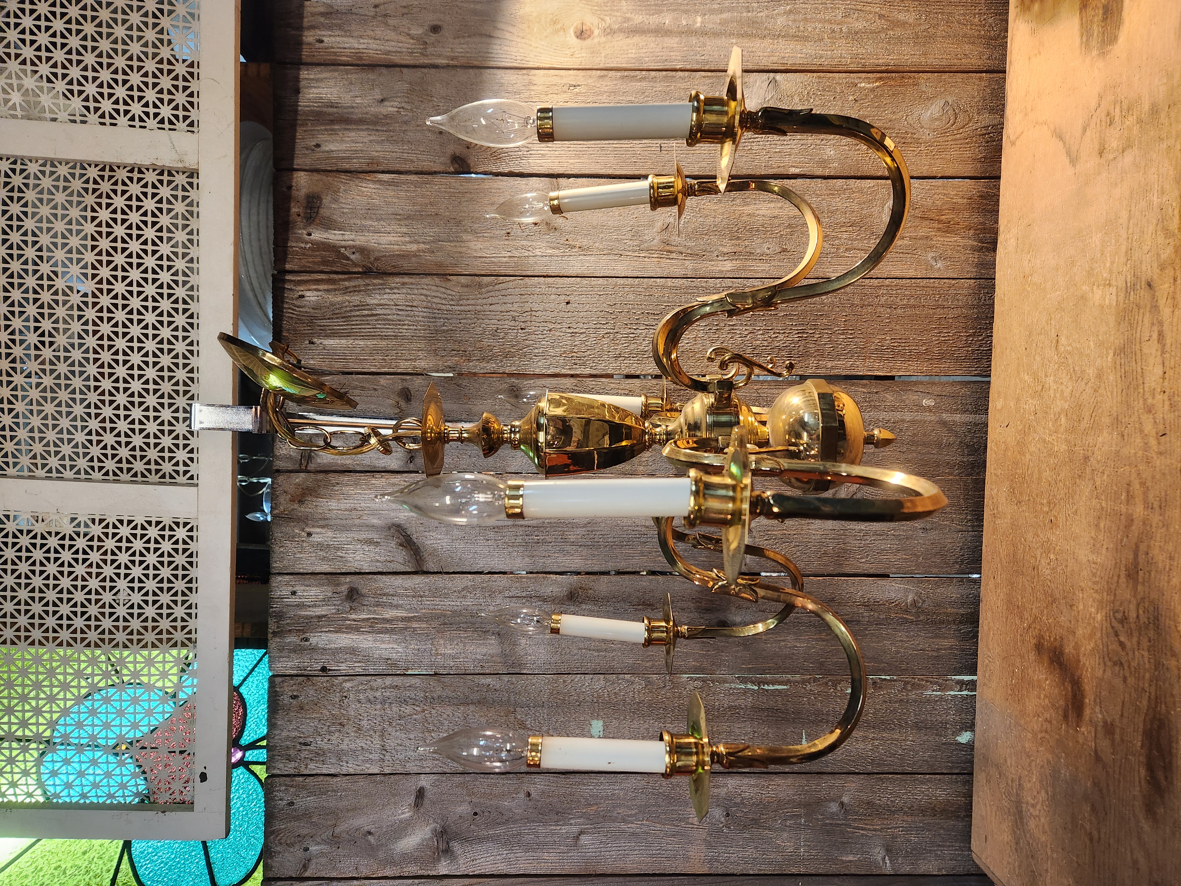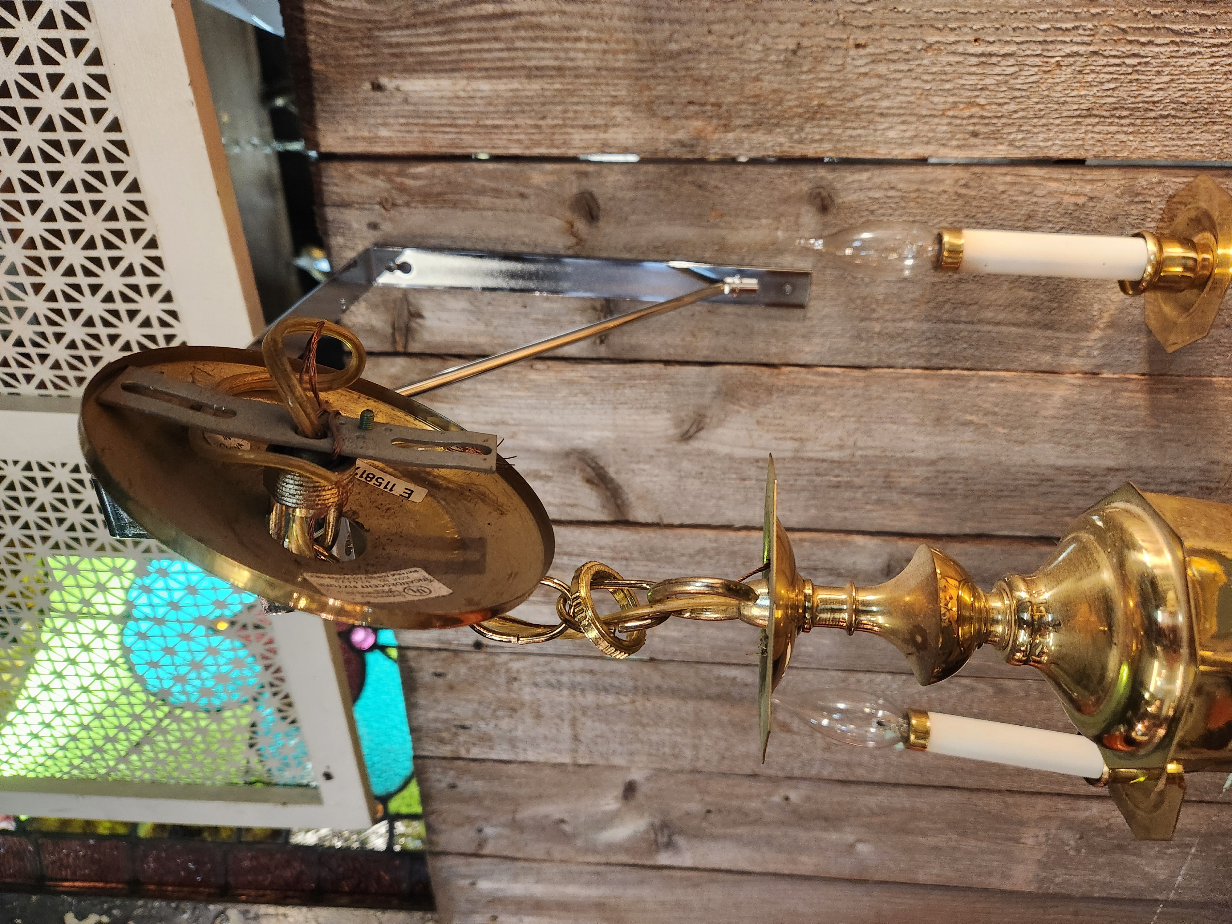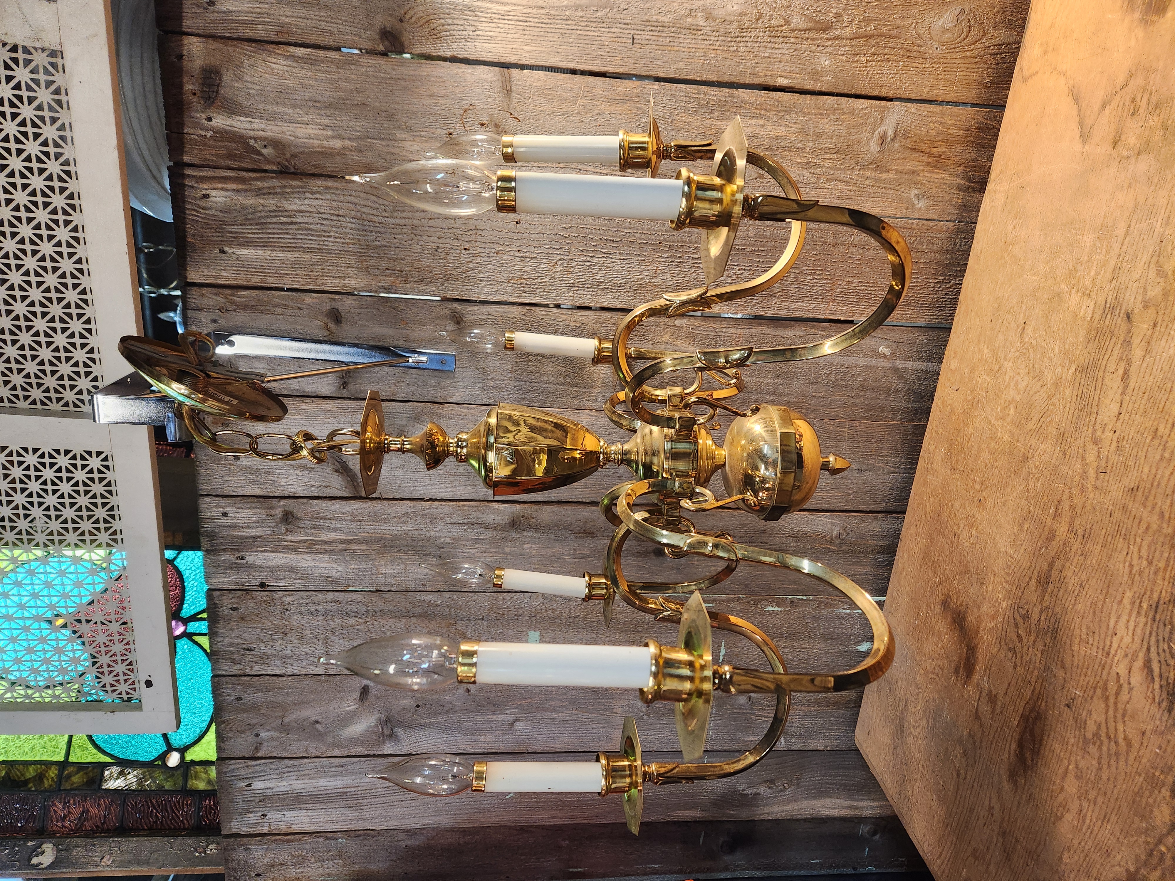 Brass chandelier that's in fair condition.