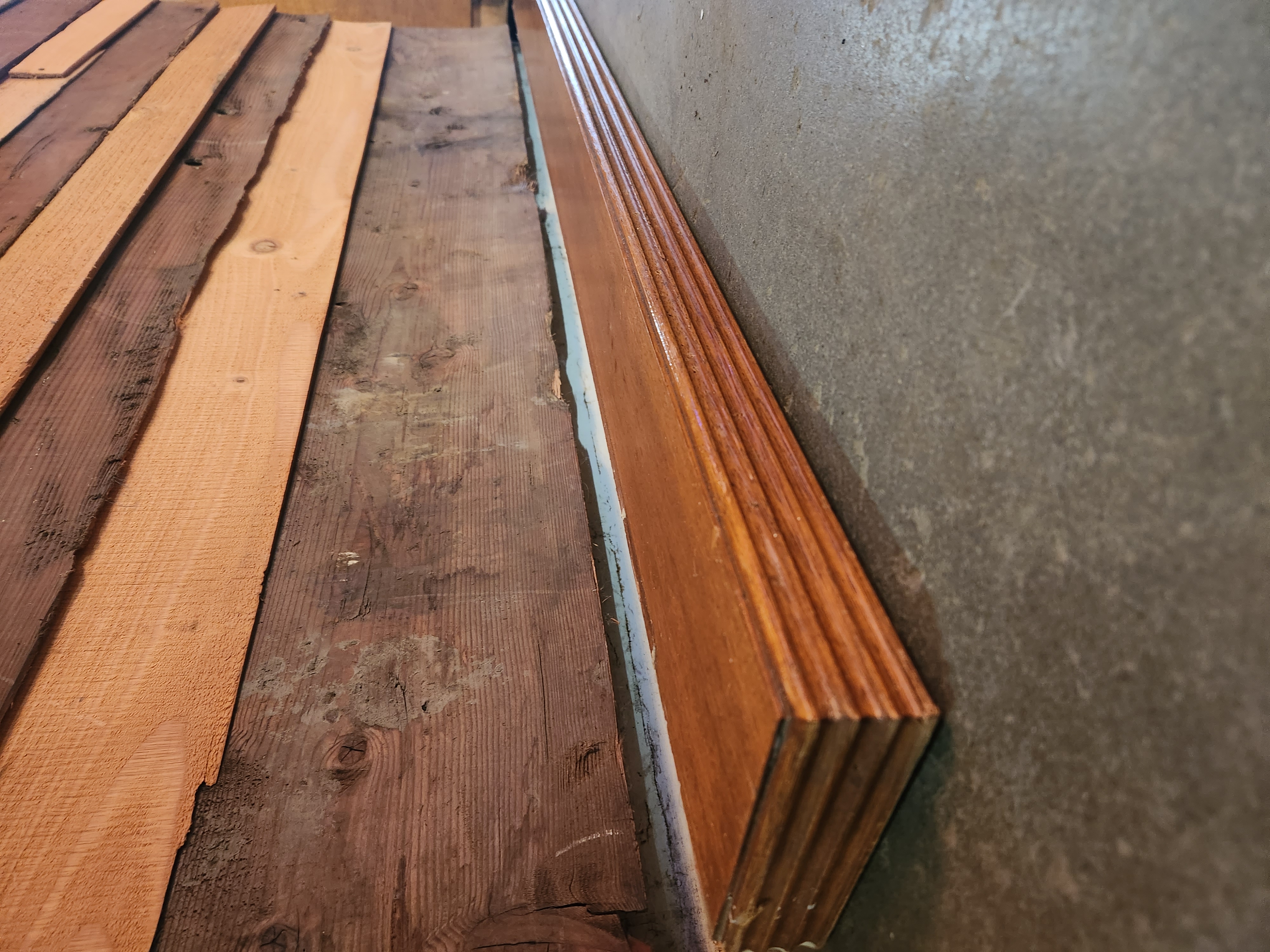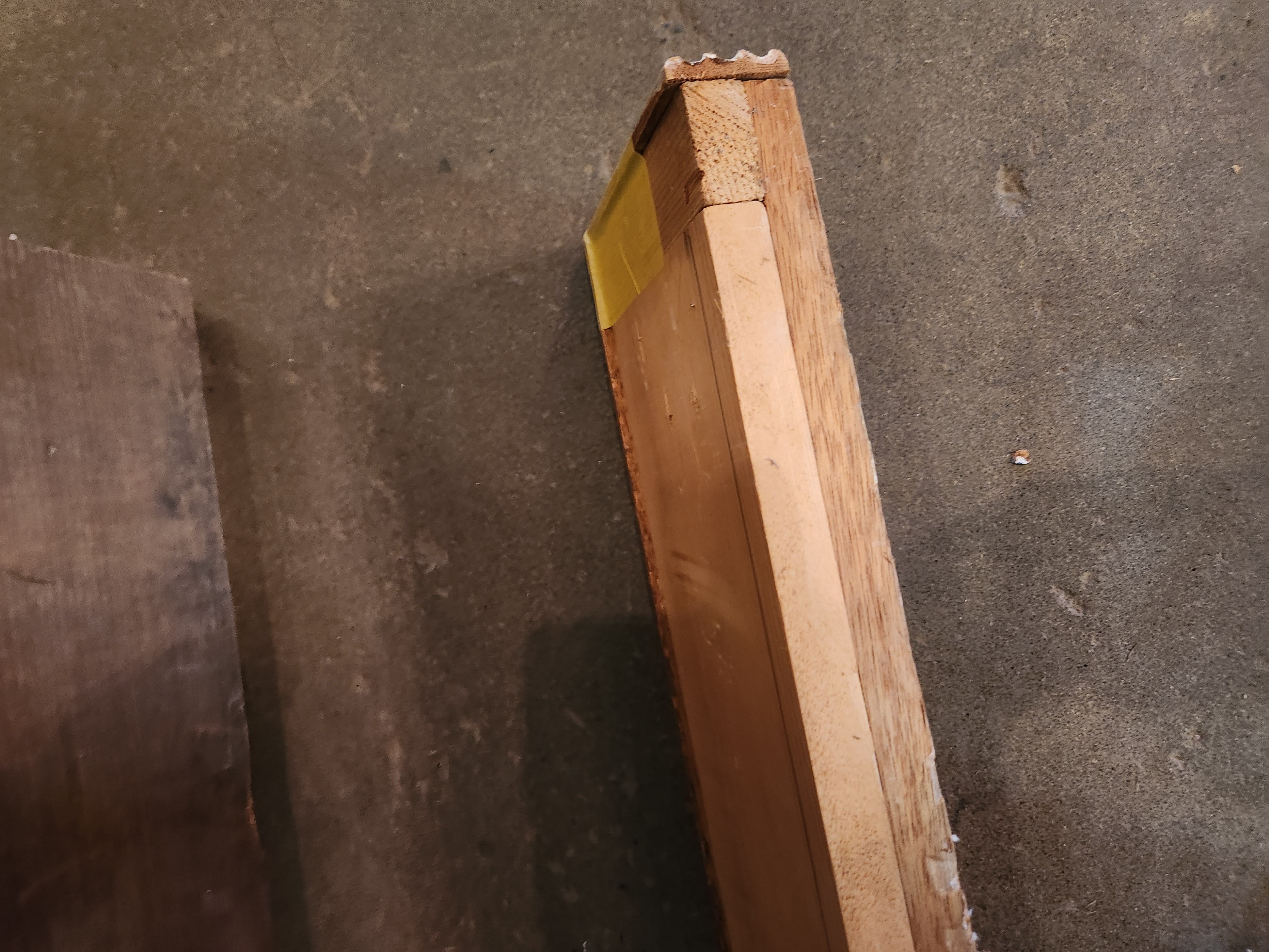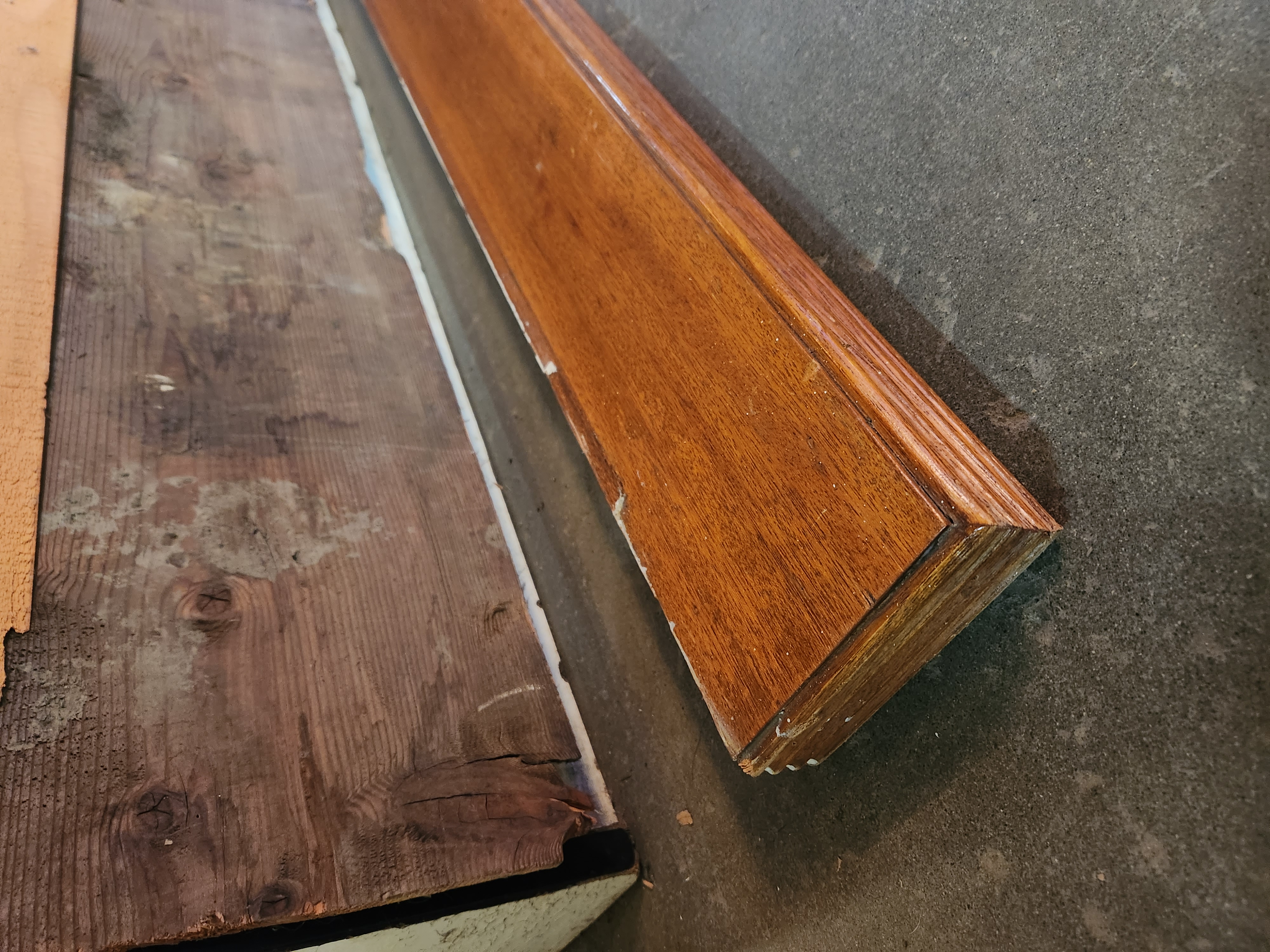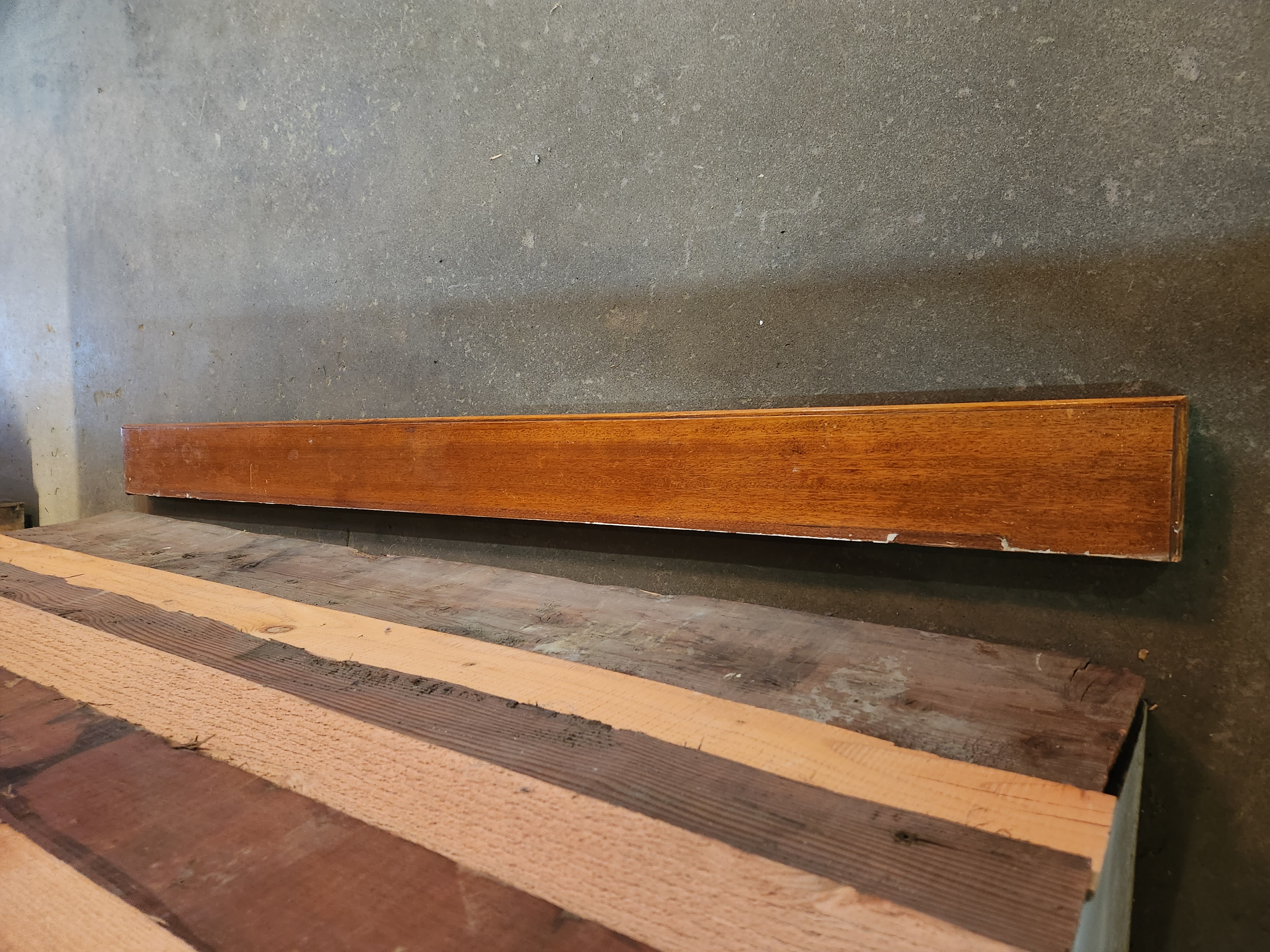 Fireplace mantel that is solid mahogany on top and fir on the bottom. It could probably use a light sanding to freshen it up. One of the shorter trim pieces just needs to be resecured because it will fall off when you touch it.