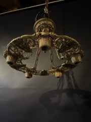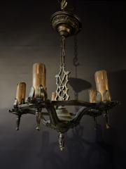 In good condition. It has all of it's crystals which are the 4" long spears with an oval bead at the top. There is some naturally occurring green patina on it. All we did was some dusting.