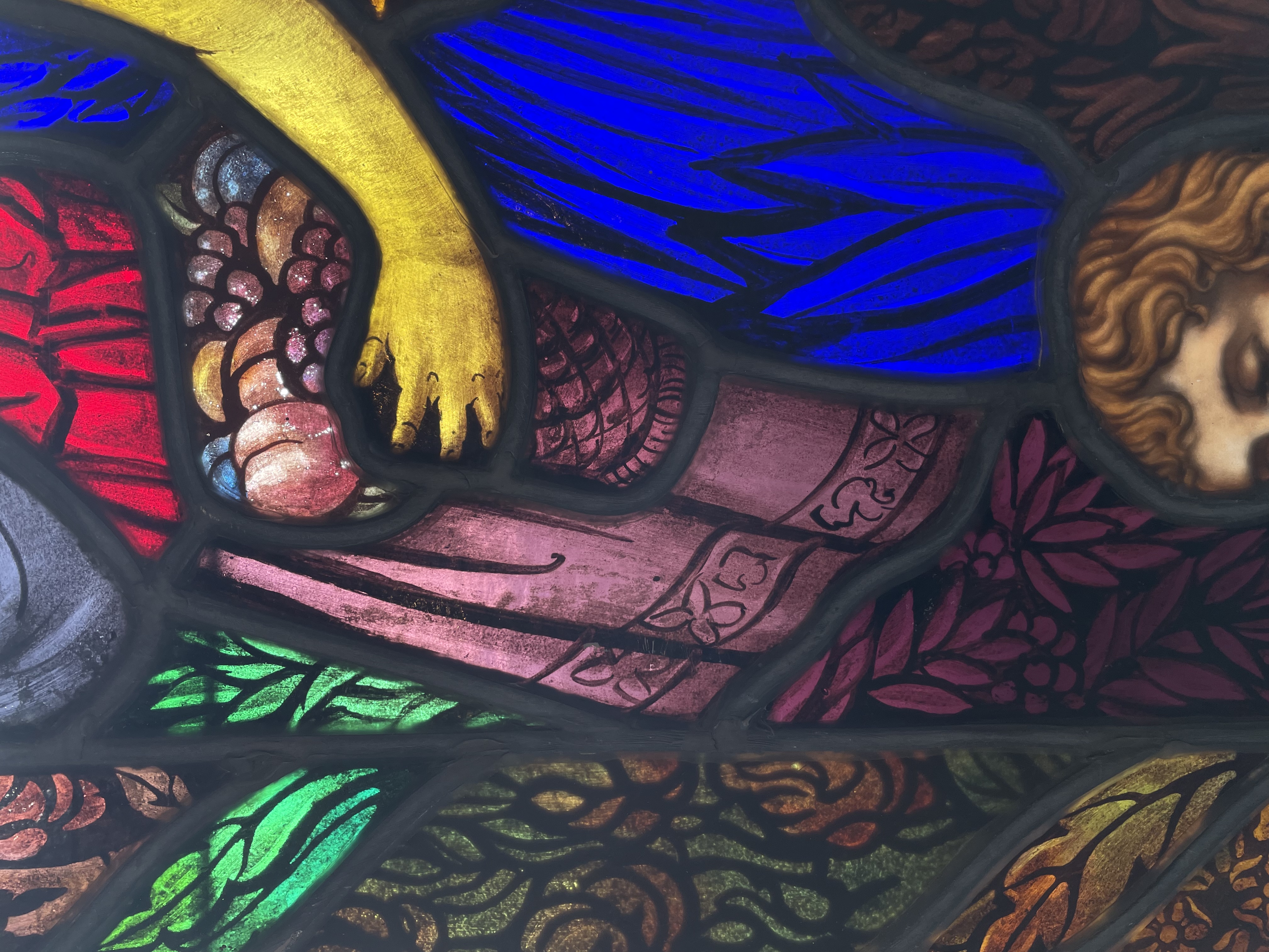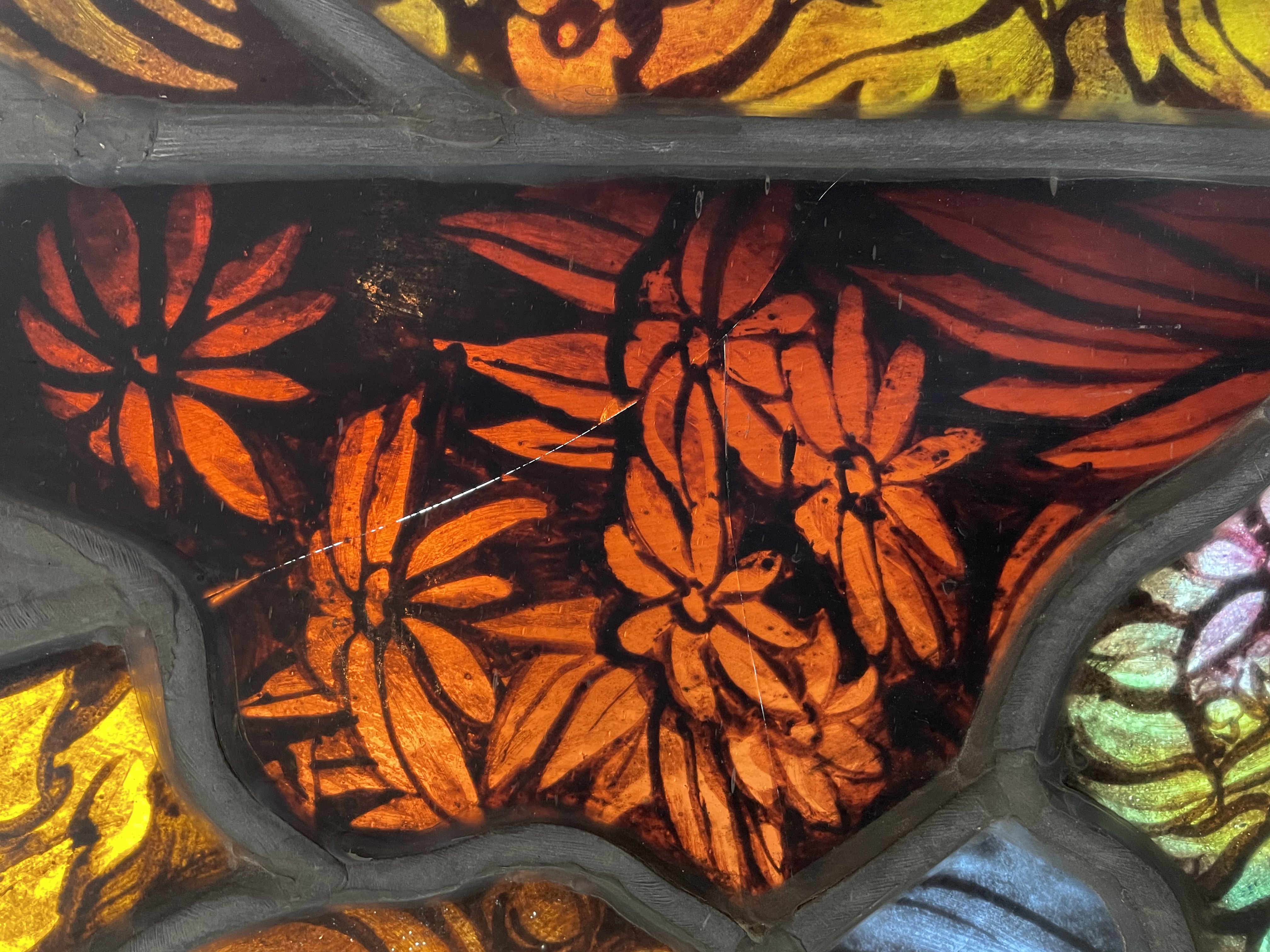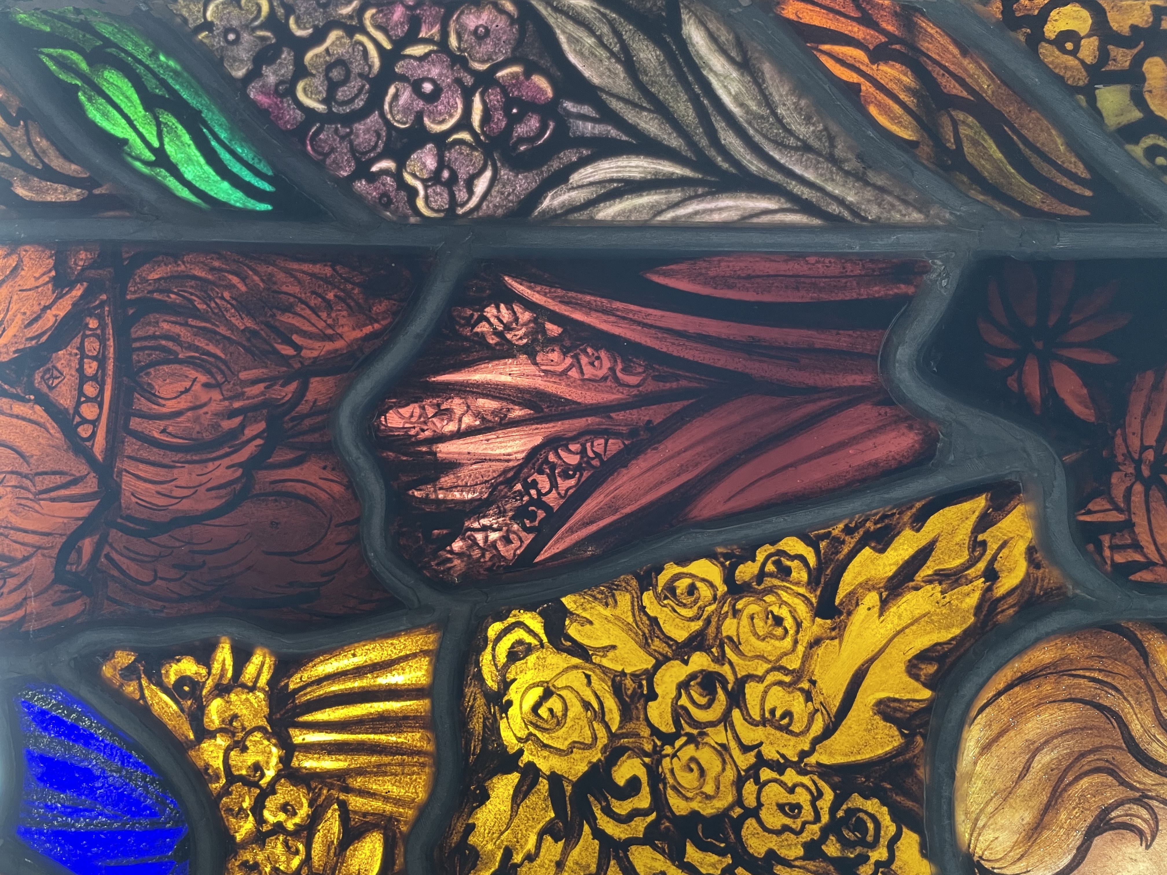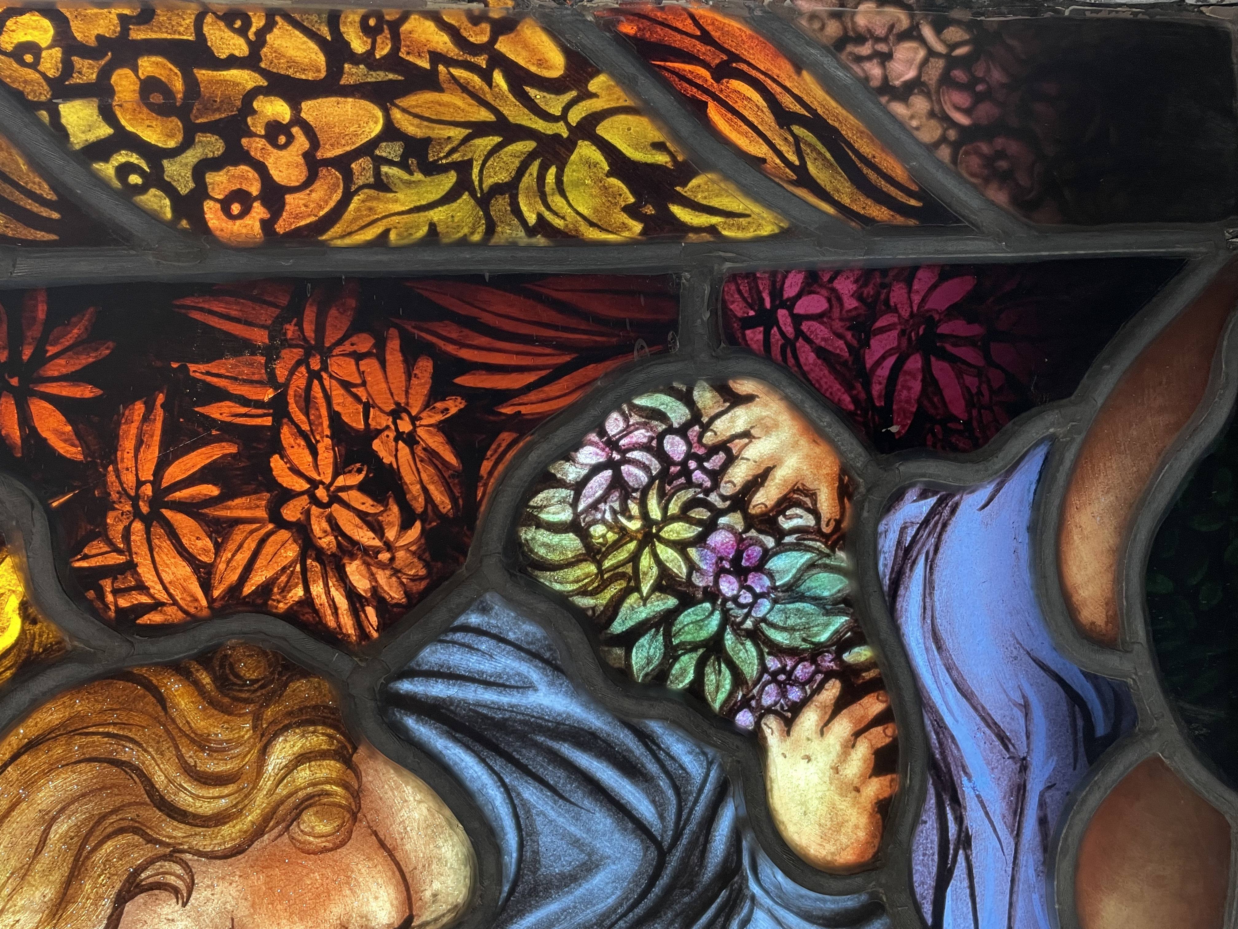 In good condition. This beautiful piece of hand painted stained glass, created by renowned stained glass artist, Anthony Rez, was removed from the University Methodist Temple in the University District (circa 1925). This window depicts two children surrounded by a bountiful background of plants and flowers. Only two small hairline cracks, see photos.