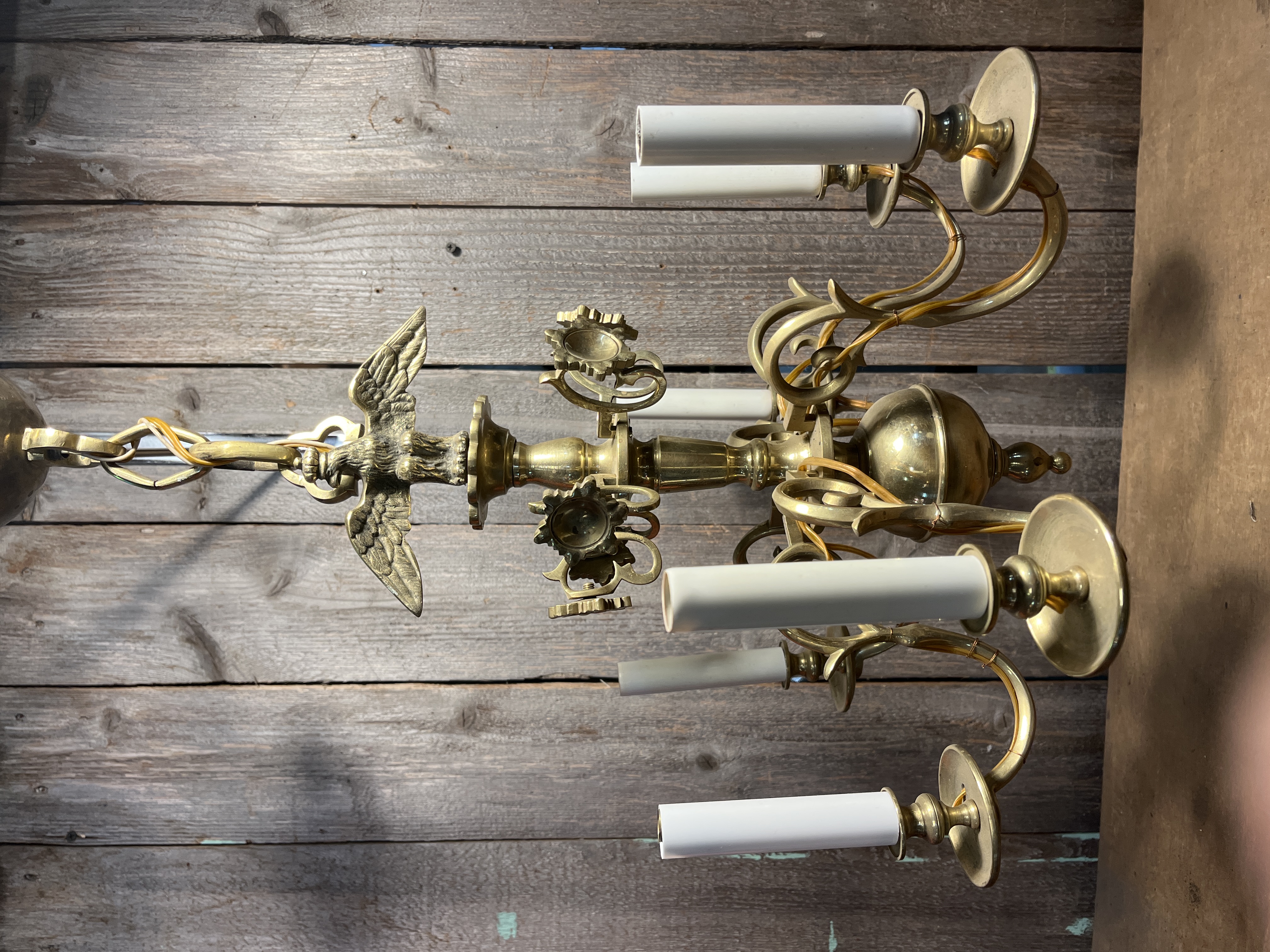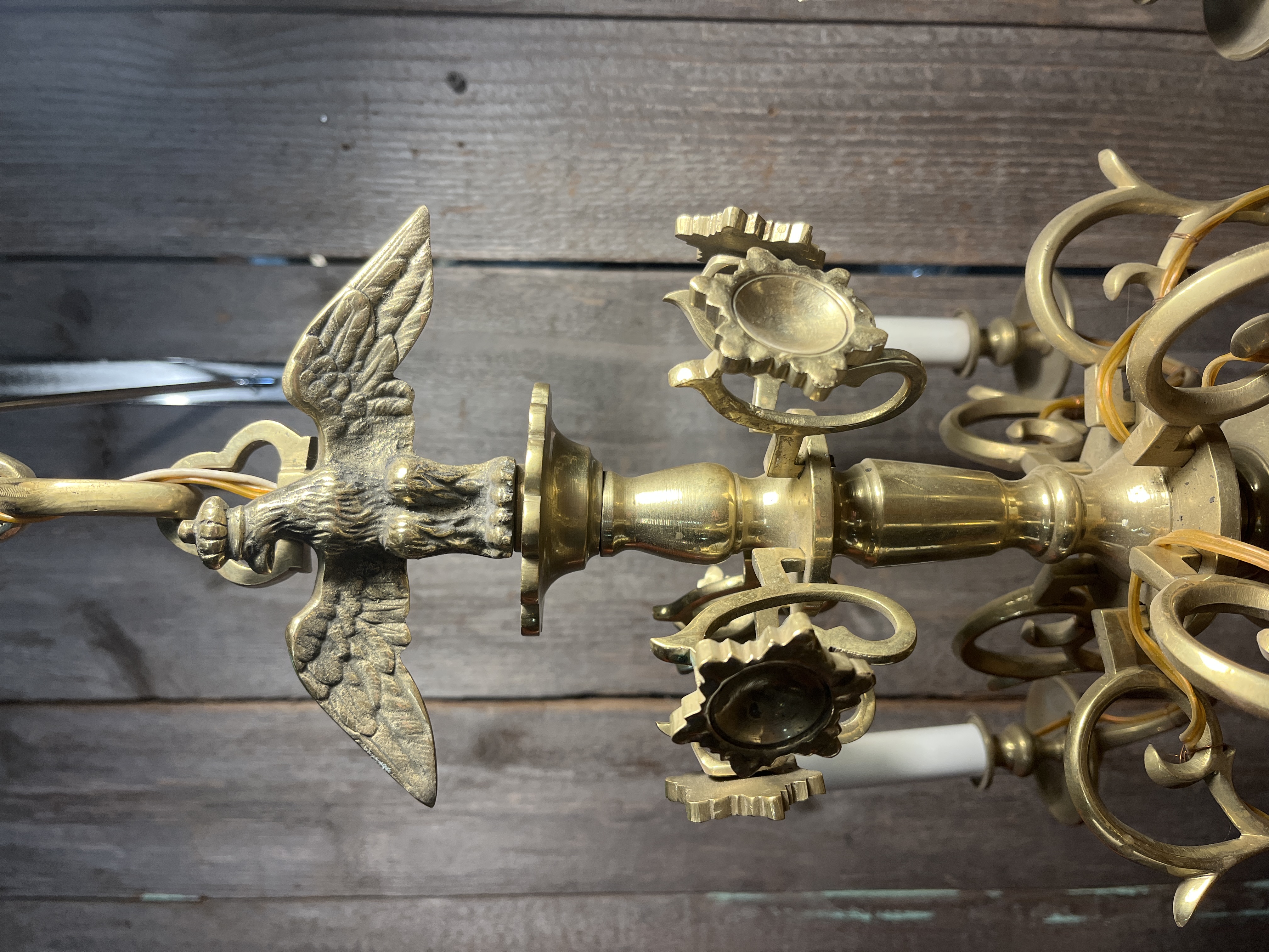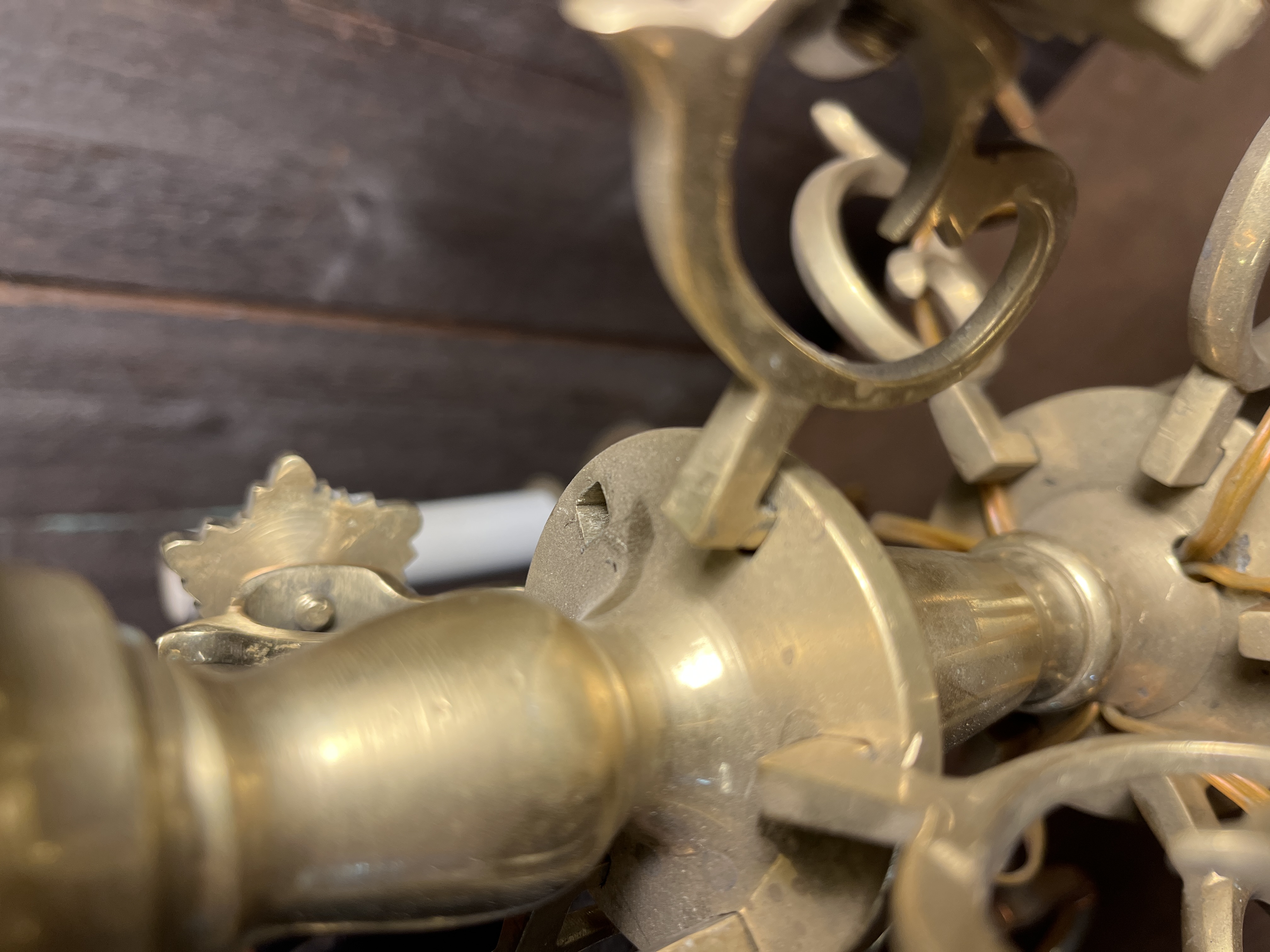 A nice ornate brass chandelier with lots of decorative accents. This light has been rewired. Only one small decorative piece is missing.