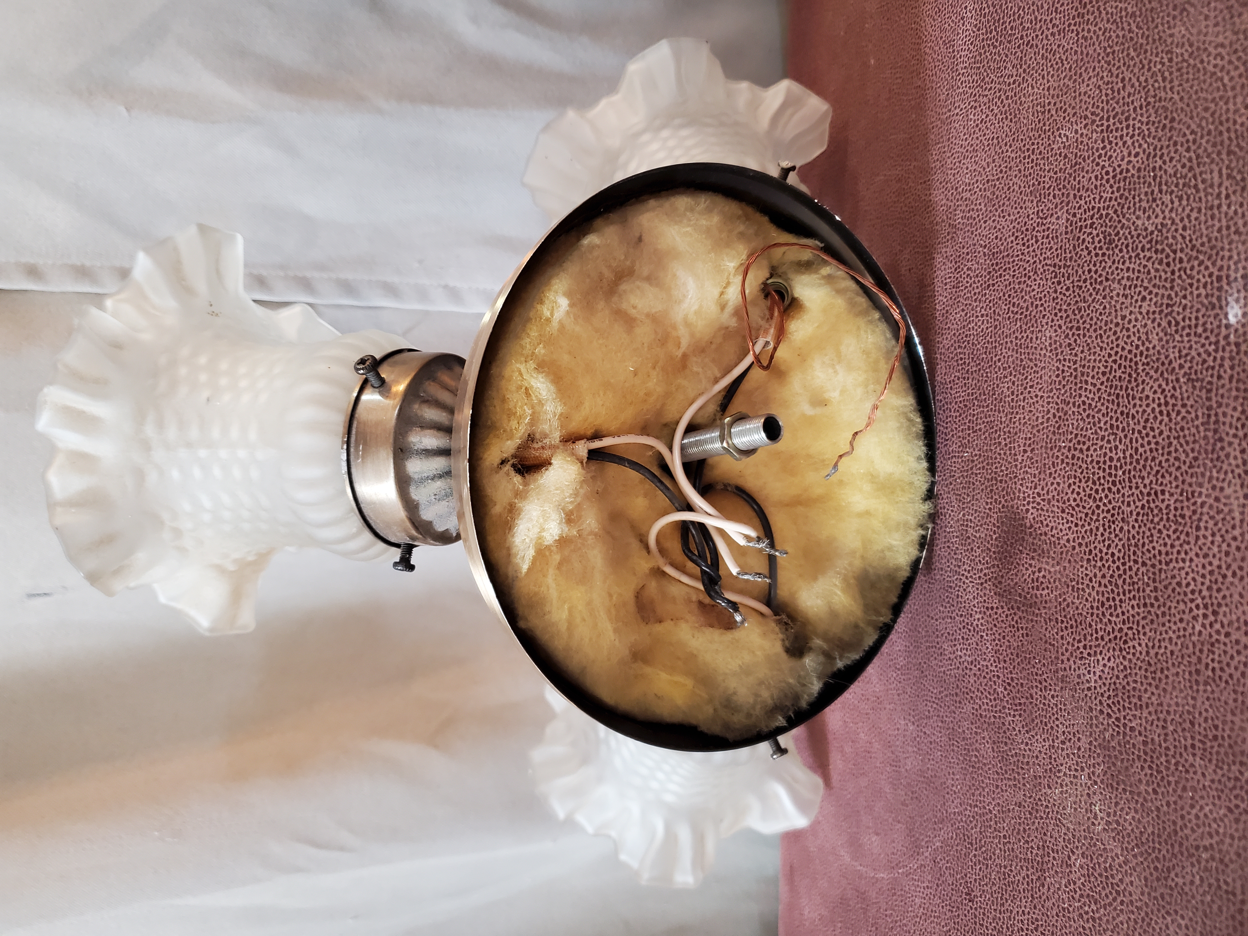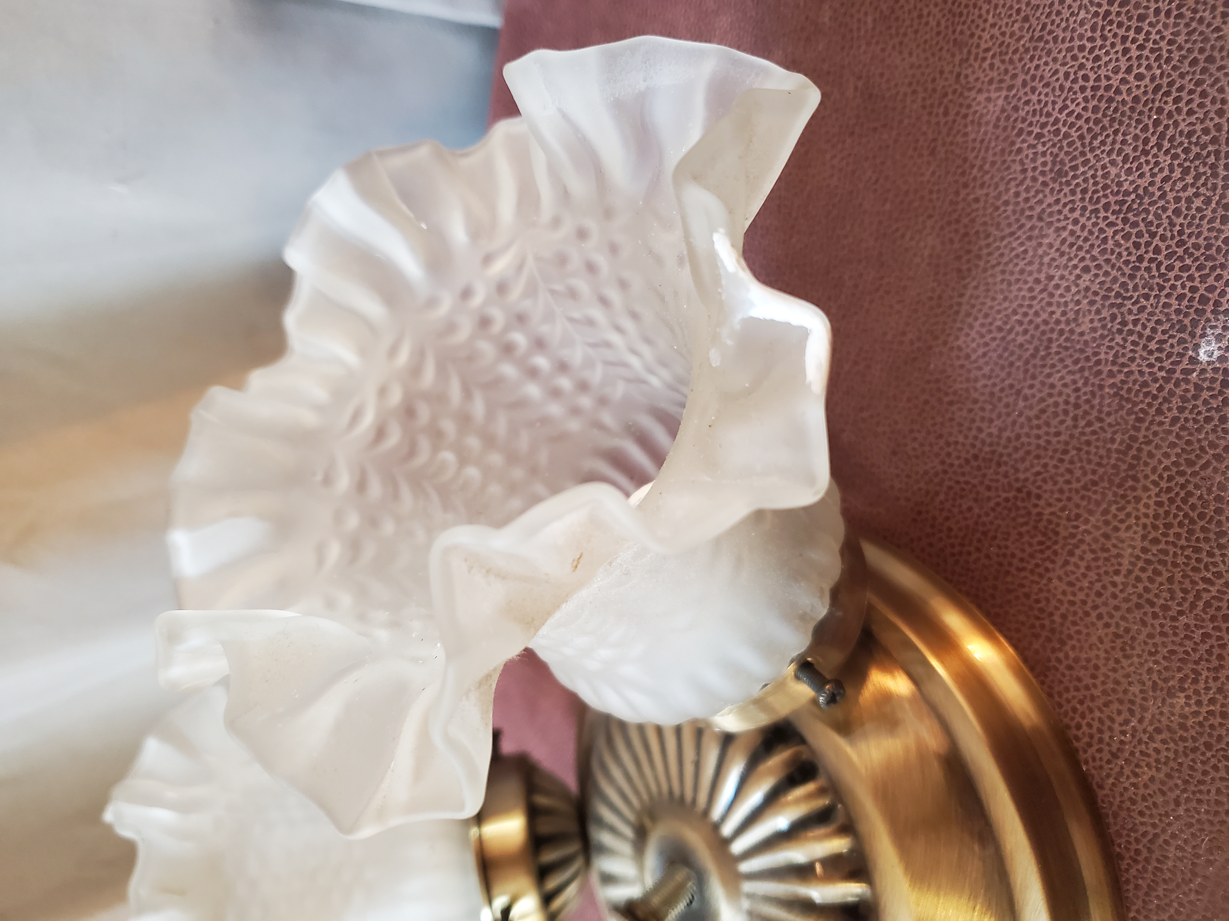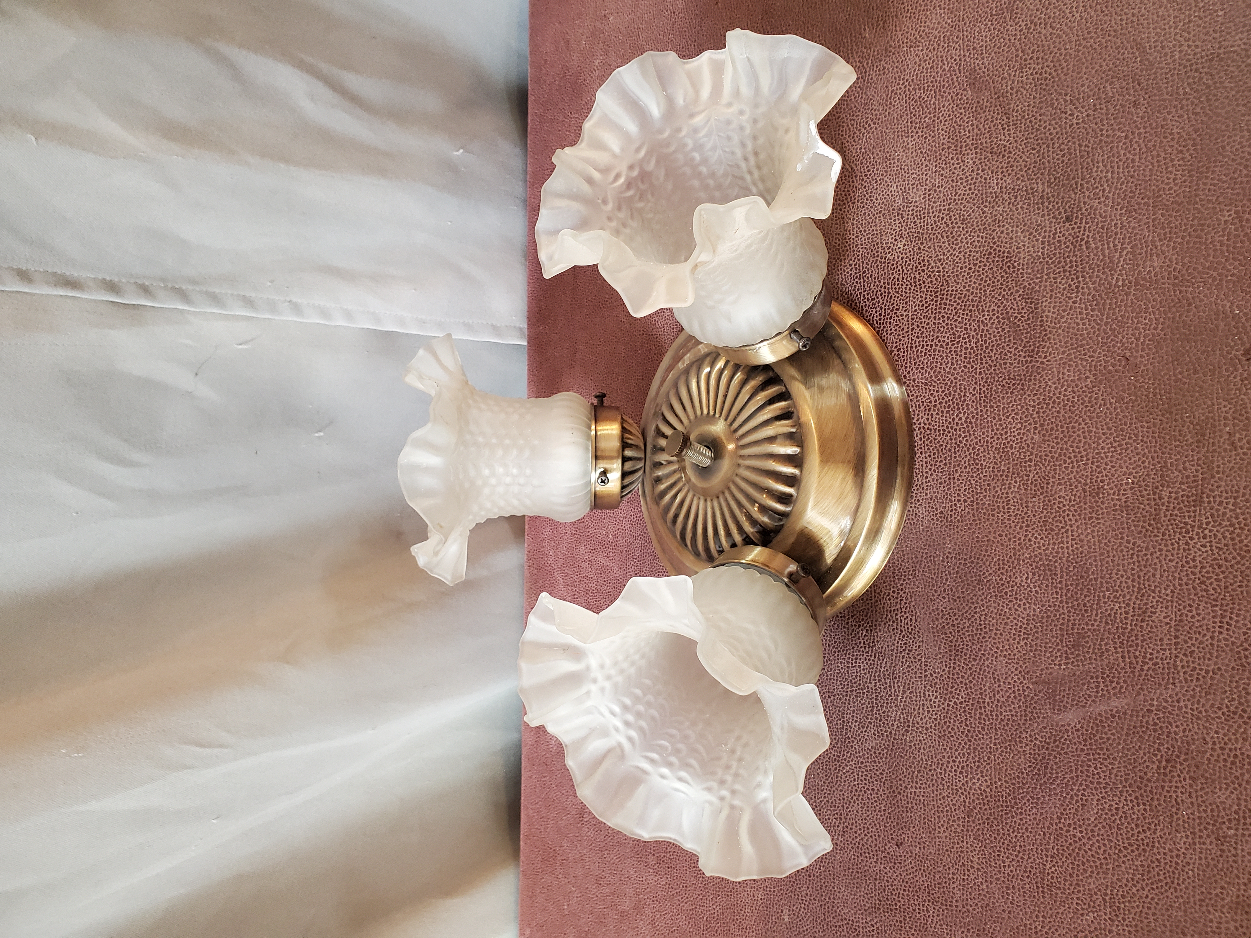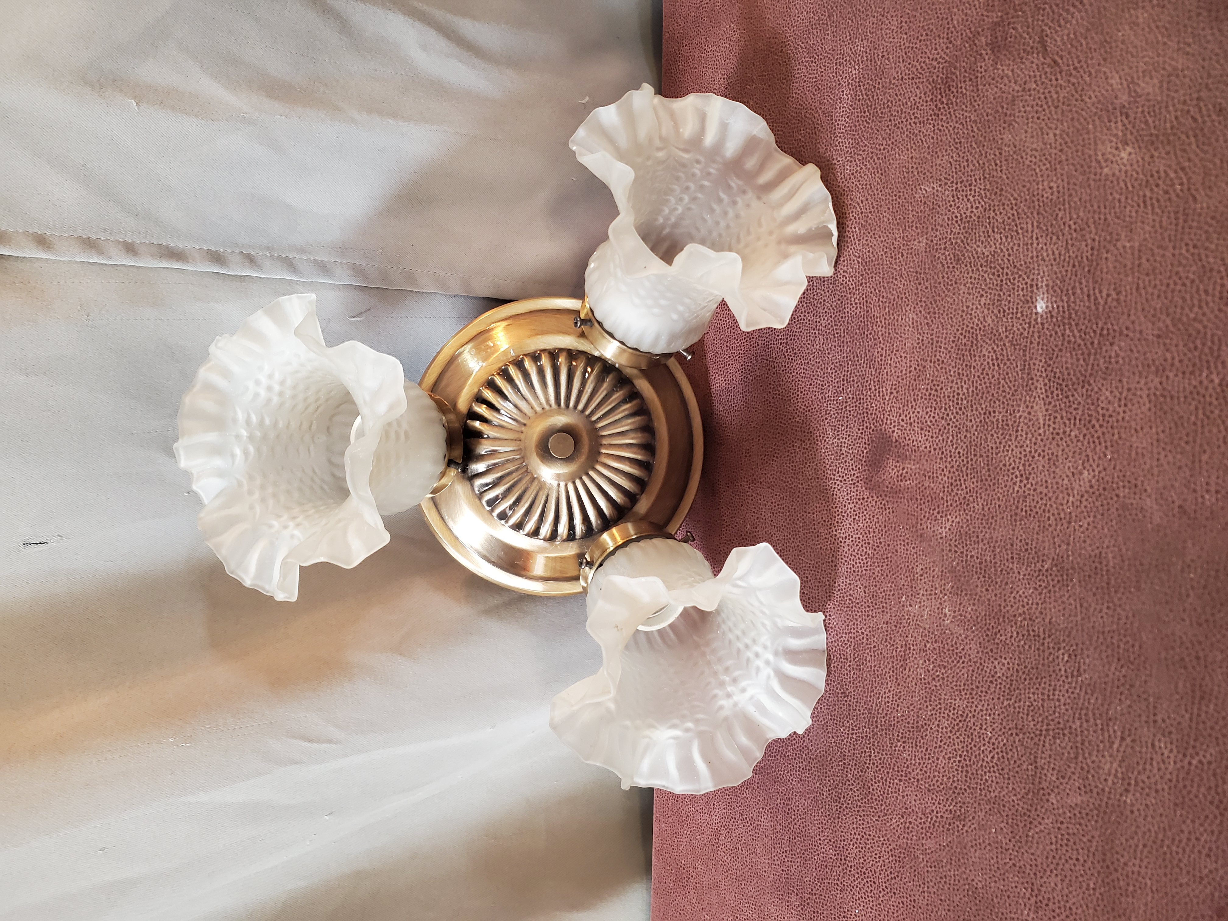This light has three floral, frosted, textured glass shades and is ready to be installed into your home.