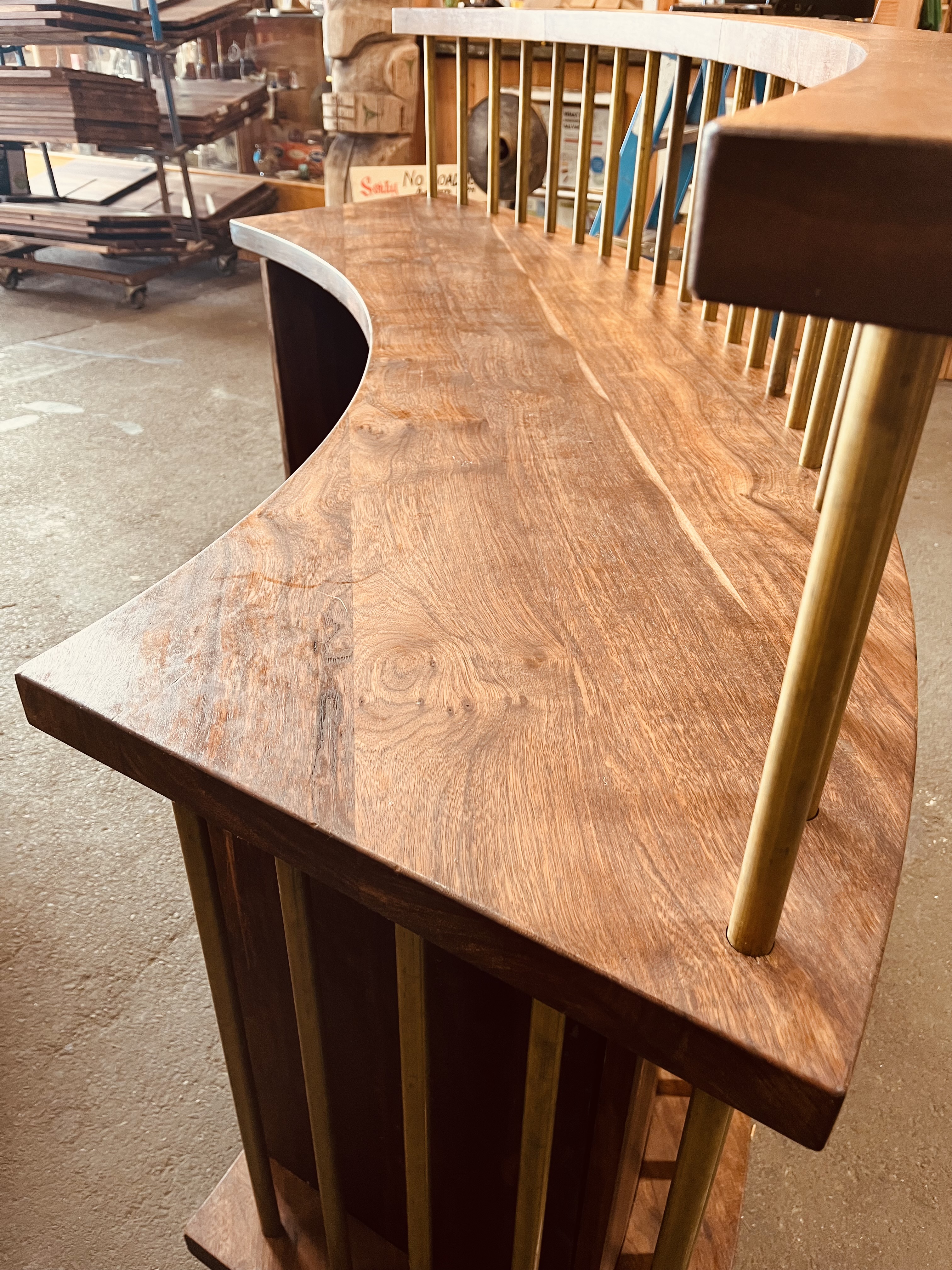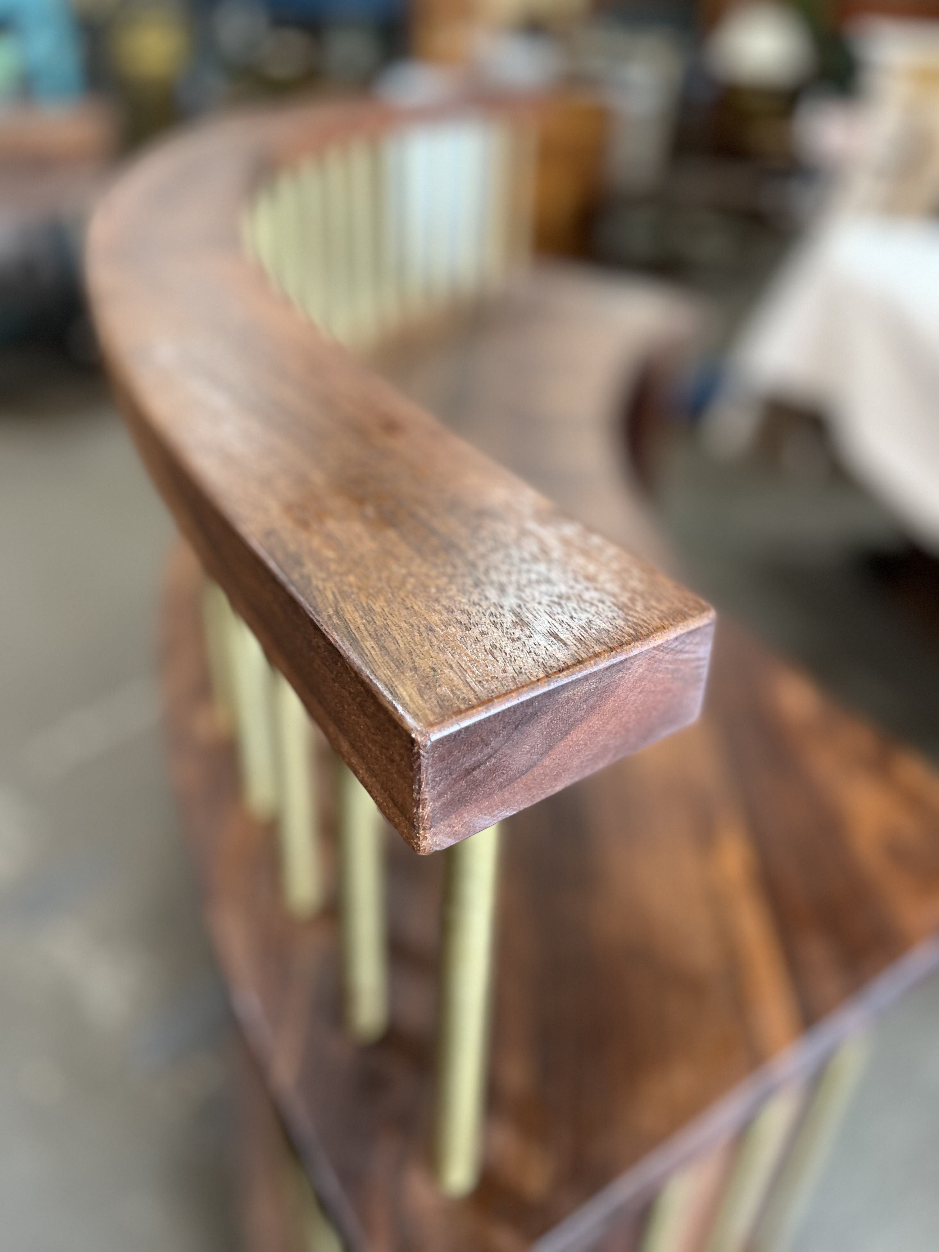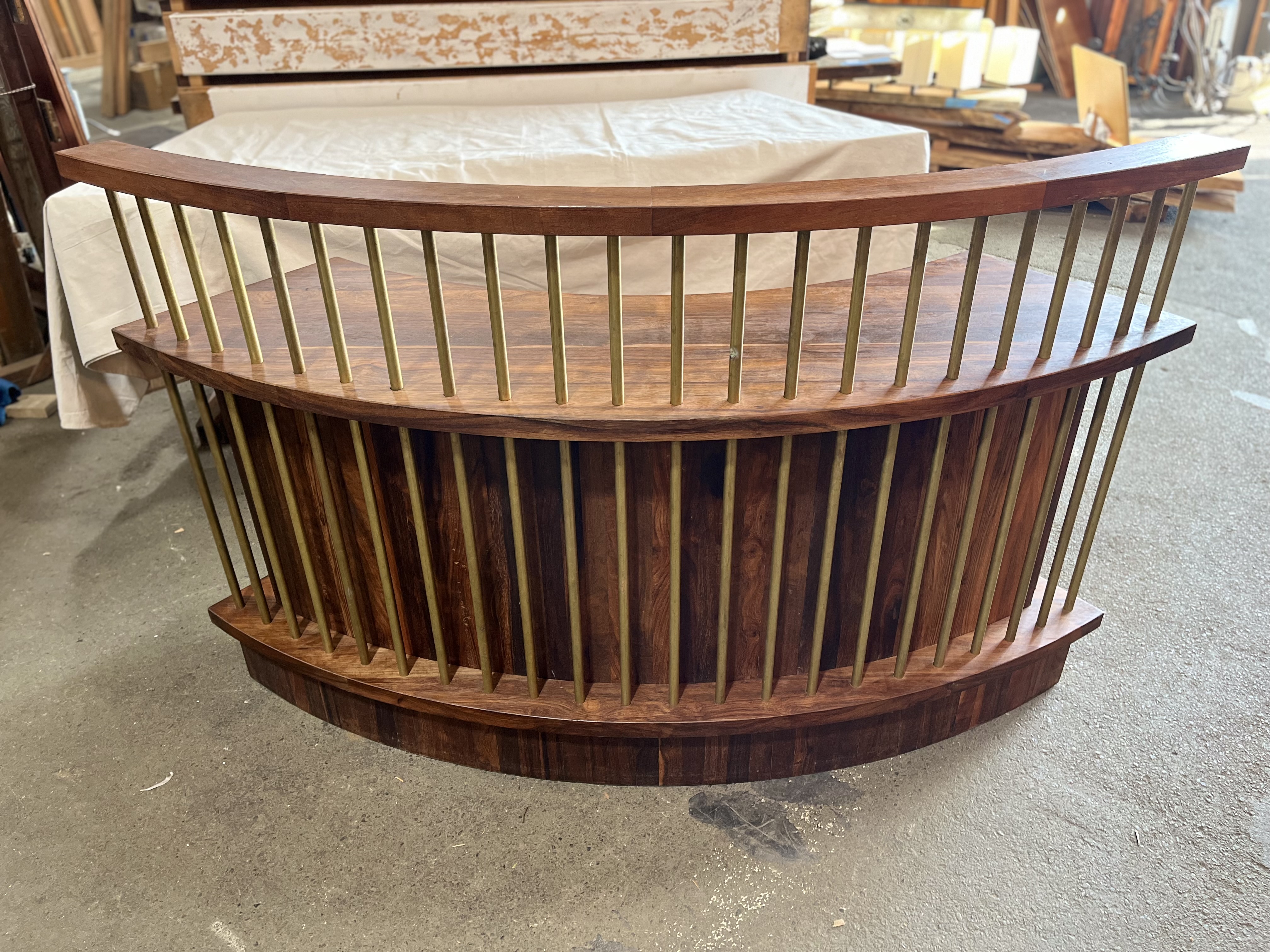 The three levels connected by brass bars are all 1.5 in. thick Indian Rosewood. The base and pieces that form the storage area are 0.75 in. thick Indian Rosewood. There are 52 x 0.75 in. hollow brass bars.