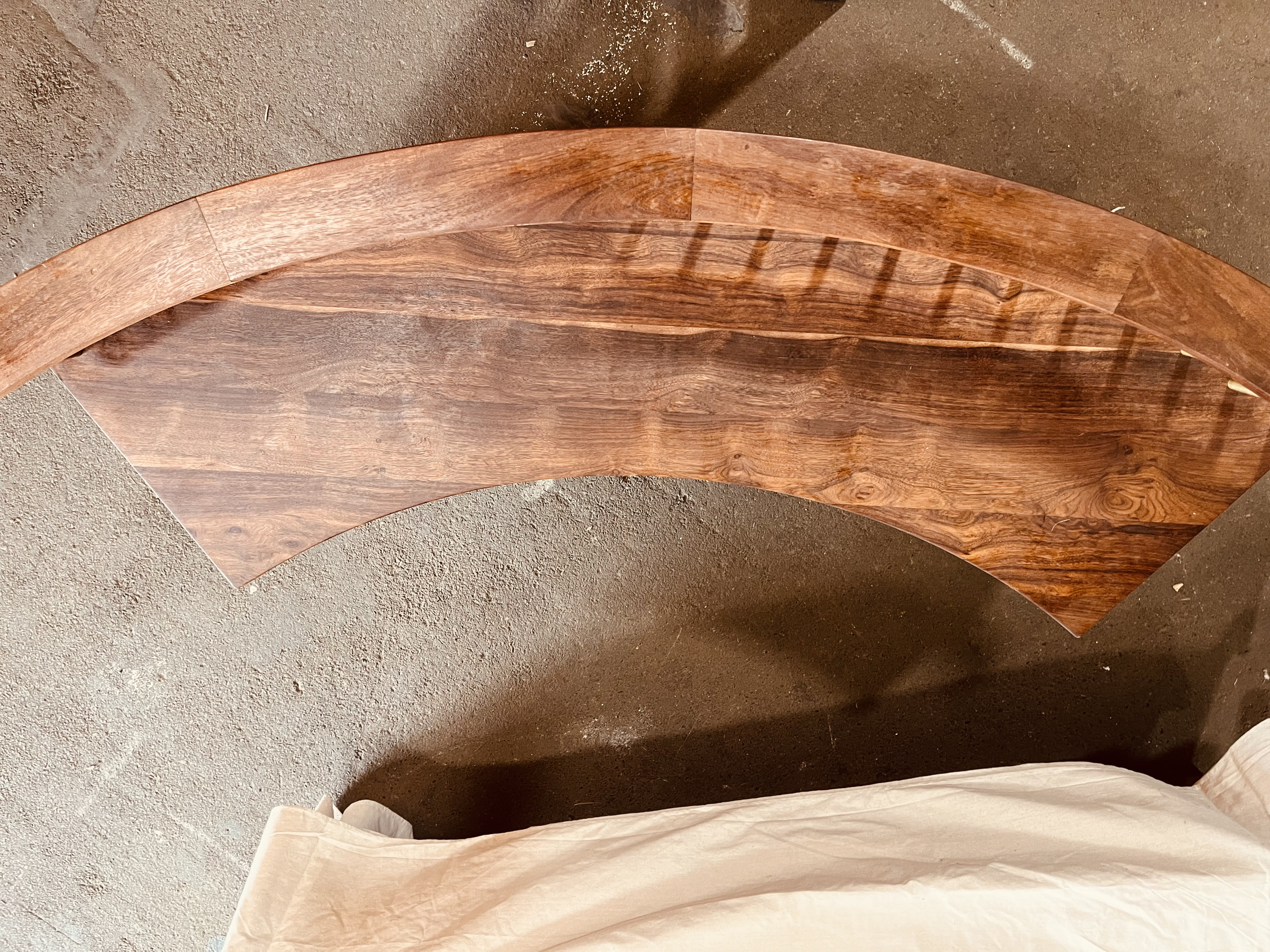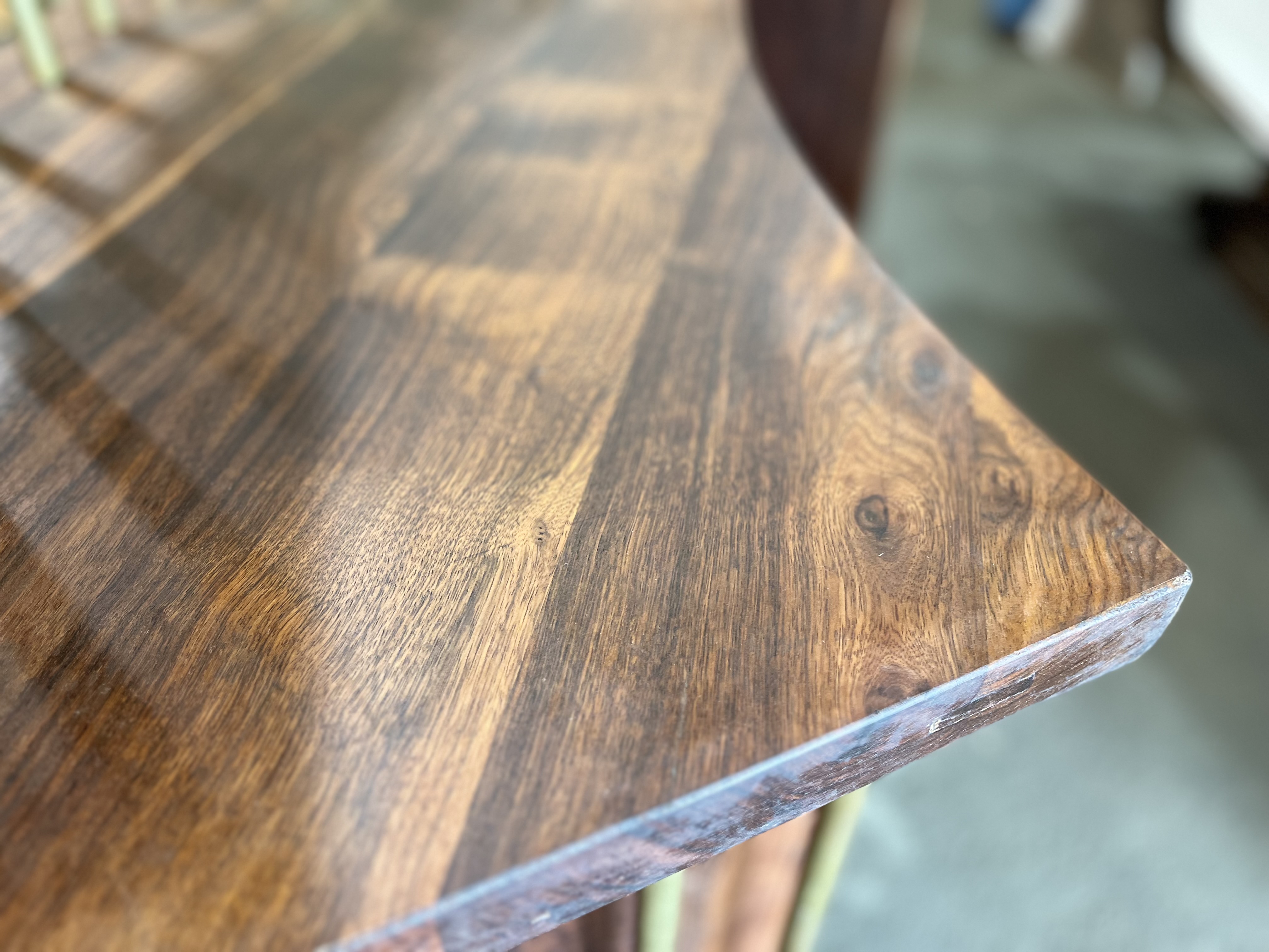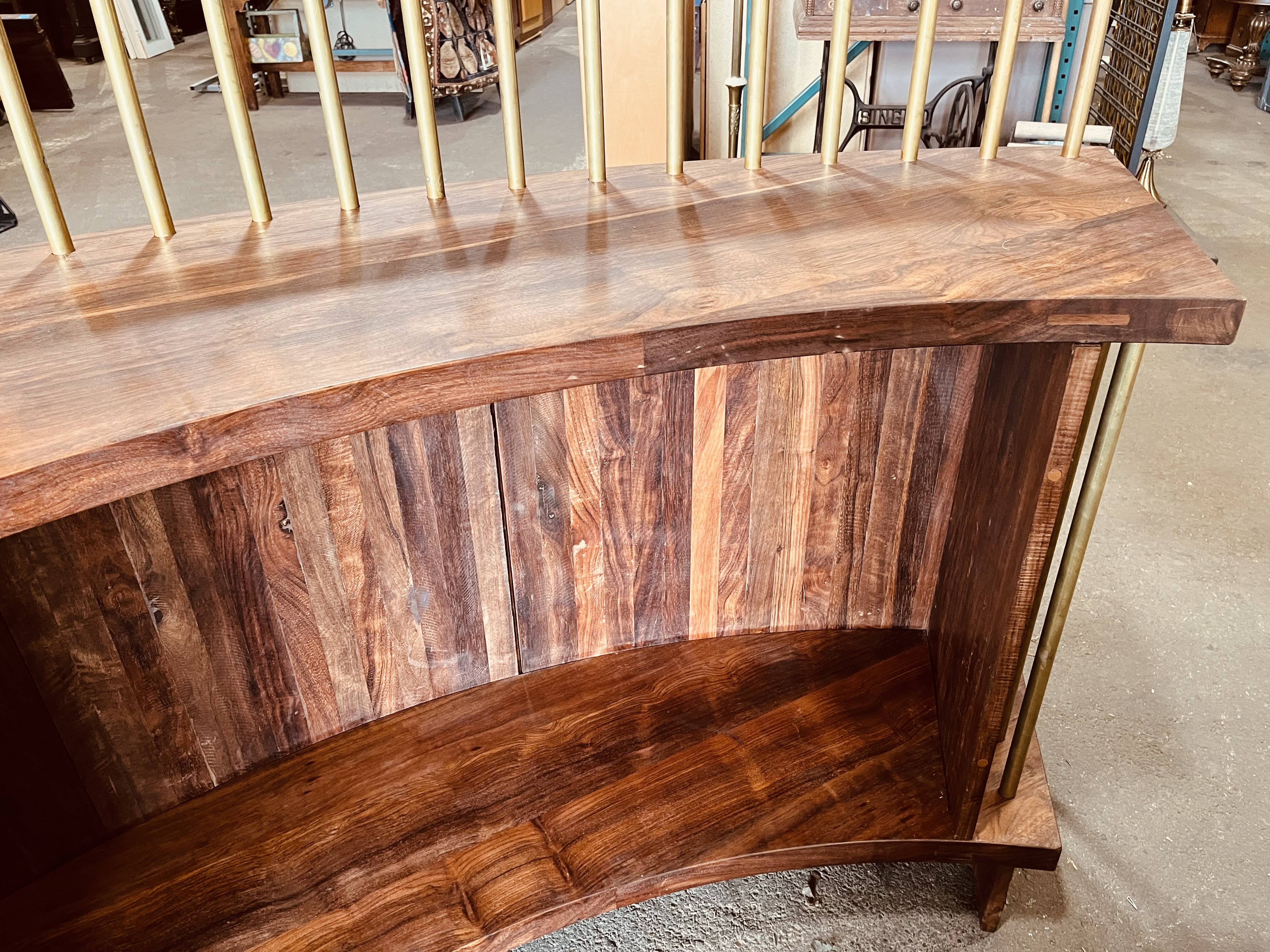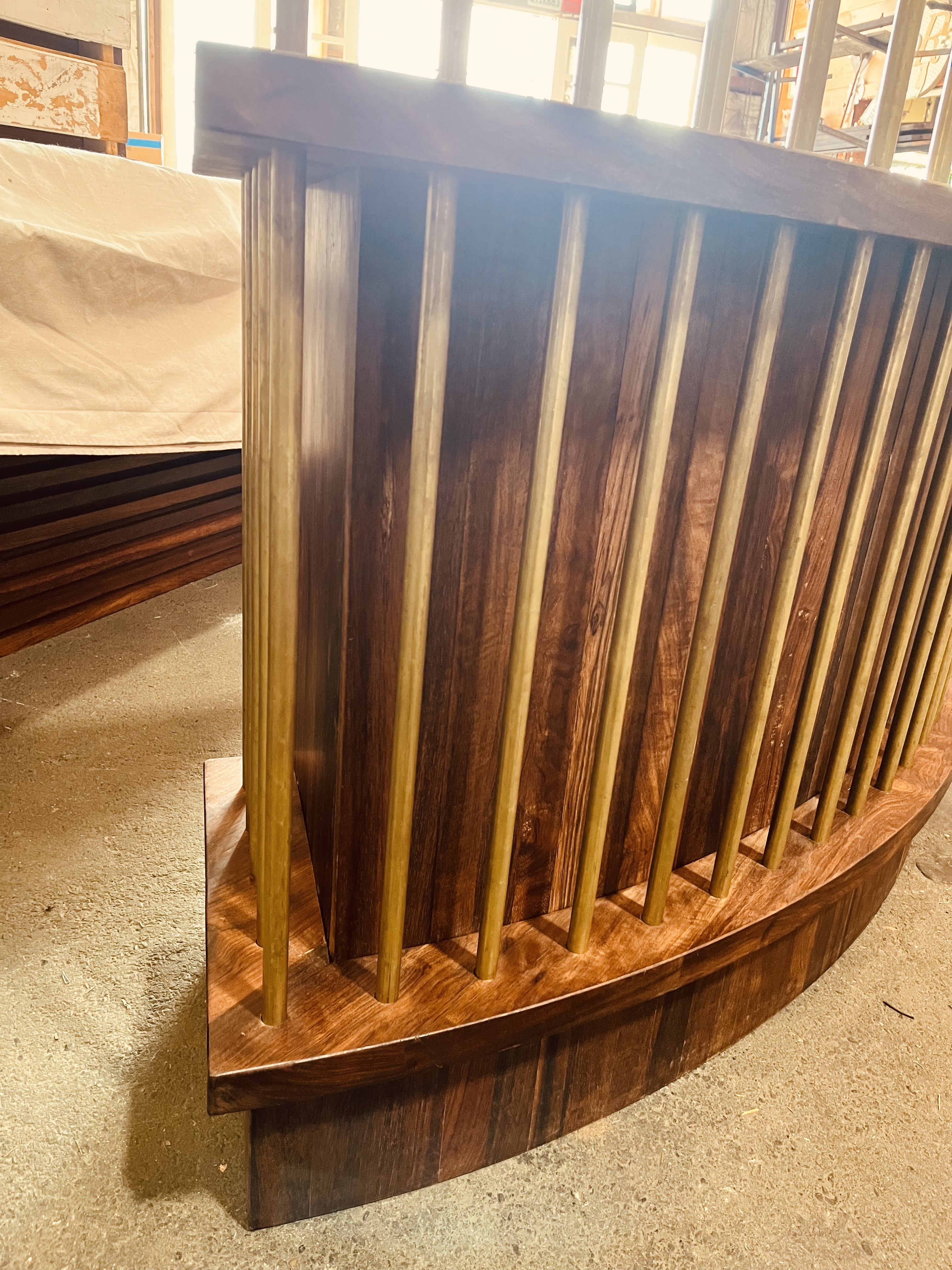 The three levels connected by brass bars are all 1.5 in. thick Indian Rosewood. The base and pieces that form the storage area are 0.75 in. thick Indian Rosewood. There are 52 x 0.75 in. hollow brass bars.
