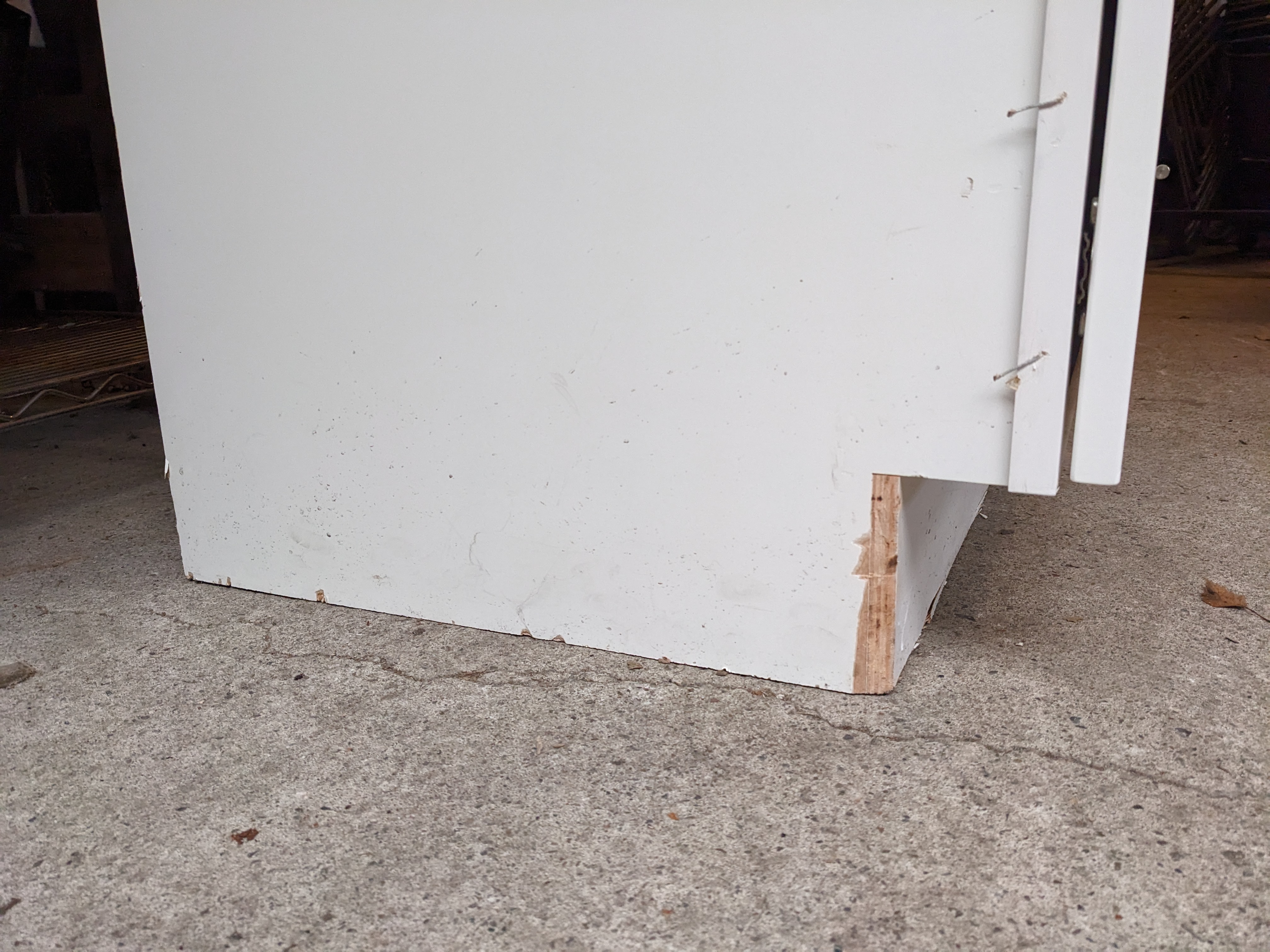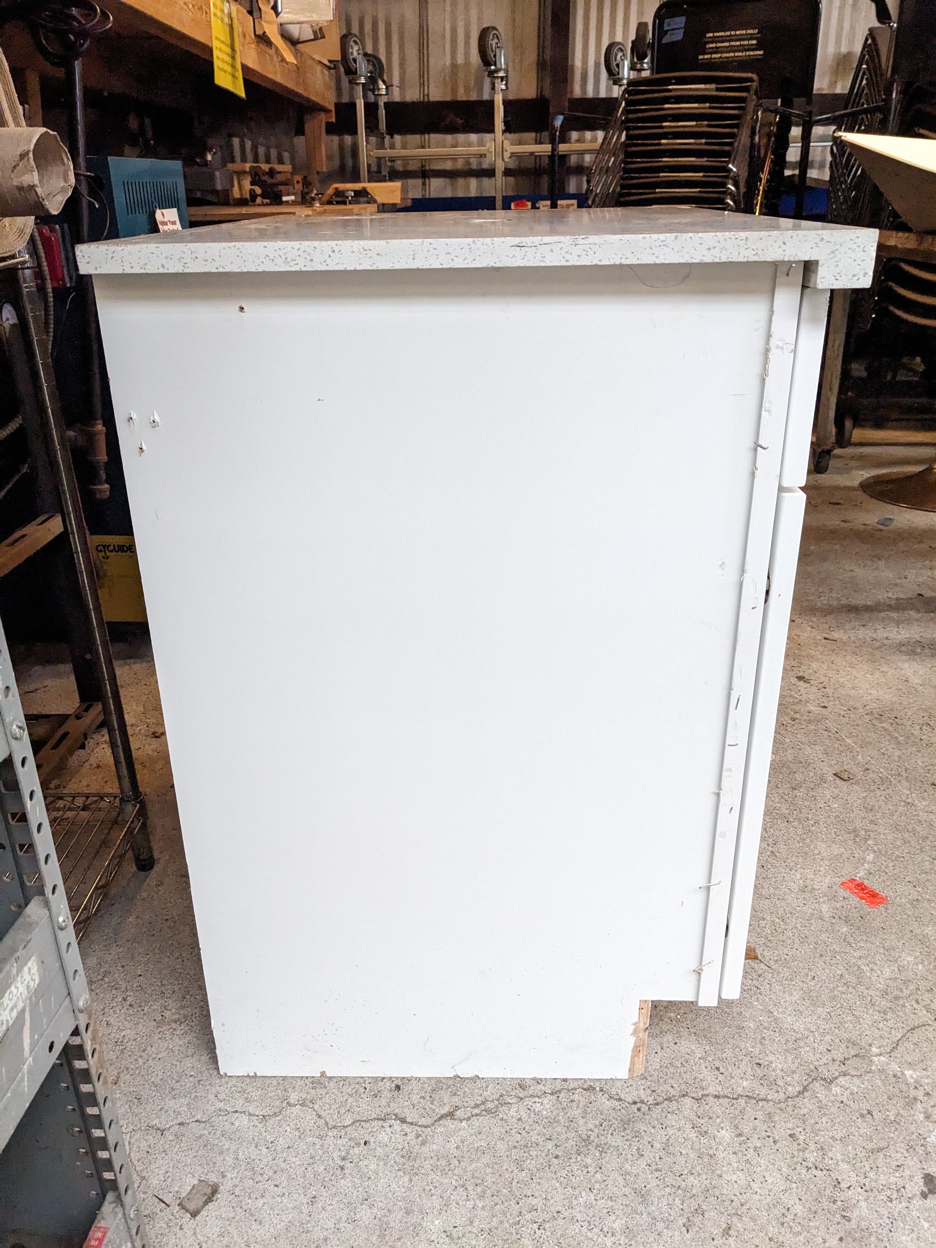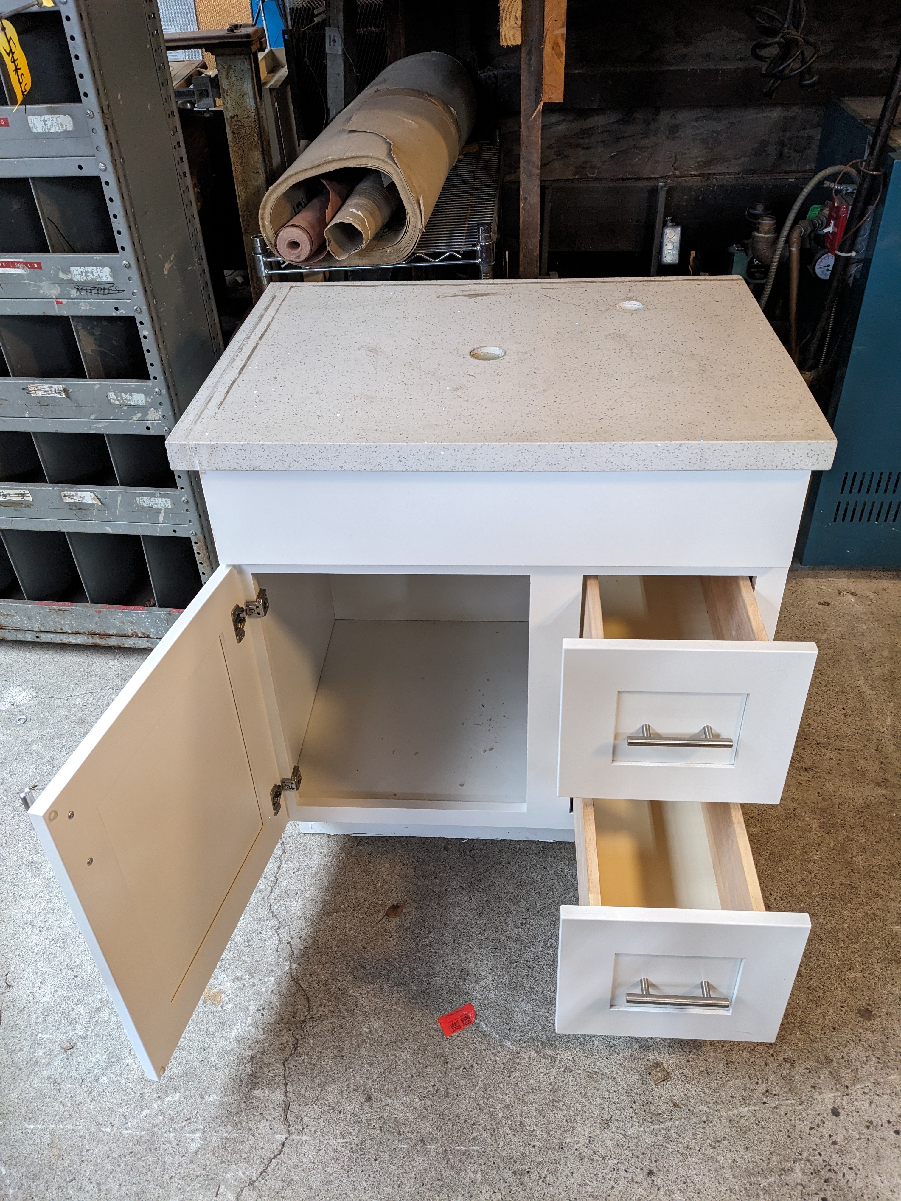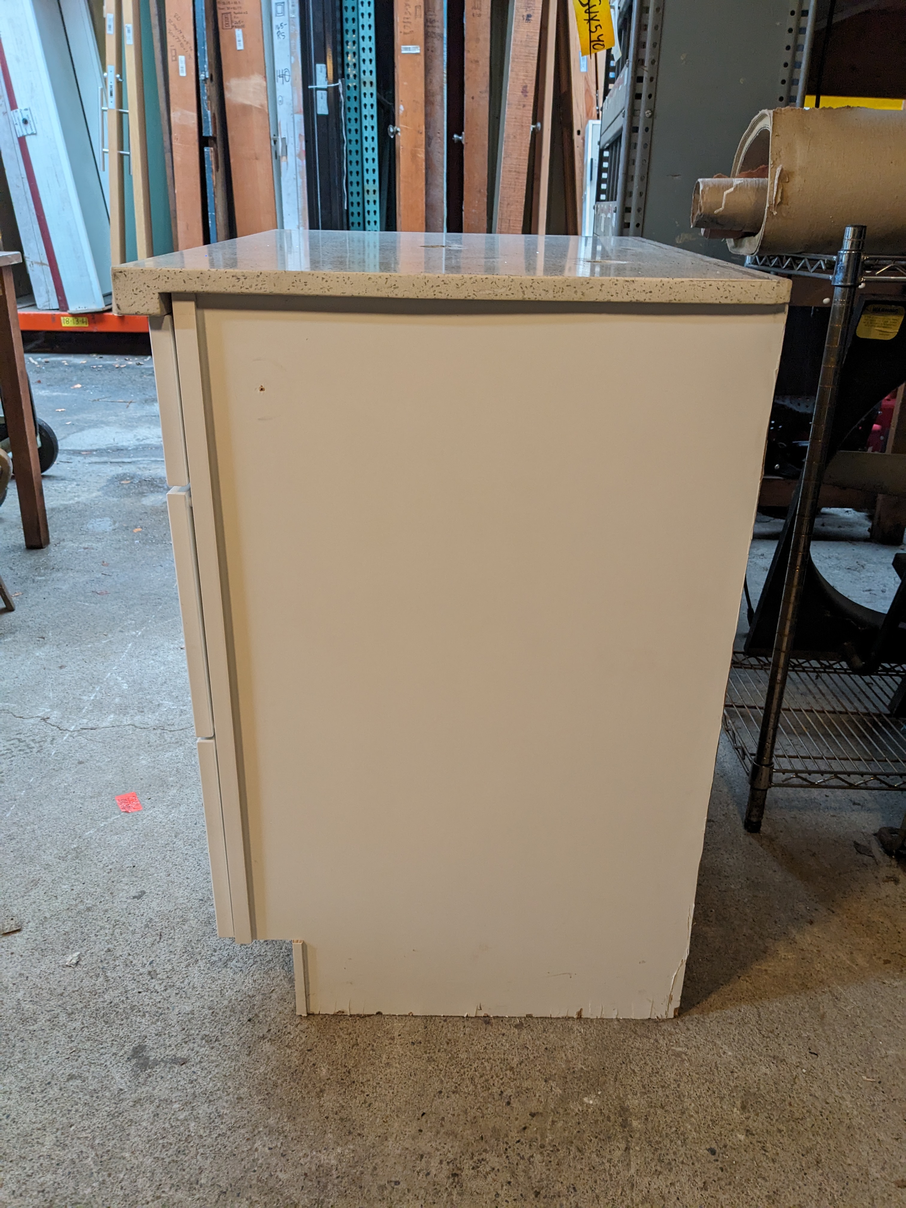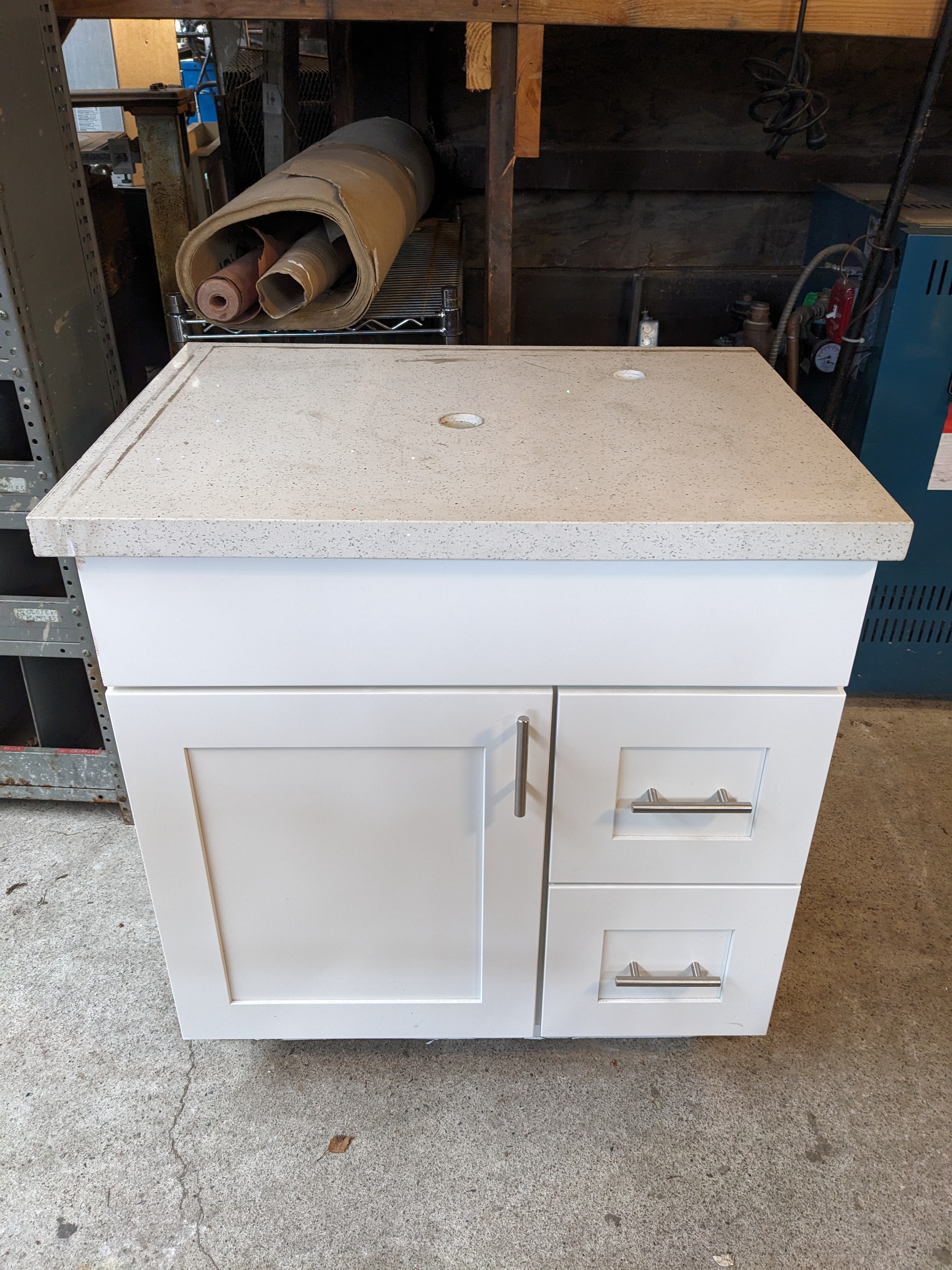 White vanity in decent condition with speckled marble countertops, soft close, and left hand cabinet. There is some minor damage to bottom left corner and bottom right side of vanity.
